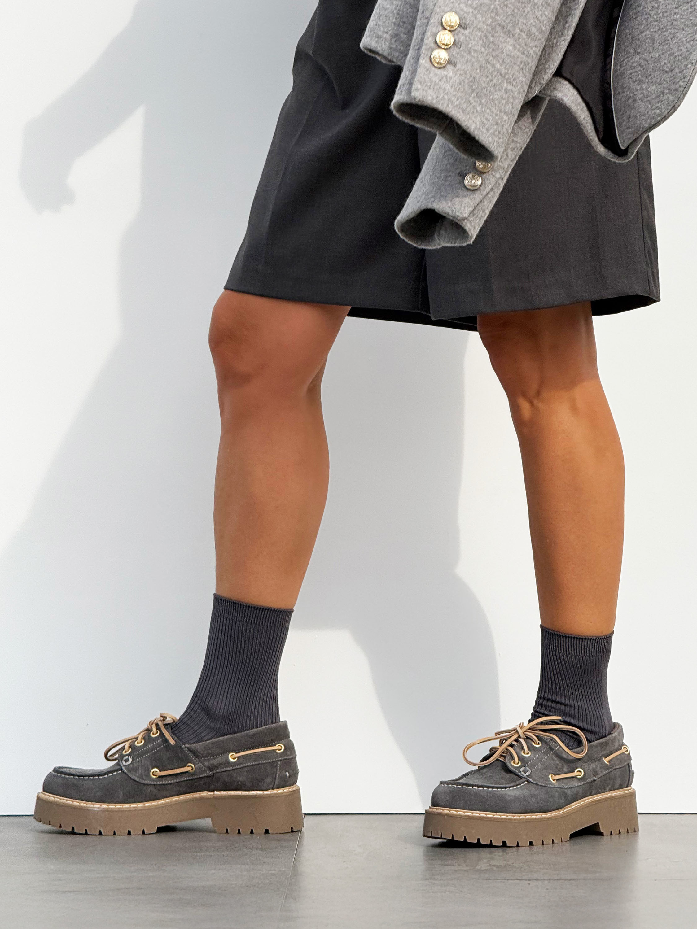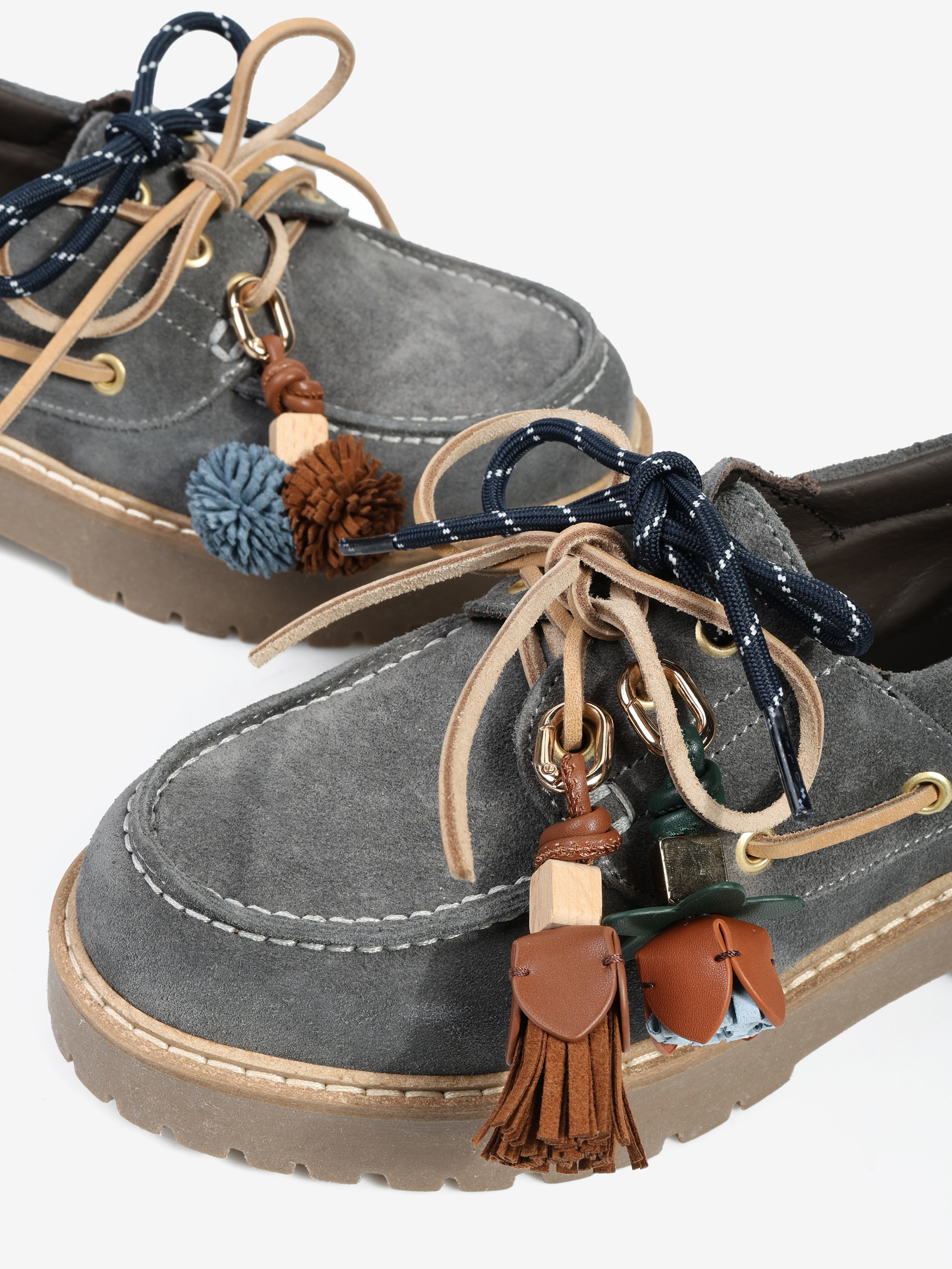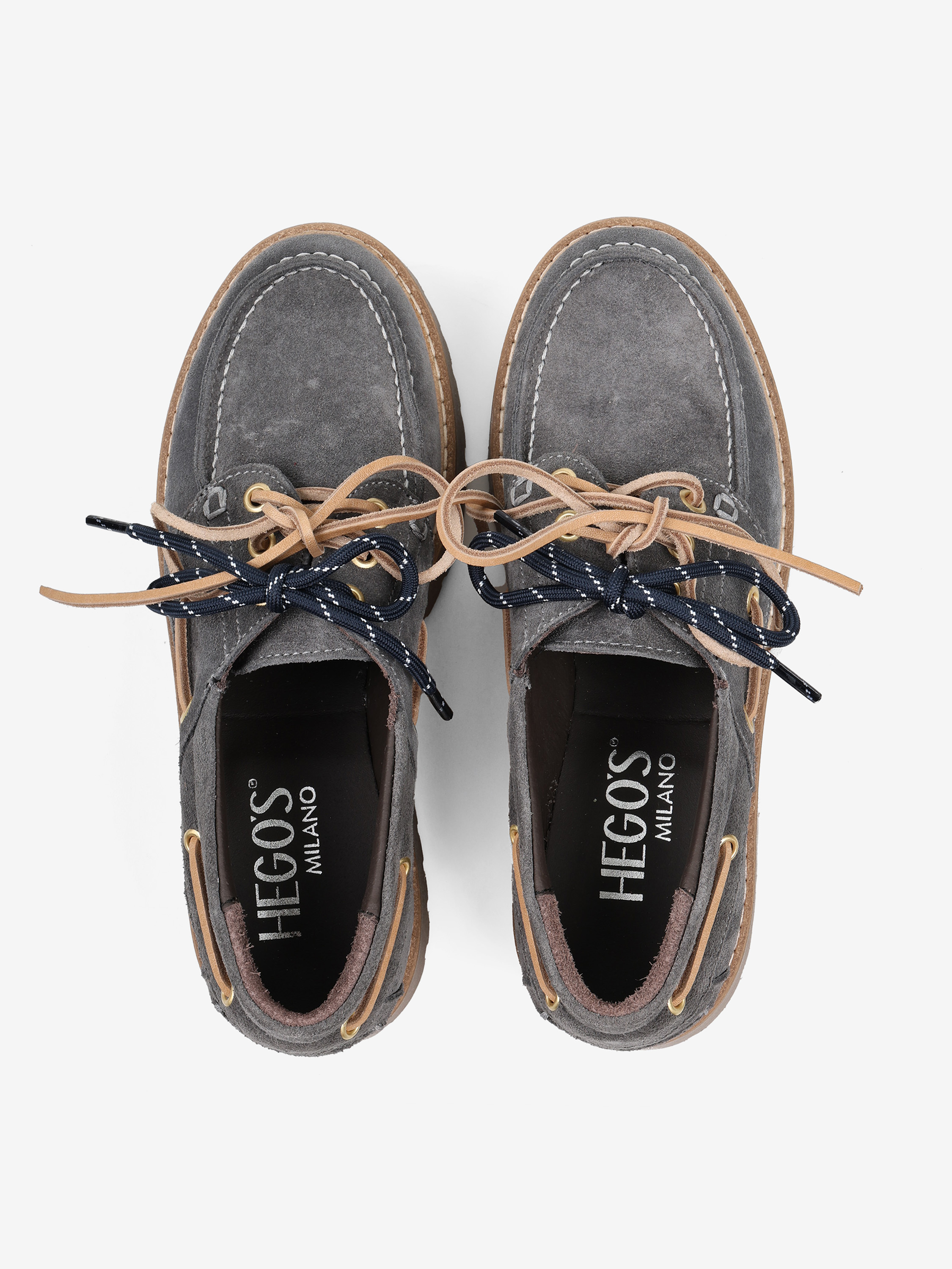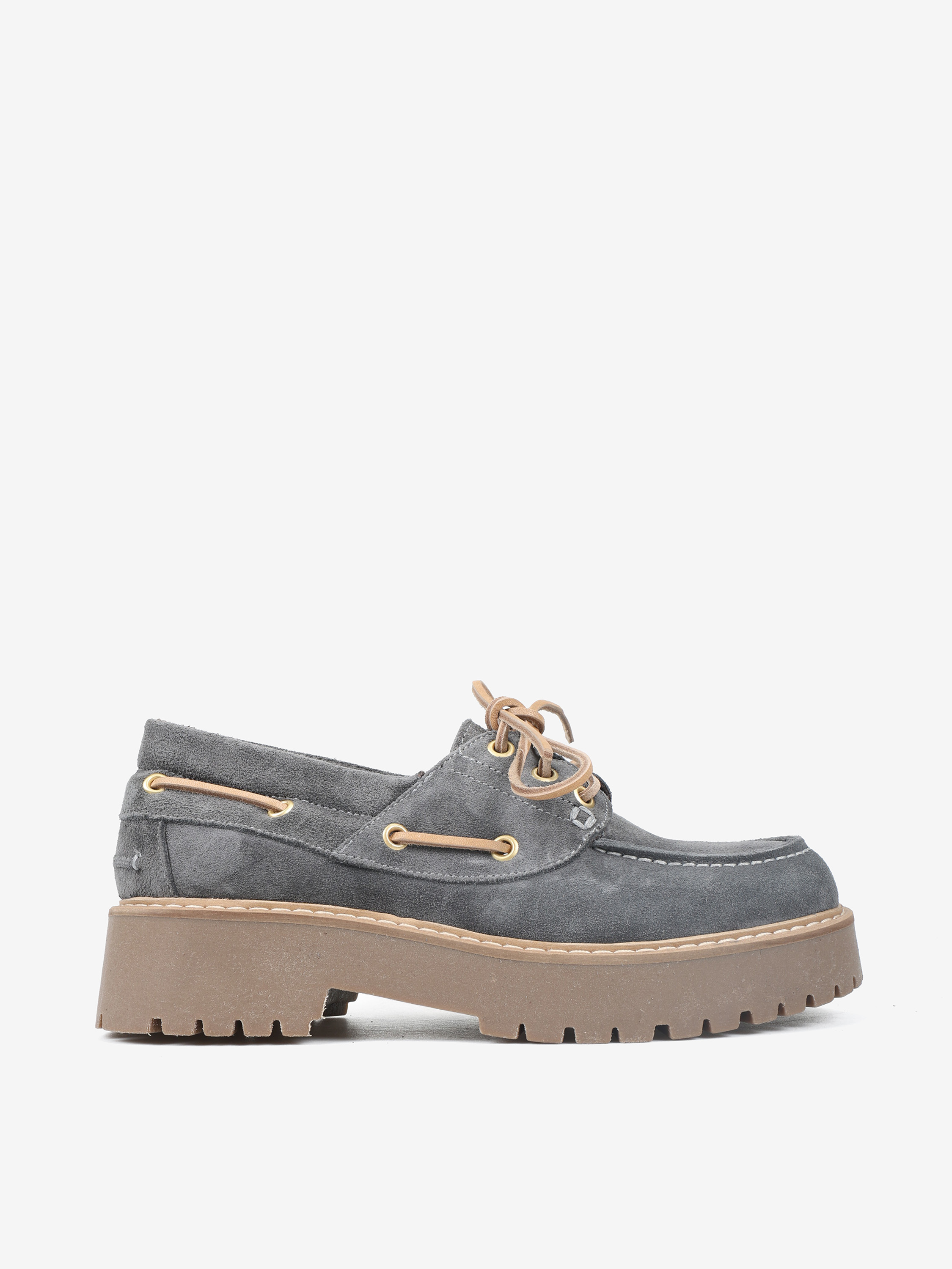 Szare, zamszowe mokasyny na platformie z wiązaniem na rzemyk. W komplecie dodatkowe sznurówki. Przywieszka dostępna oddzielnie.