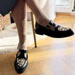 Półbuty wykonane z wysokopolerowanej skóry. Regulowane zapięcie i ozdobny haft z cekinami i koralikami.