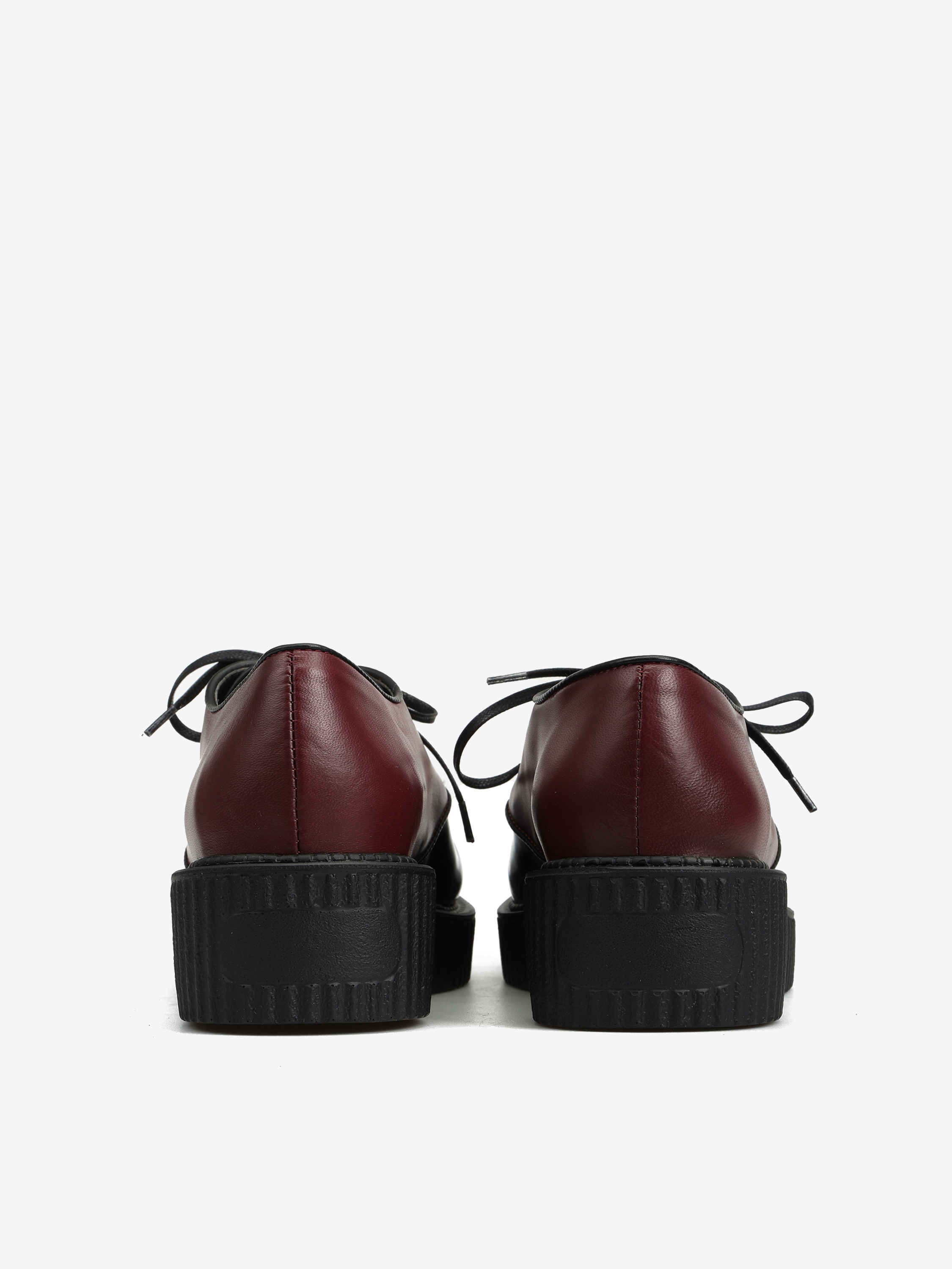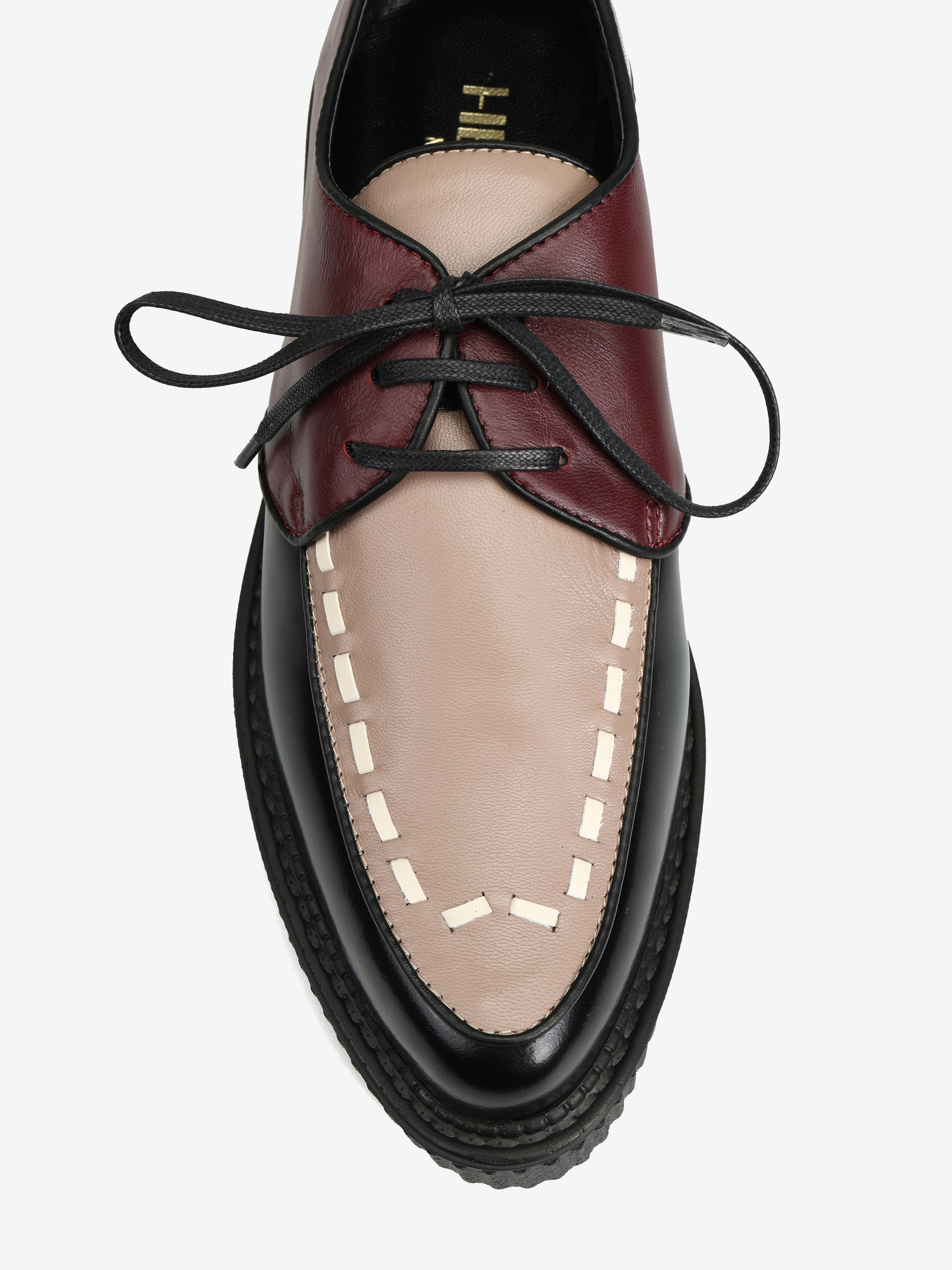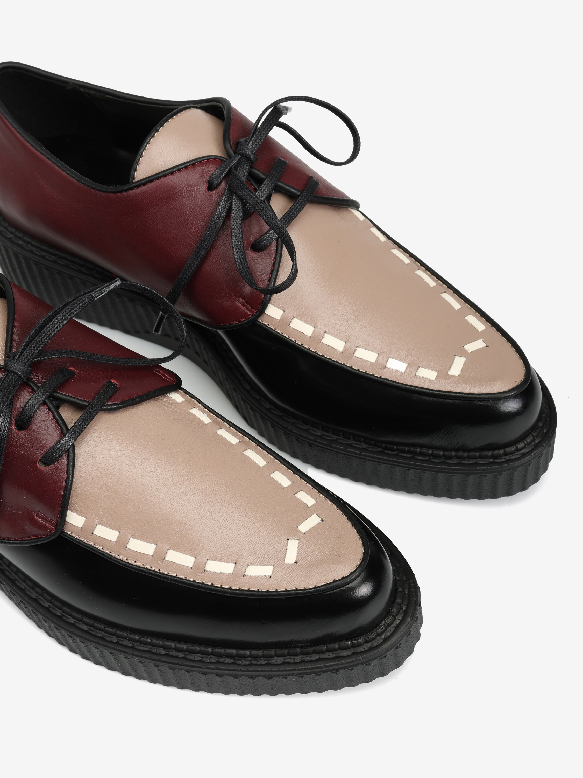 Wiązane półbuty na platformie, wykonane ze skóry naturalnejj. Kontrastujący język z ozdobnym, grubym szwem.