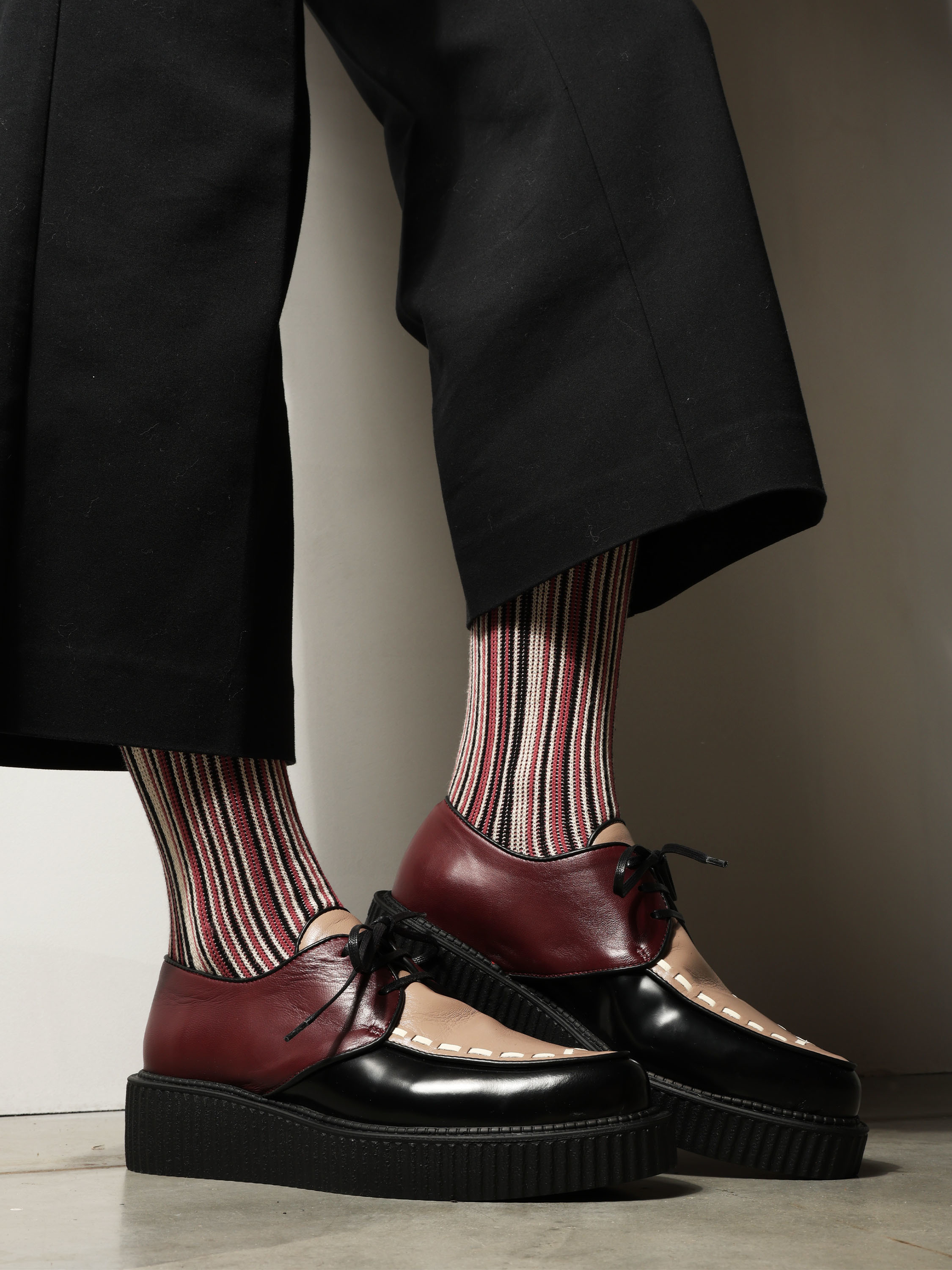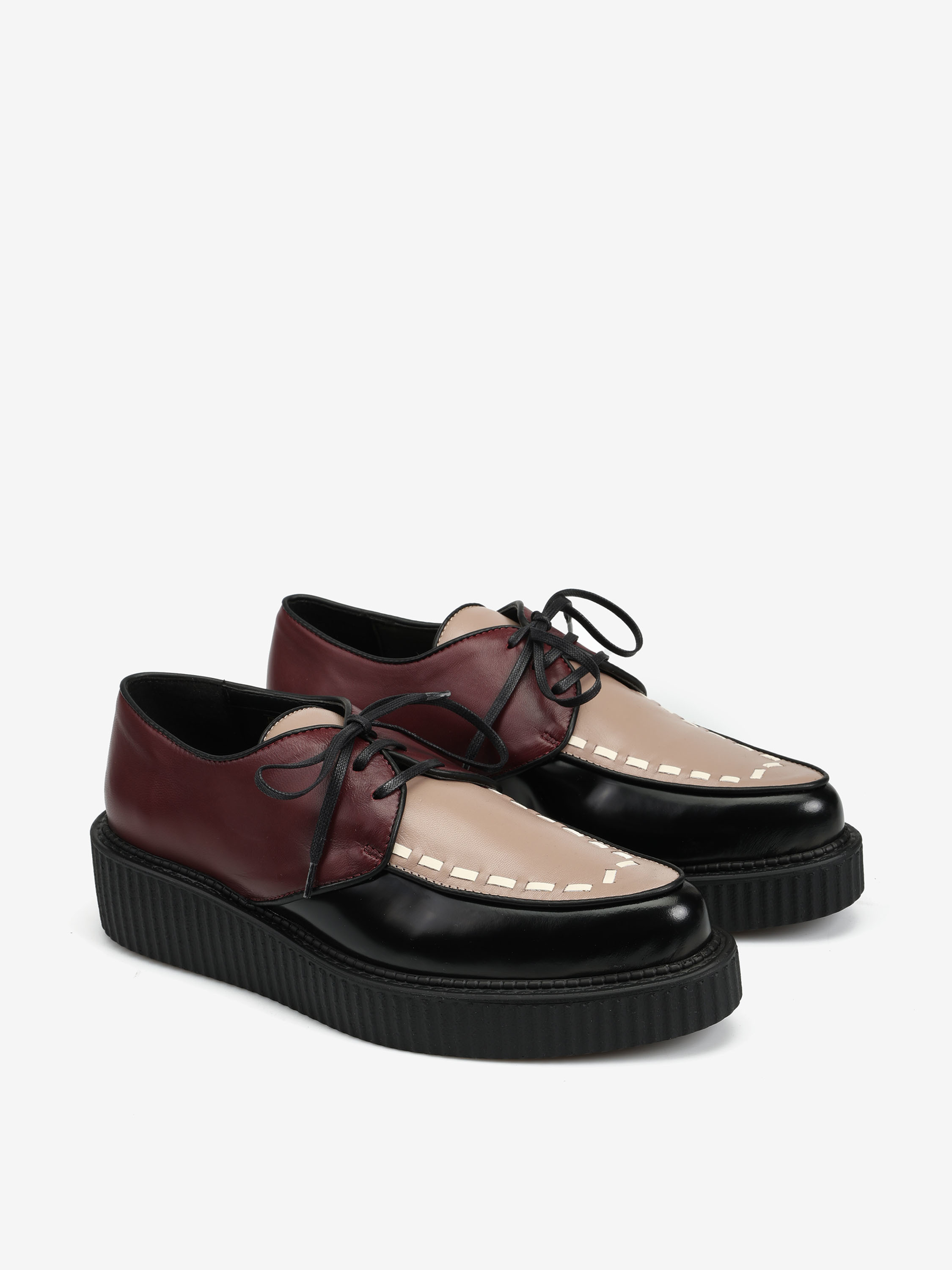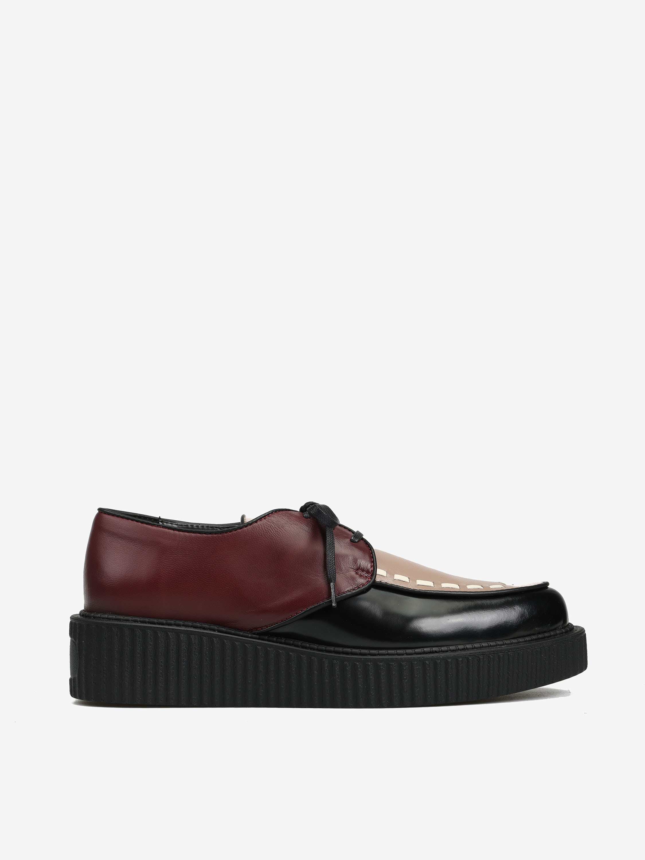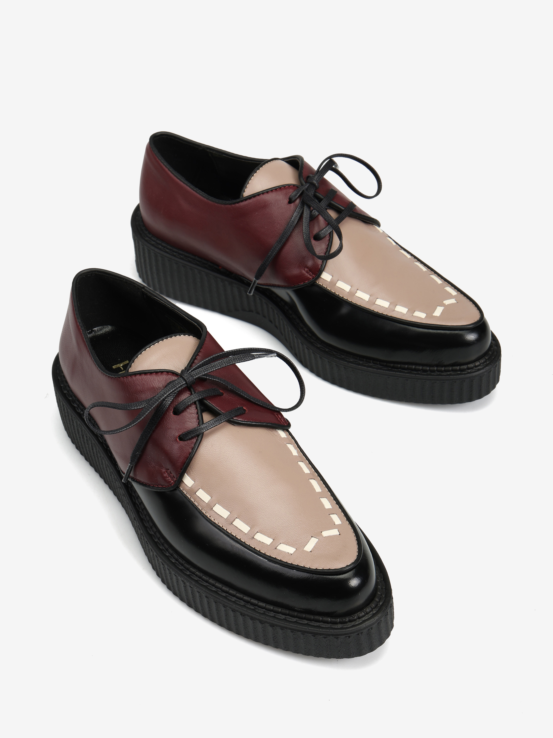 Wiązane półbuty na platformie, wykonane ze skóry naturalnejj. Kontrastujący język z ozdobnym, grubym szwem.