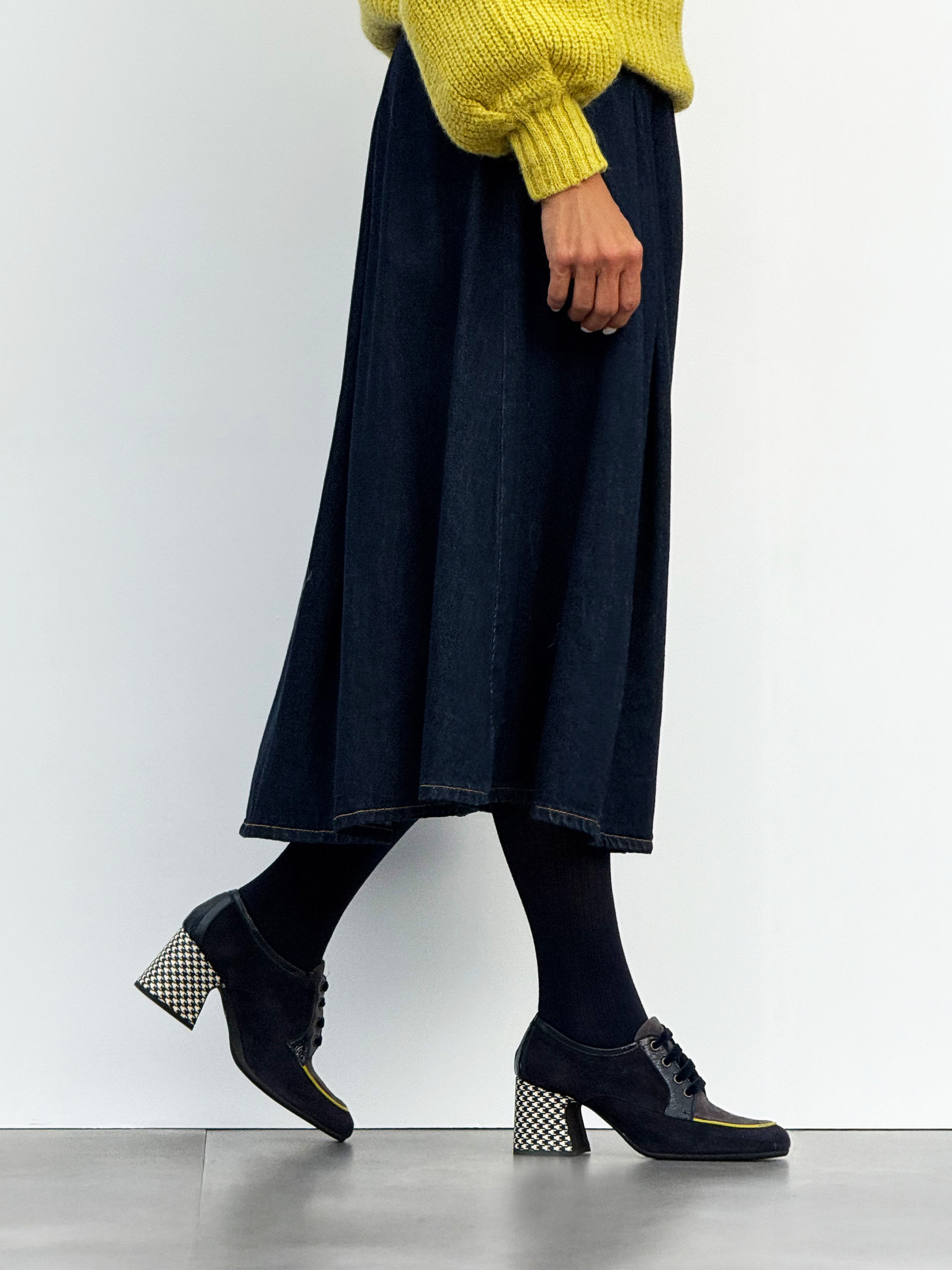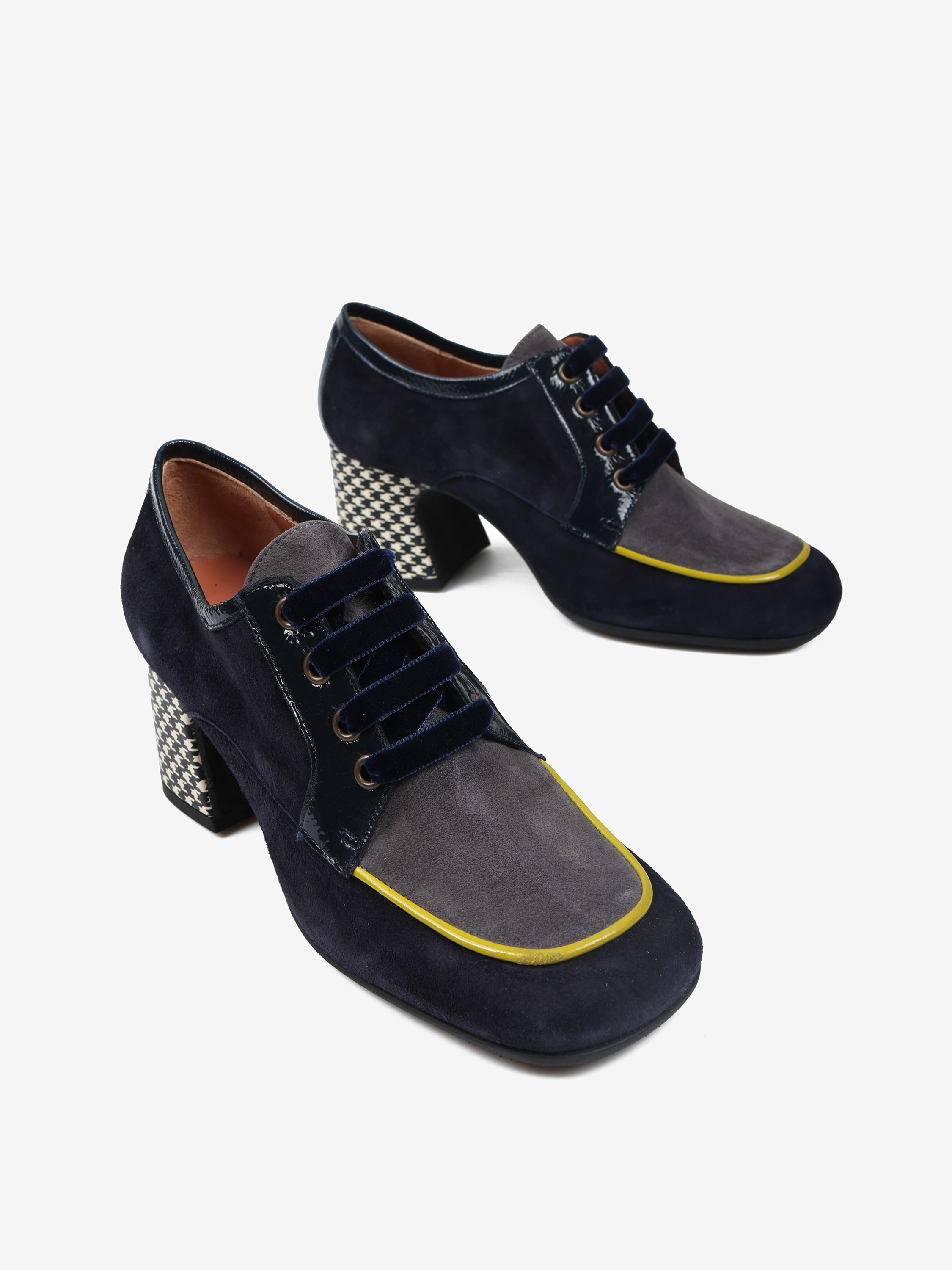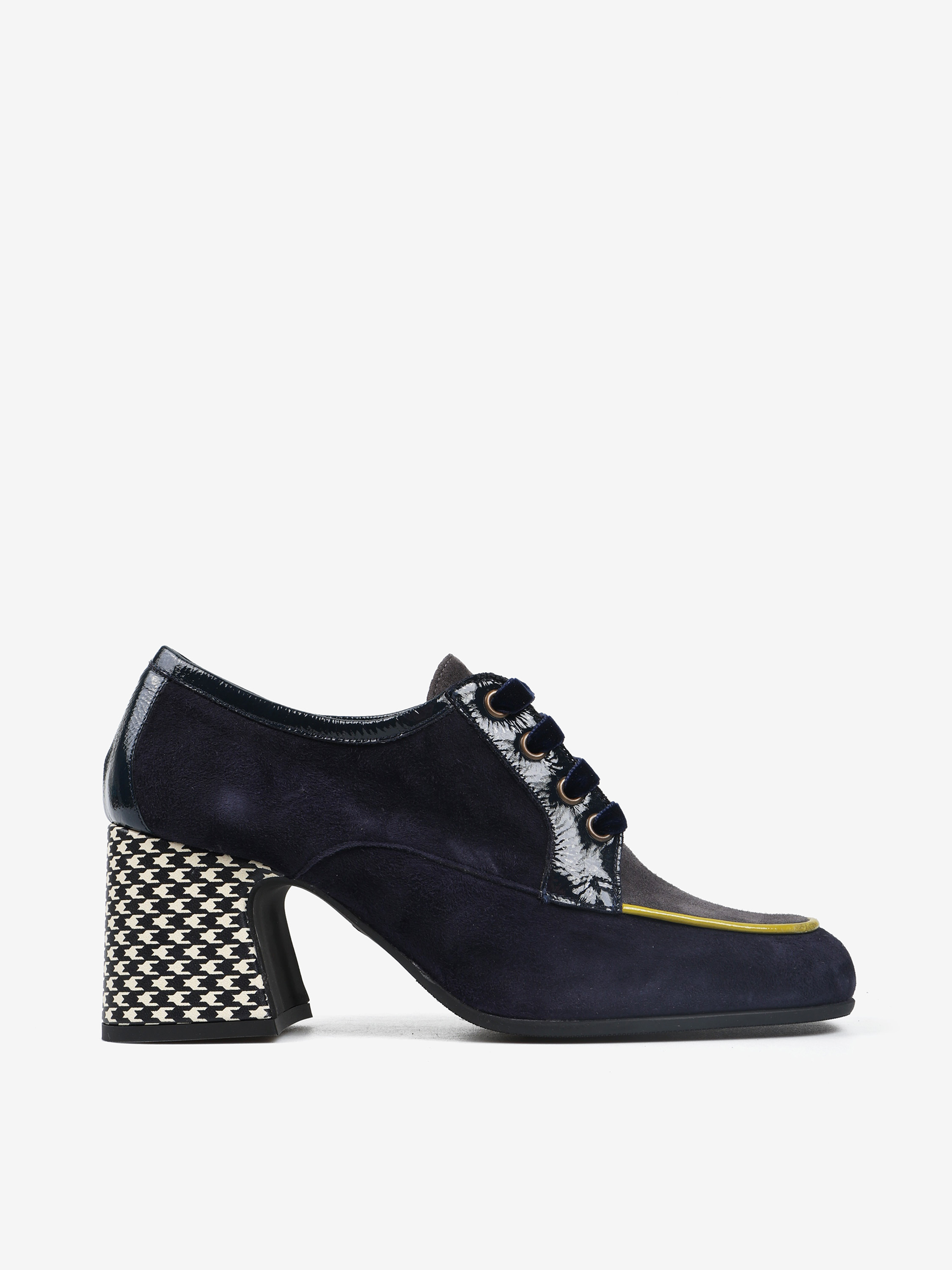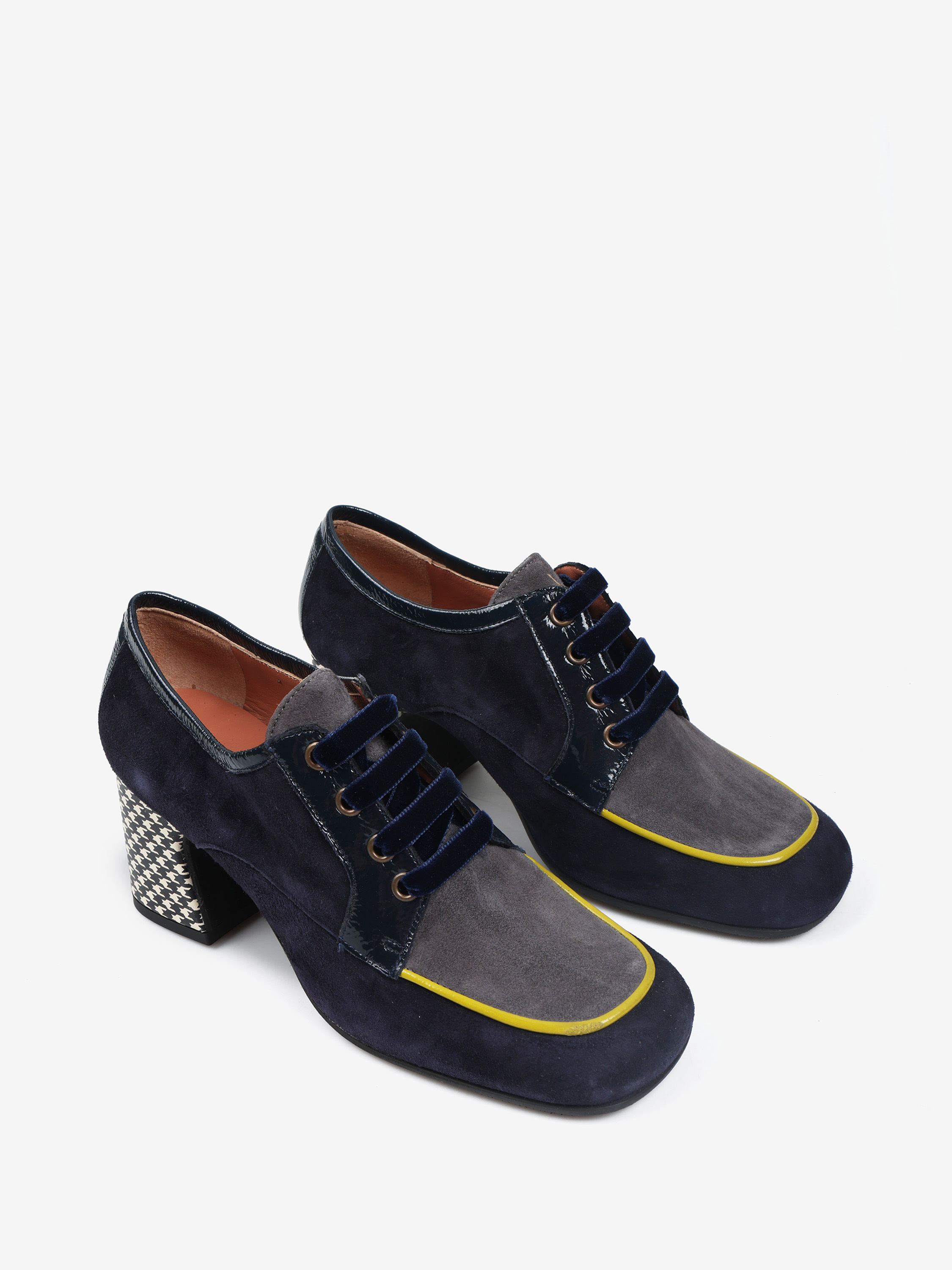 Zamszowe półbuty na wzorzystym słupku. Welurowe sznurowadła i kwadratowe noski z kontrastującą lamówką.
