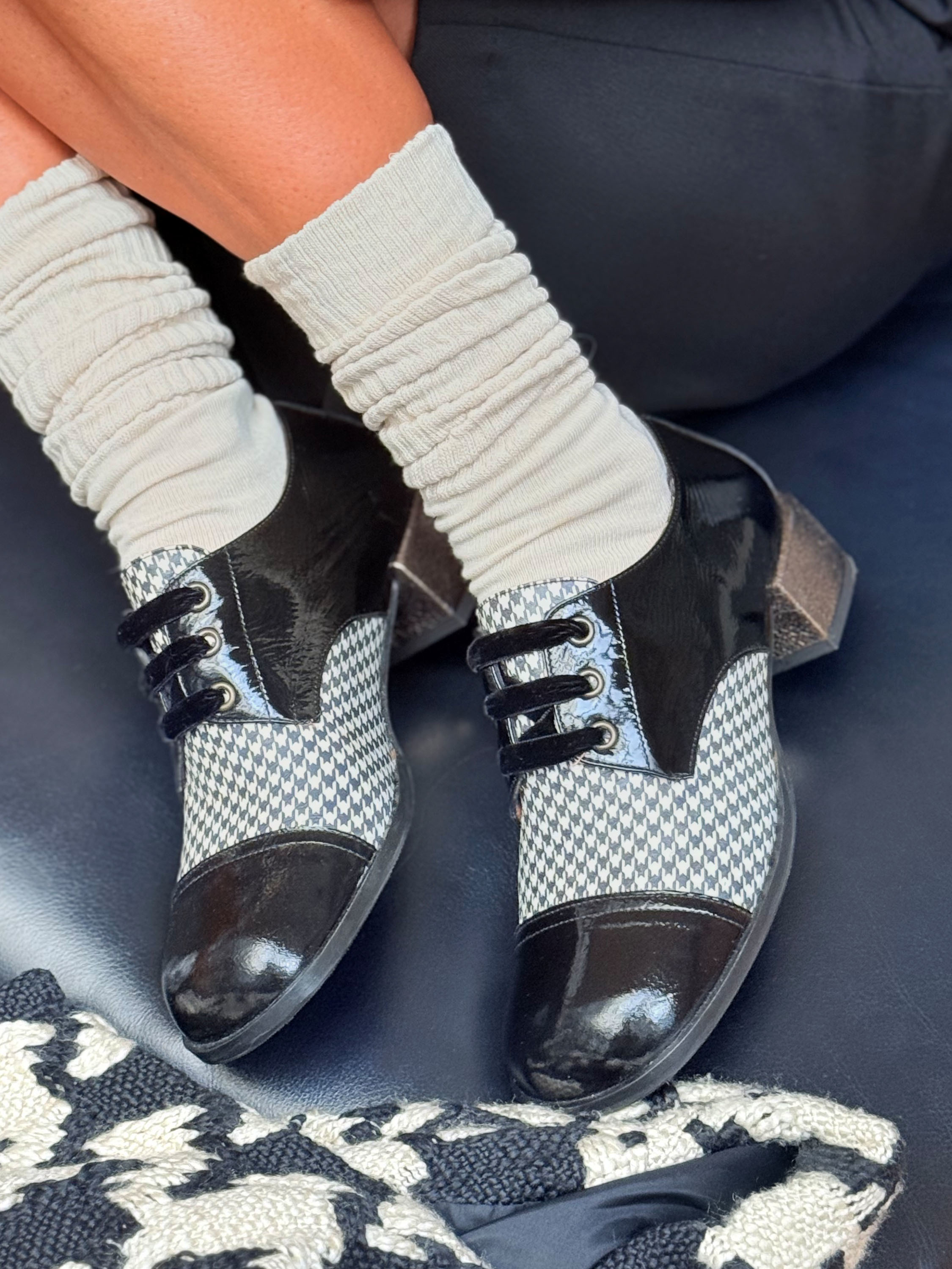 Półbuty na niskim, metalicznym słupku wykonane z lakierowanej skóry ze wzorzystą wstawką. Kwadratowe noski i welurowe sznurowadła.