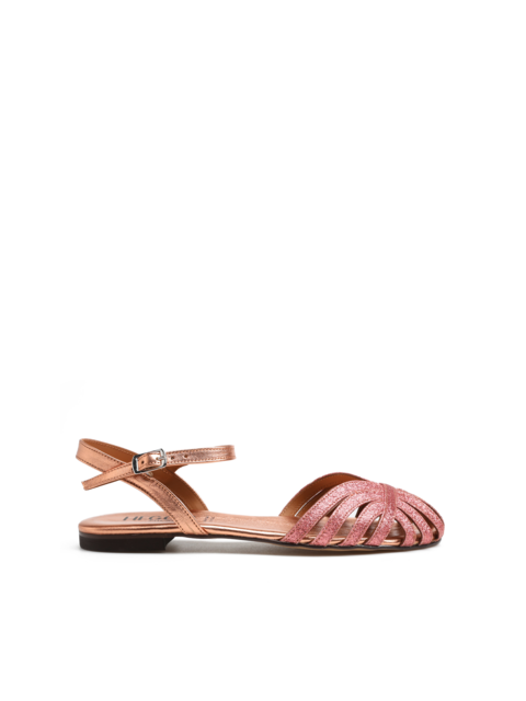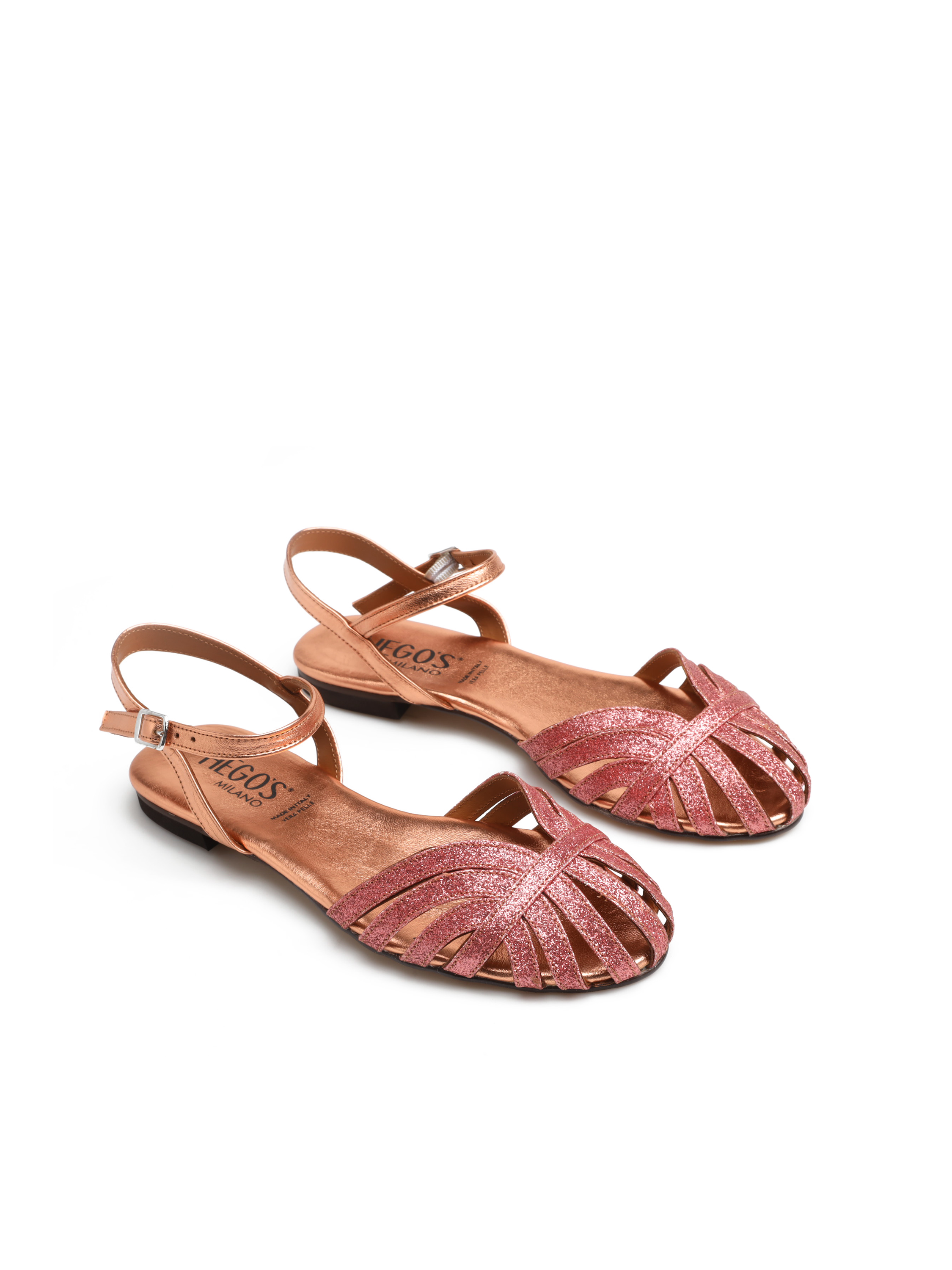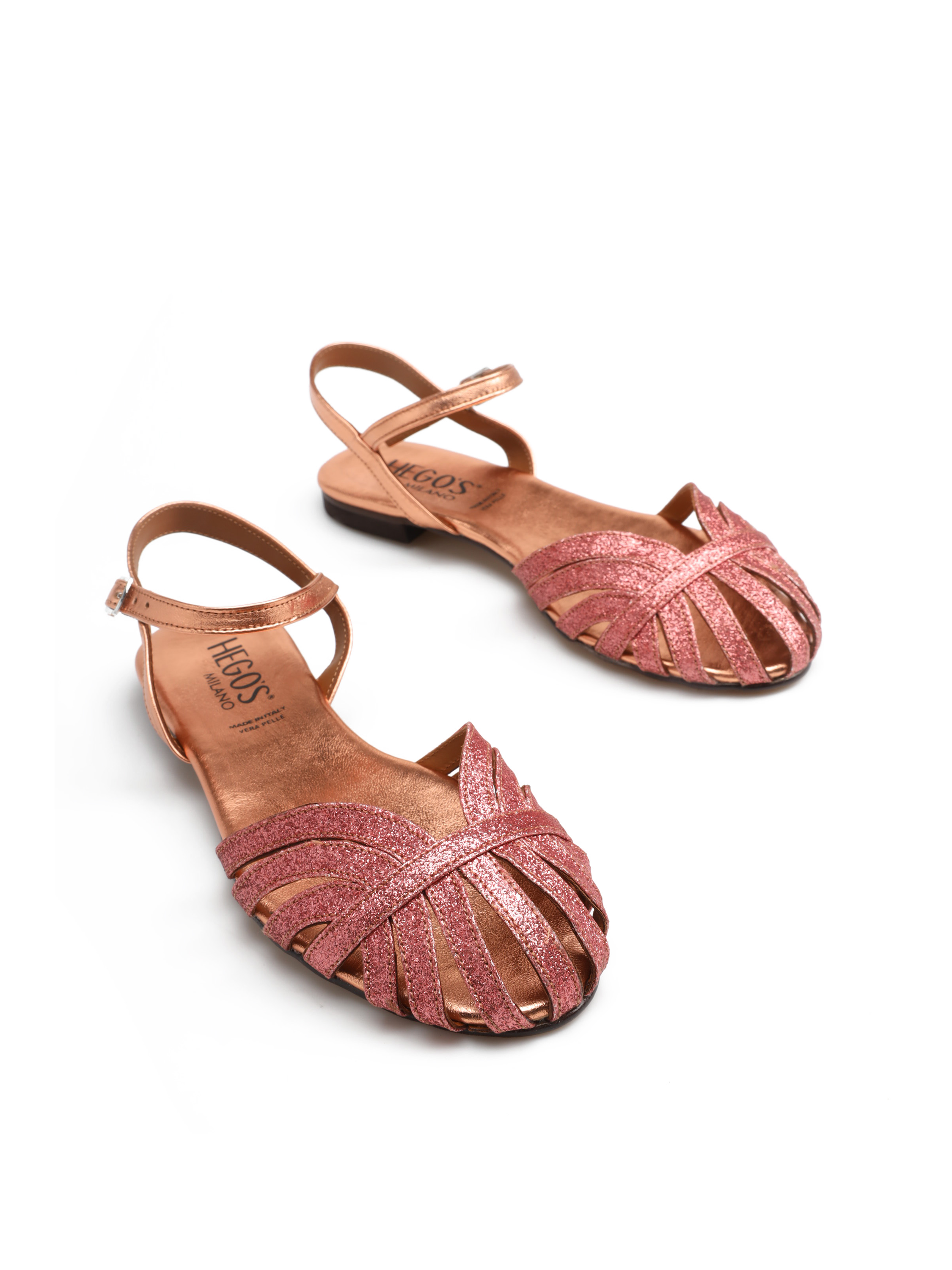 Sandały z zabudowanymi palcami to model dla kobiet szukjących modnych i wygodnych rozwiązań. Skórzane, w całości zbudowane z pasków. Cholewka przy palcach pokryta jest brokatem. Miękkie, lekkie, wygodne. Zapinane regulowanym paskiem na sprzączkę, dopasują się do Twojej stopy. Sandały damskie będą uzupełnieniem letniej garderoby kobiety.