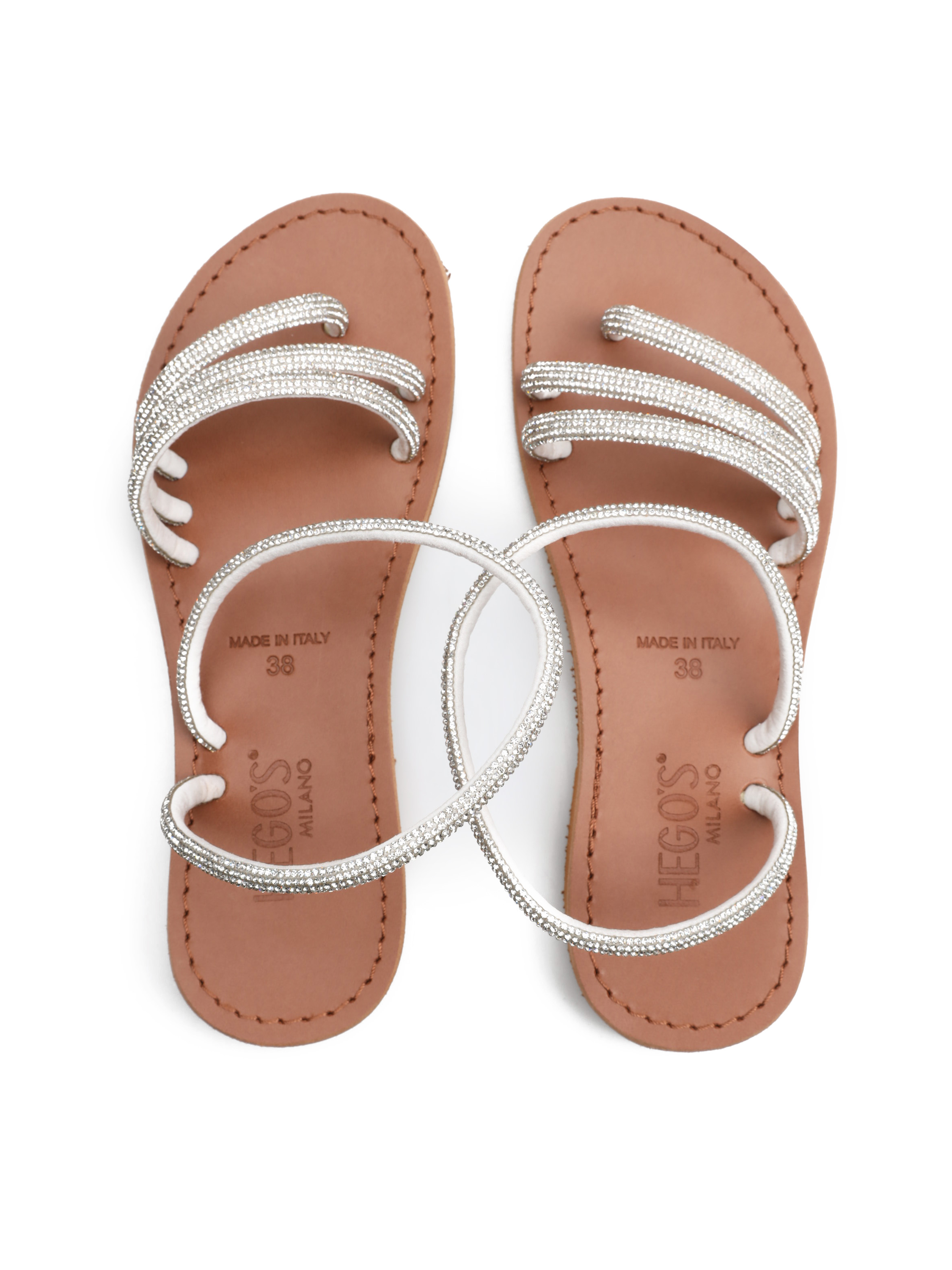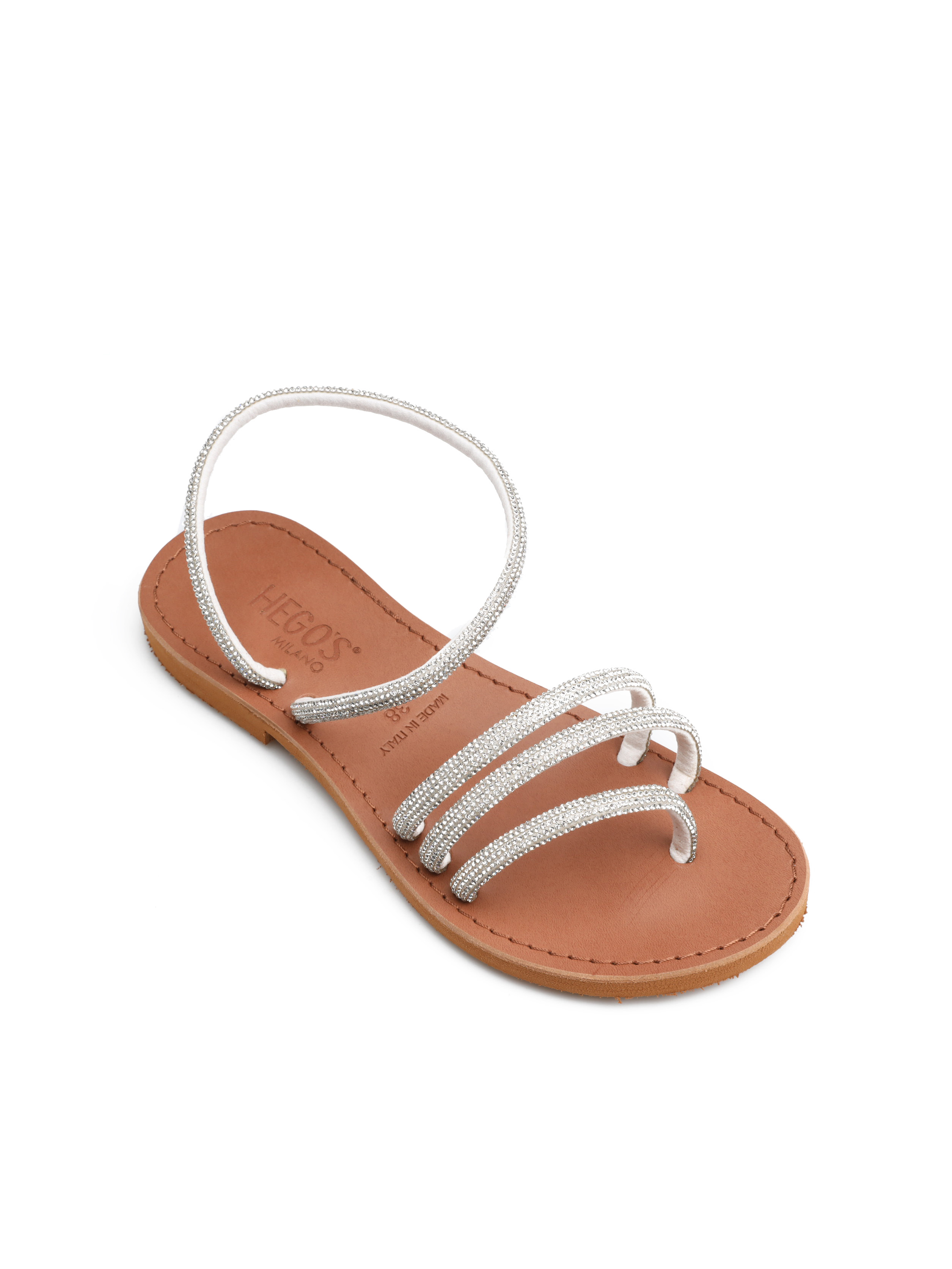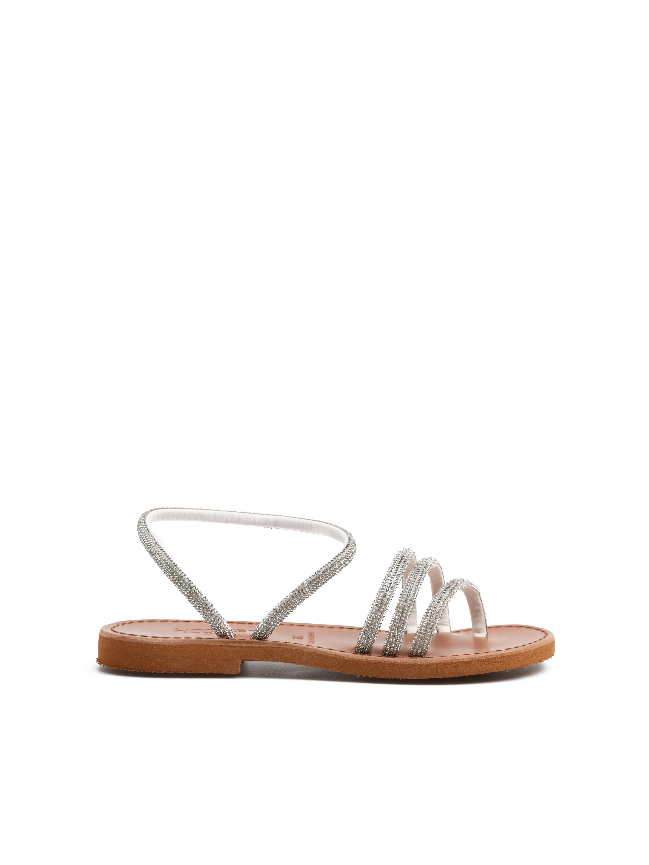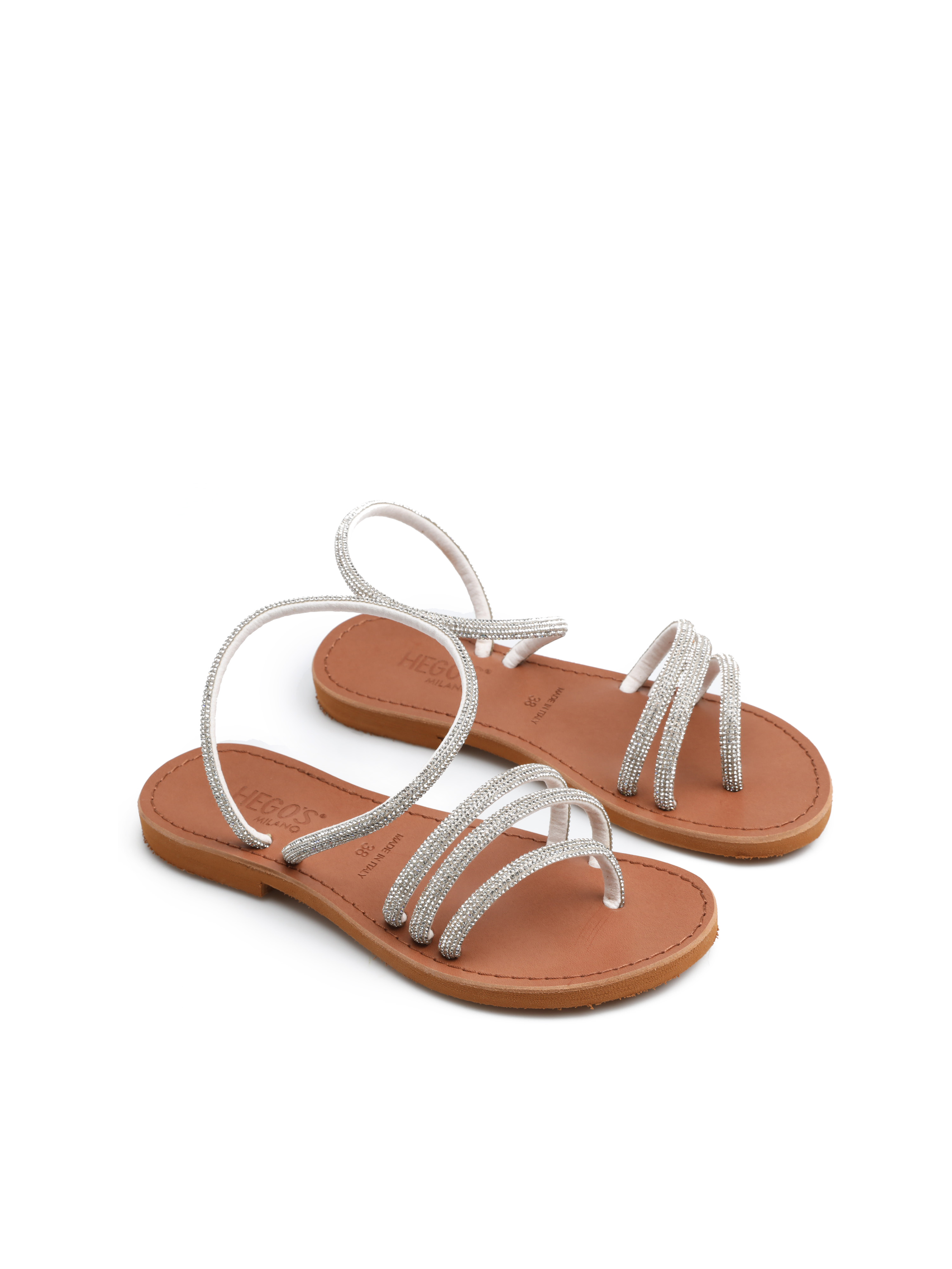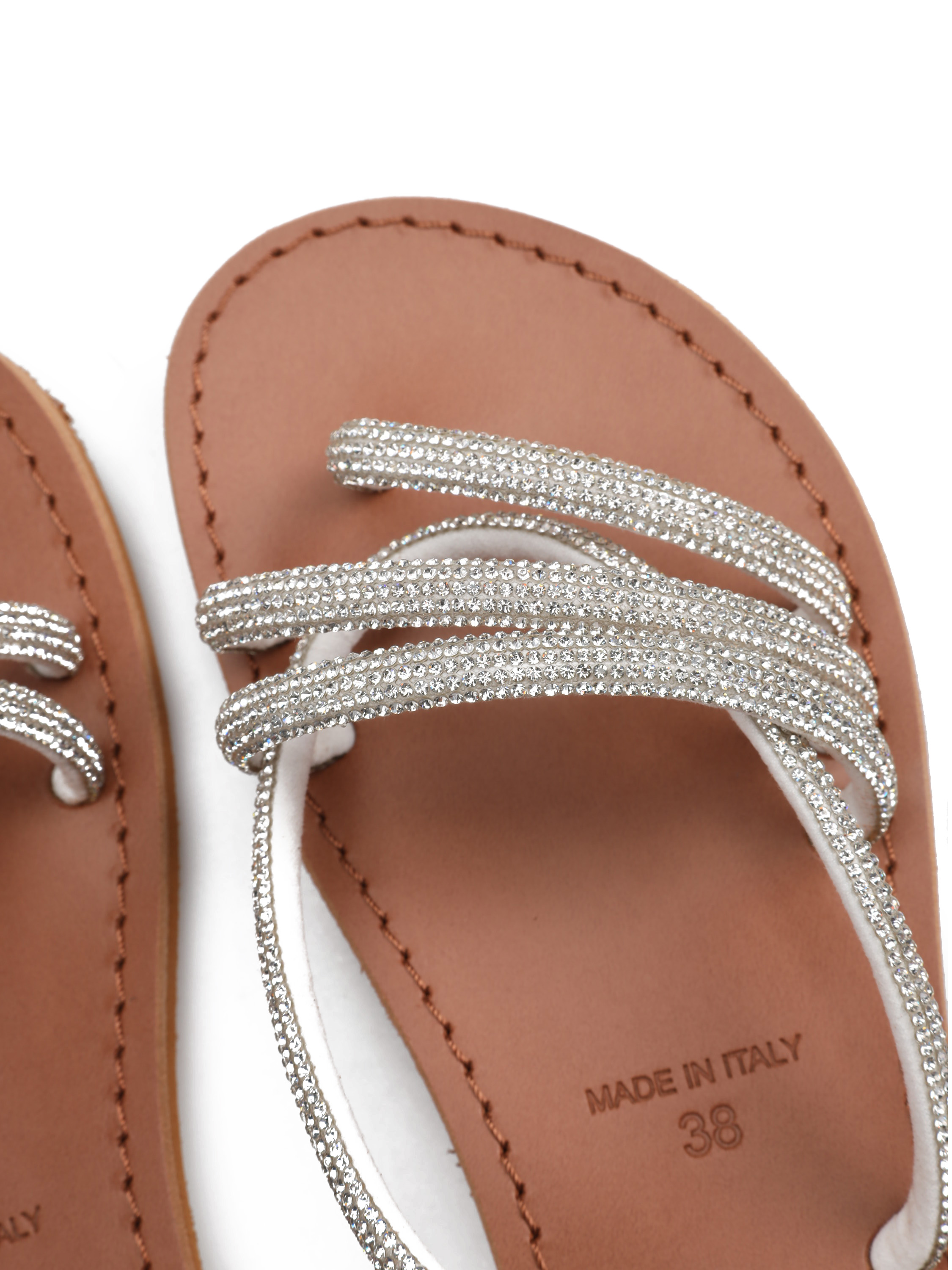Wsuwane sandały zaprojektowane z pasków to model idealny na lato. Lekkie i wygodne. Cholewka pokryta została błyszczącymi kamieniami. Wkładka z naturlanej skóry. Minimalistyczny model będzie pasował do wkacyjnych stylizacji.