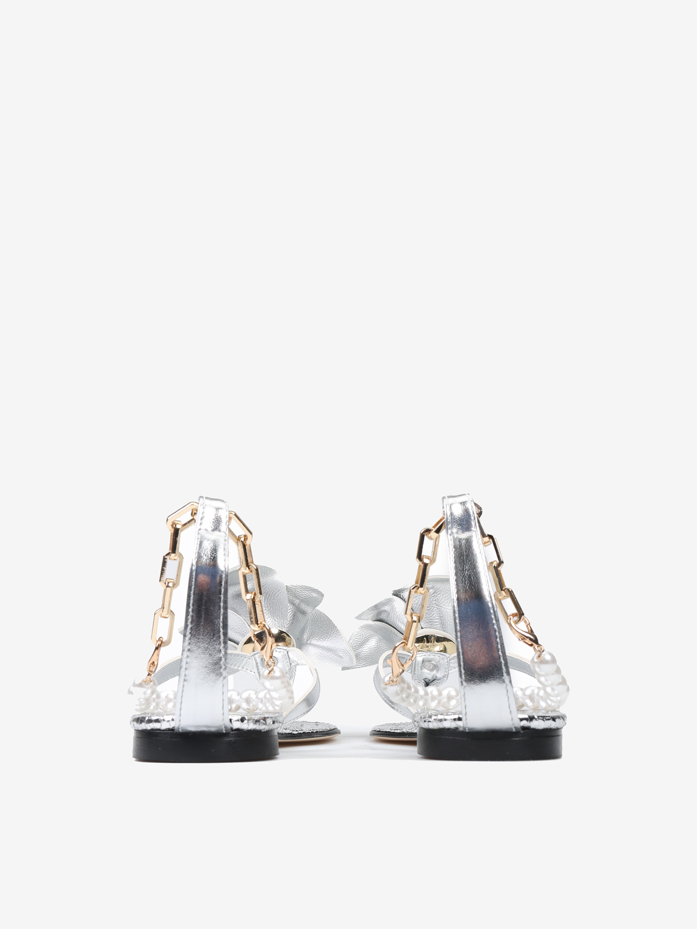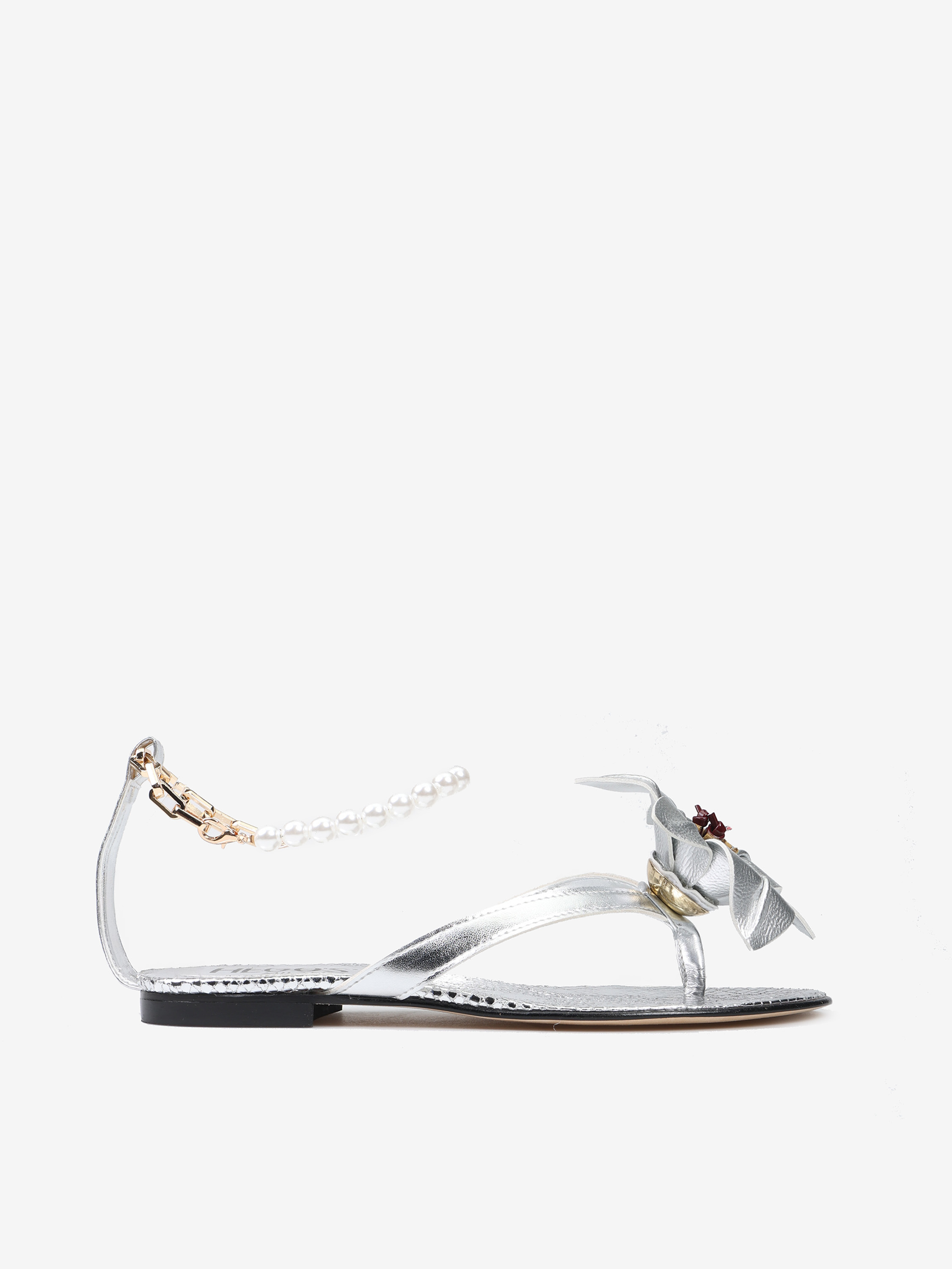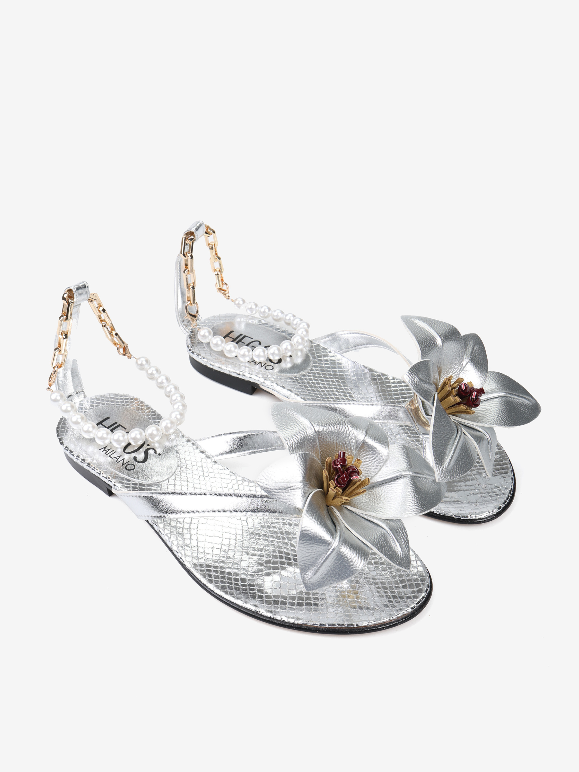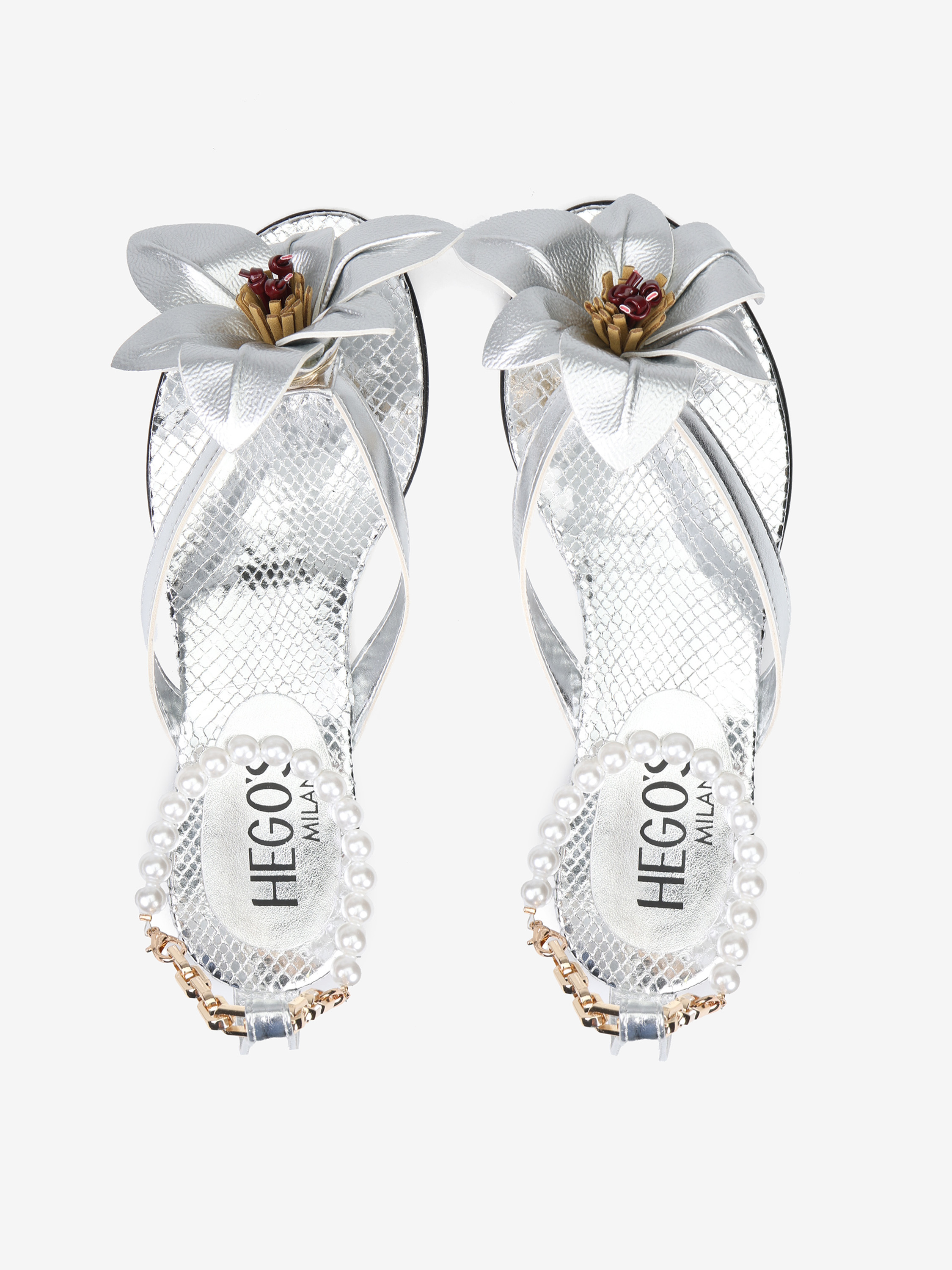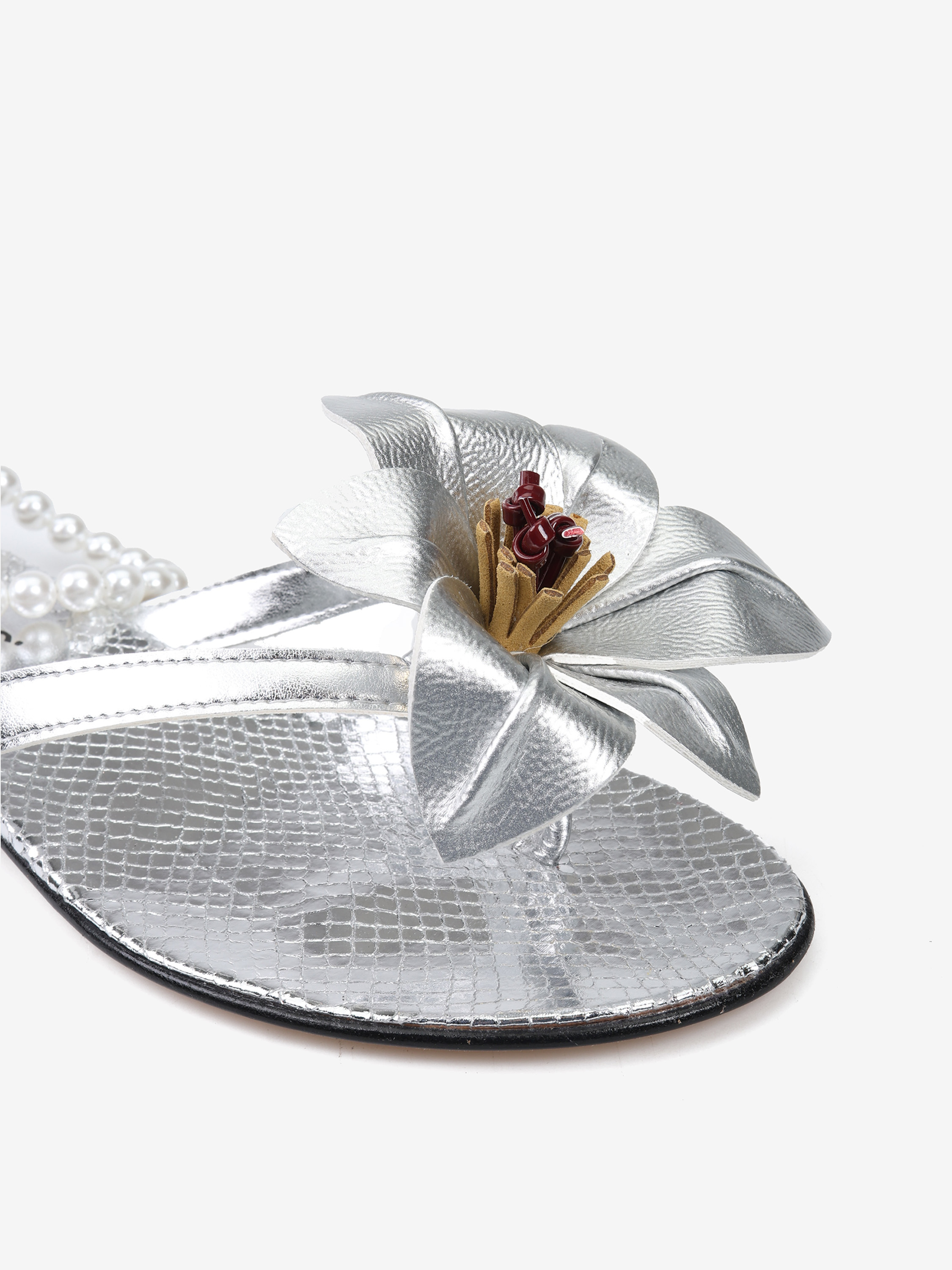 Metaliczne sandały w stylu japonek z ozdobnym, skórzanym kwiatem i paskiem z pereł na kostce.