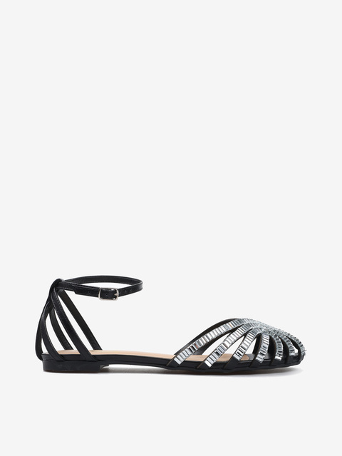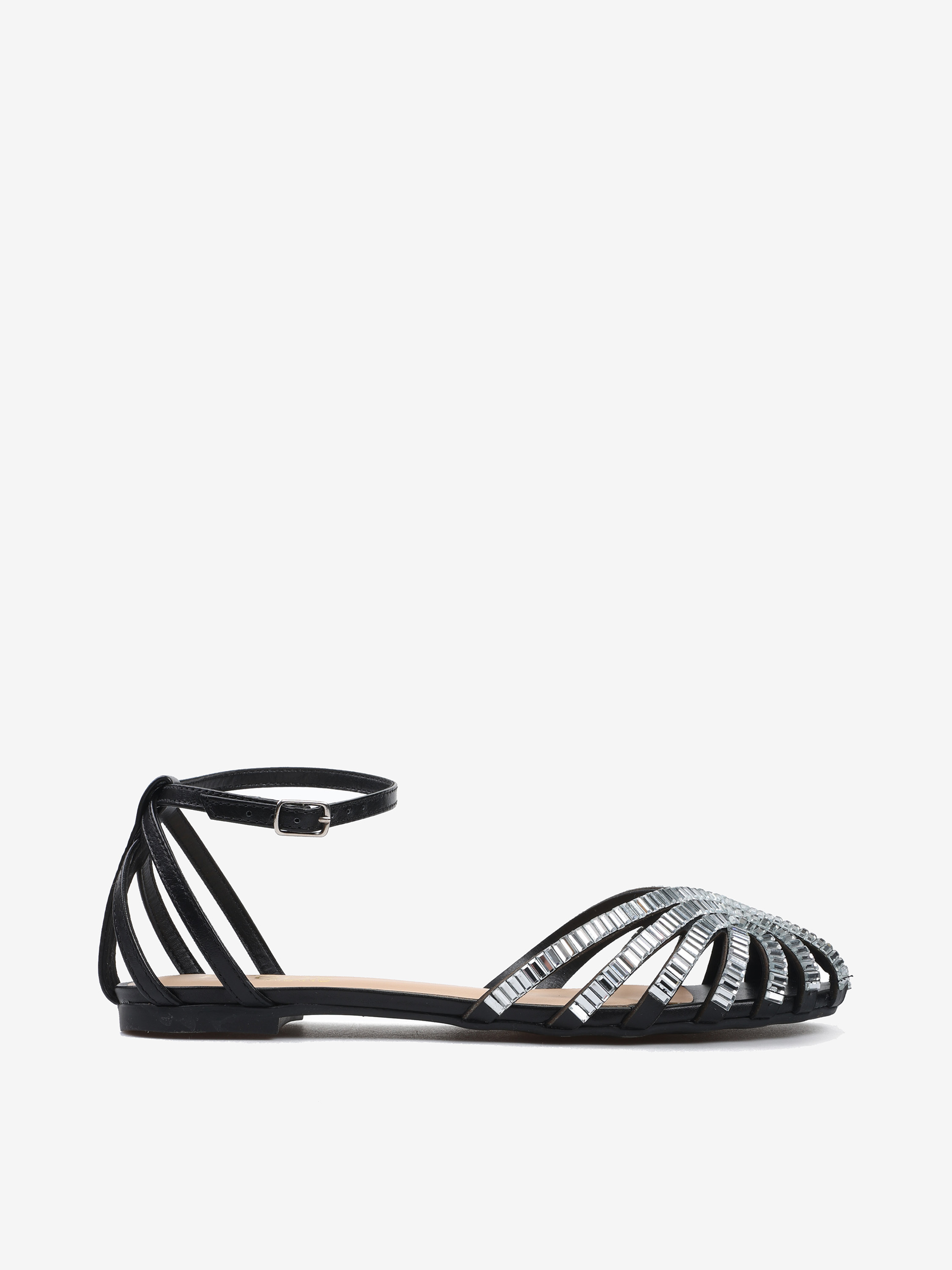 Sandały z paskami ze skóry naturalnej, wykończone ozdobnymi kryształkami na zabudowanym nosku. Płaska podeszwa i regulowane zapięcie przy kostce.