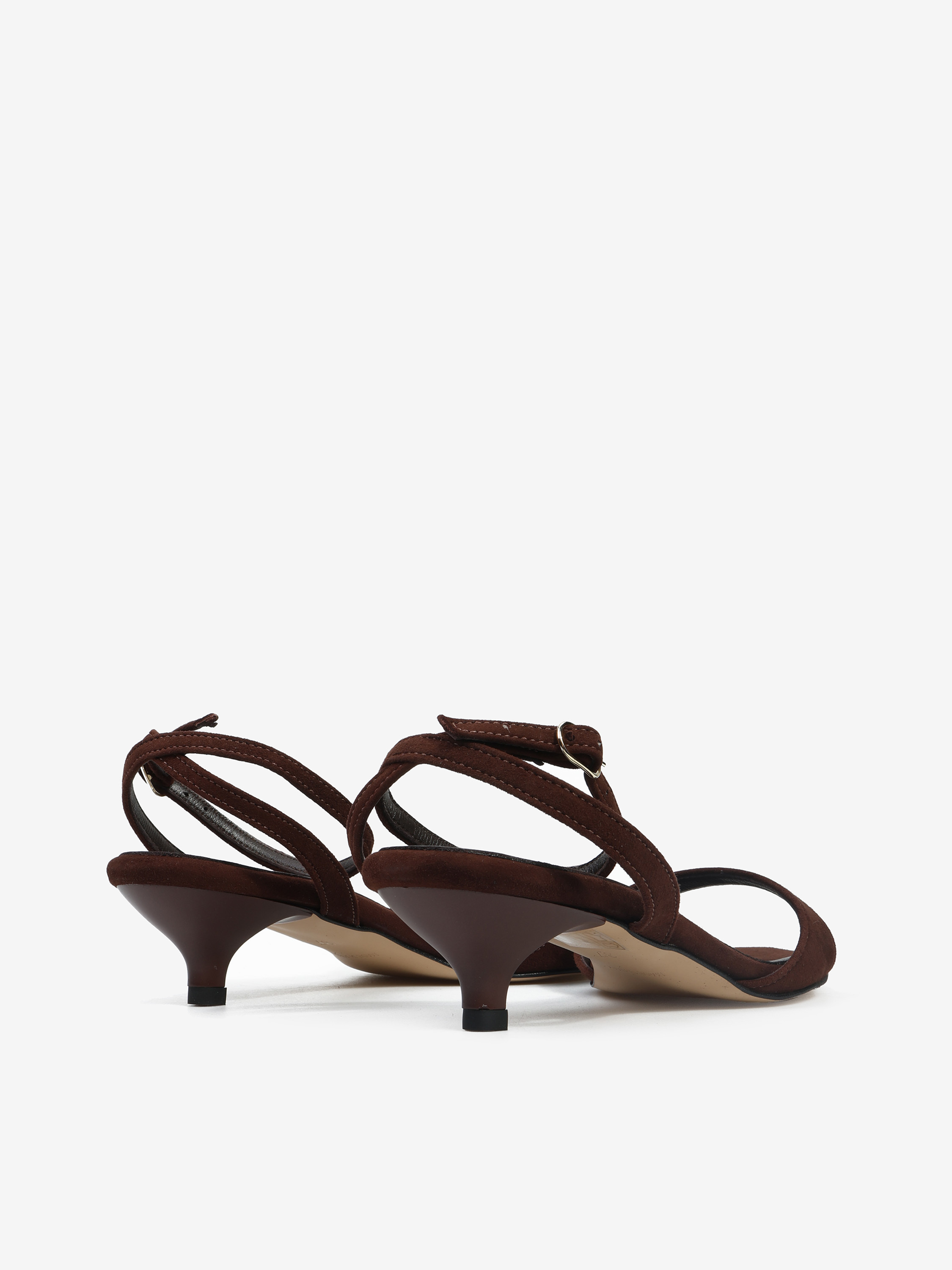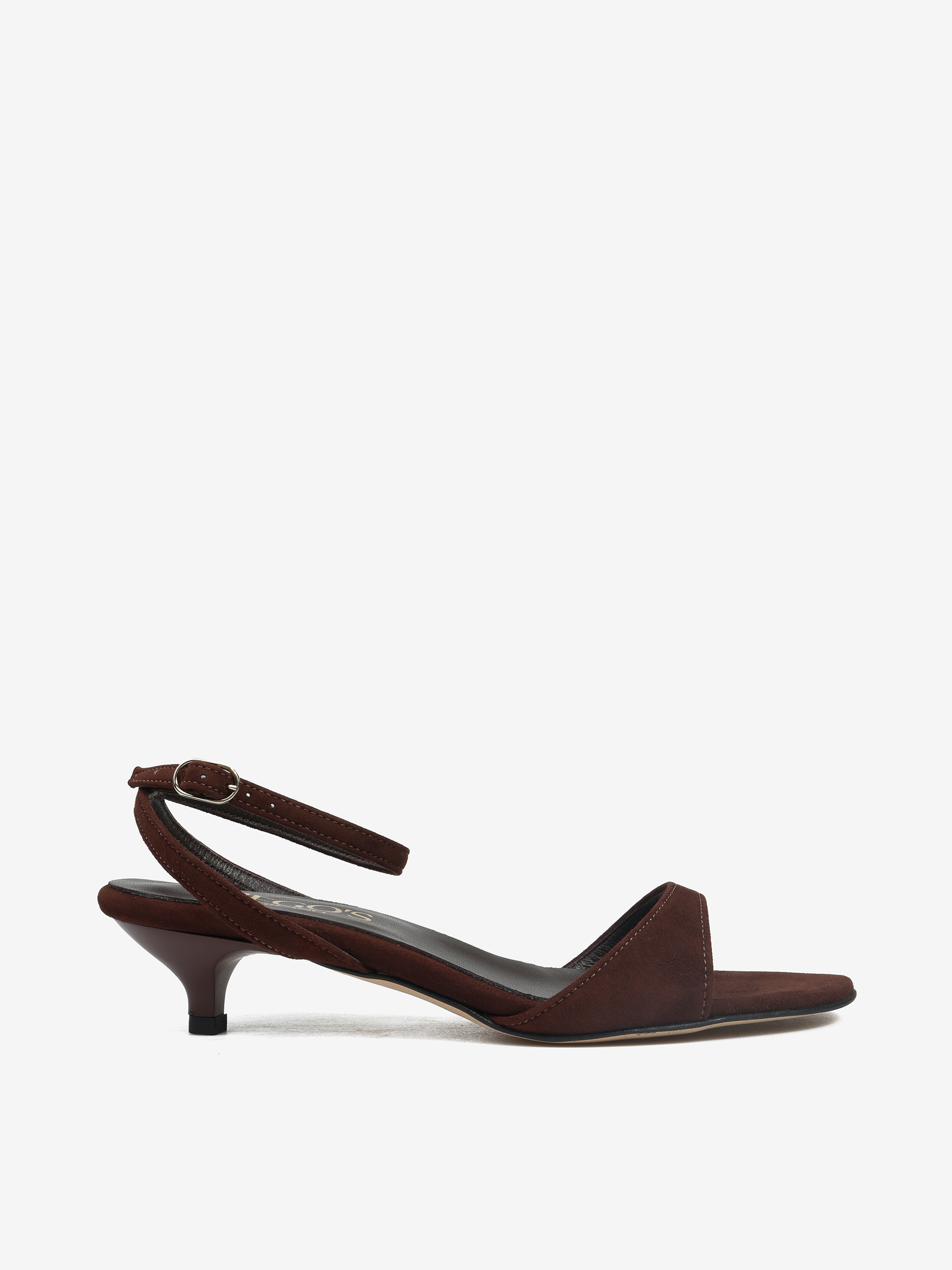 Subtelne sandały na niskiej szpilce wykonane z brązowego zamszu. Regulowane zapięcie na kostce.