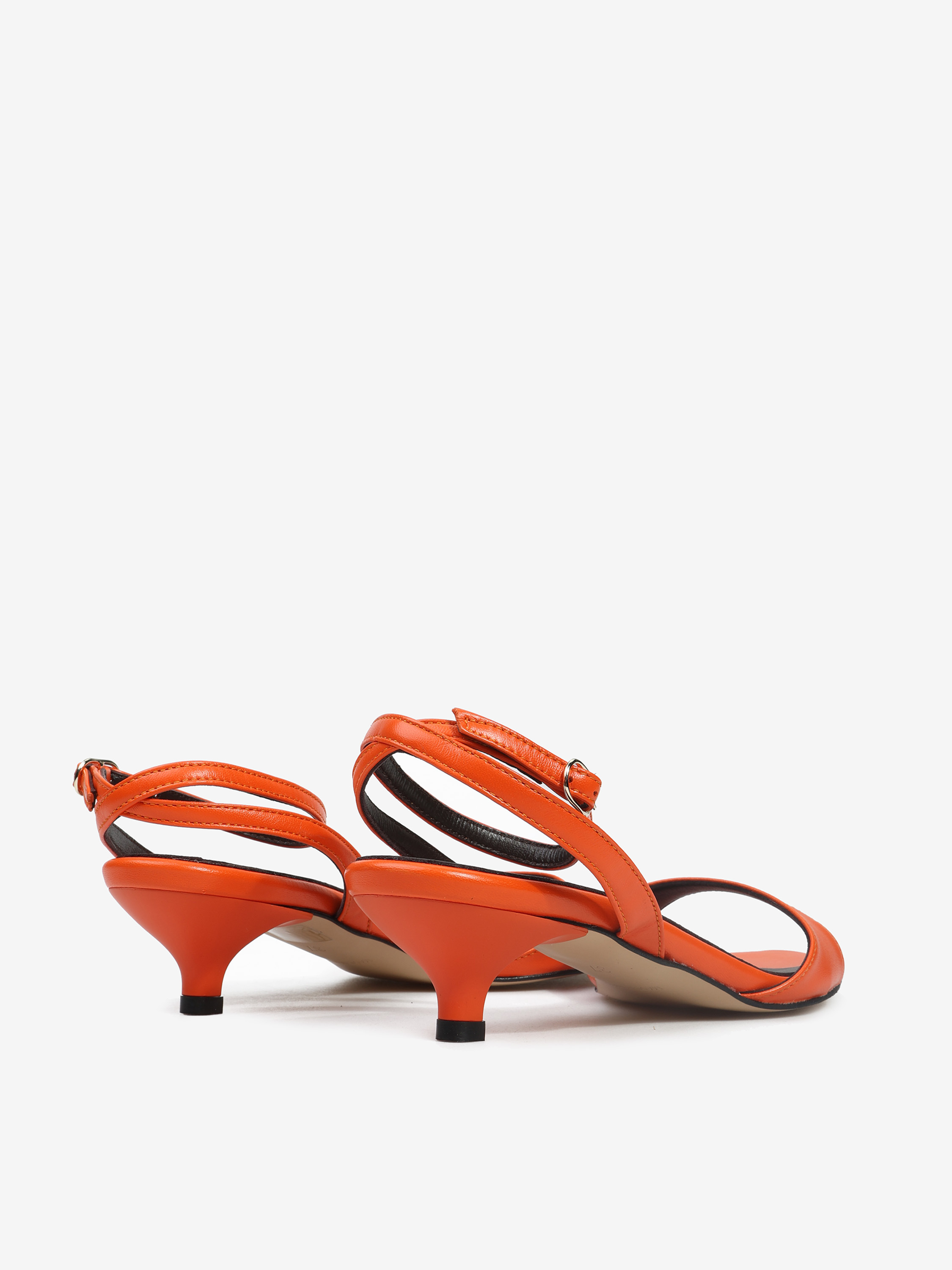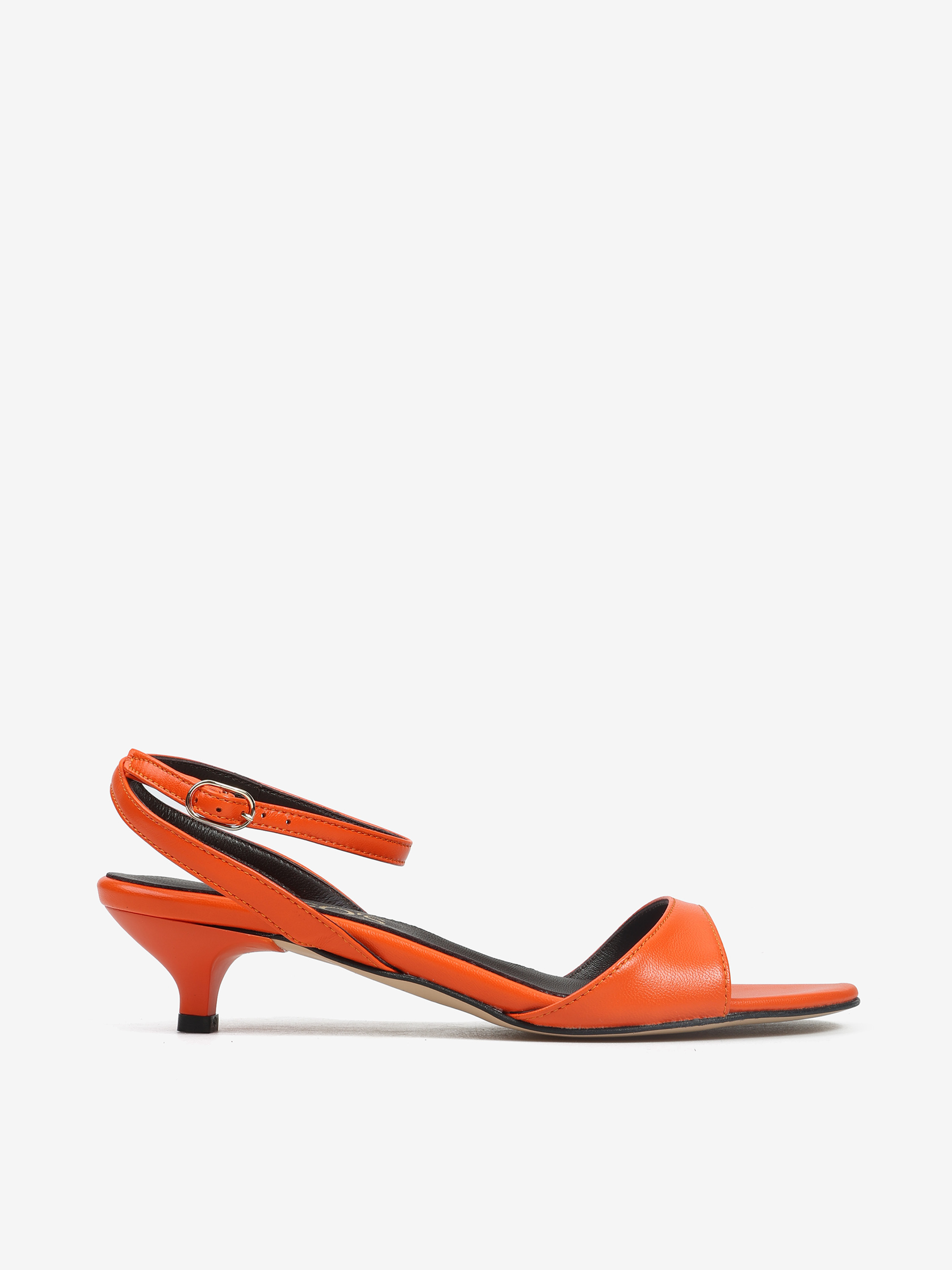 Subtelne sandały na niskiej szpilce wykonane z pomarańczowej, delikatnej skóry. Regulowane zapięcie na kostce.