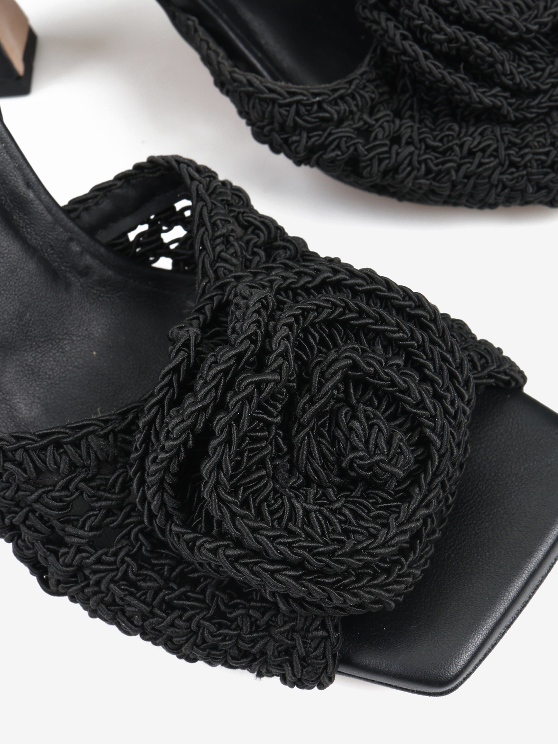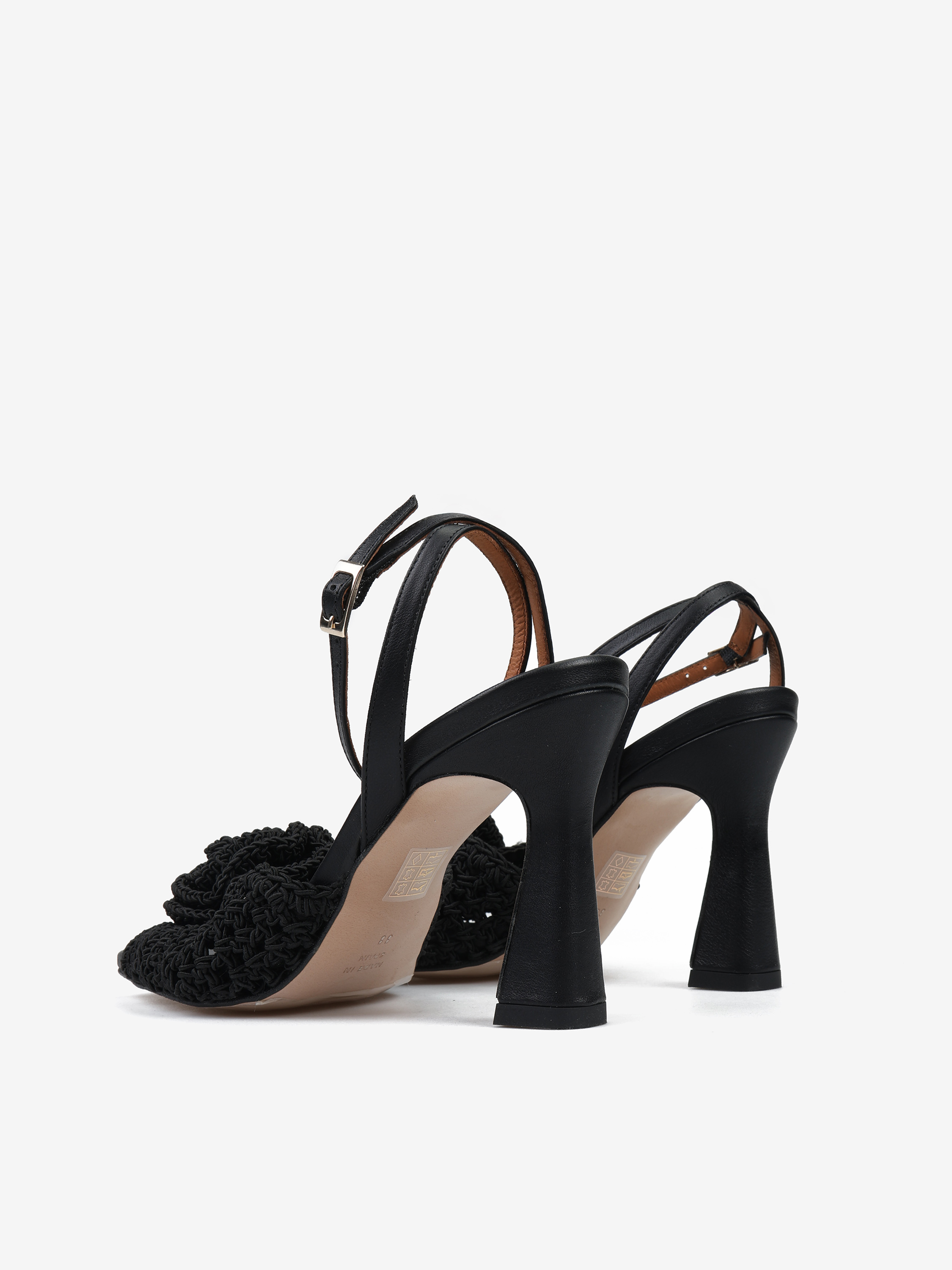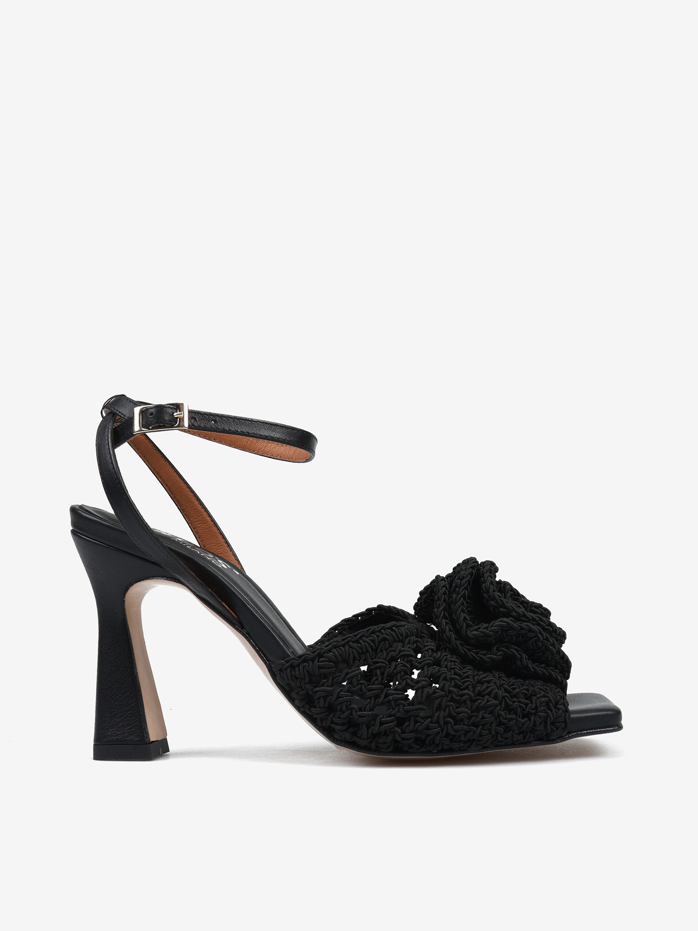Sandały na wysokim obcasie z regulowanym paskiem na kostce i ozdobnym, szydełkowym kwiatem.