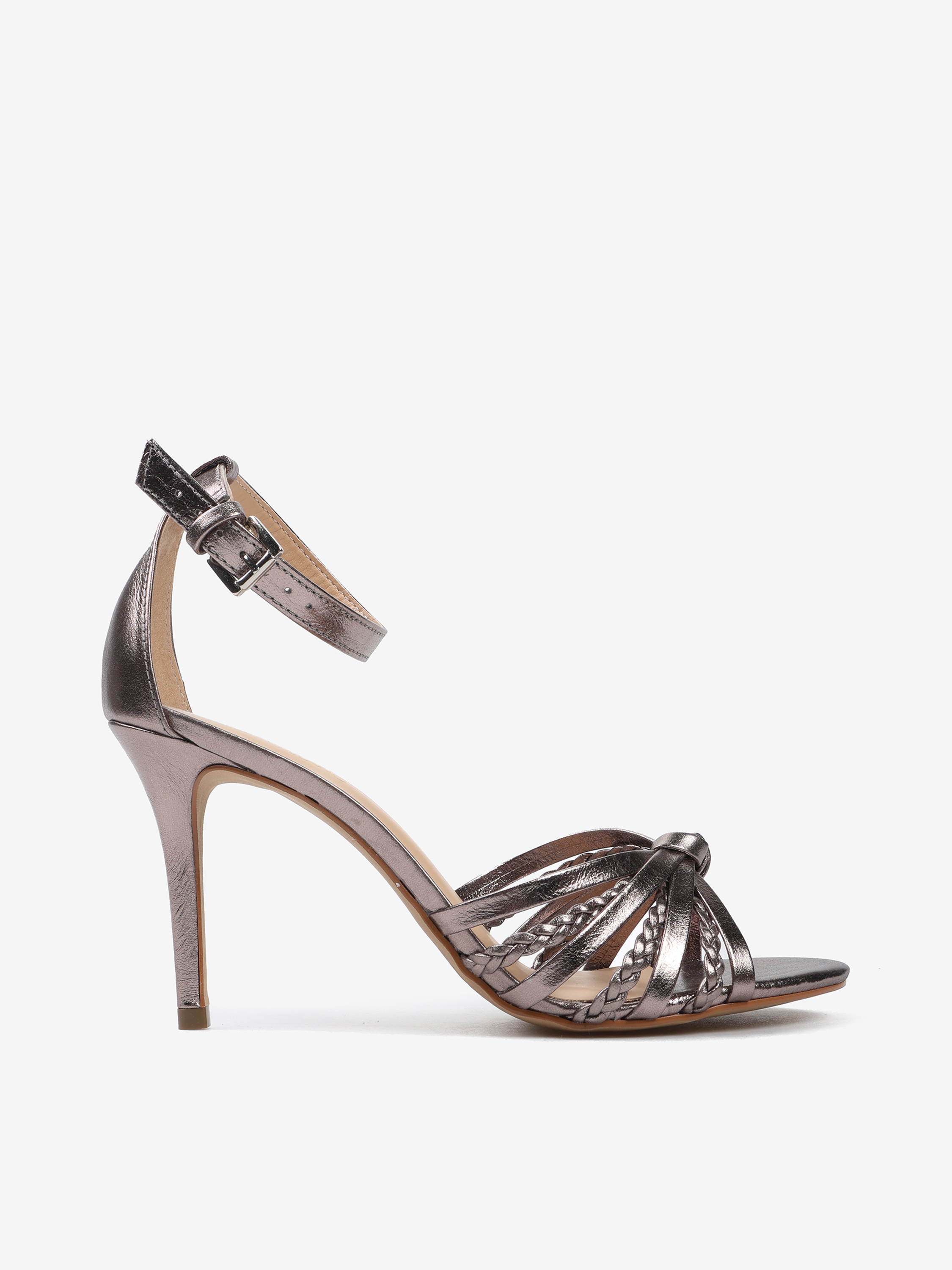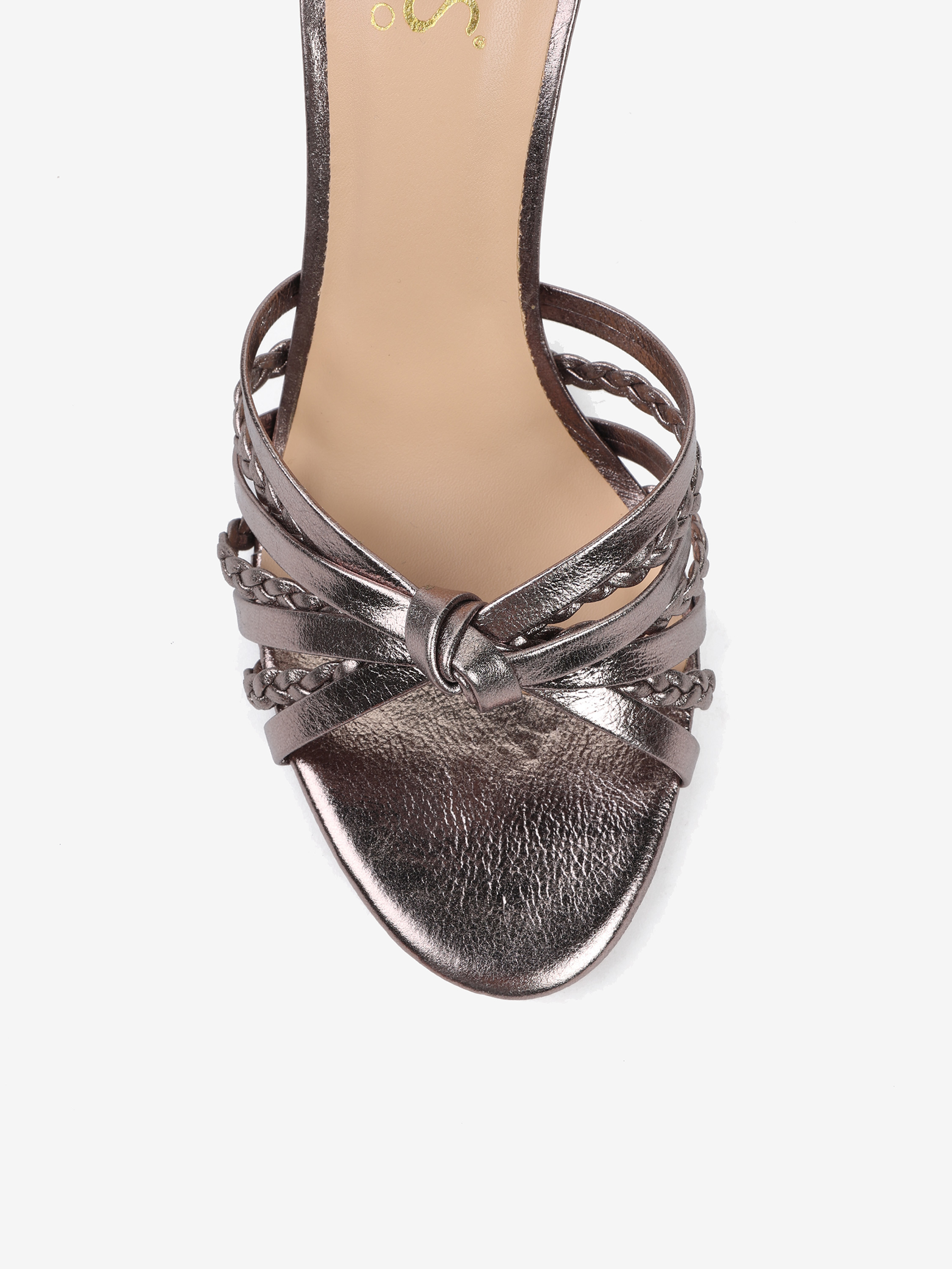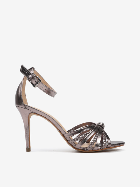 Sandały paskami z gładkiej oraz plecionej w warkocz skóry metalizowanej. Zakryta pięta i regulowane zapięcie na kostce.