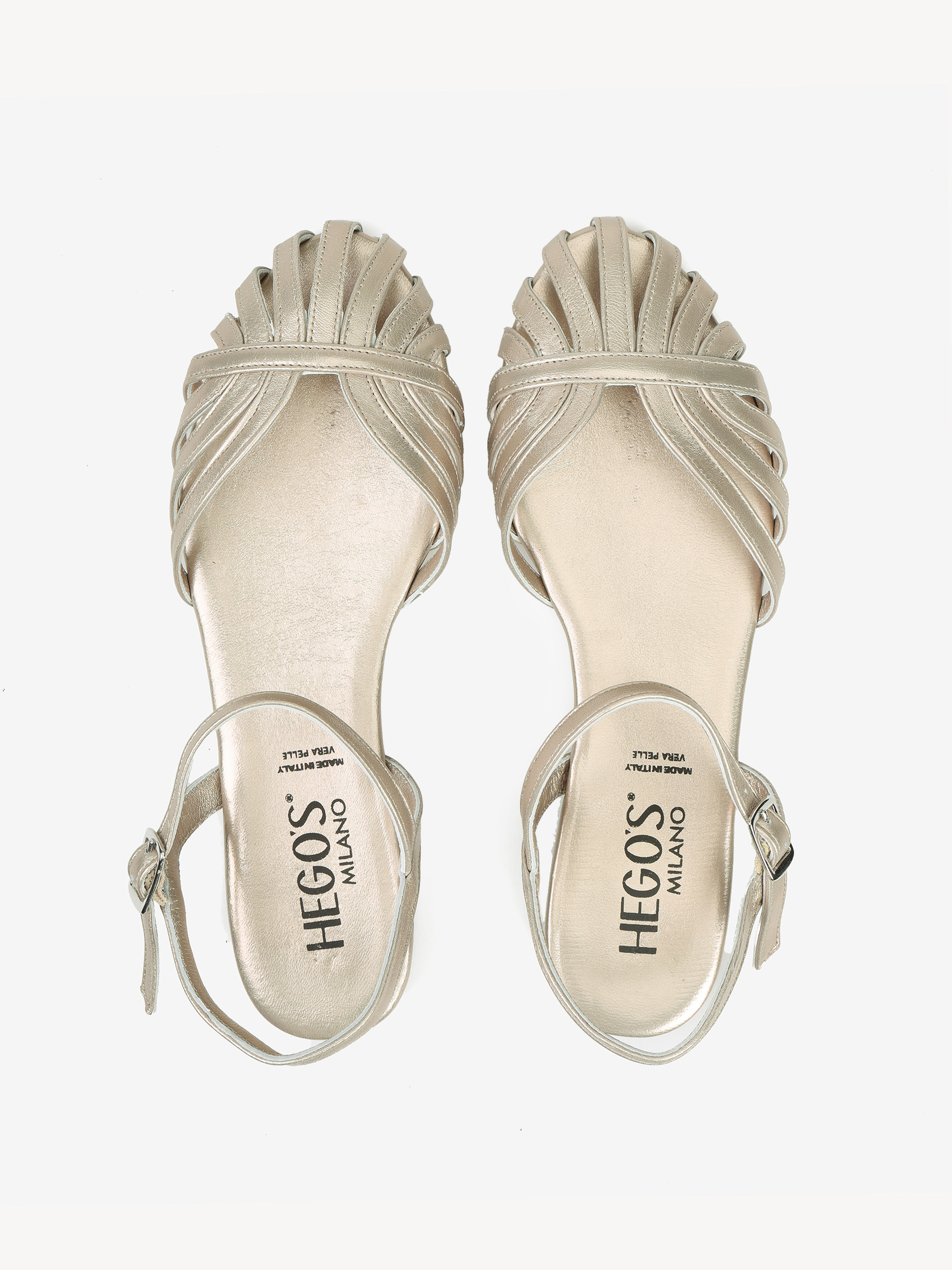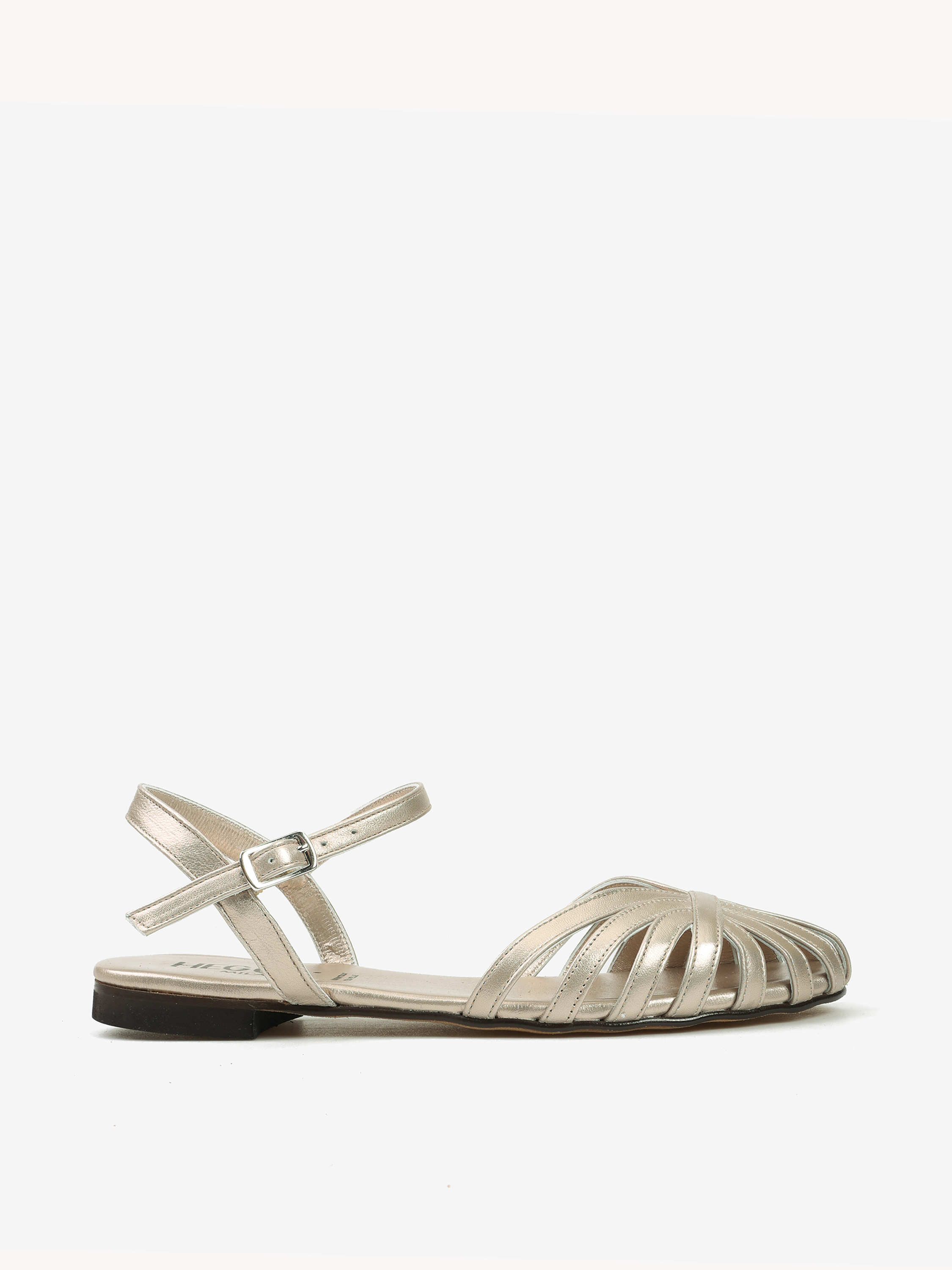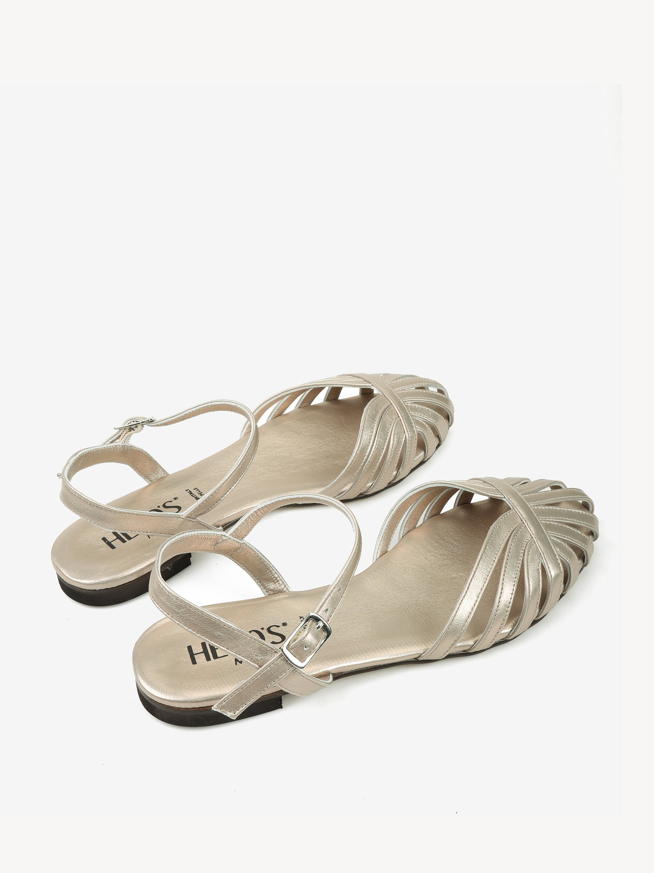 Metaliczne sandały z zabudowanym noskiem wykonanym ze skórzanych pasków. Regulowany pasek na kostce.
