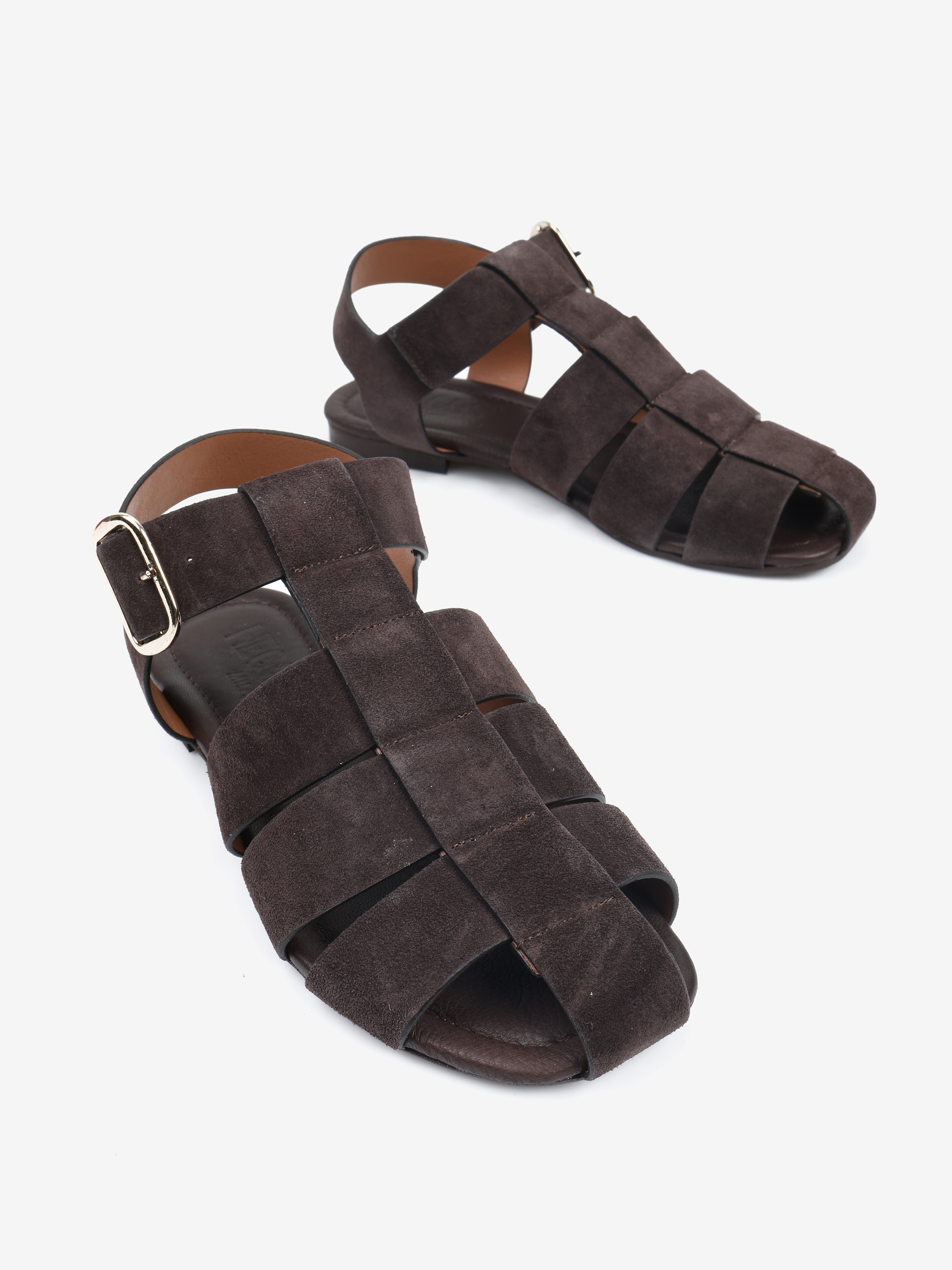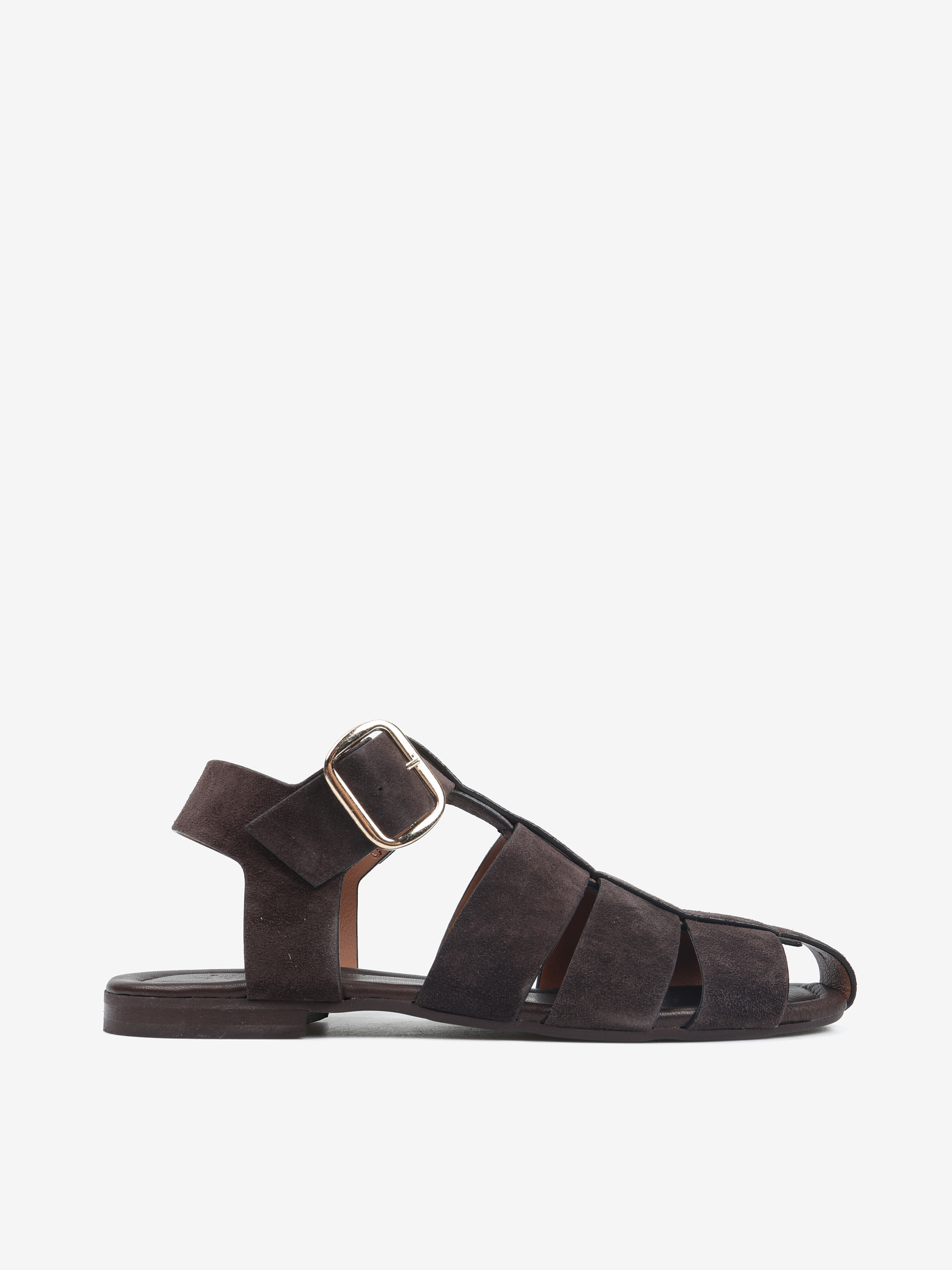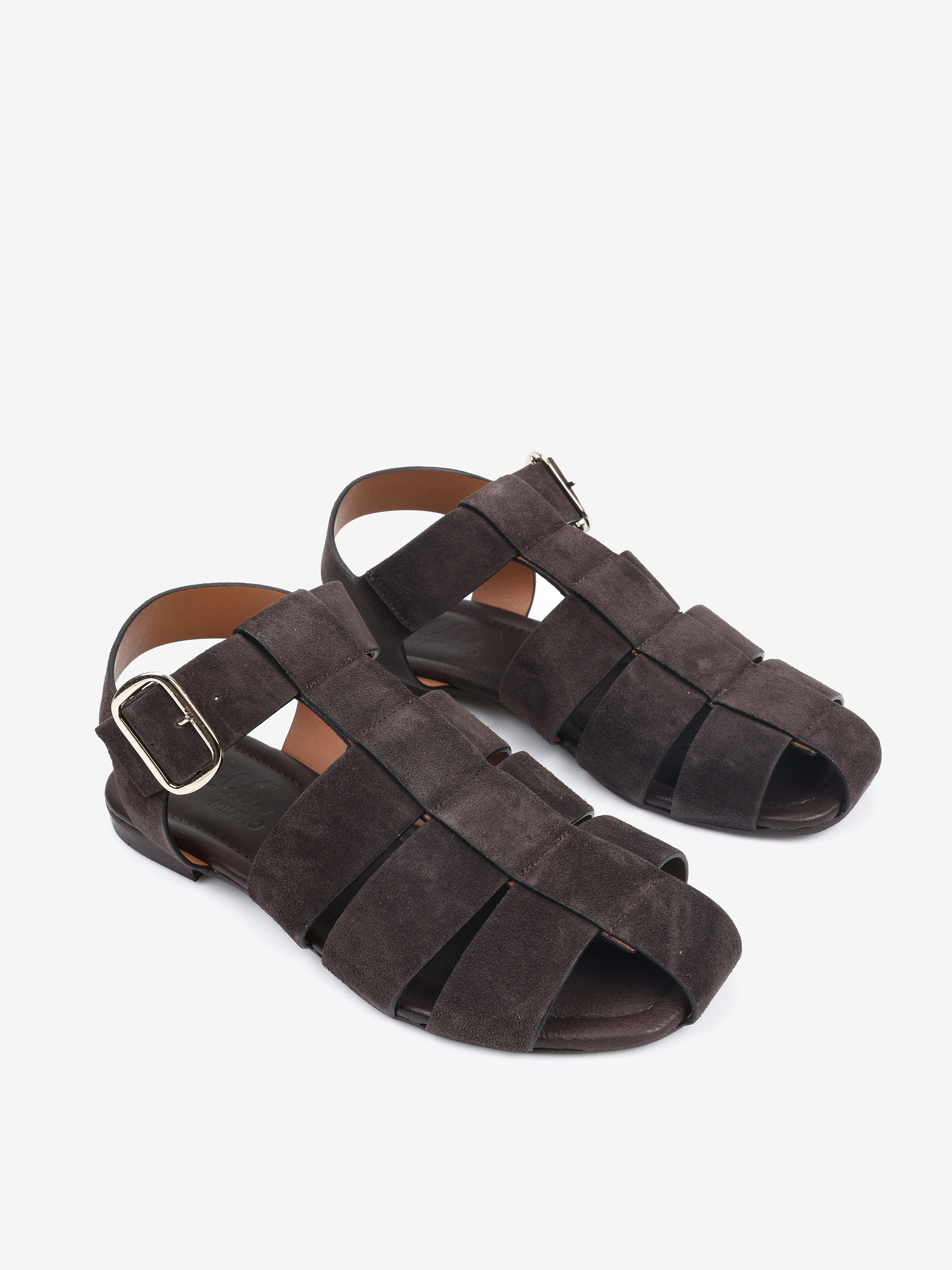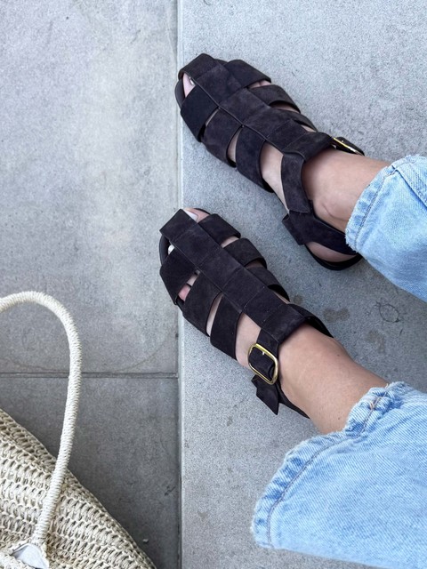 Sandały z zabudowanym noskiem wykonane z zamszowych pasków. Regulowane zapięcie na kostce.