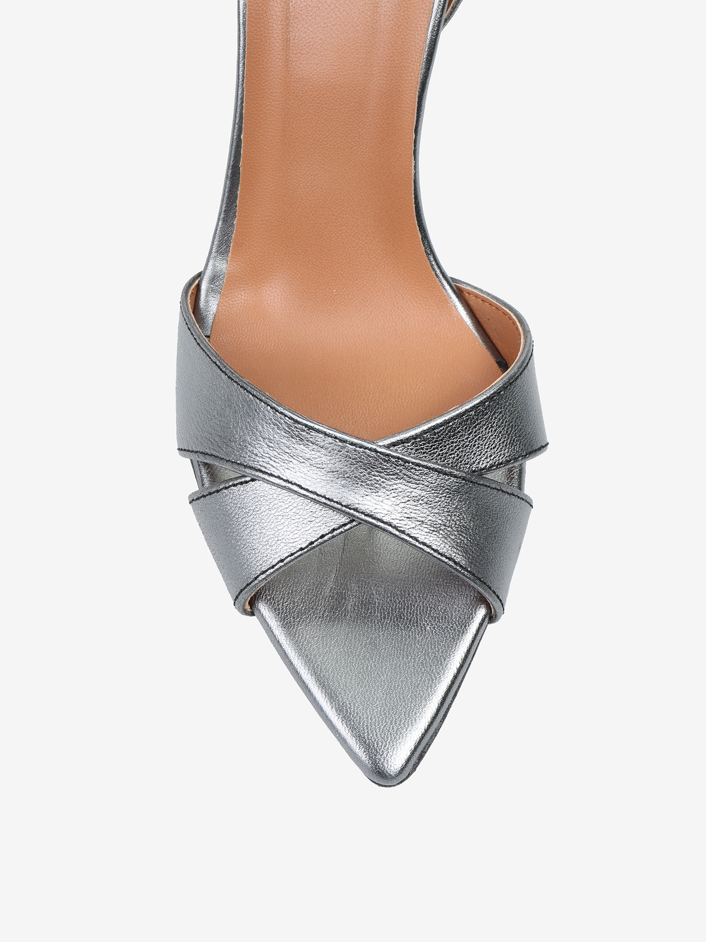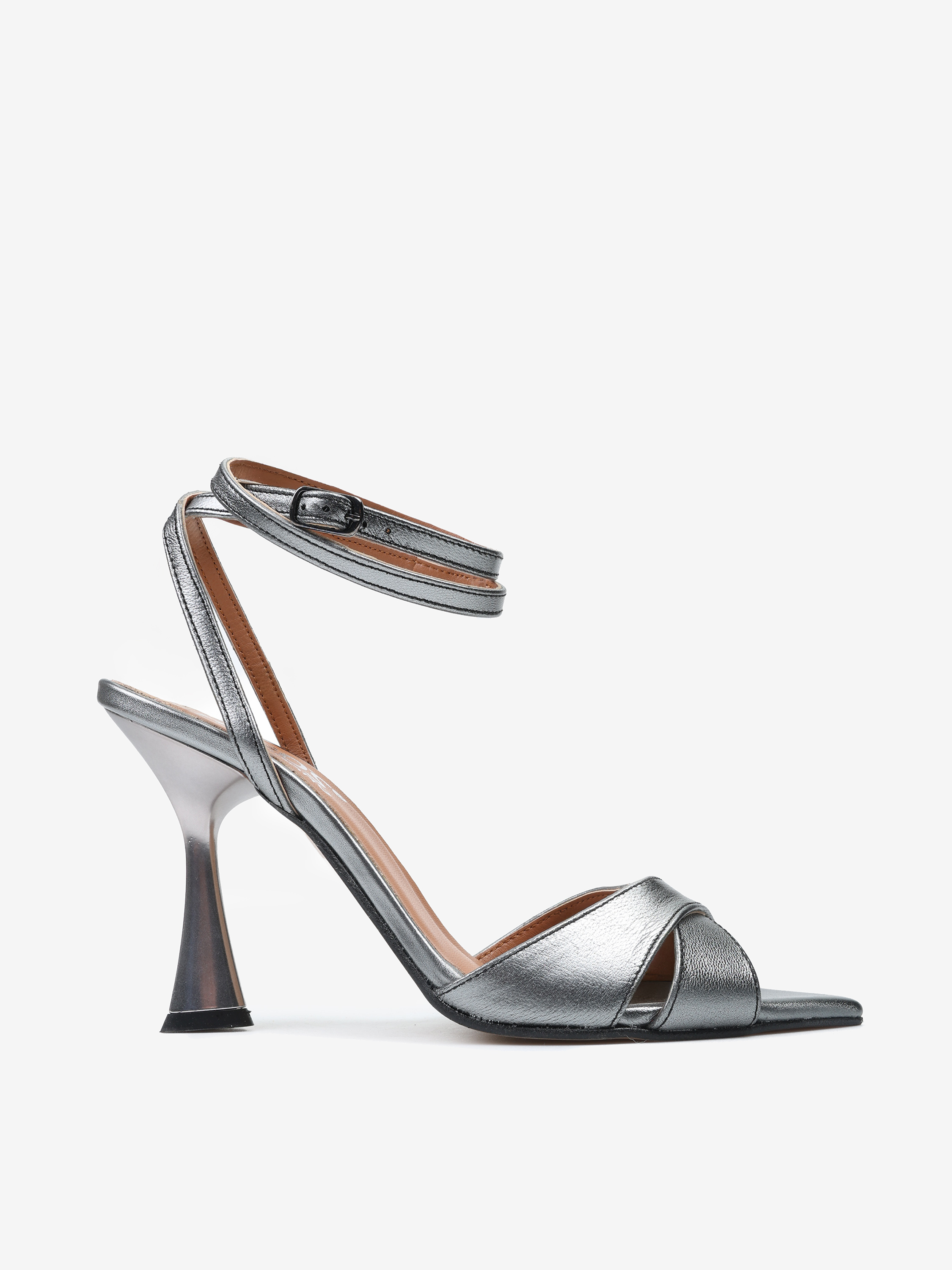 Sandałki na wysokiej szpilce wykonane z metalizowanej skóry. Nosek w szpic i ozdobne wiązanie na kostce.