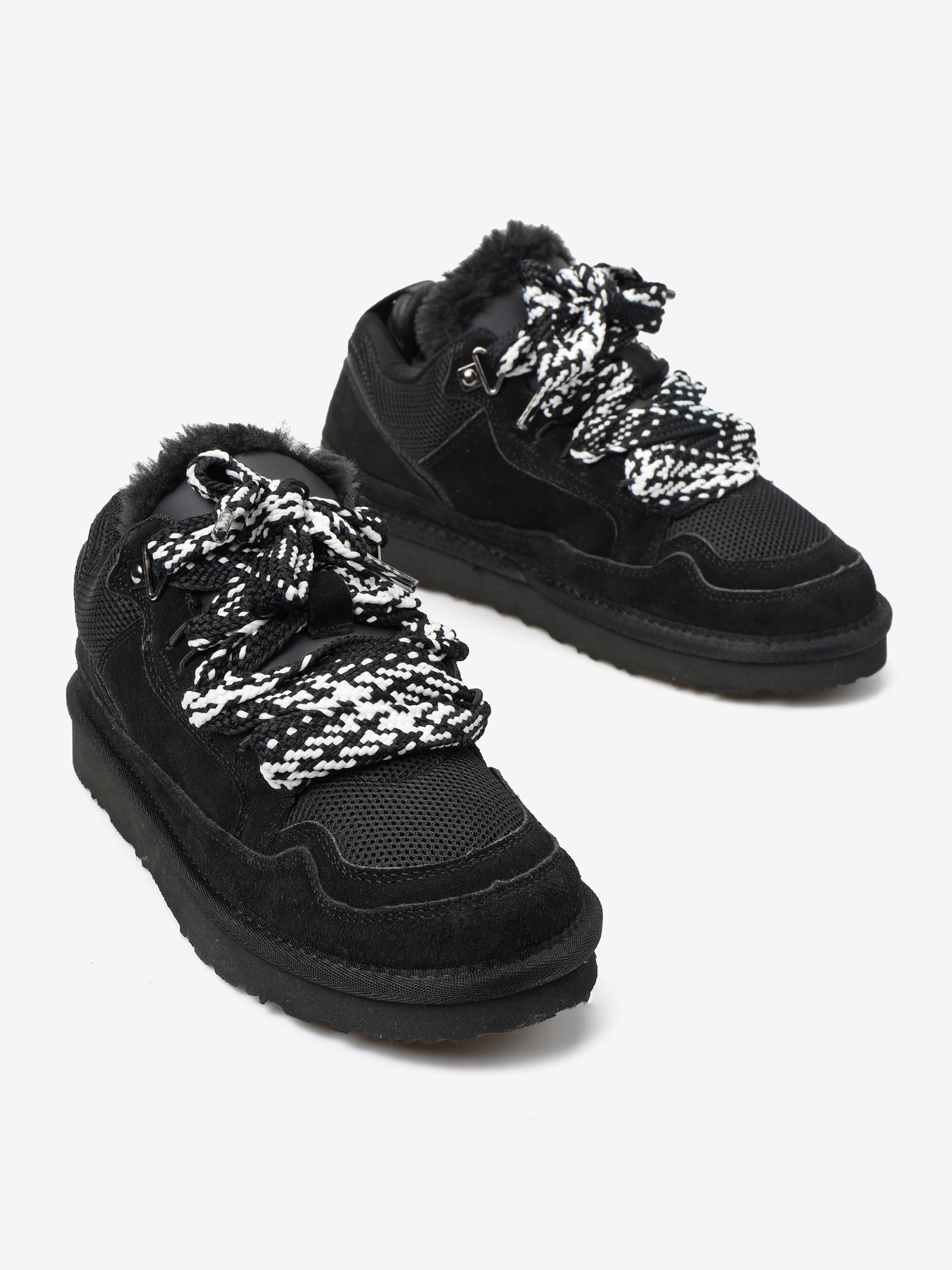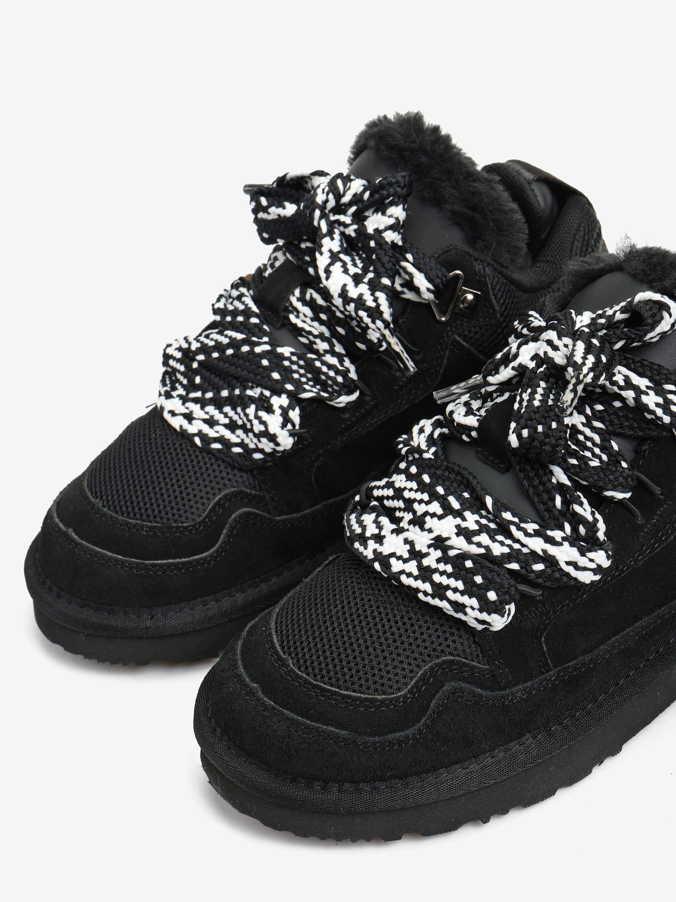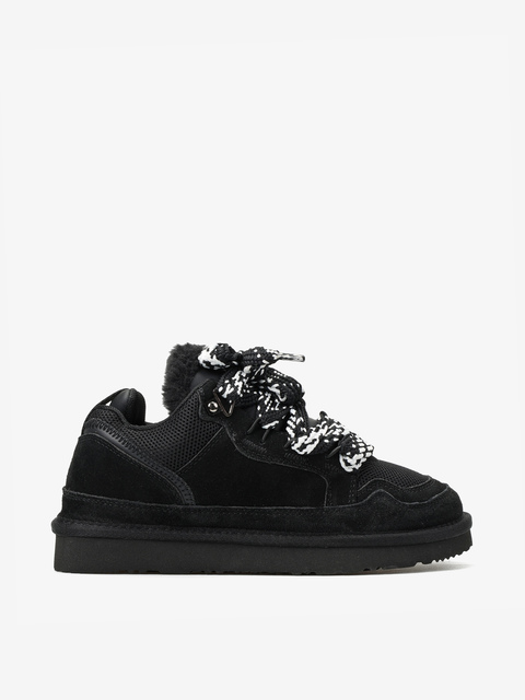 Zamszowe sneakersy z przeszyciami z siateczki. Wnętrze butów wyłożone miękką tkaniną imitującą futro baranka.