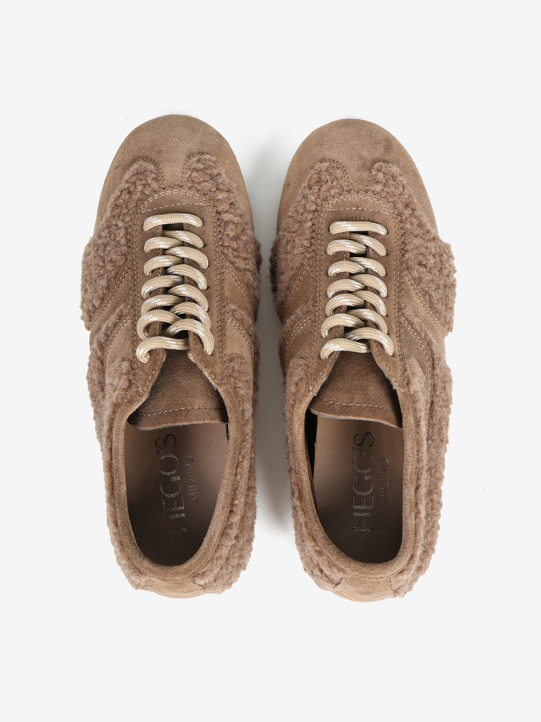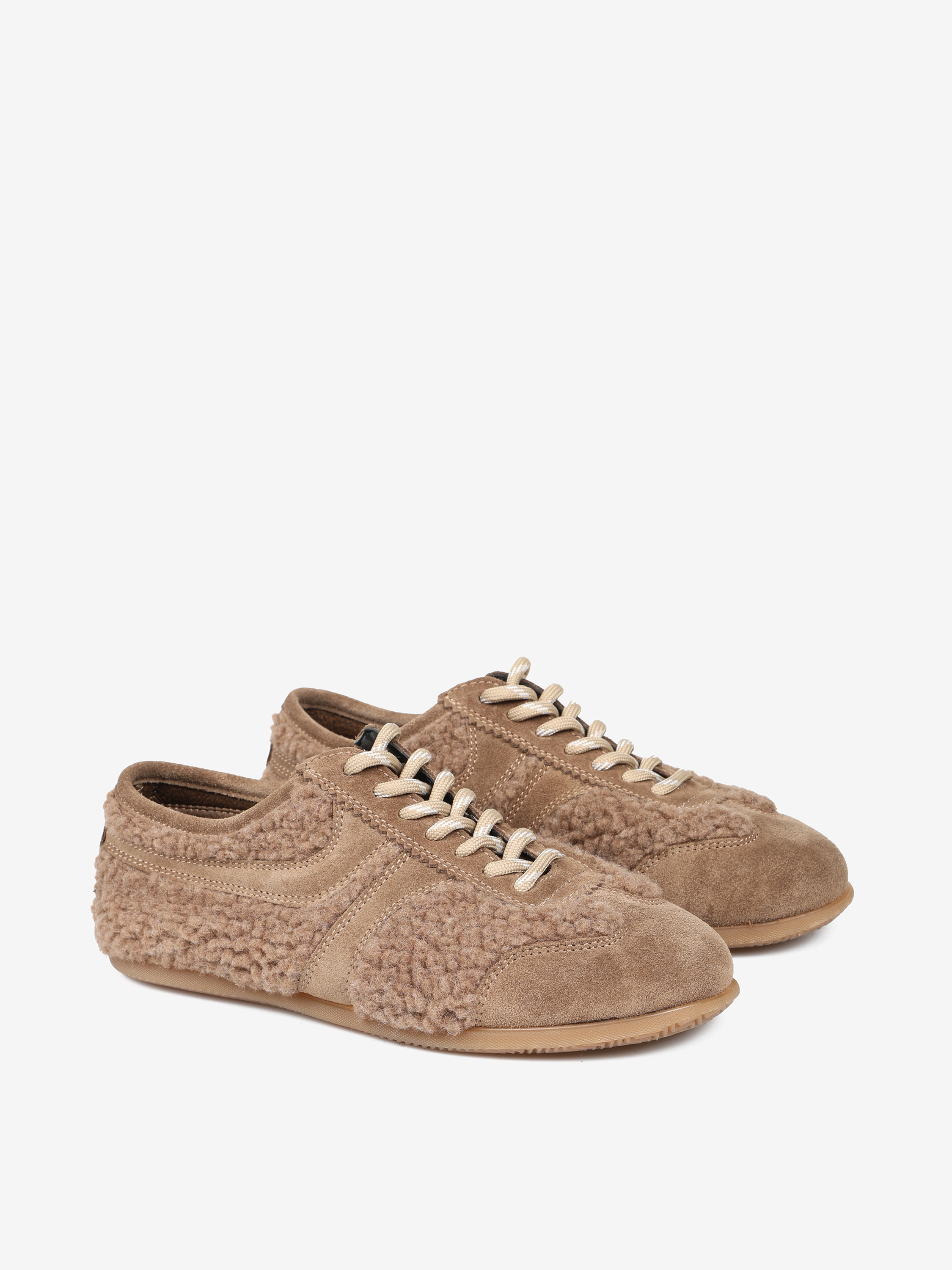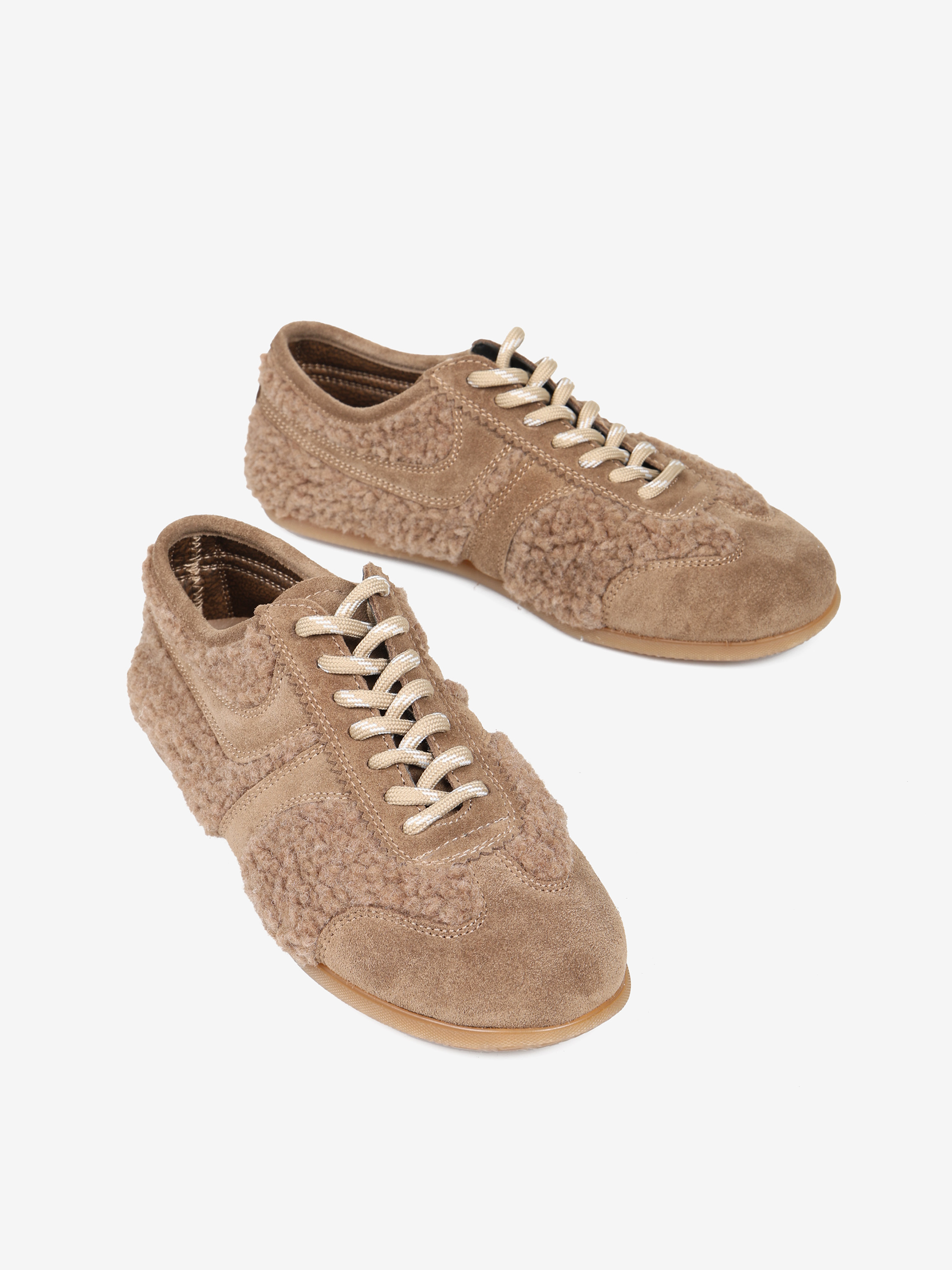 Miękkie, lekkie, beżowe sneakersy wykonane z zamszu i tkaniny imitującej futro baranka.
