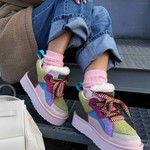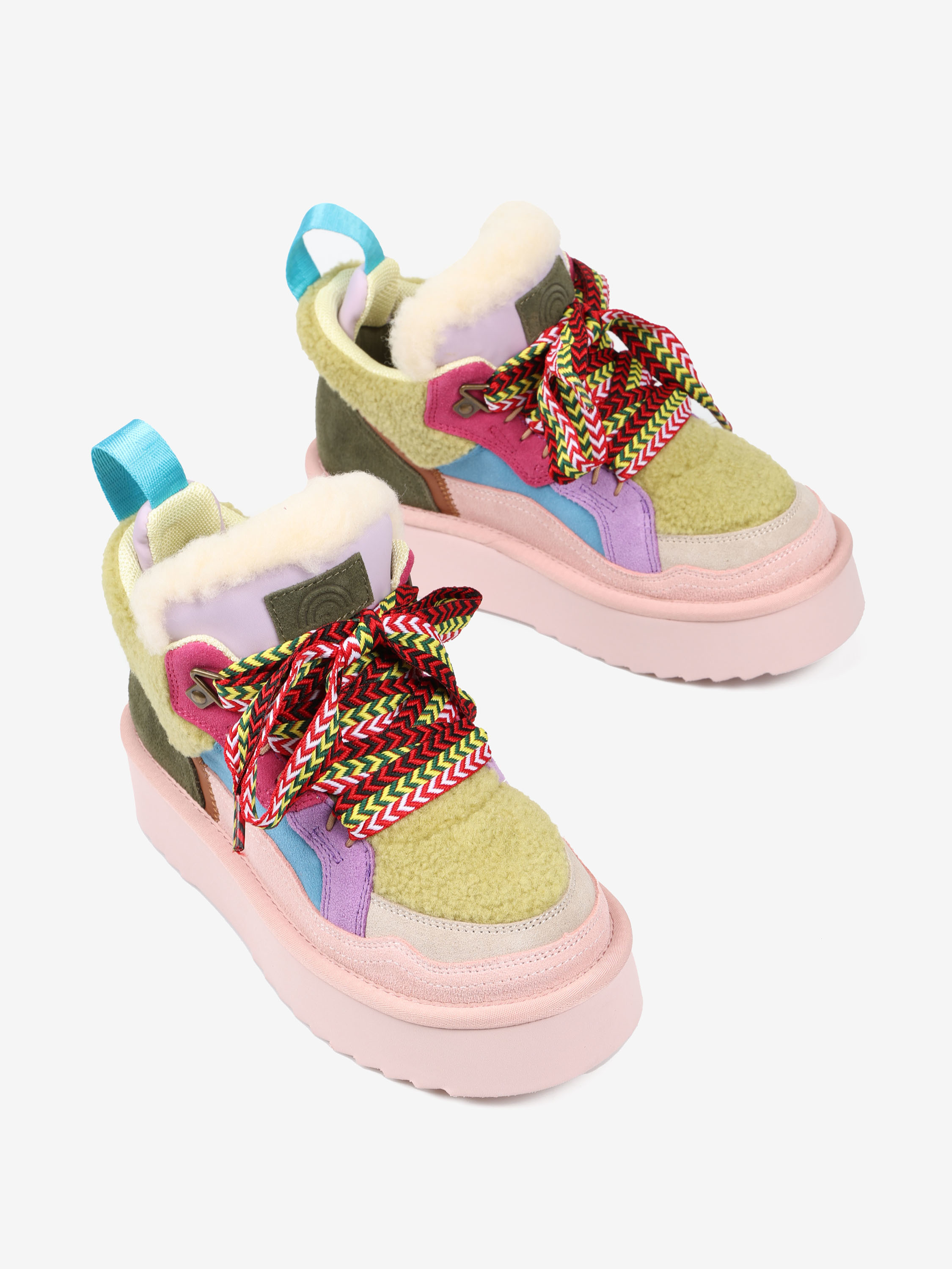 Sneakersy na platformie z wielobarwnego połączenia zamszu i tkaniny imitującej futro baranka.