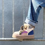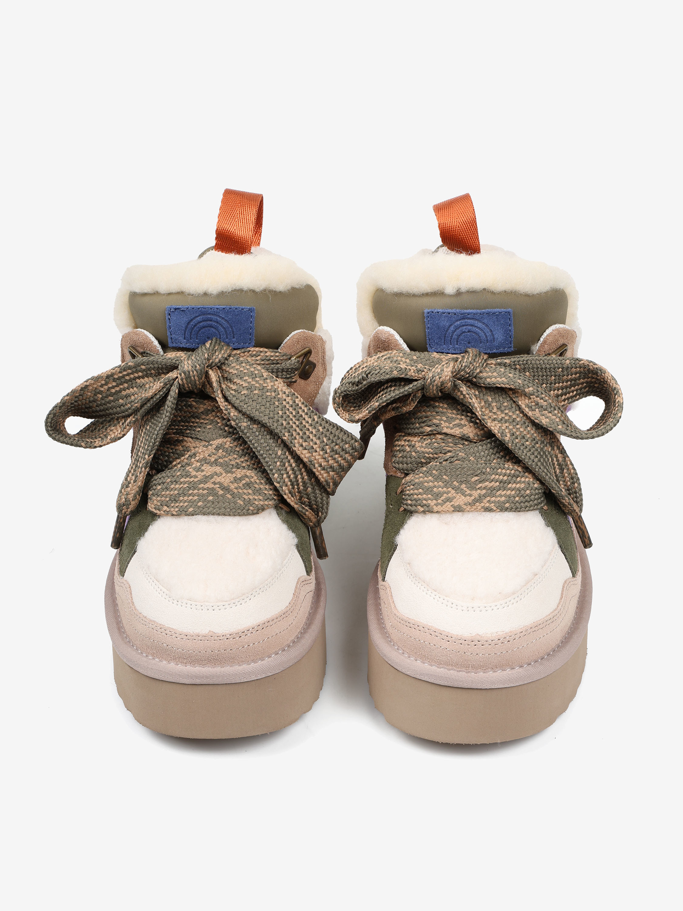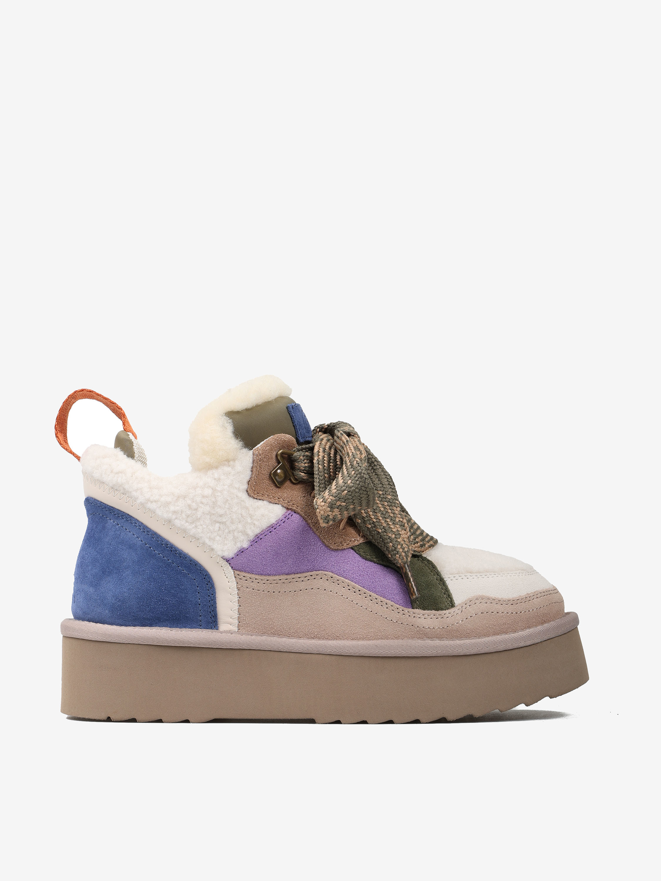 Sneakersy na platformie z wielobarwnego połączenia zamszu i tkaniny imitującej futro baranka.