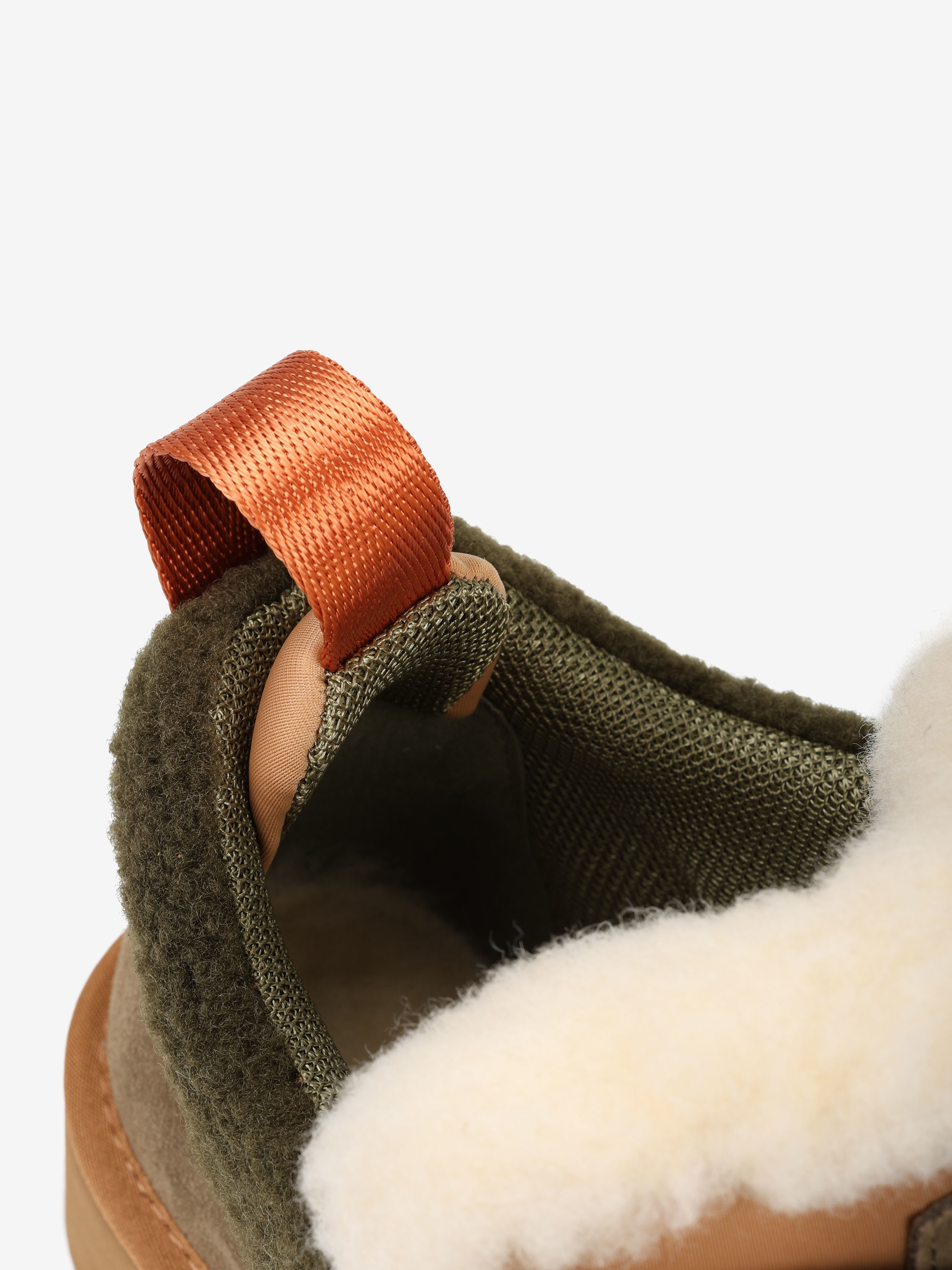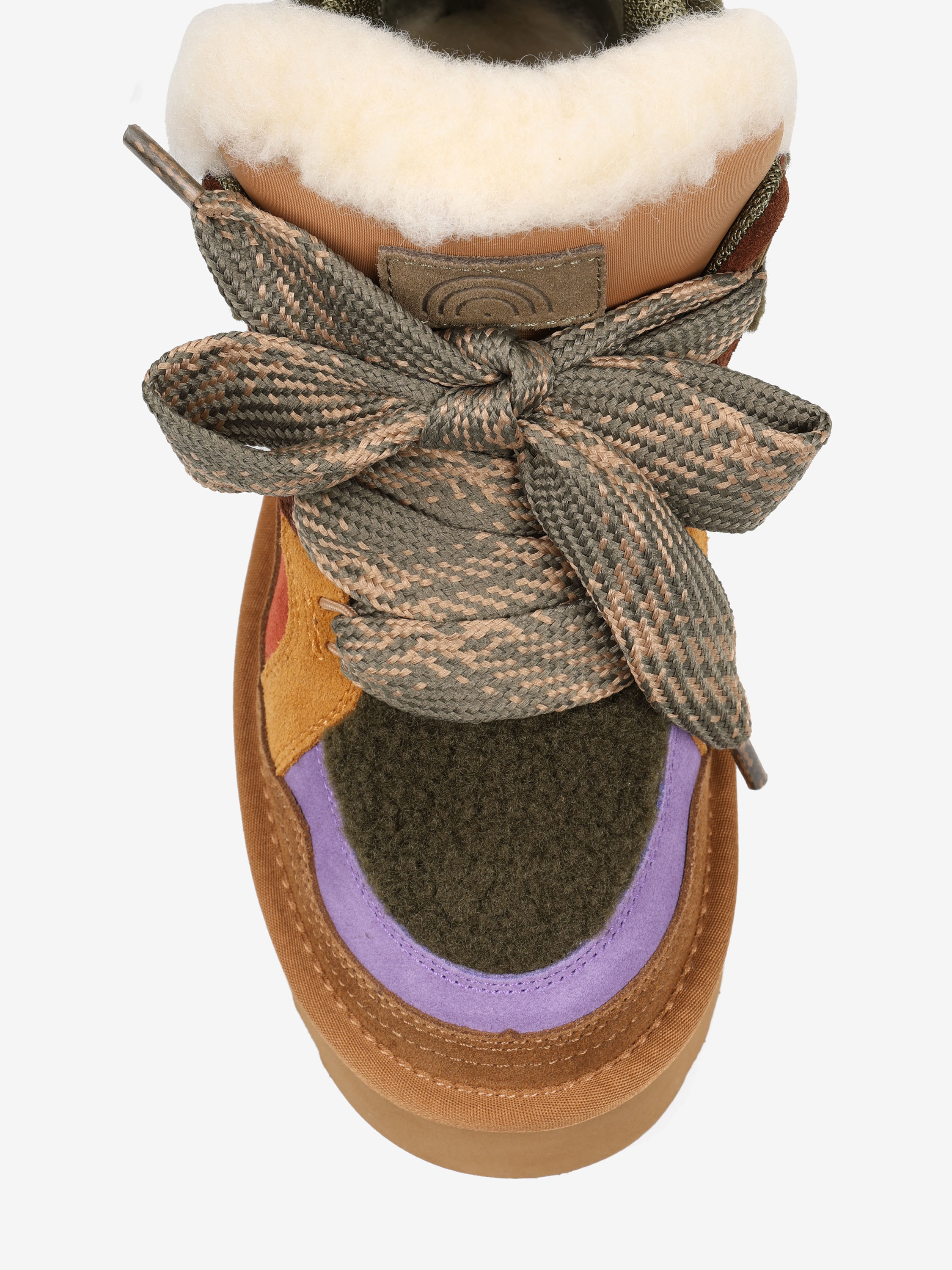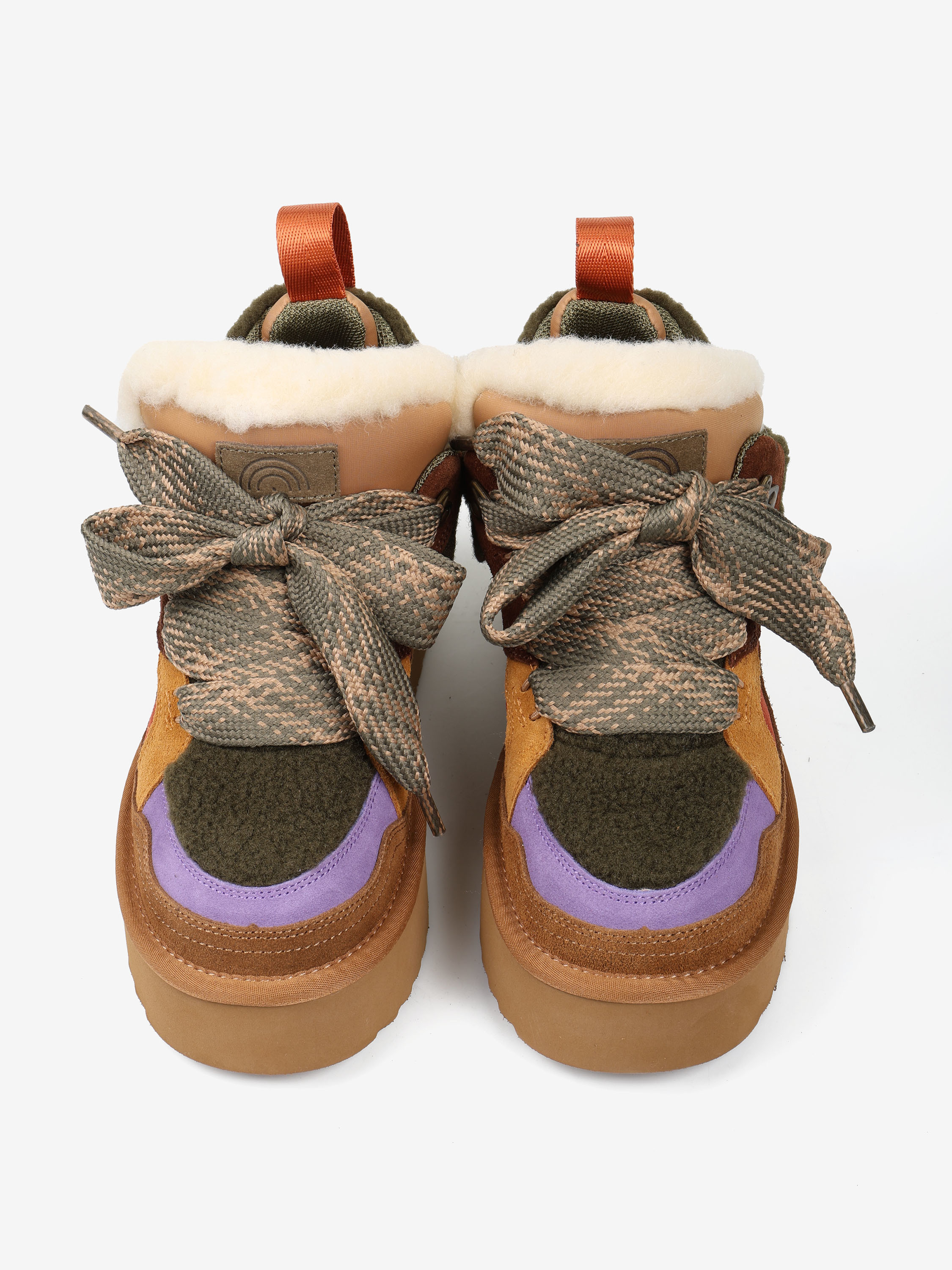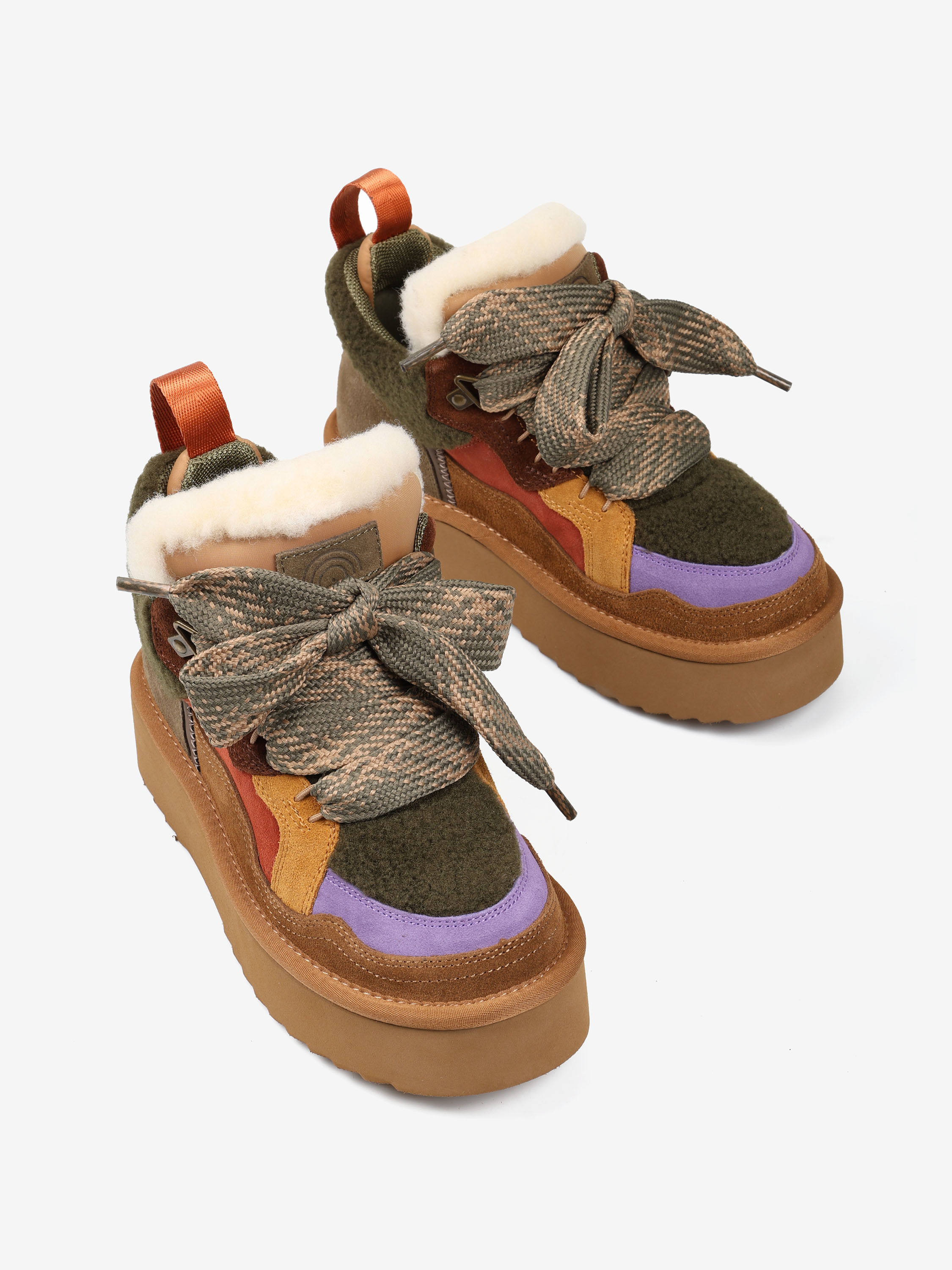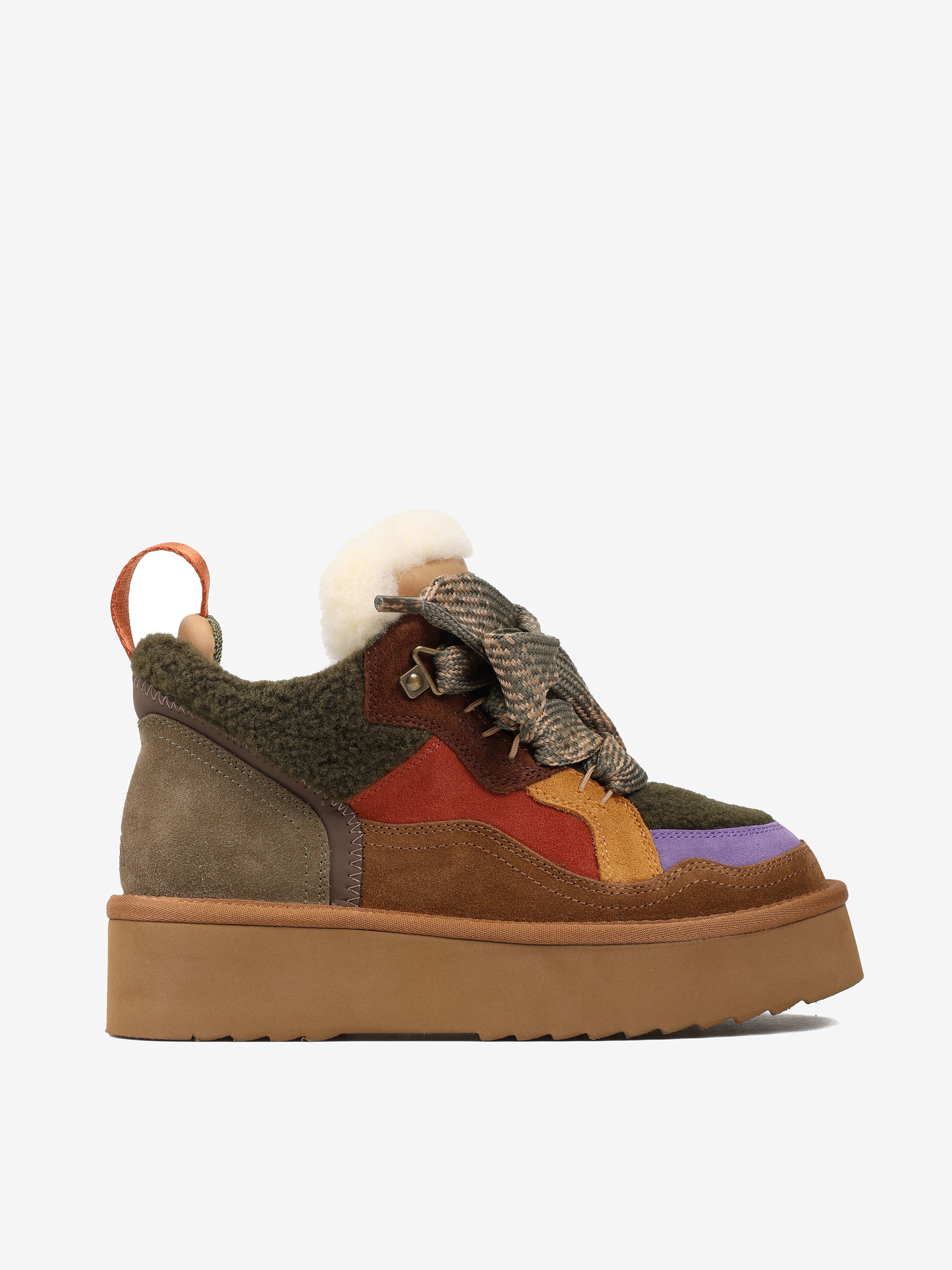 Sneakersy na platformie z wielobarwnego połączenia zamszu i tkaniny imitującej futro baranka.