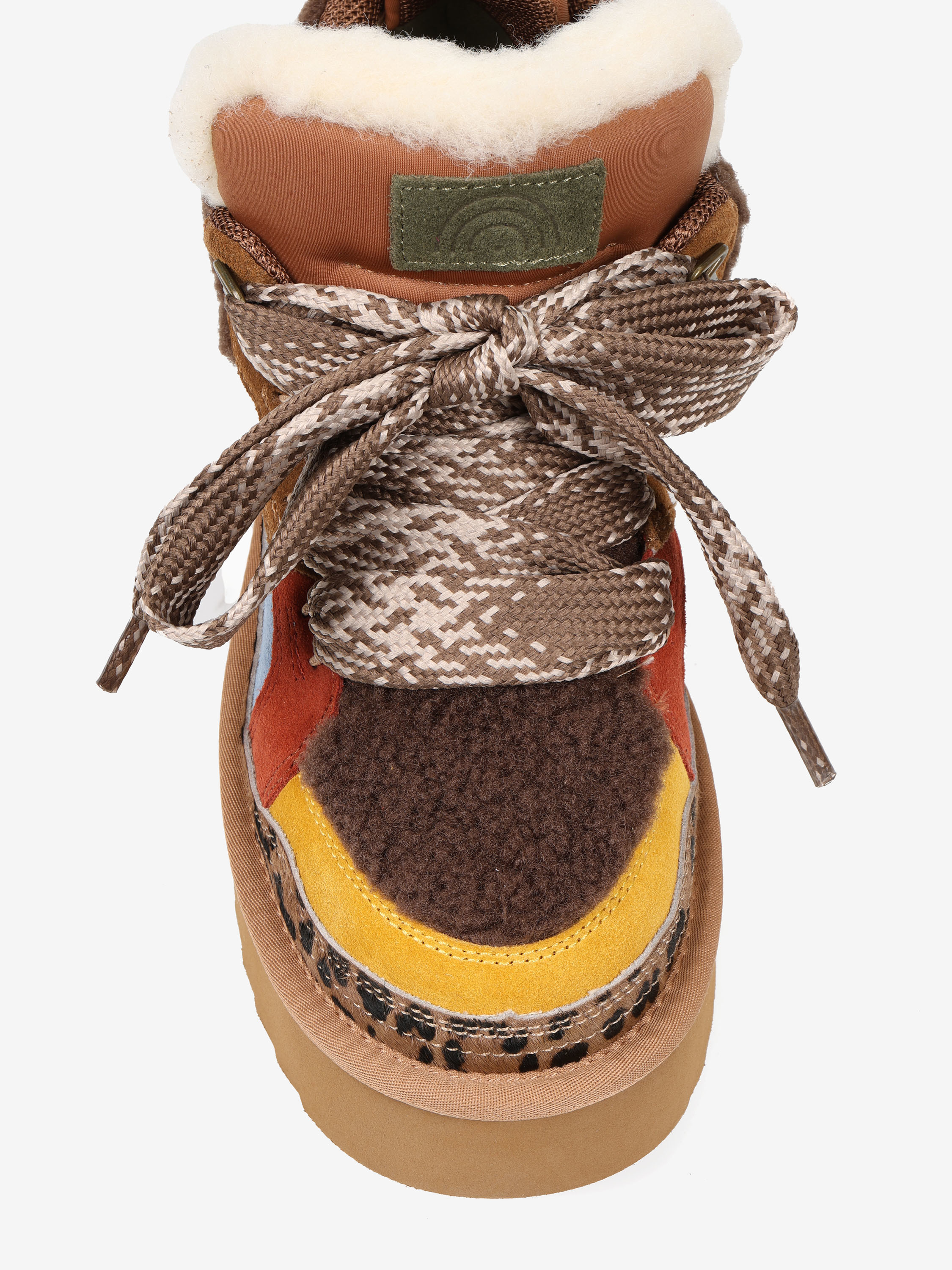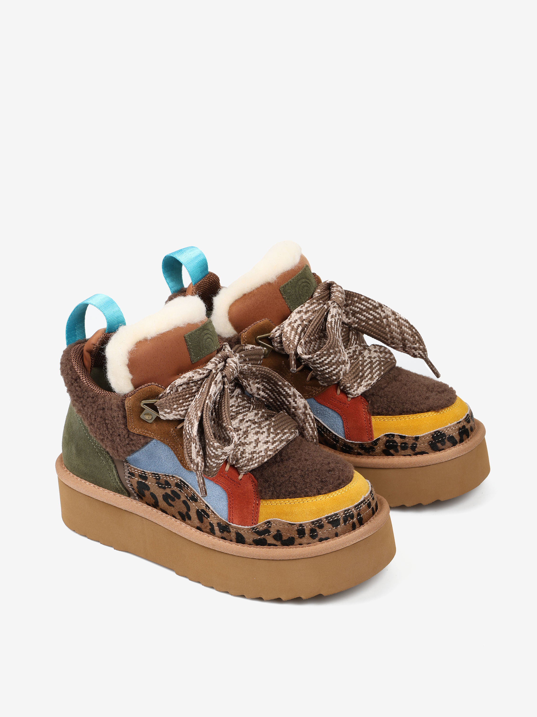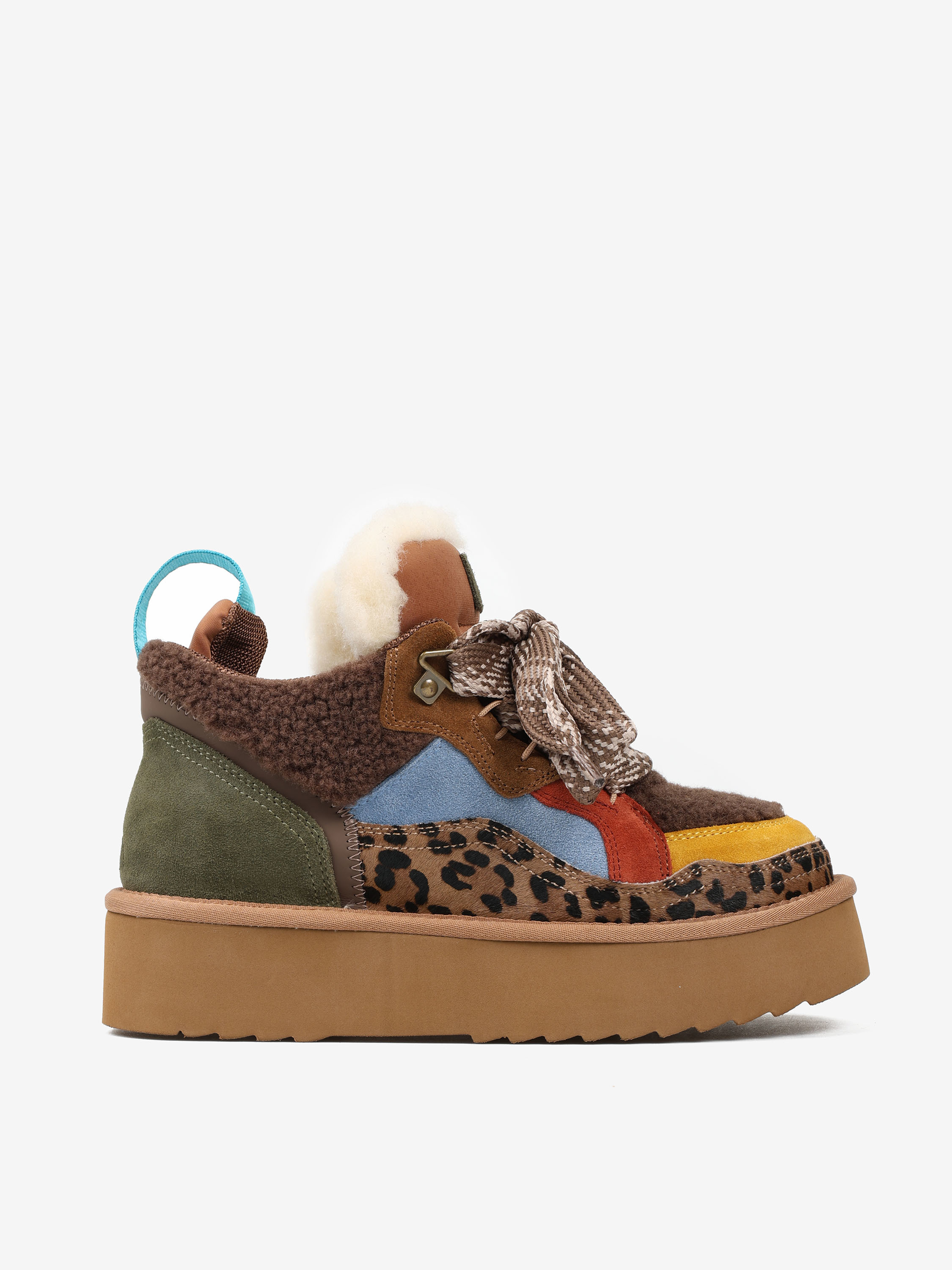 Sneakersy na platformie z wielobarwnego połączenia zamszu i tkaniny imitującej futro baranka.