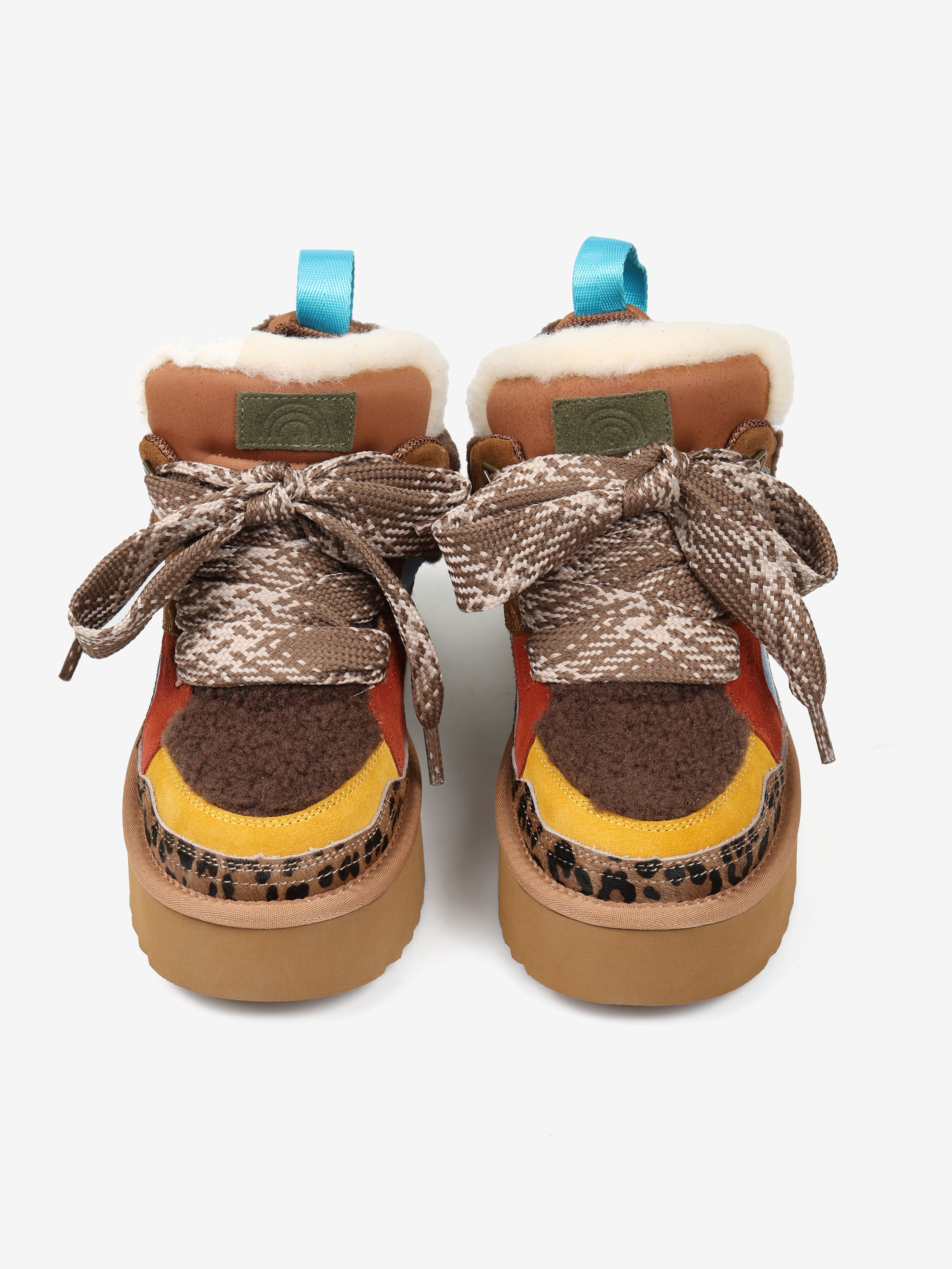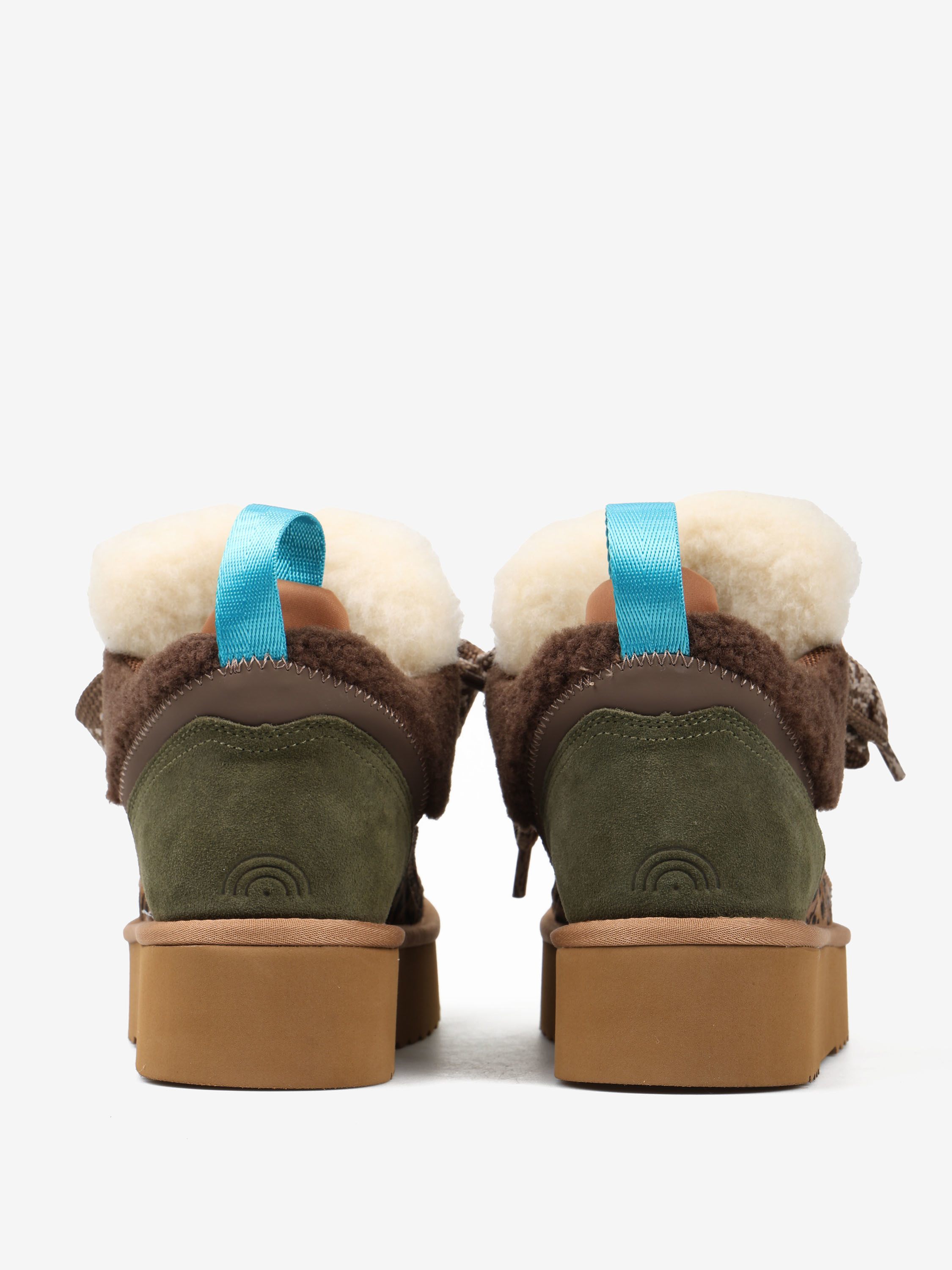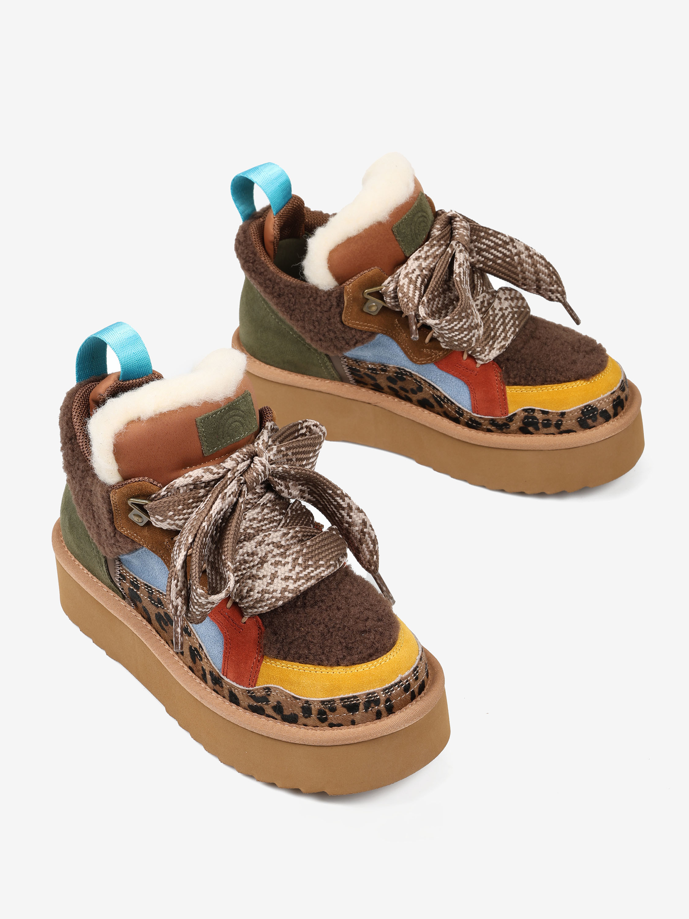 Sneakersy na platformie z wielobarwnego połączenia zamszu i tkaniny imitującej futro baranka.