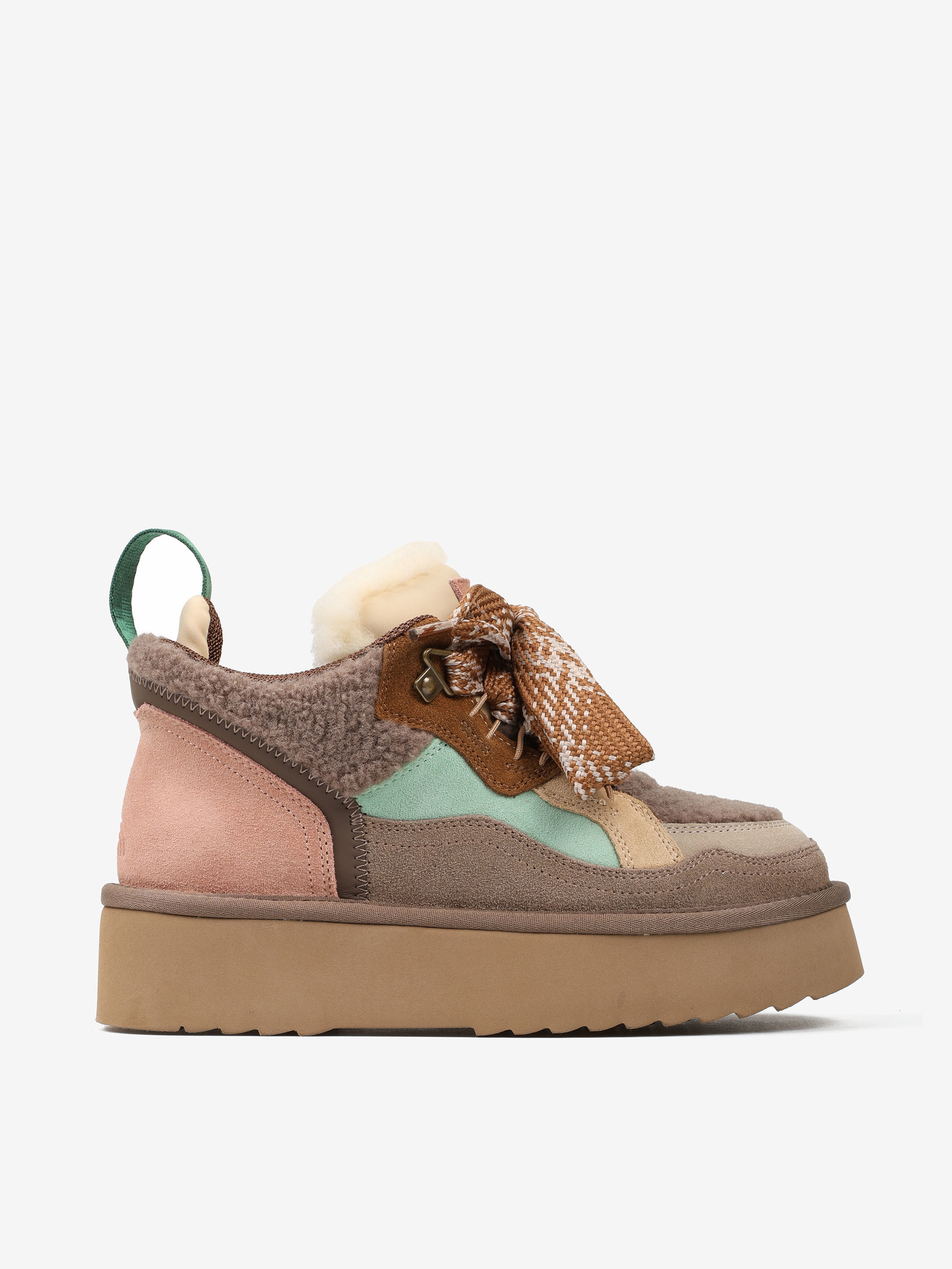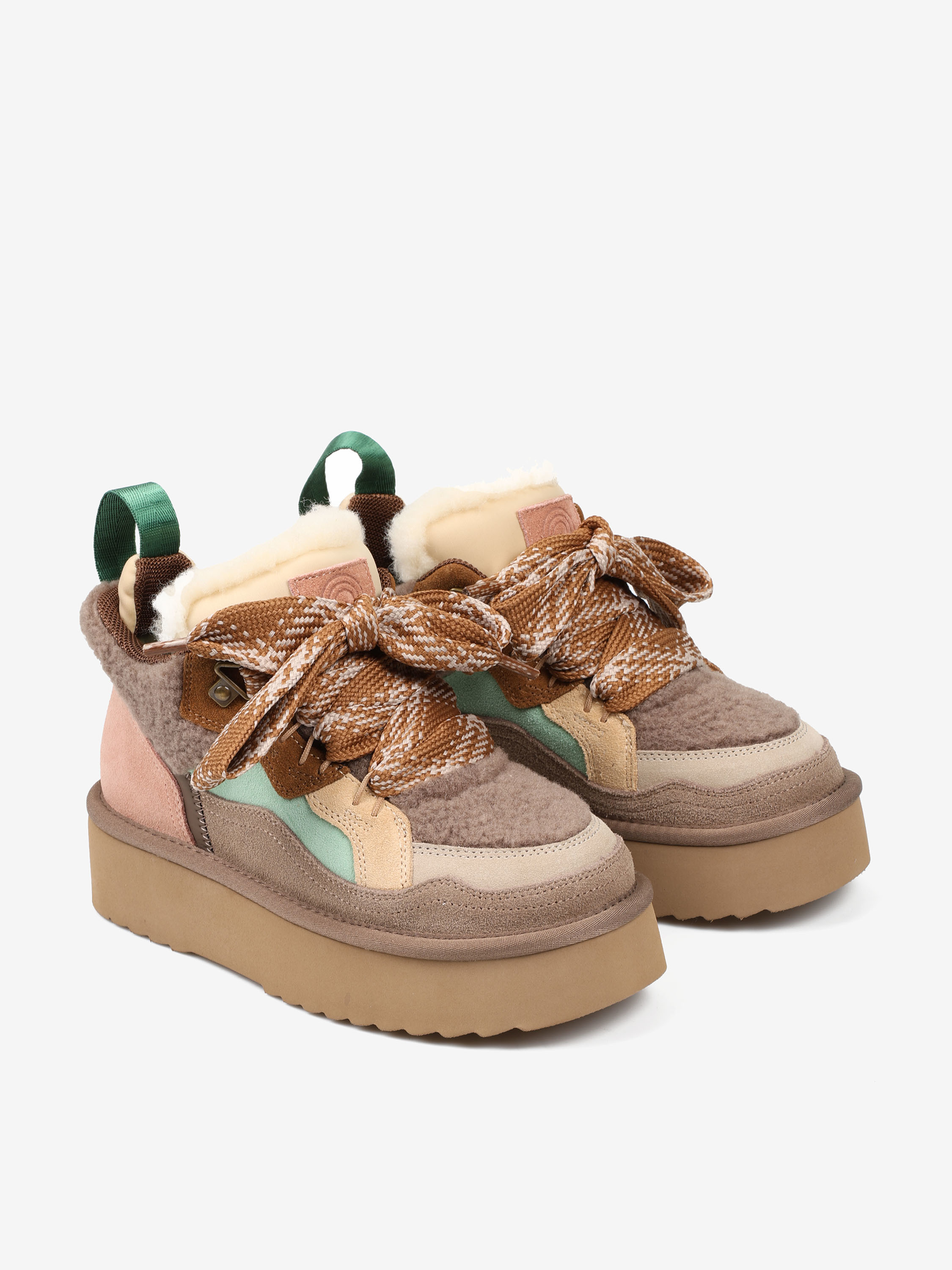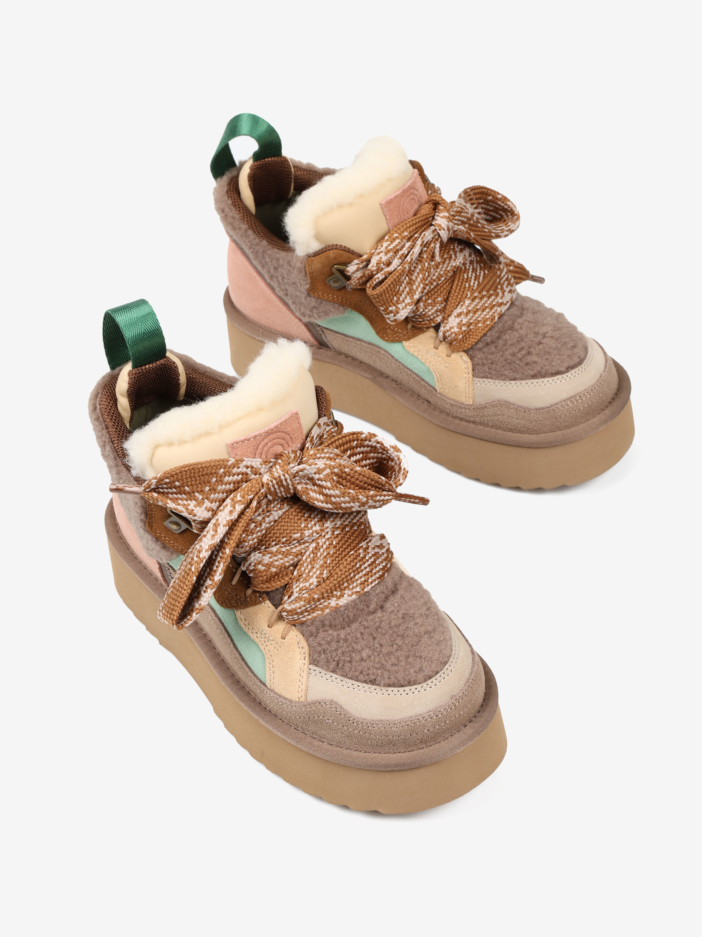 Sneakersy na platformie z wielobarwnego połączenia zamszu i tkaniny imitującej futro baranka.