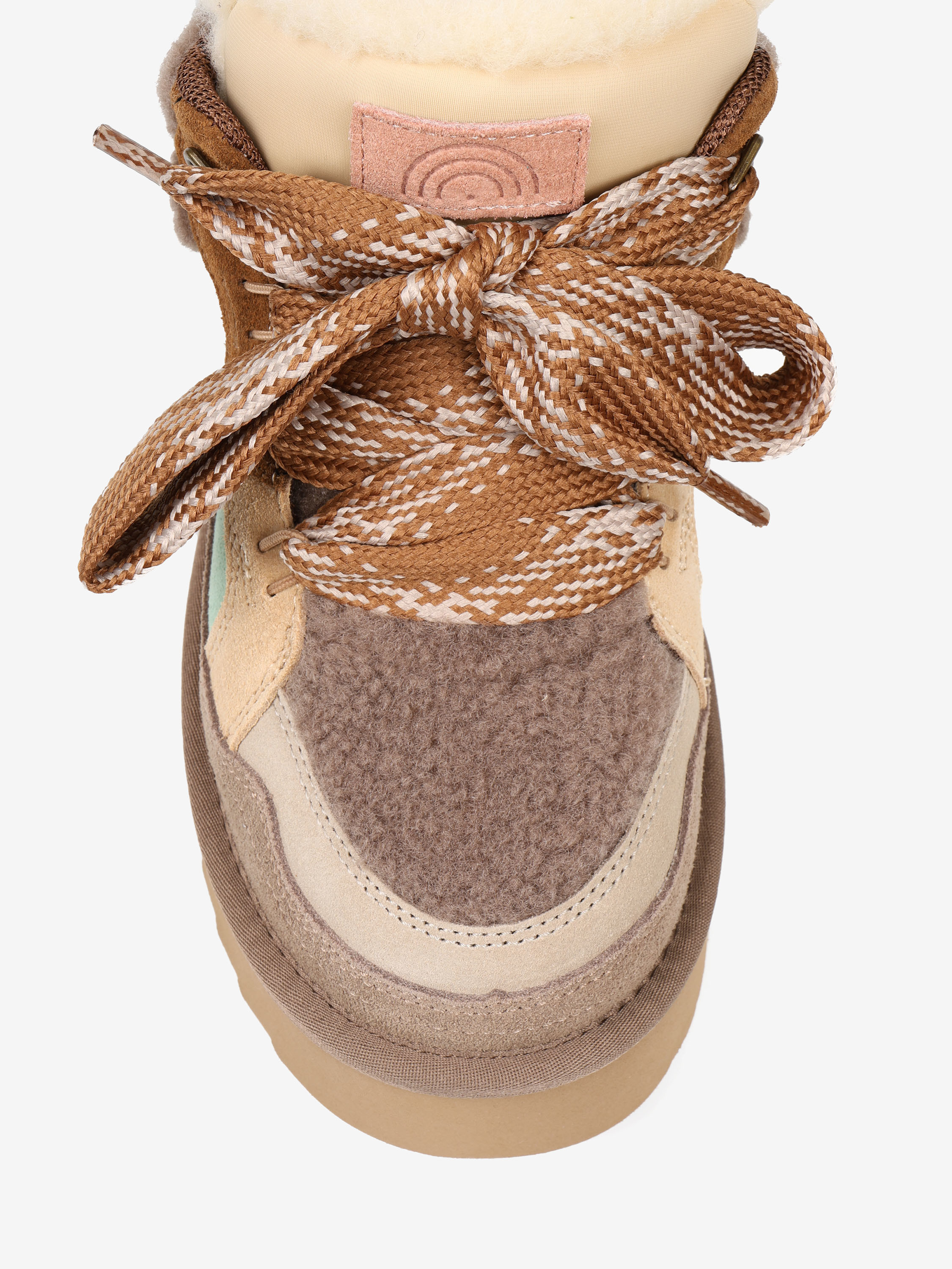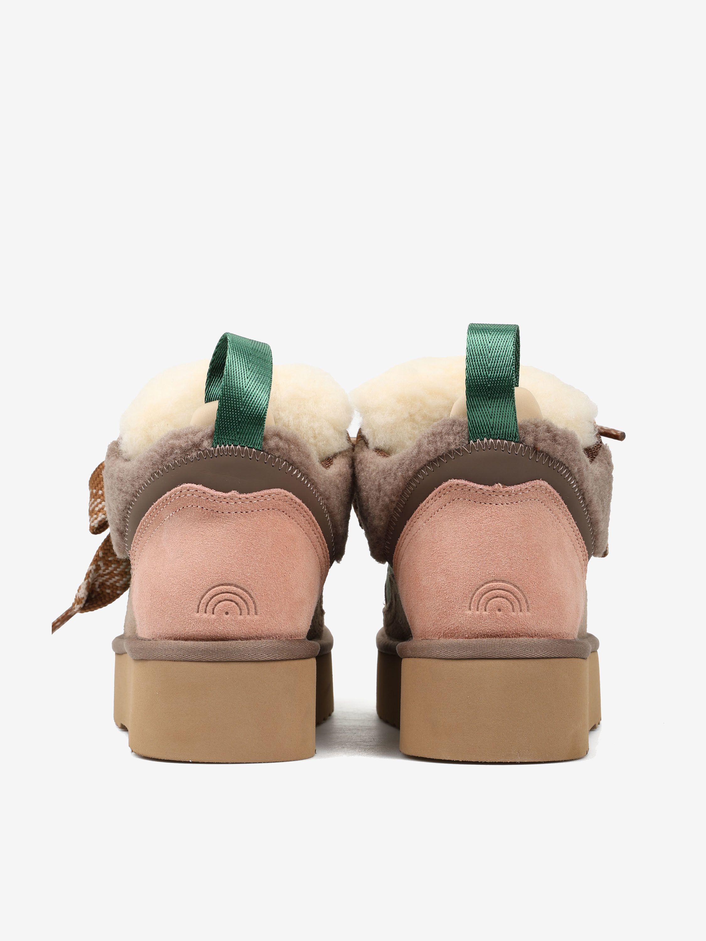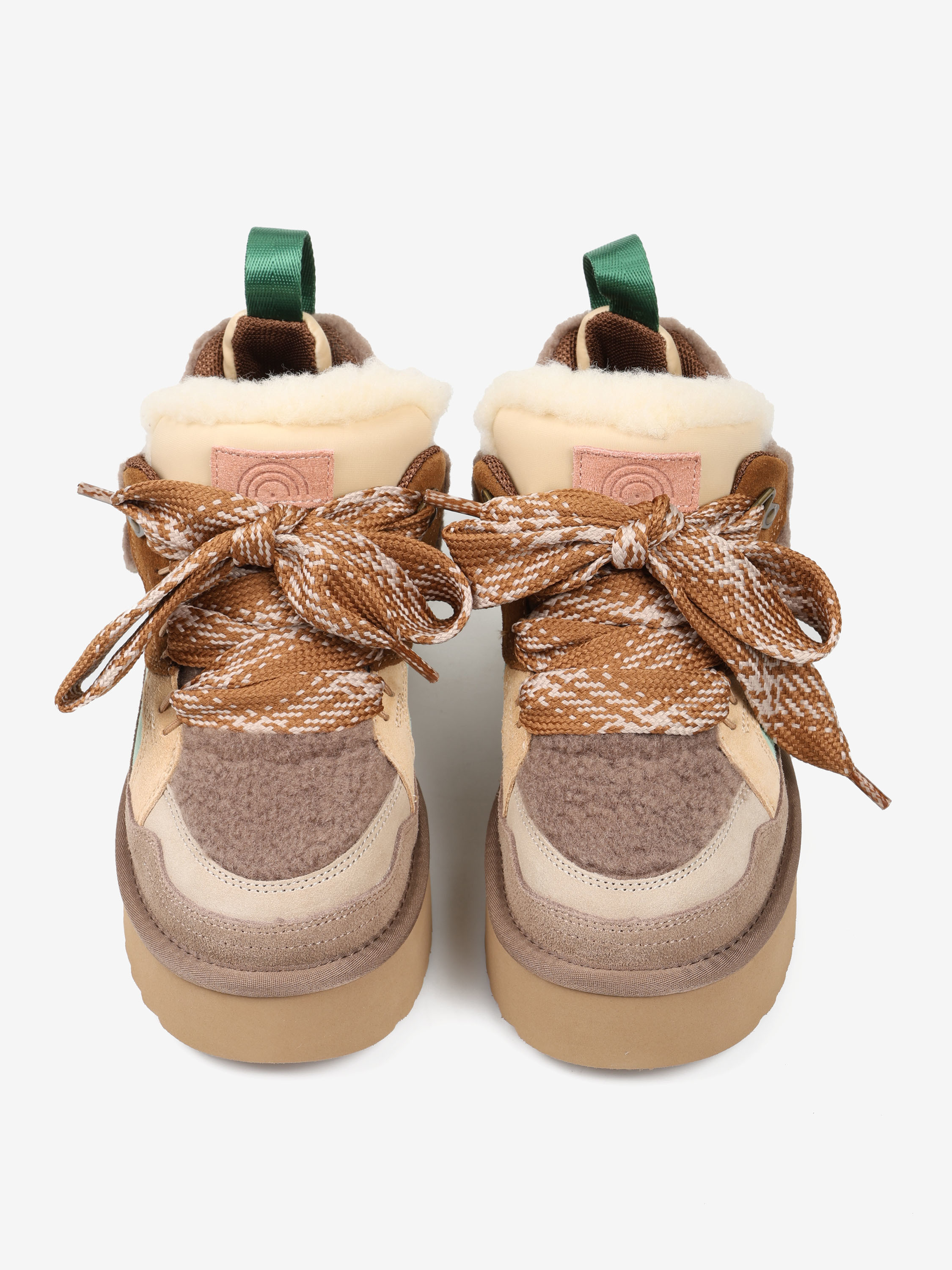 Sneakersy na platformie z wielobarwnego połączenia zamszu i tkaniny imitującej futro baranka.