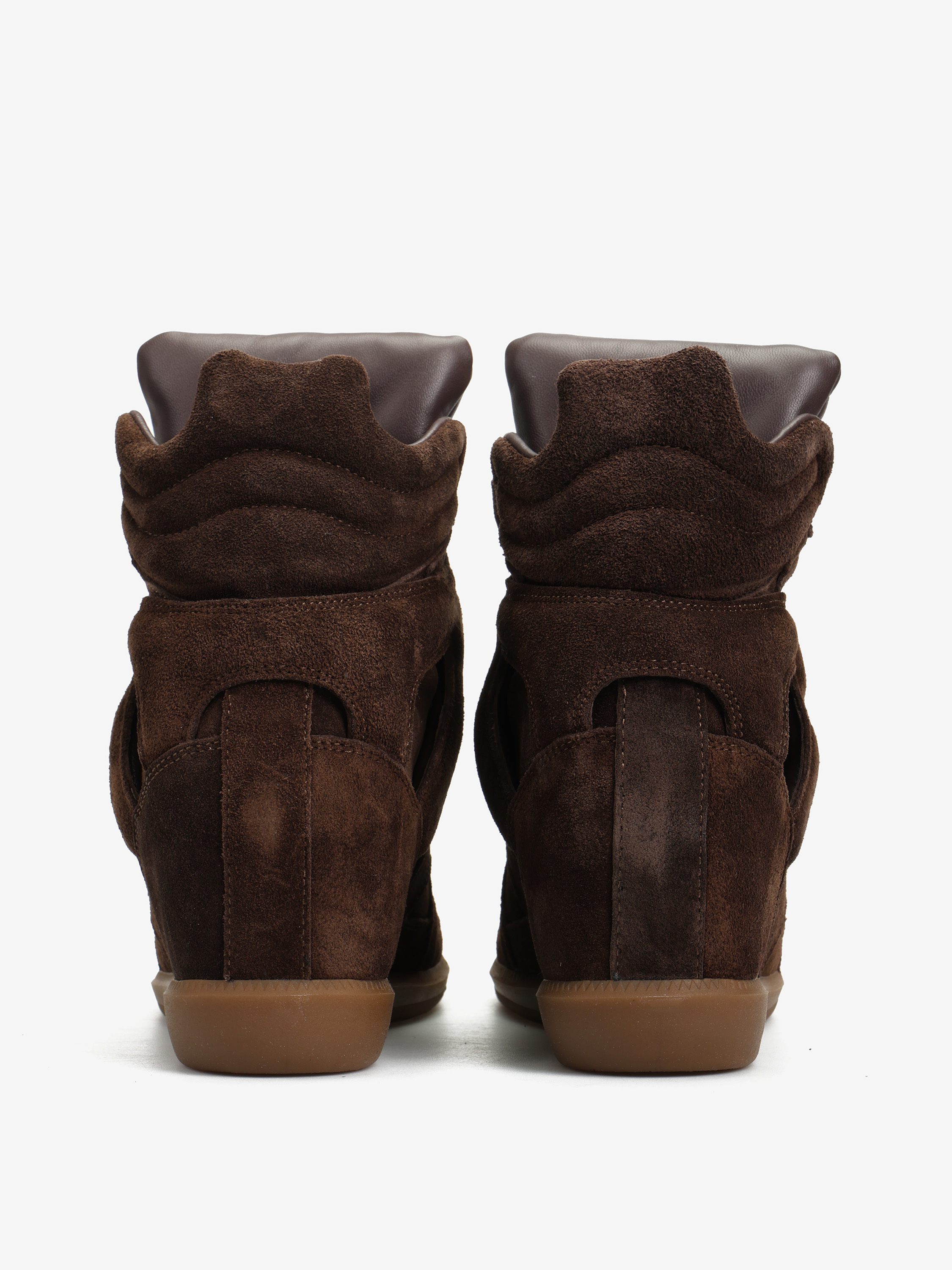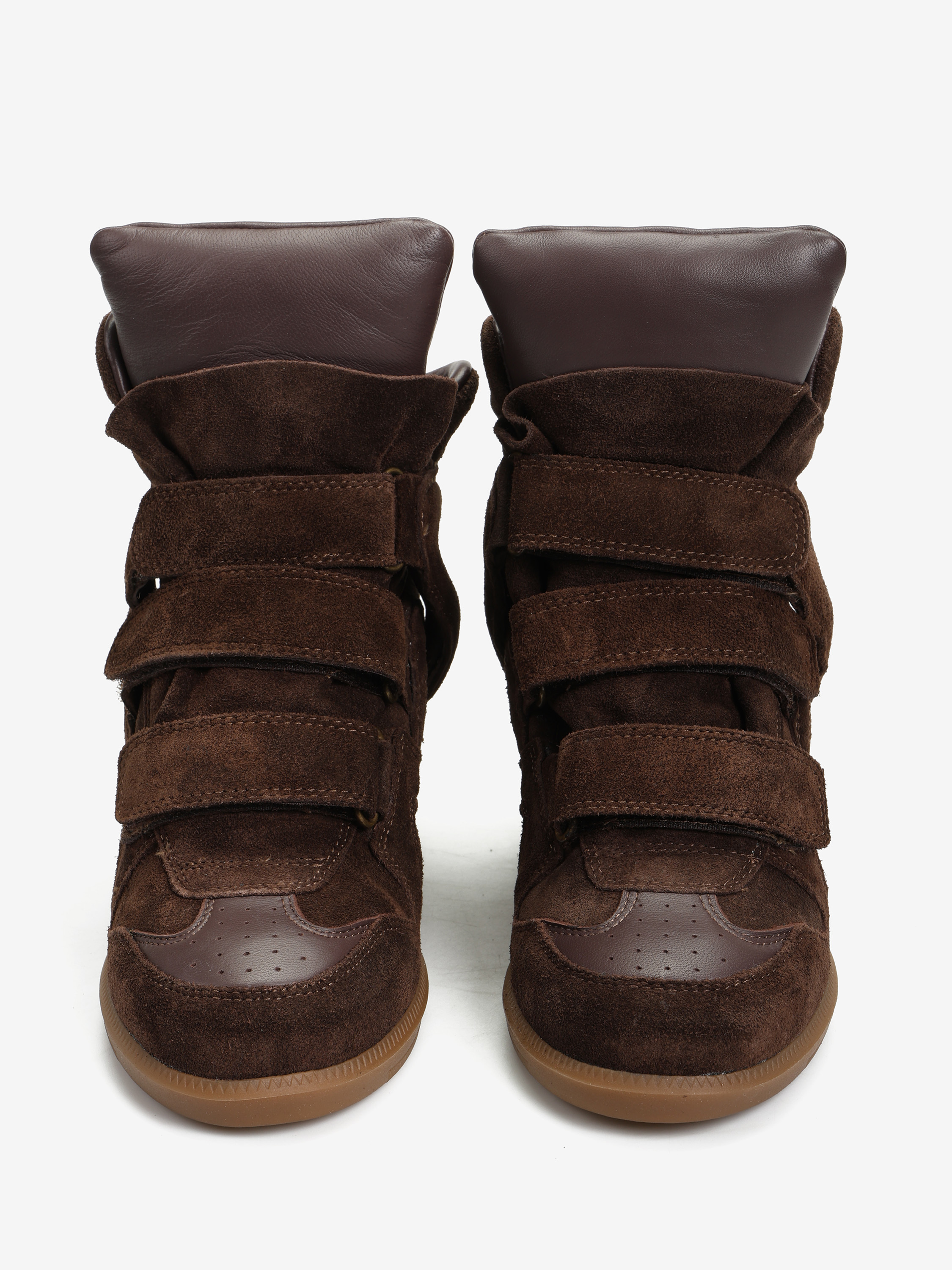 Zamszowe sneakersy z ukrytym koturnem (ok. 5 cm). Zapięcie na rzepy i miękki język ze skóry licowej.