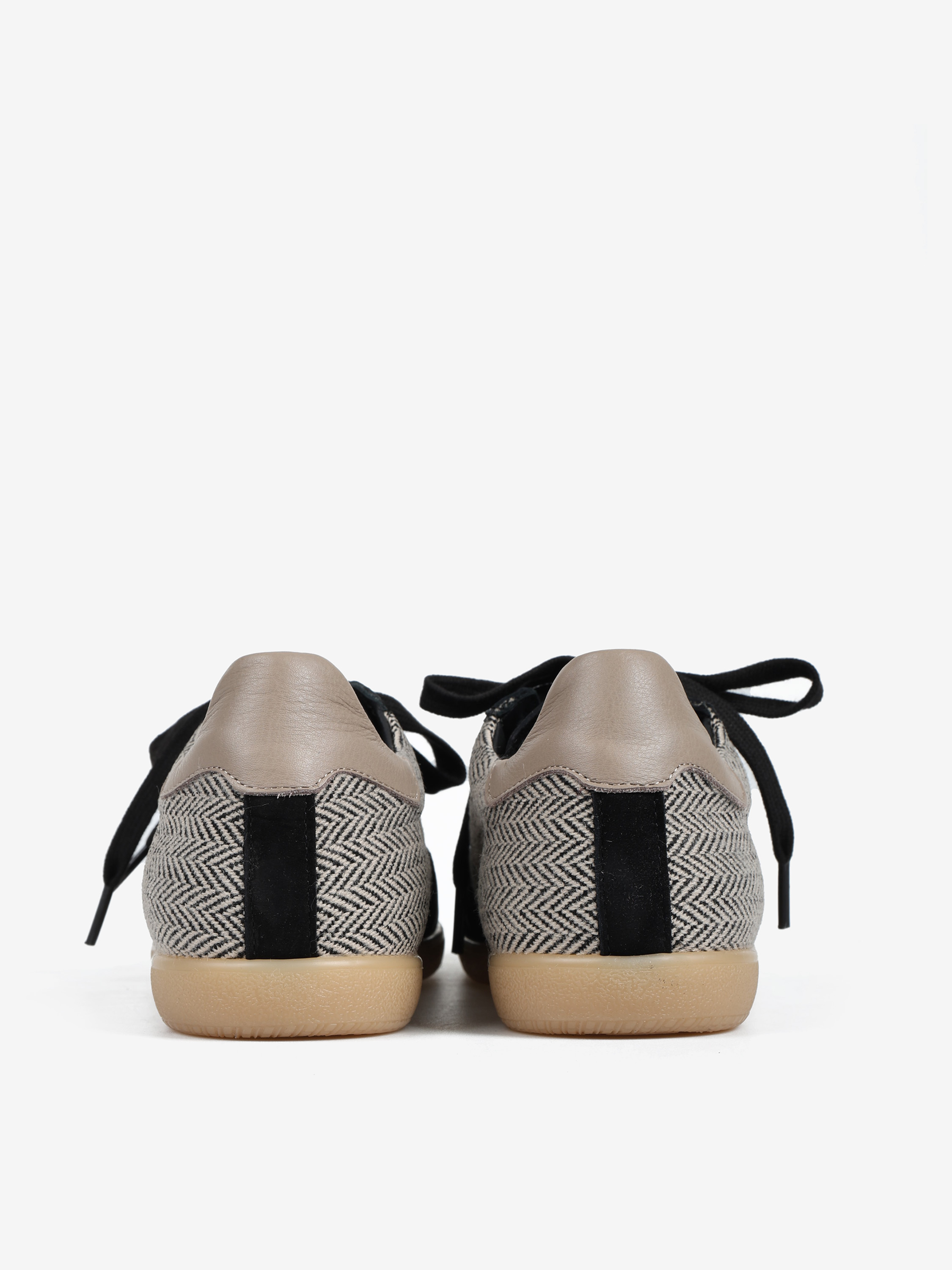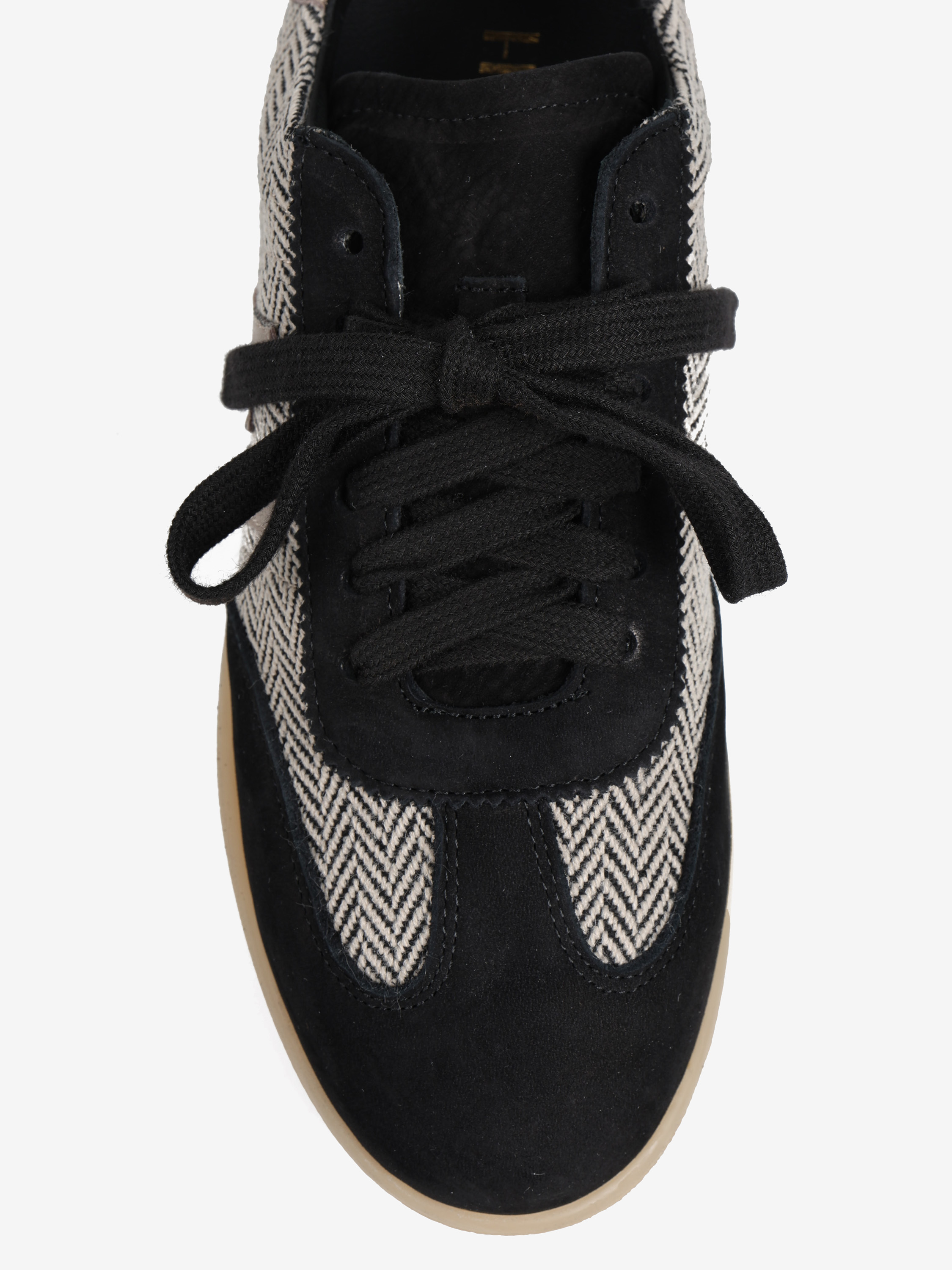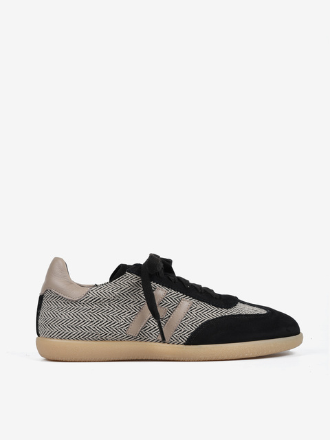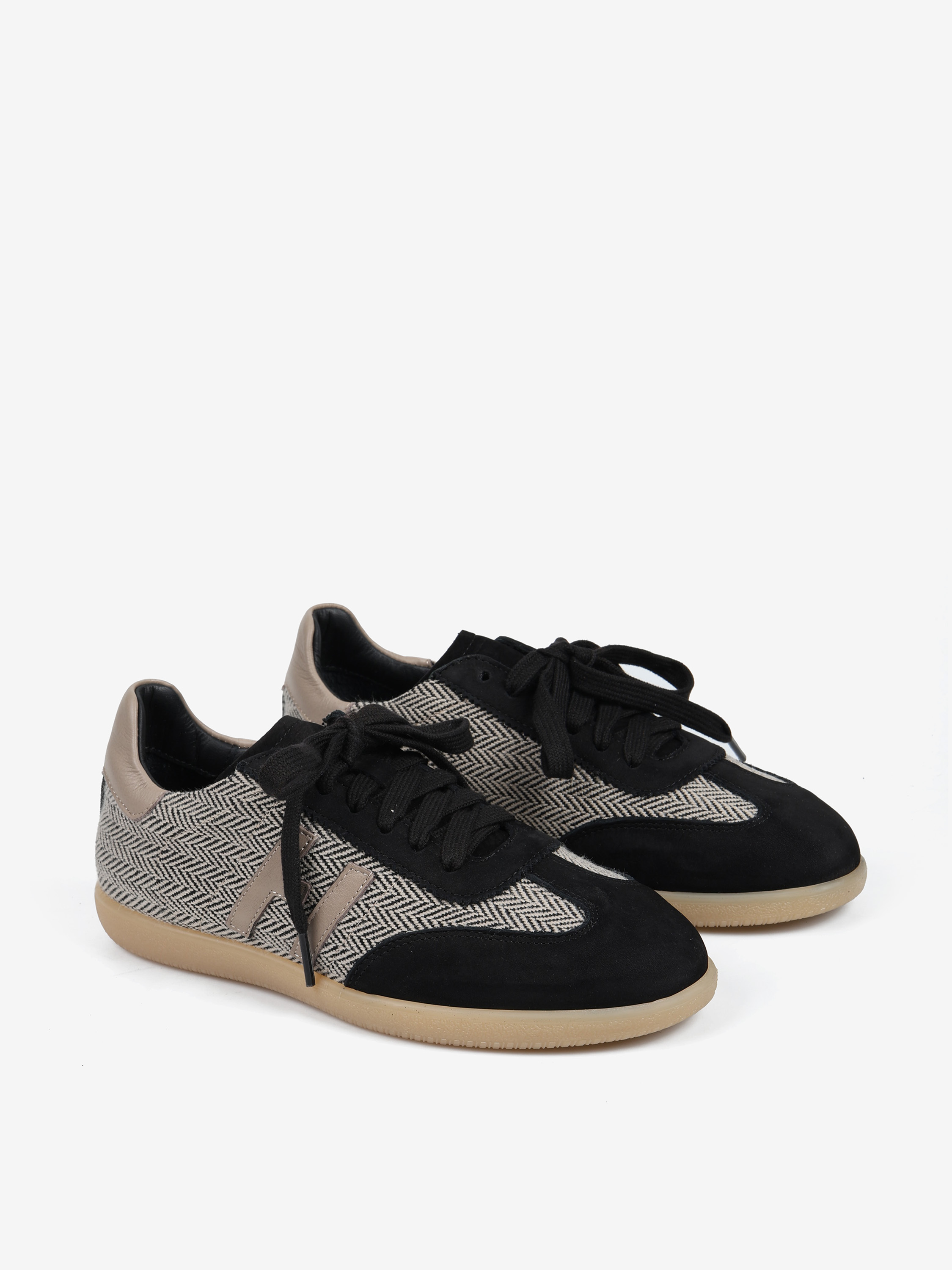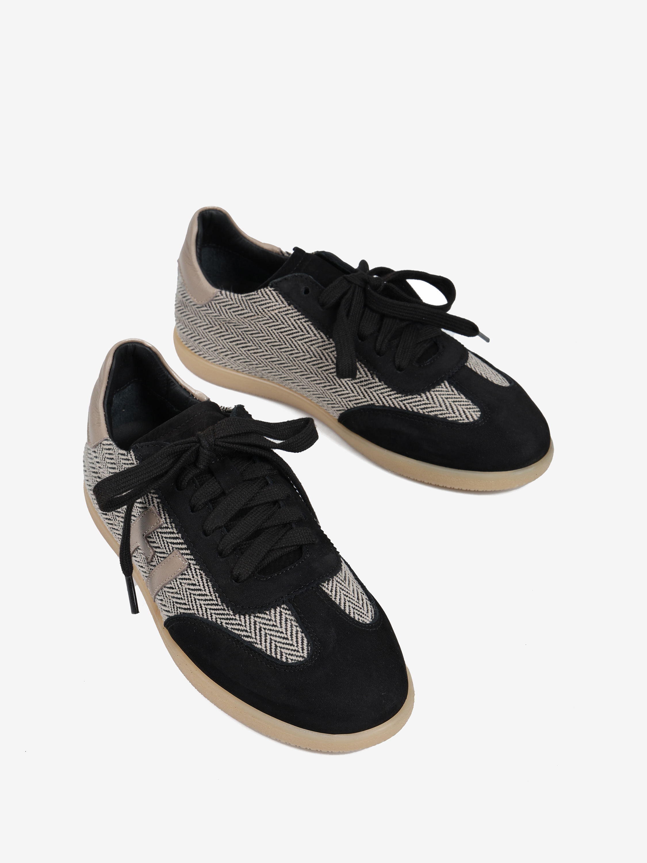 Autorskie sneakersy sygnowane literą H. Wykonane ze skóry naturalnej, zamszu i tweedu. Zaprojektowane i wyprodukowane we Włoszech.