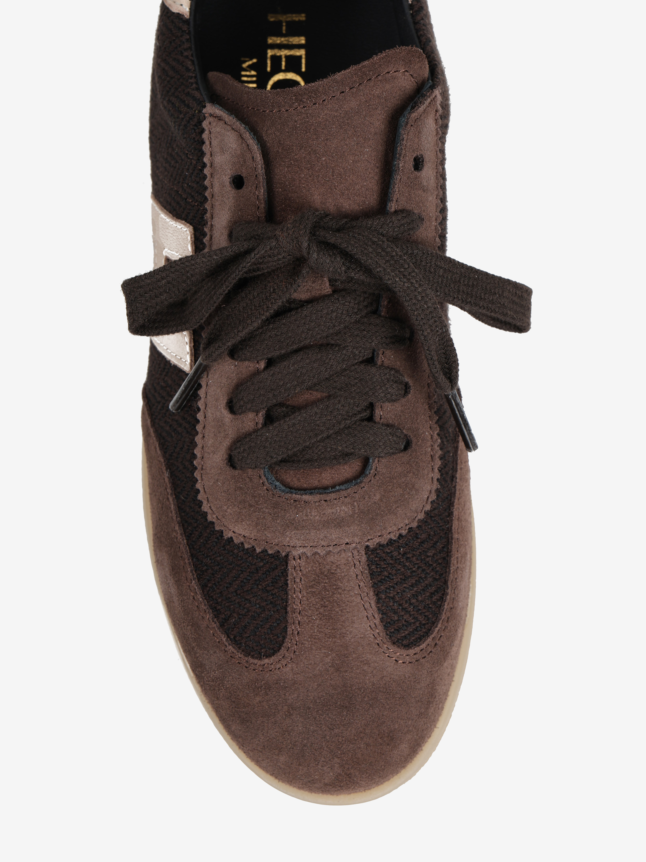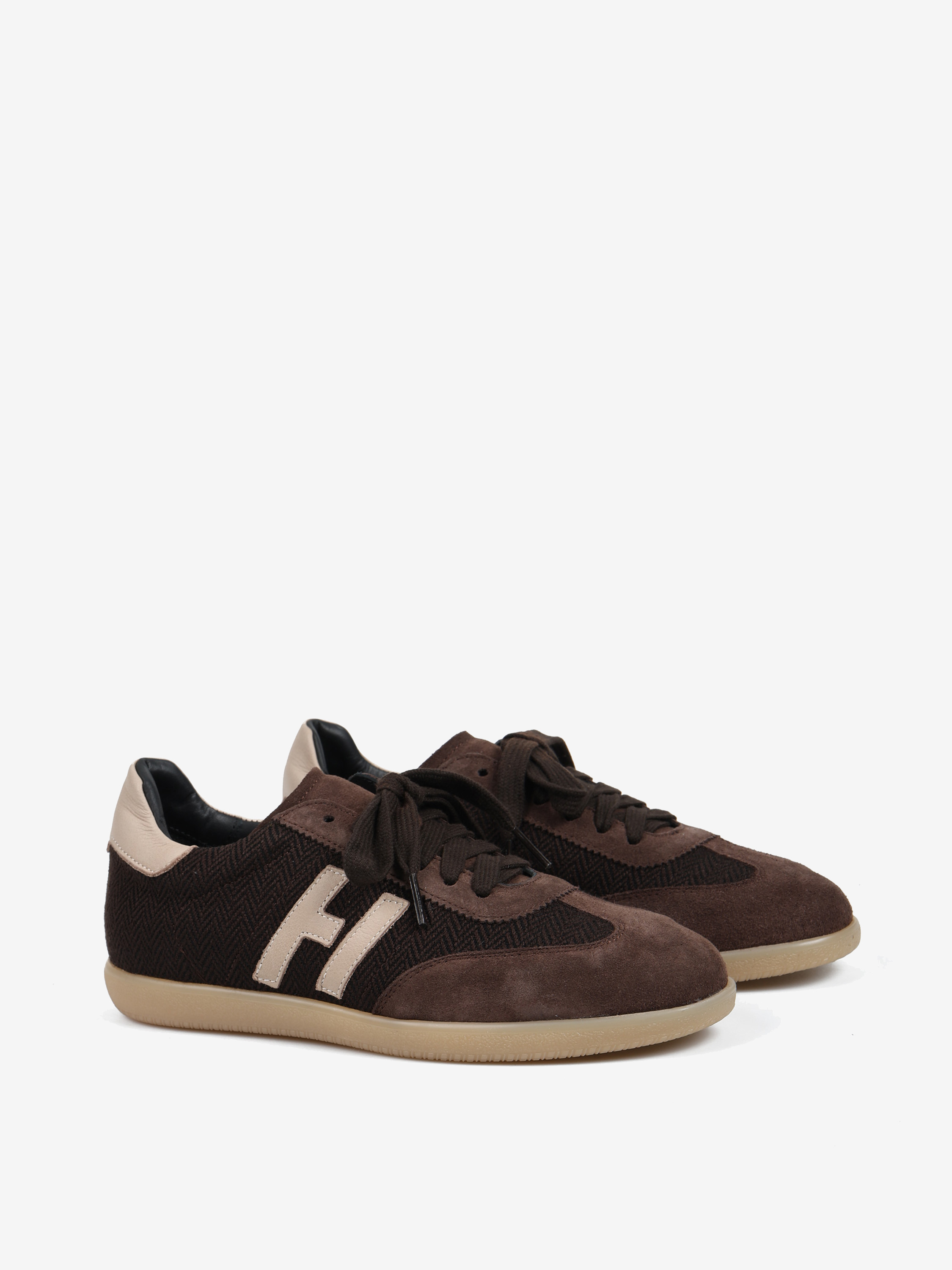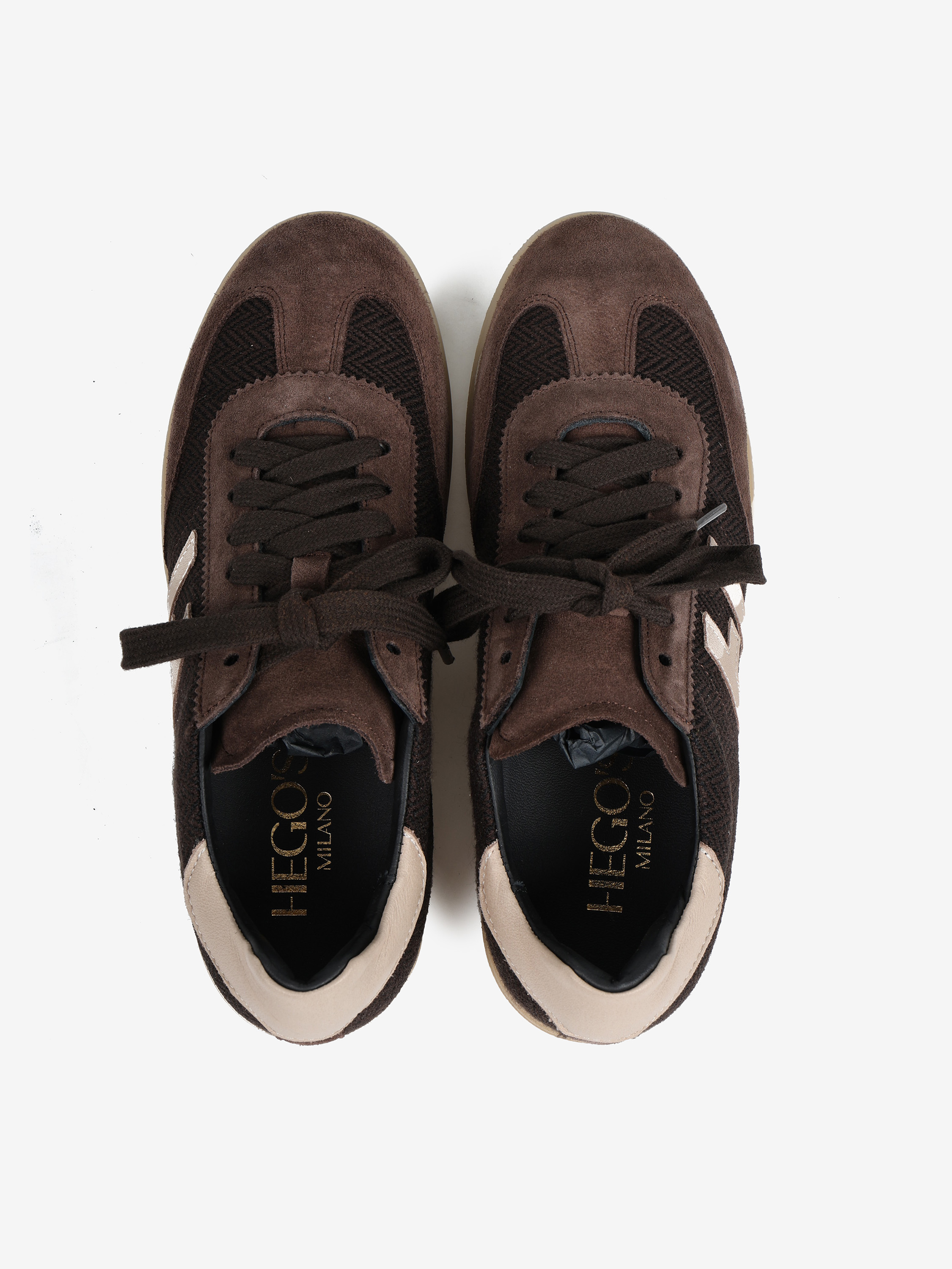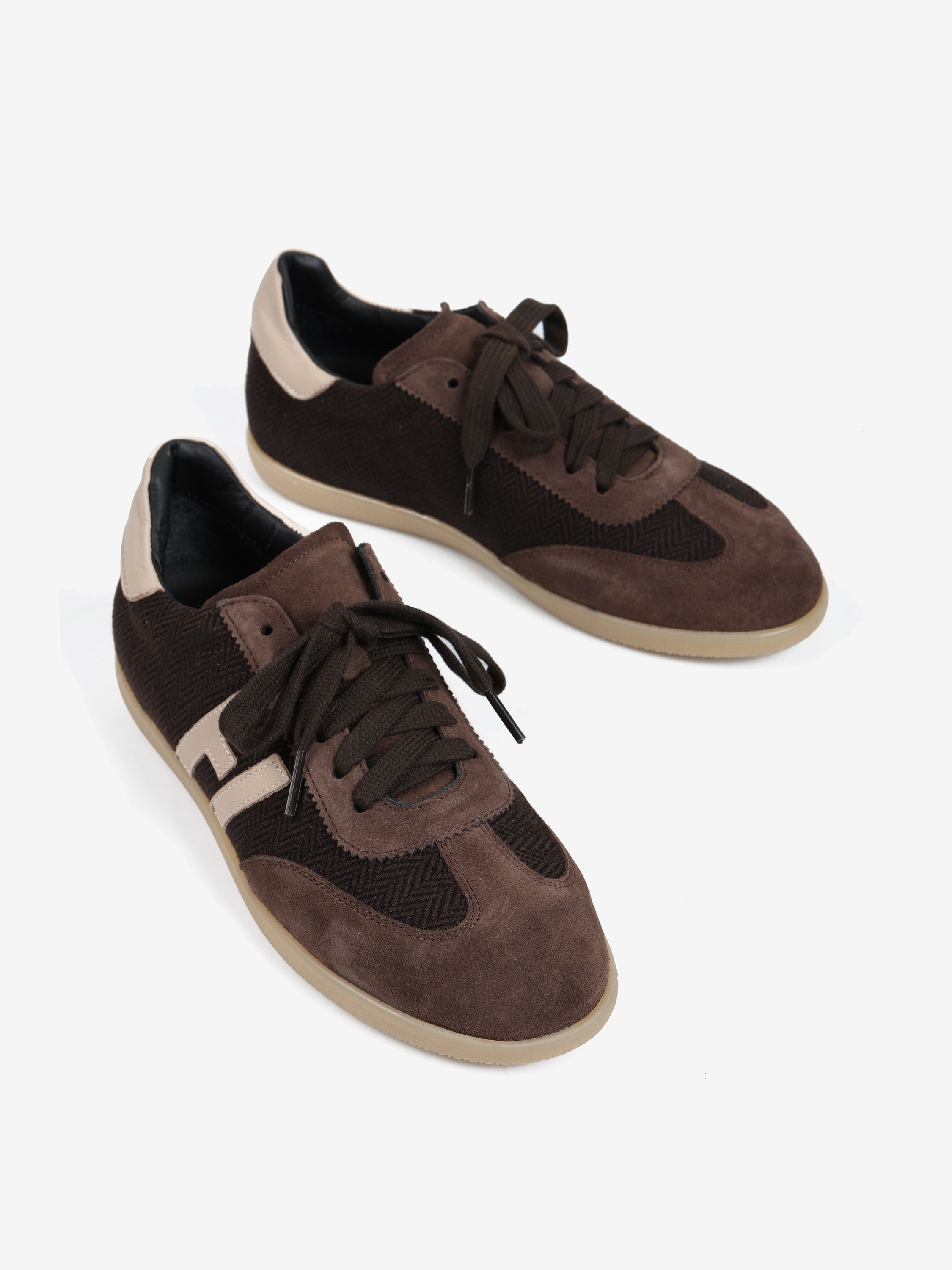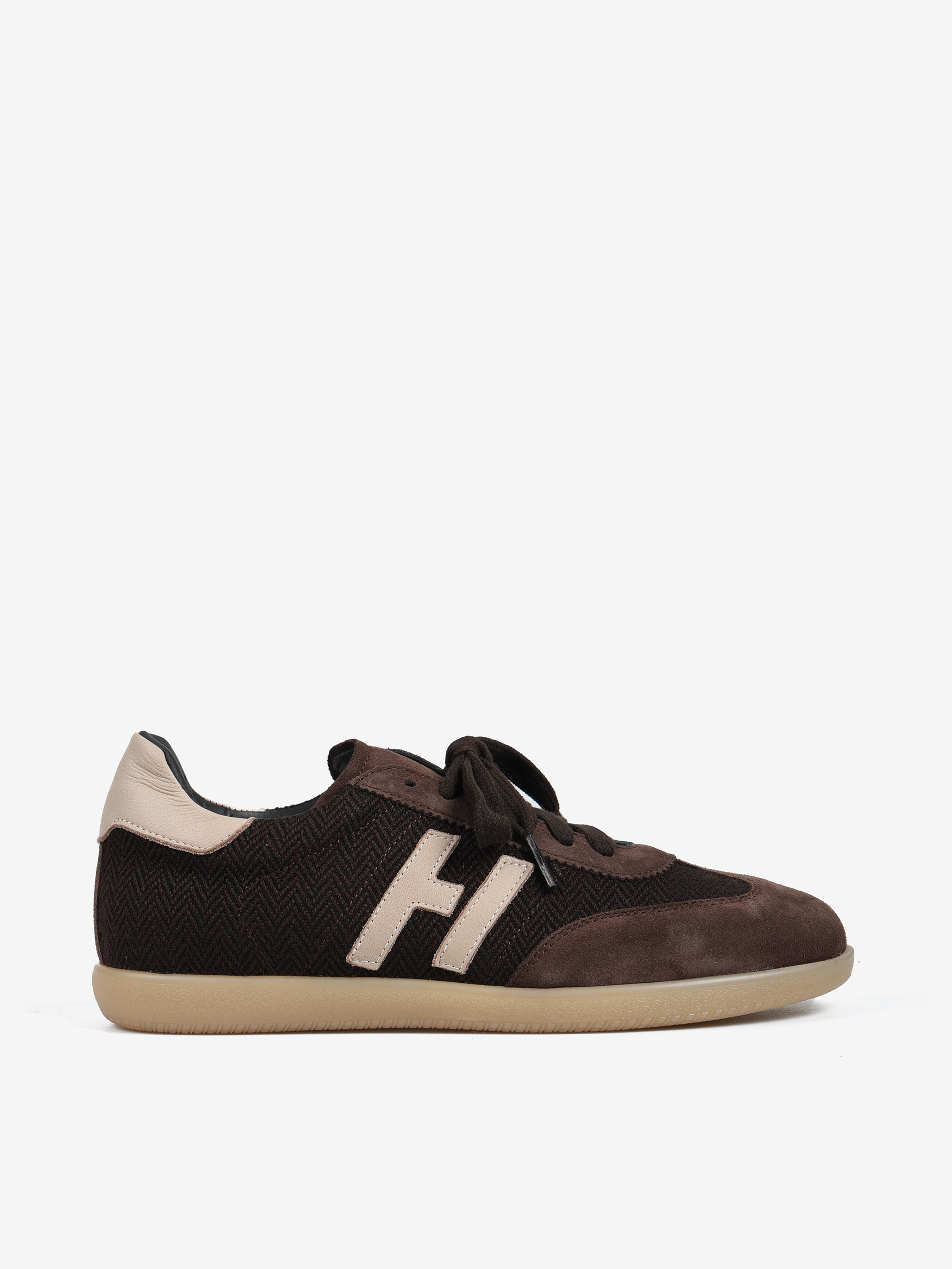 Autorskie sneakersy sygnowane literą H. Wykonane ze skóry naturalnej, zamszu i tweedu. Zaprojektowane i wyprodukowane we Włoszech.