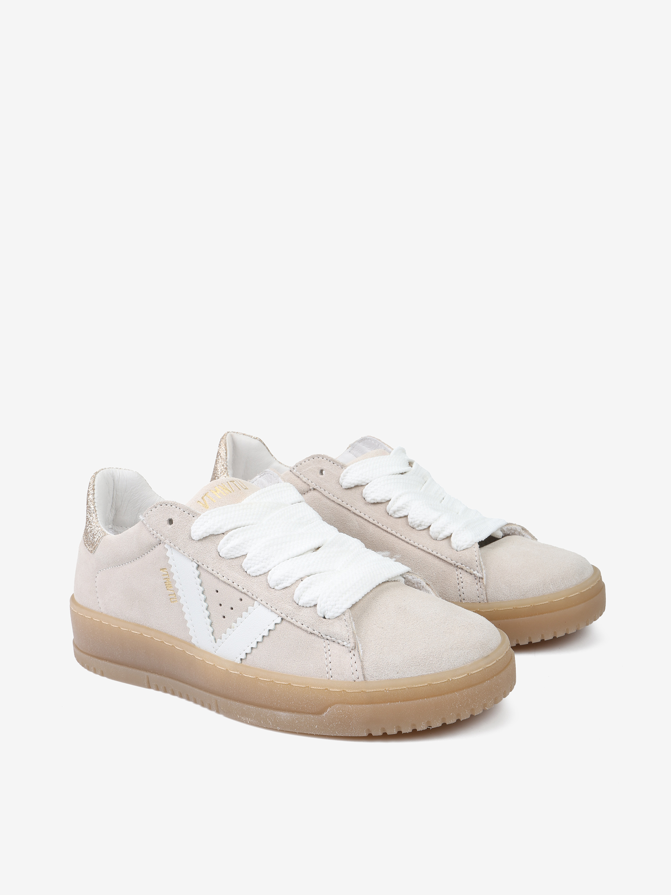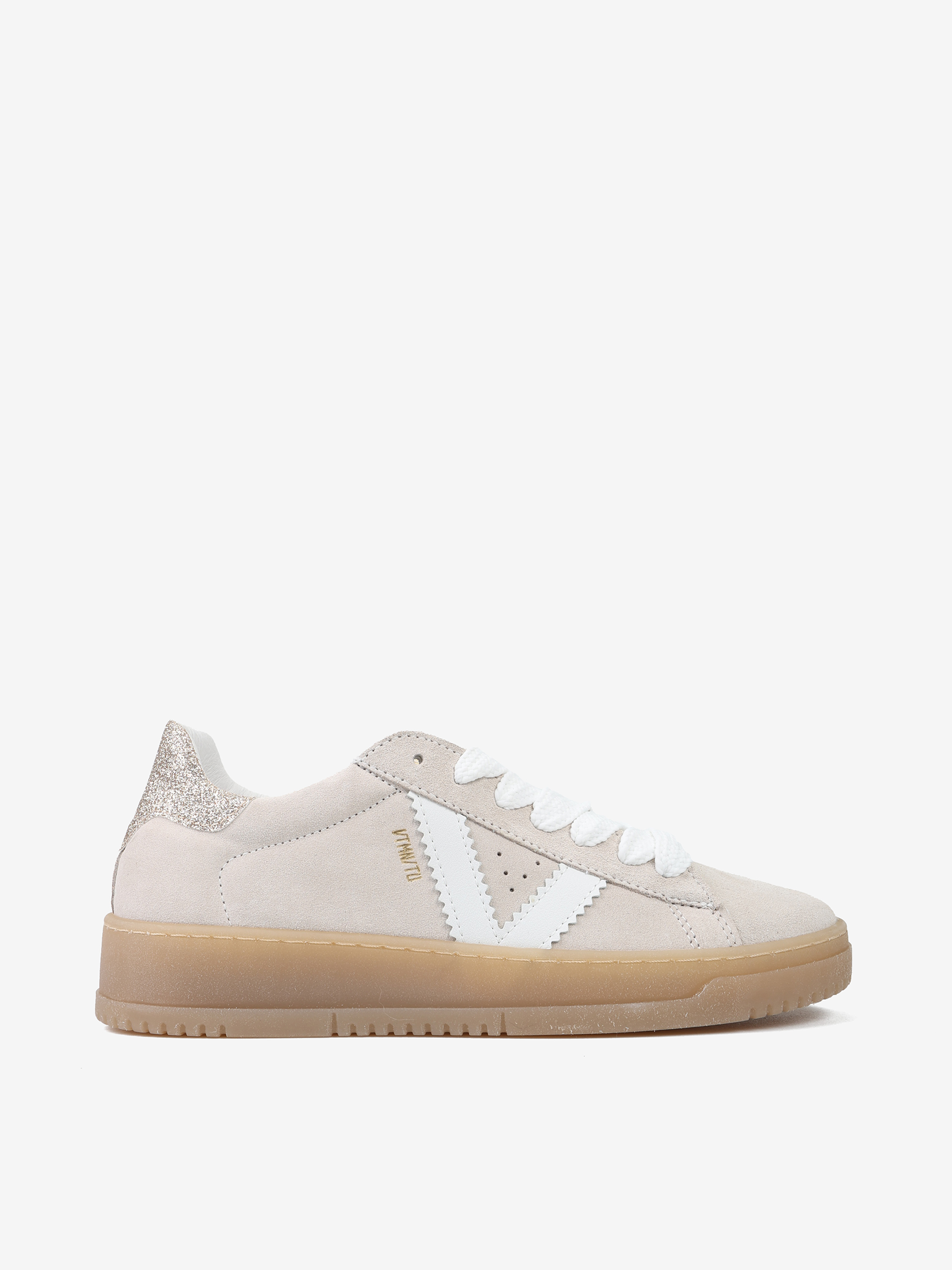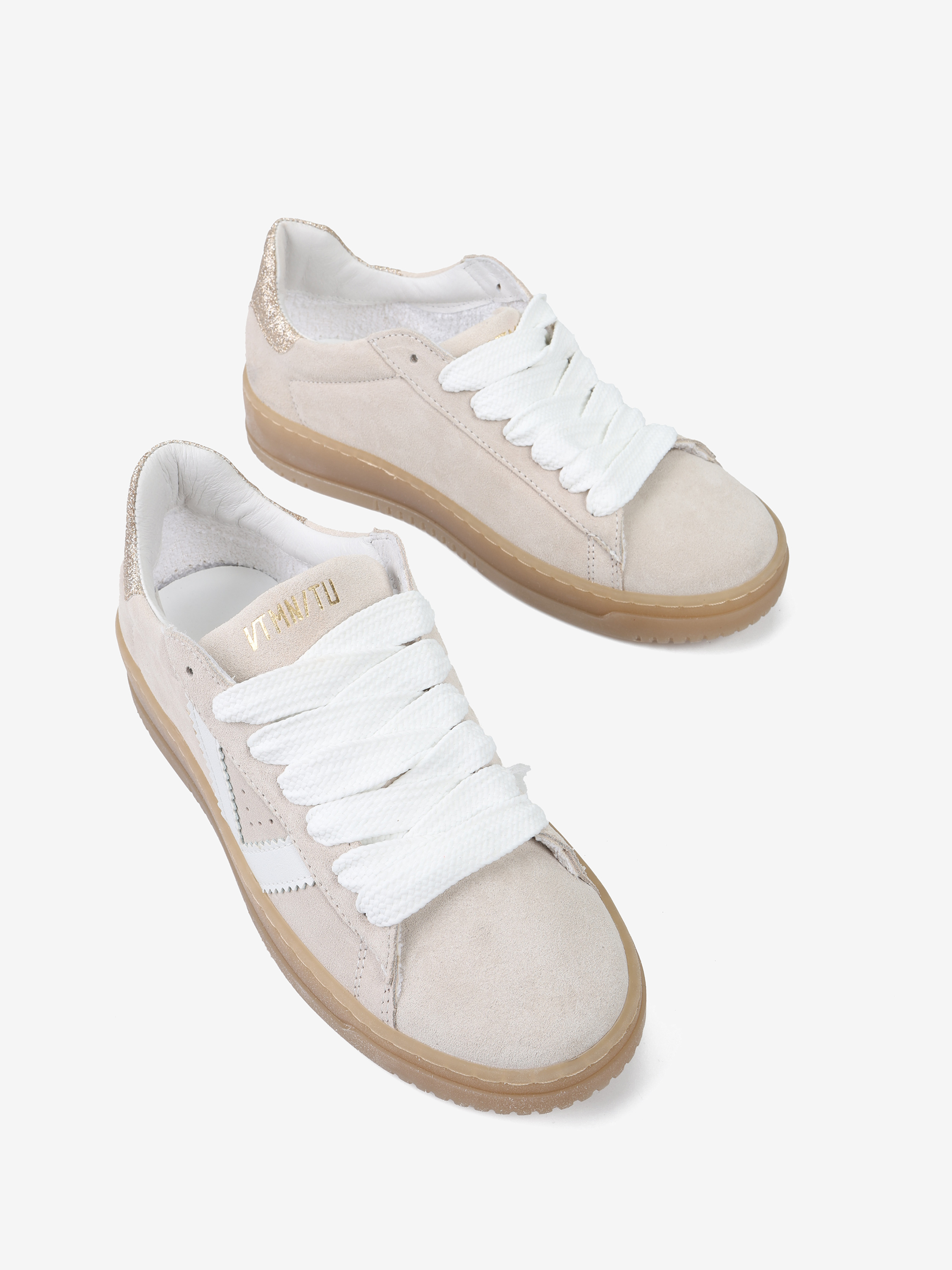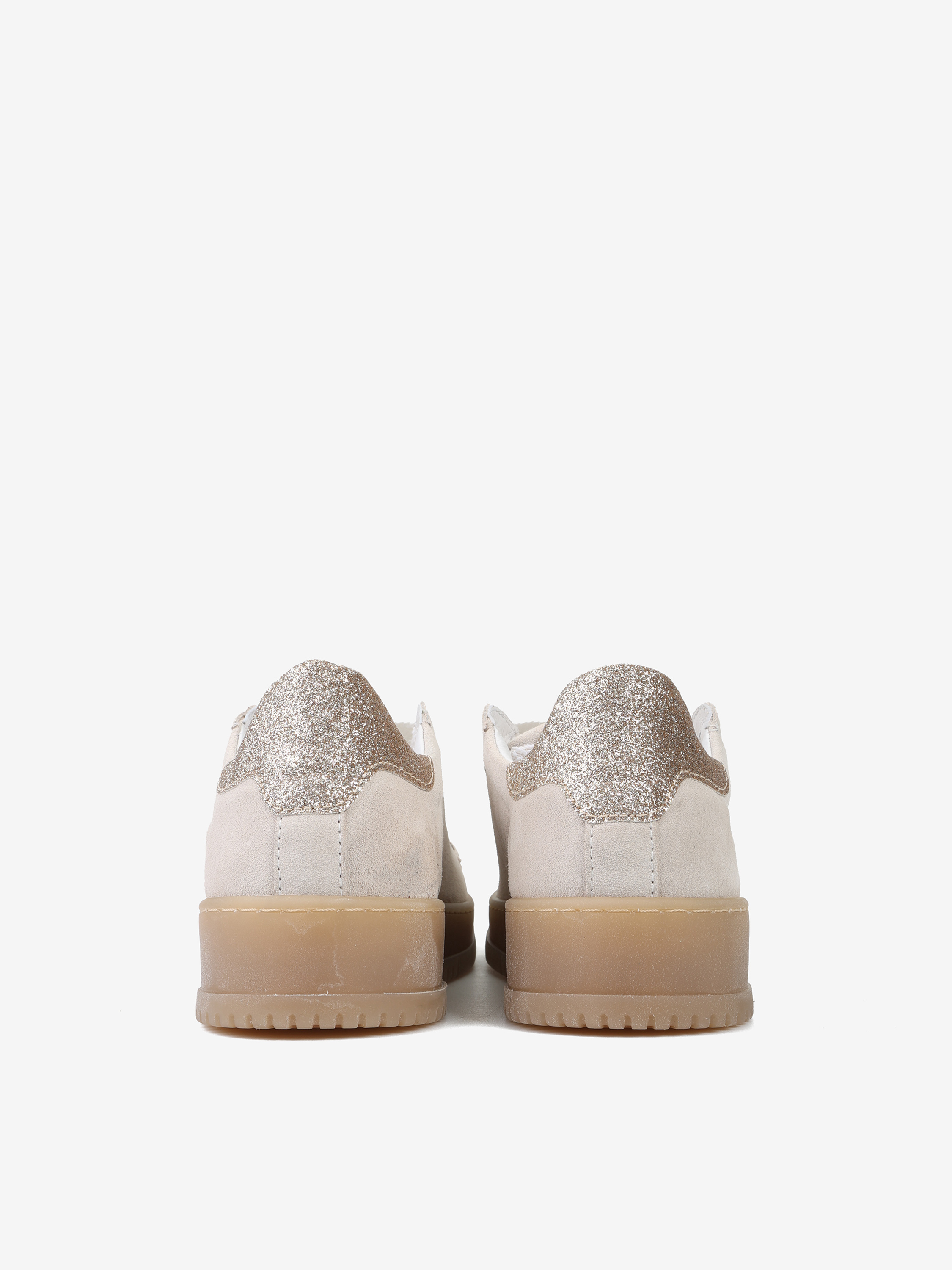 Zamszowe sneakersy z podeszwą w kolorze naturalnego kauczuku. Złote, brokatowe przeszycie na pięcie.