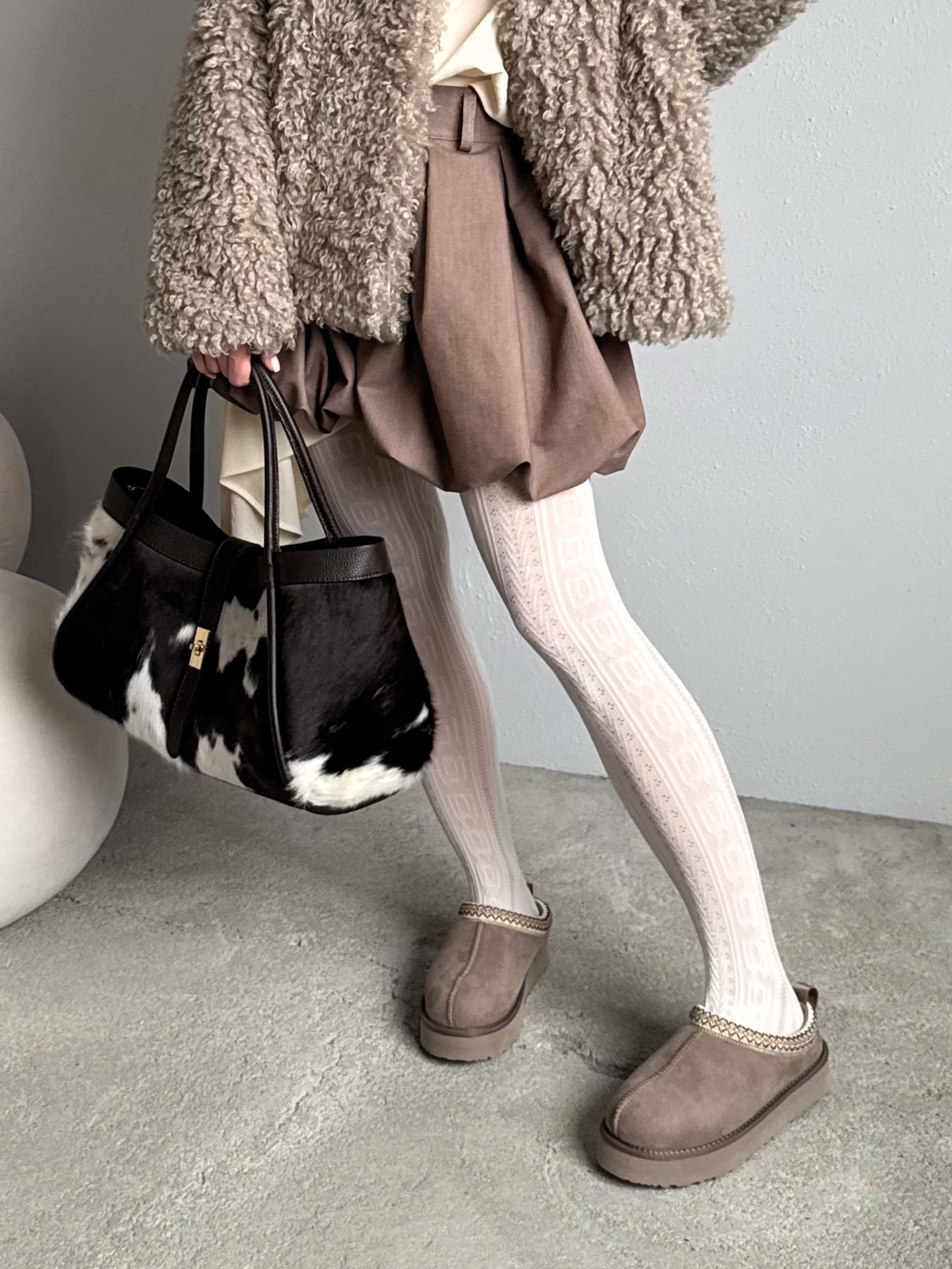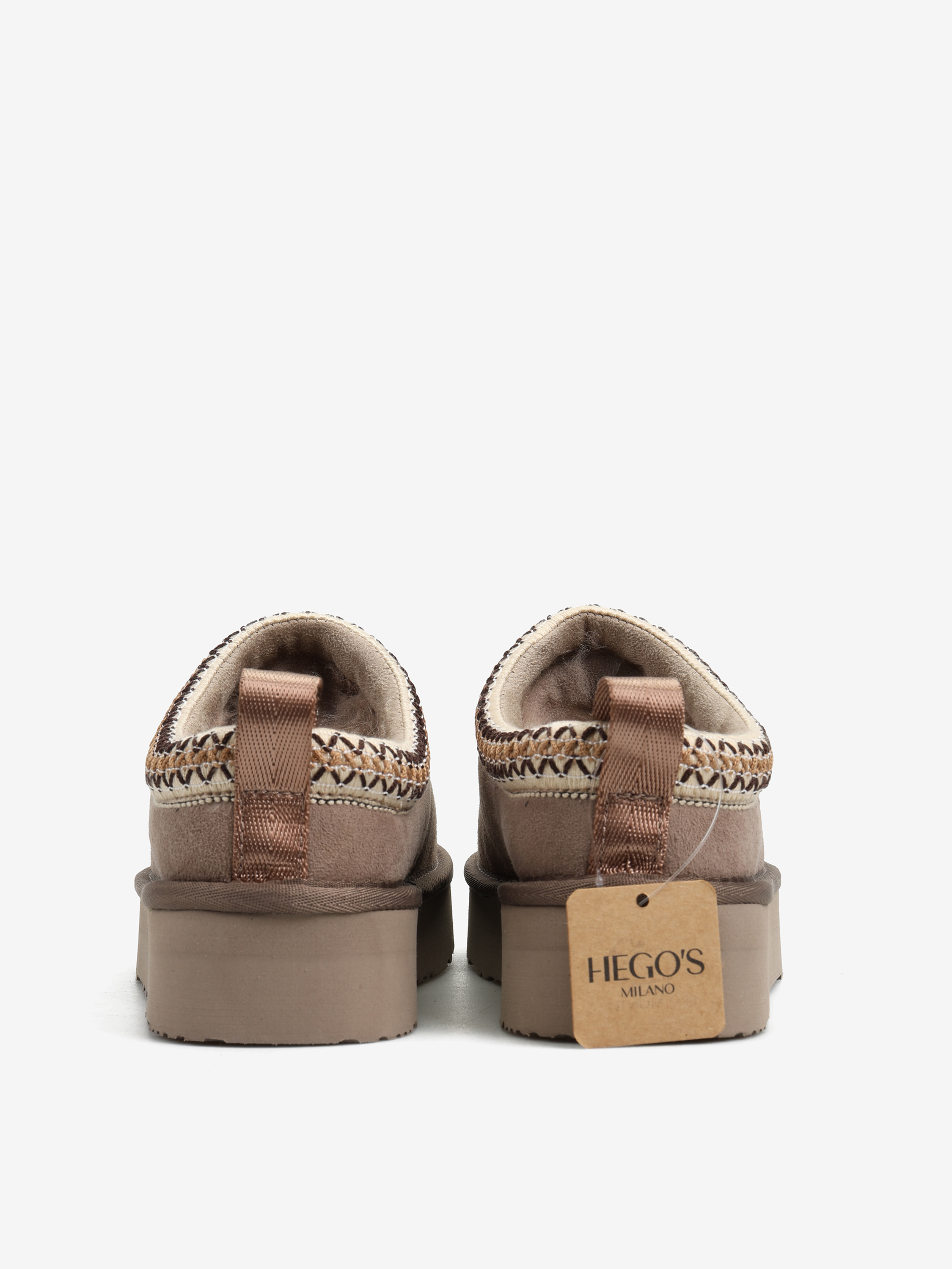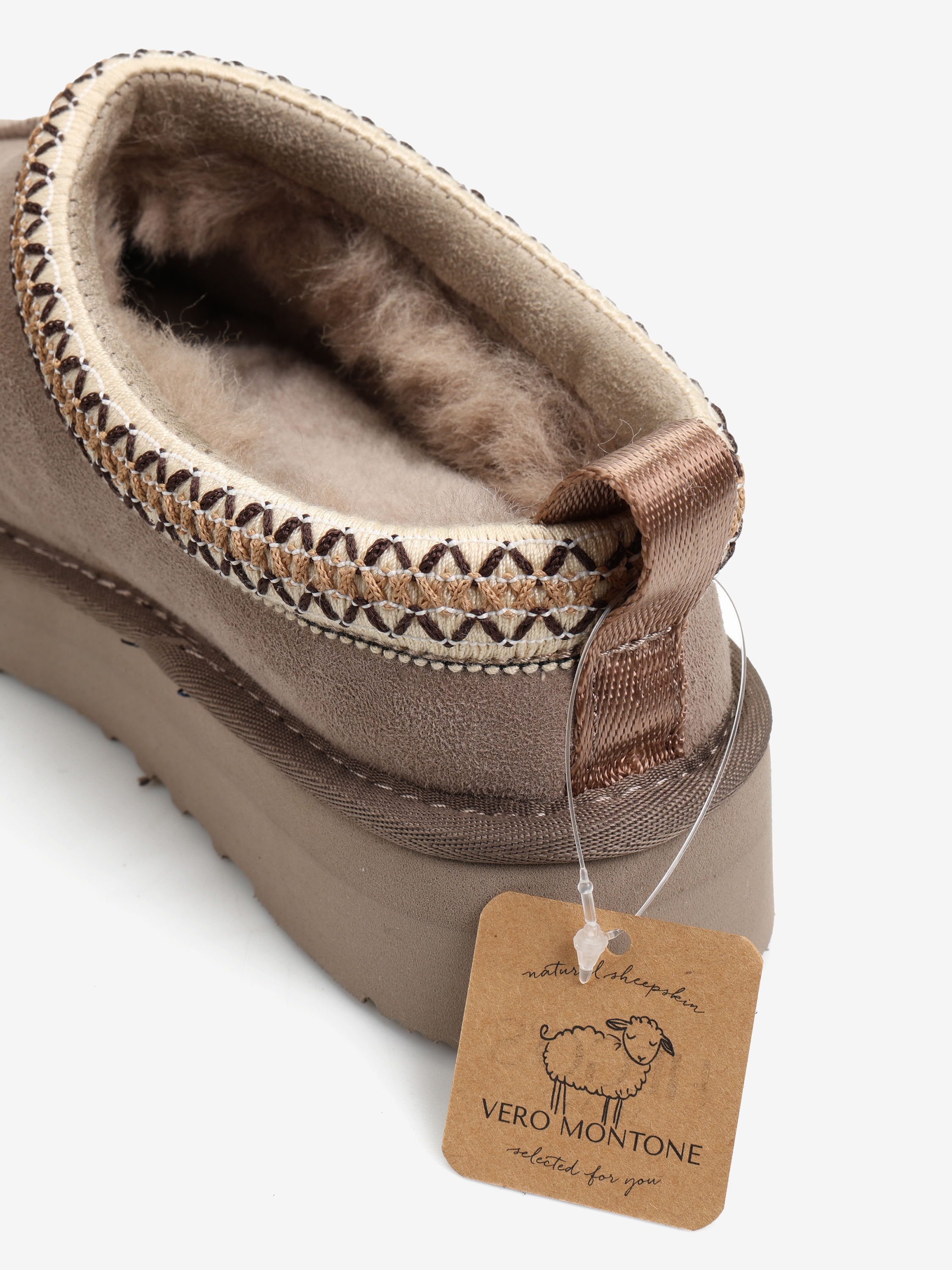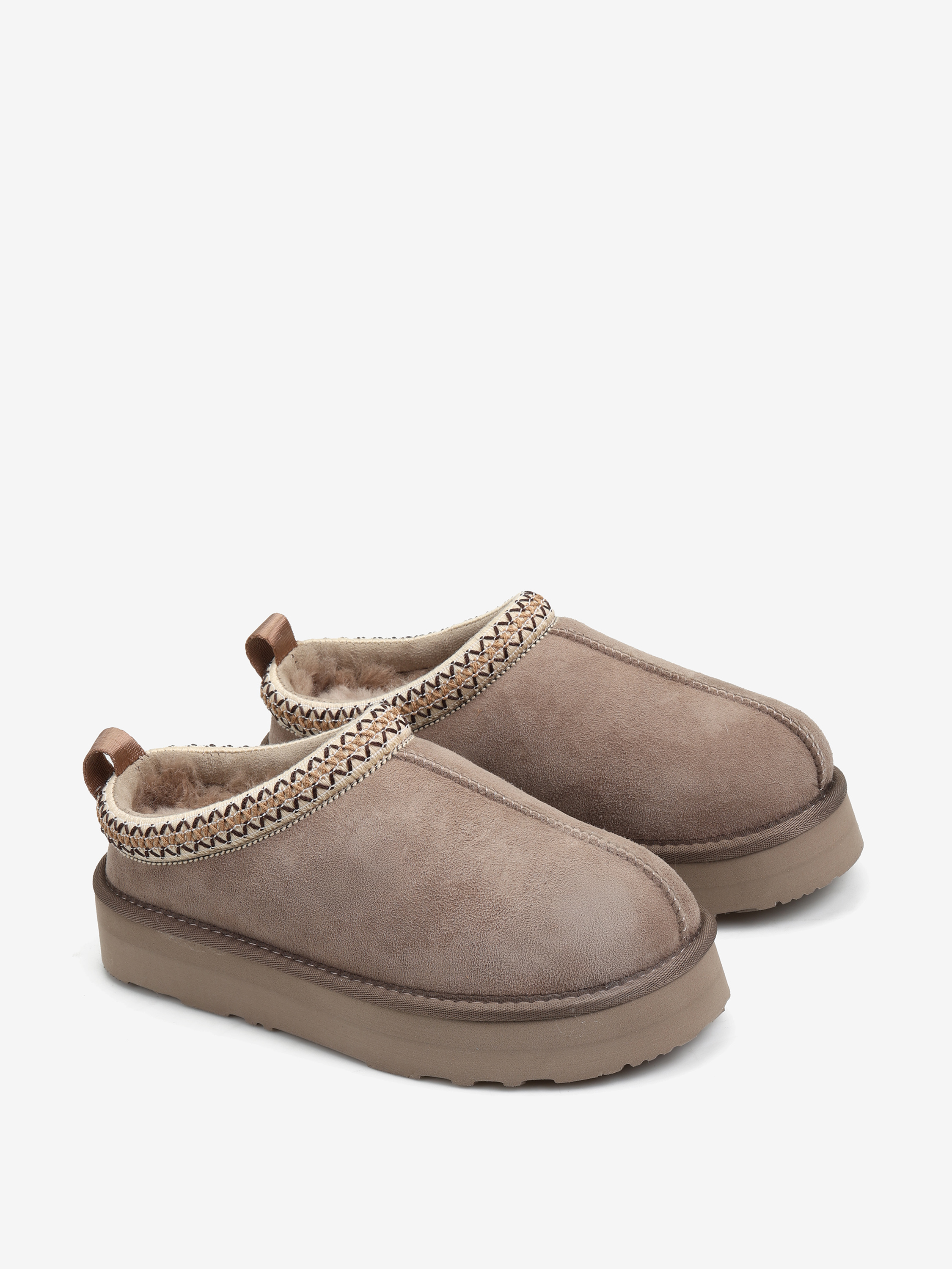 Wsuwane śniegowce typu slipper na platformie, wykonane z 100% naturalnej skóry owczej. Zewnętrzna warstwa to miękka, zamszowa skóra, natomiast wnętrze to ciepły, naturalny kożuch. Ozdobny haft na brzegu cholewki.