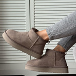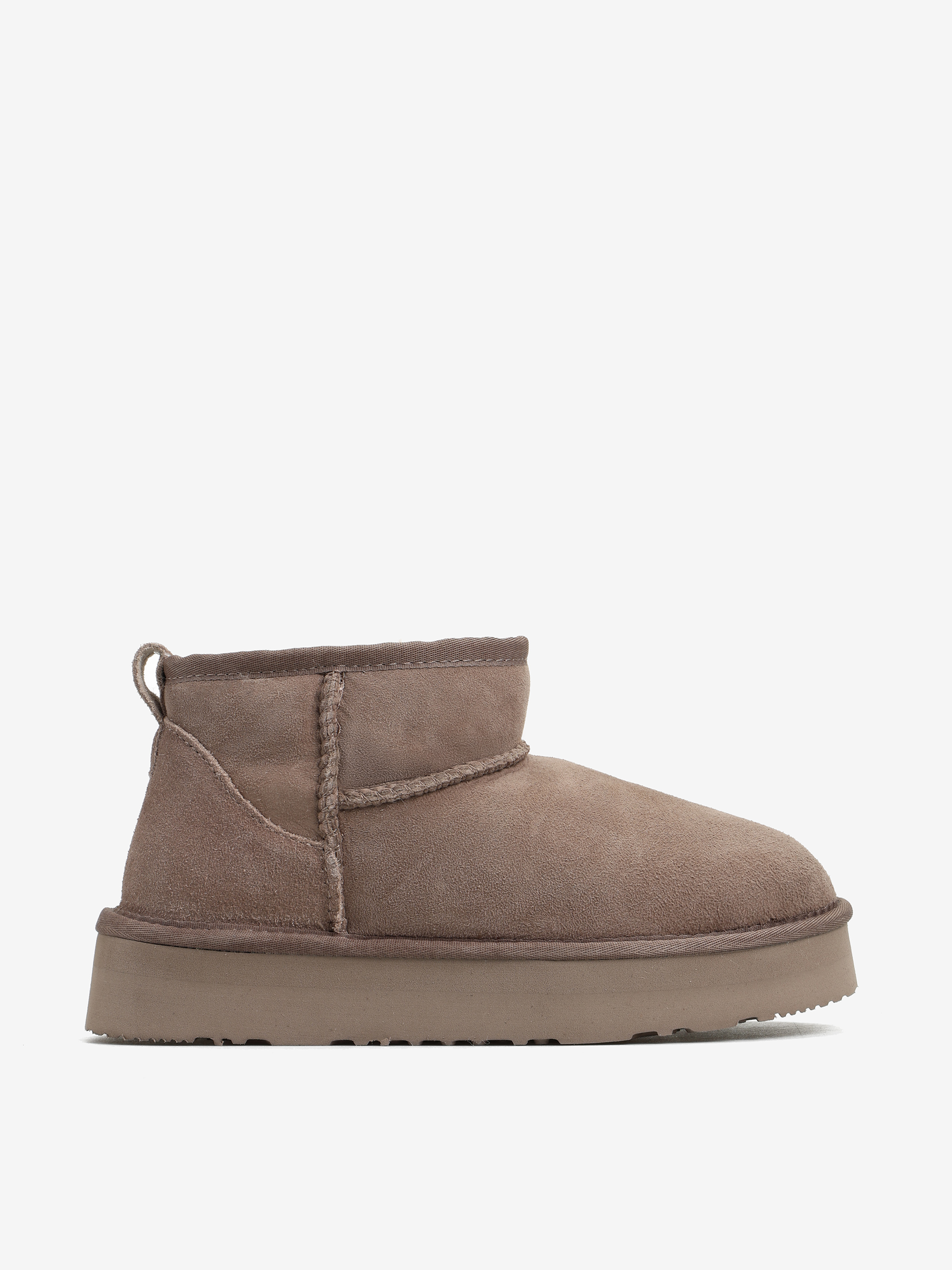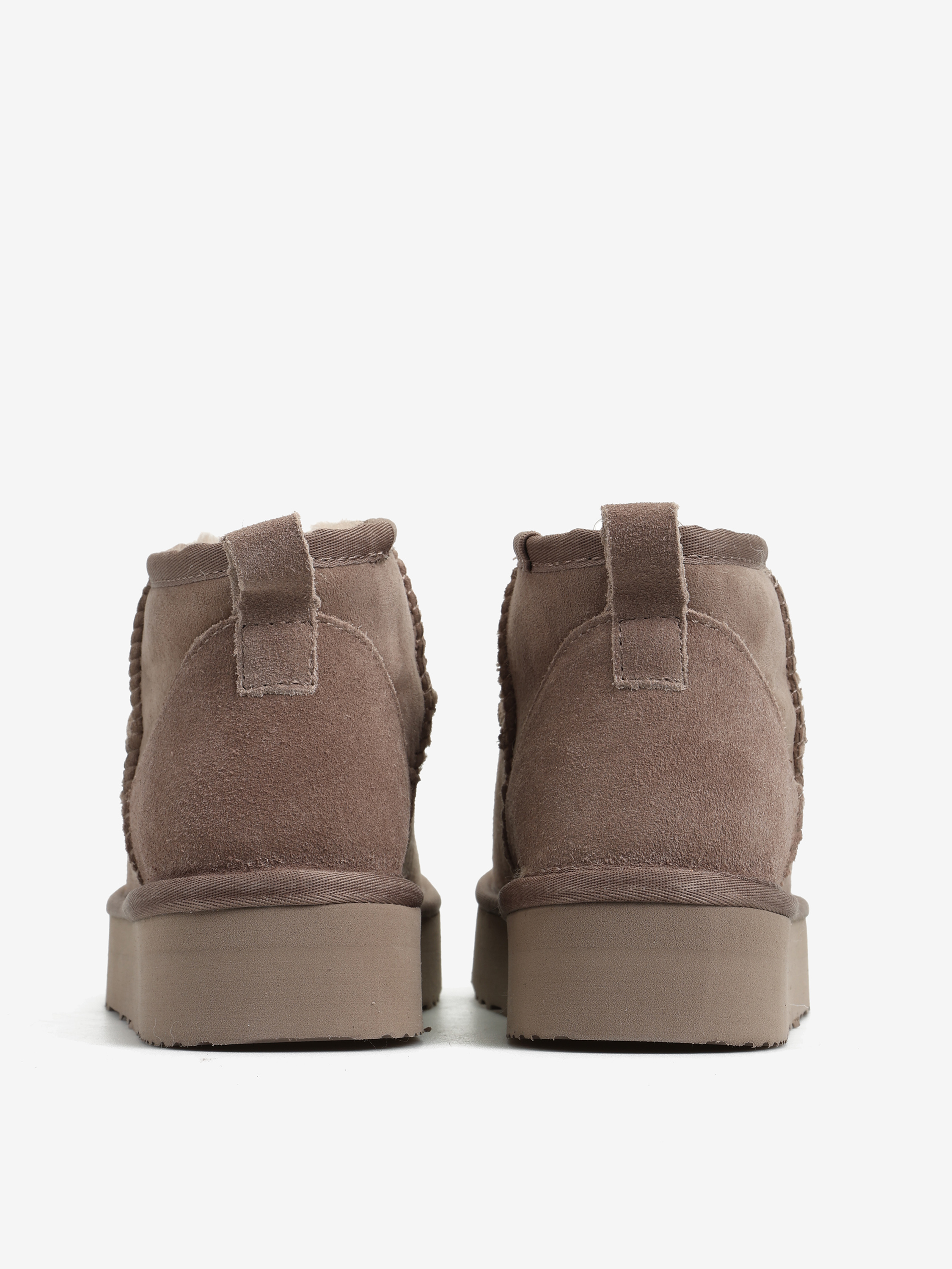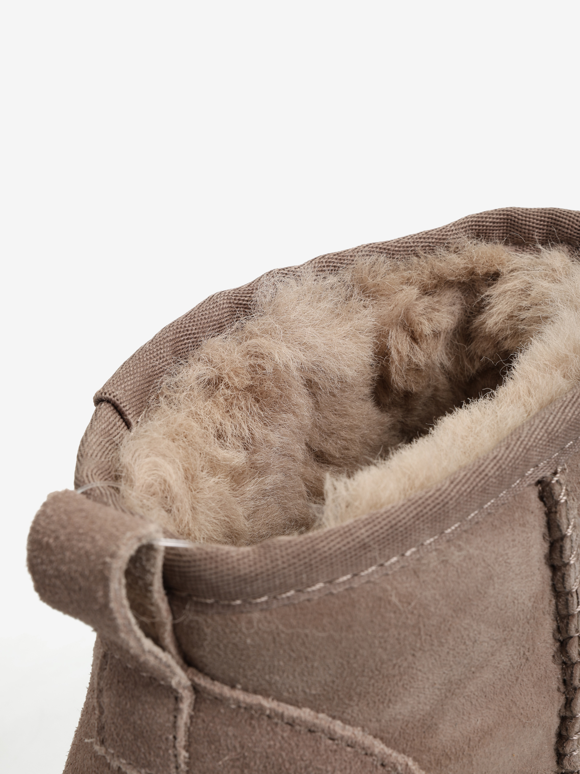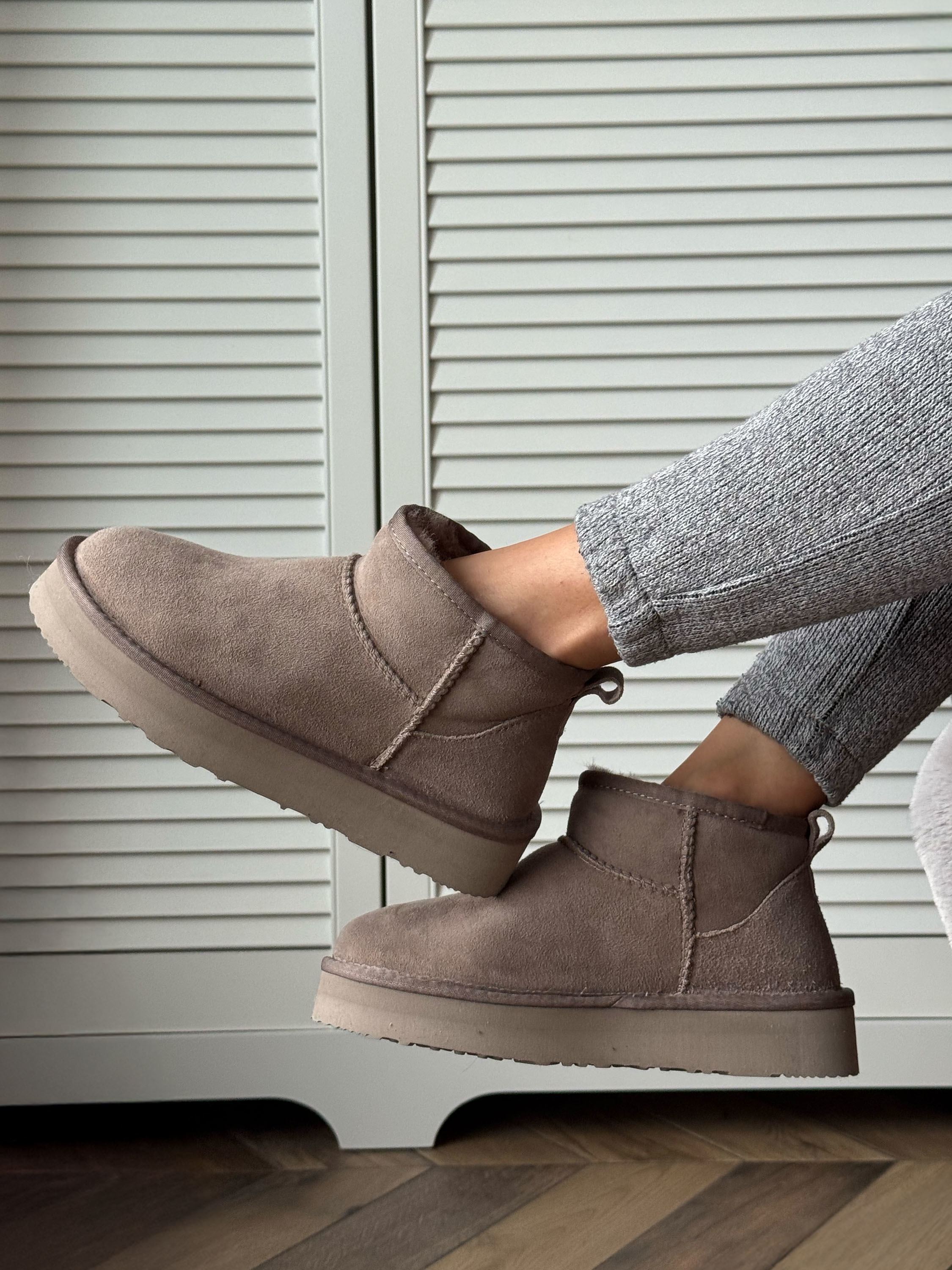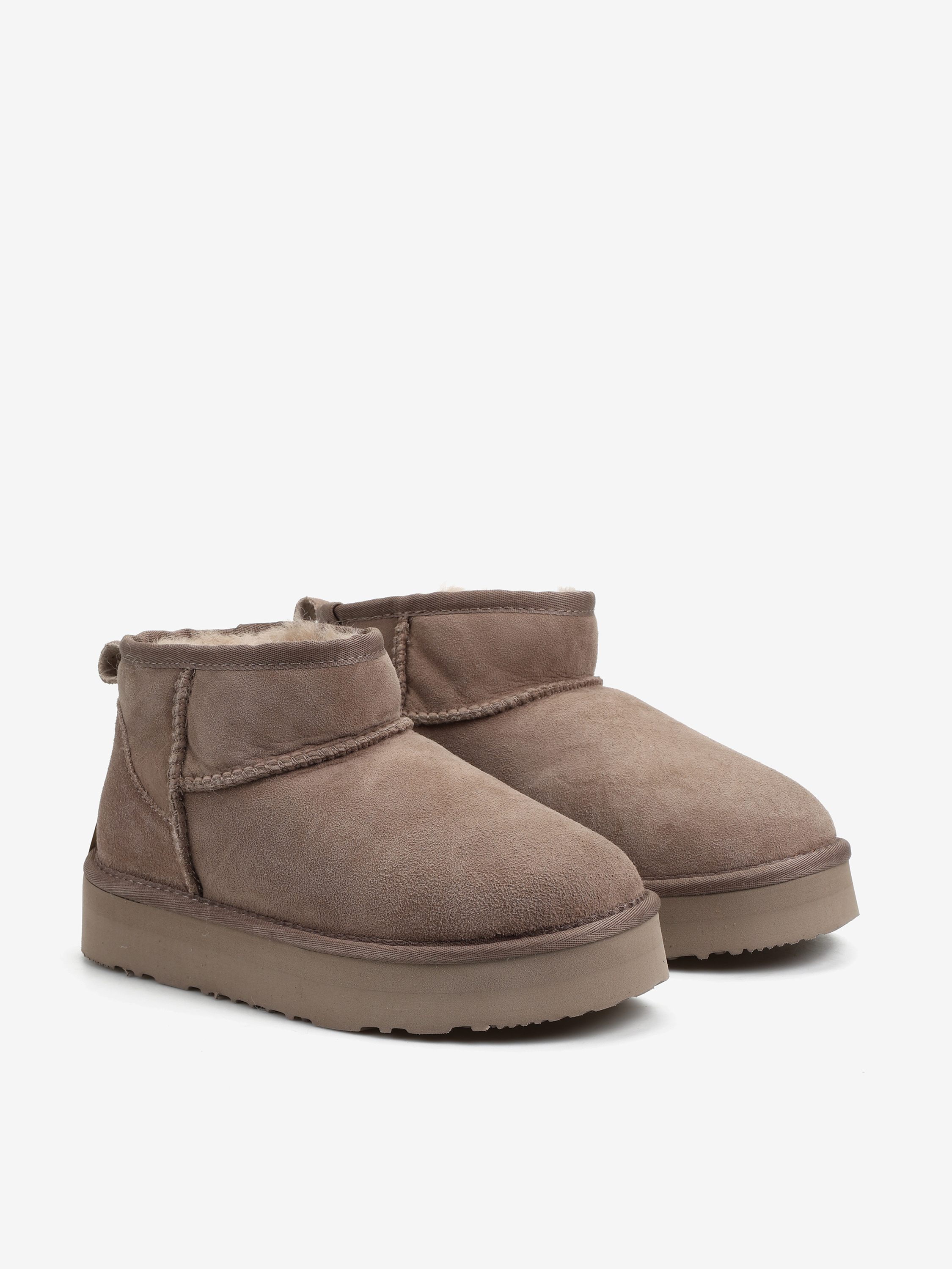 Krótkie śniegowce na średniej platformie, wykonane z 100% naturalnej skóry owczej. Zewnętrzna warstwa to miękka, zamszowa skóra, natomiast wnętrze to ciepły, naturalny kożuch.