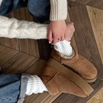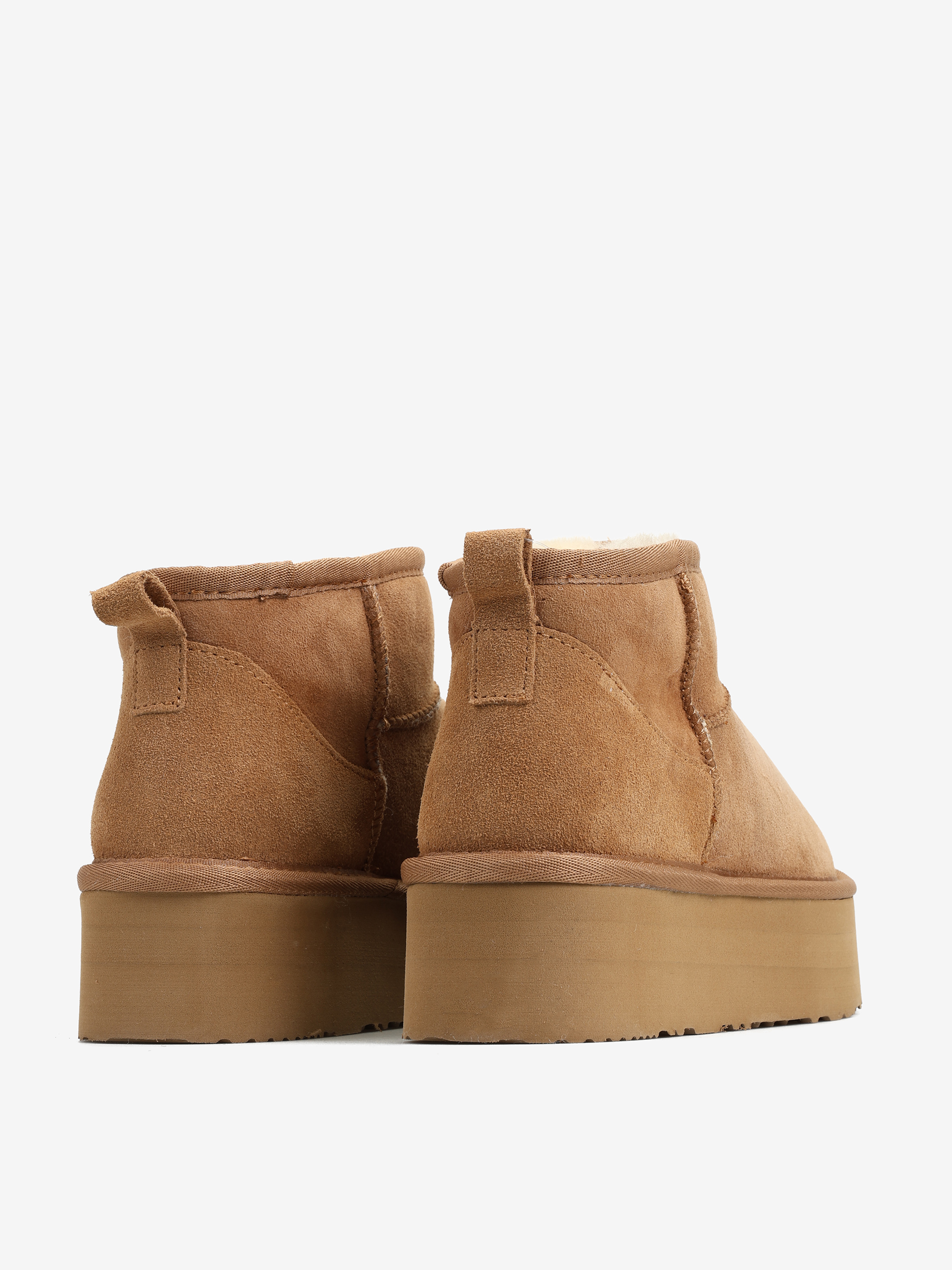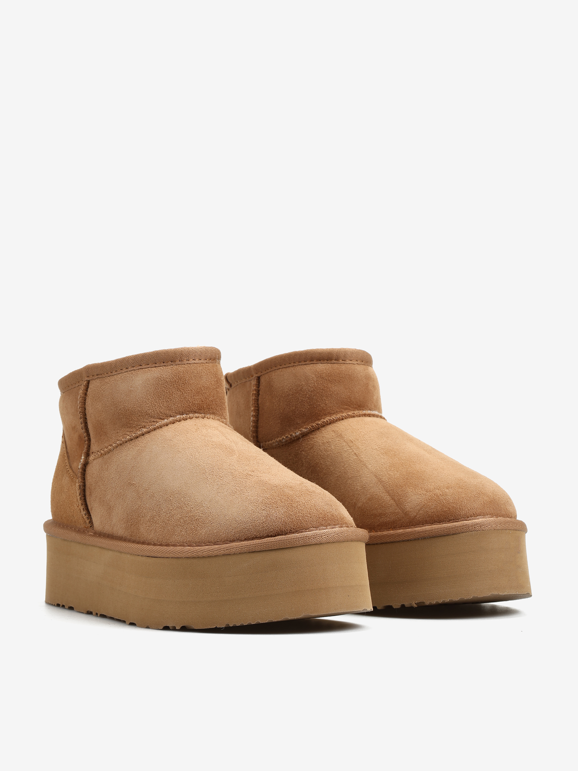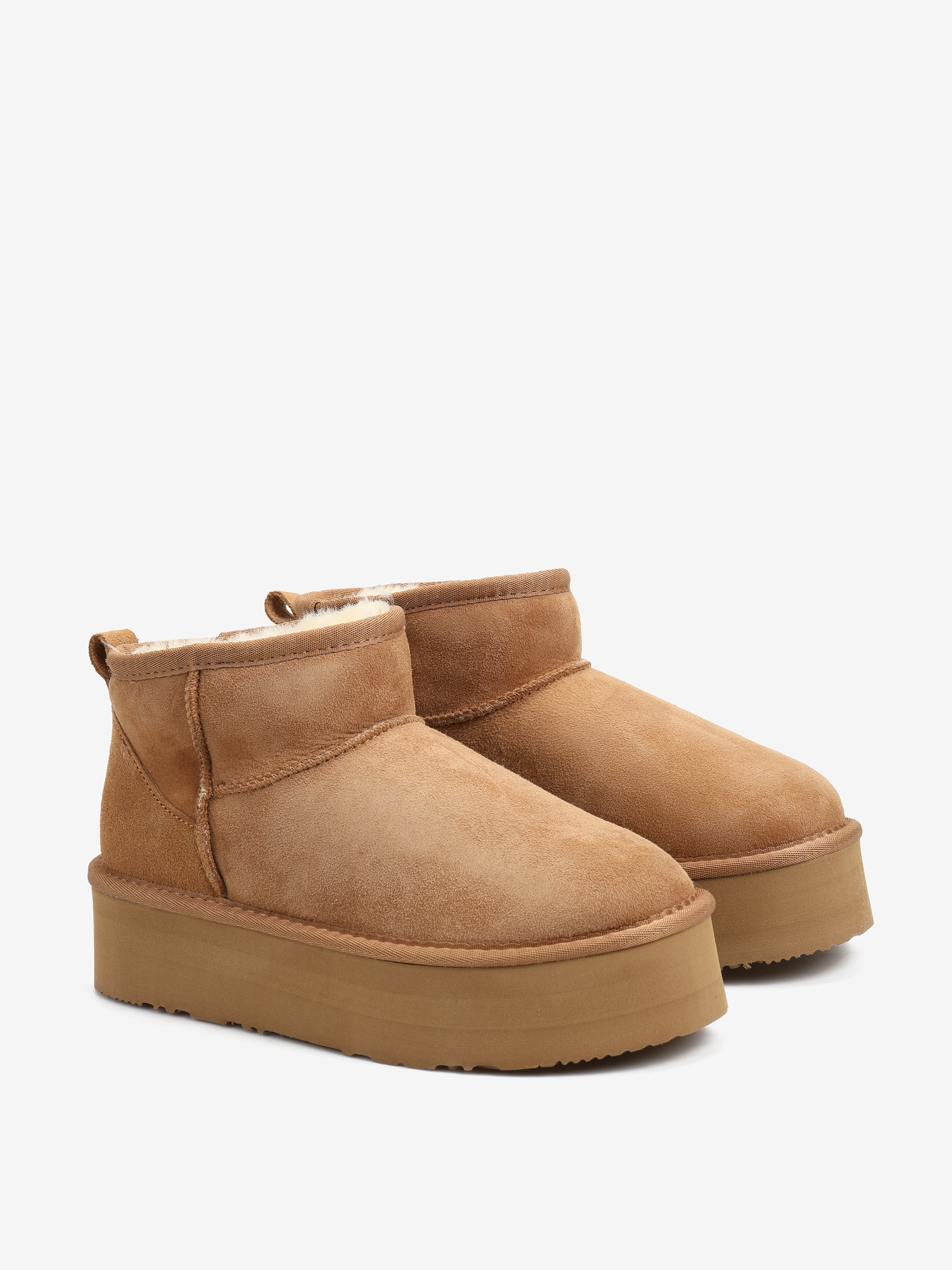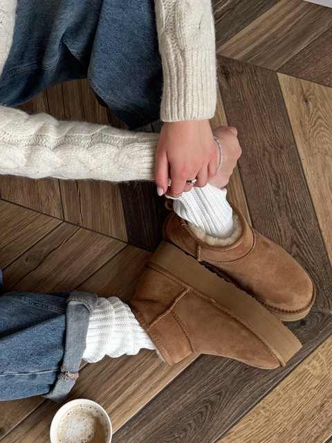 Krótkie śniegowce na wysokiej platformie, wykonane z 100% naturalnej skóry owczej. Zewnętrzna warstwa to miękka, zamszowa skóra, natomiast wnętrze to ciepły, naturalny kożuch.