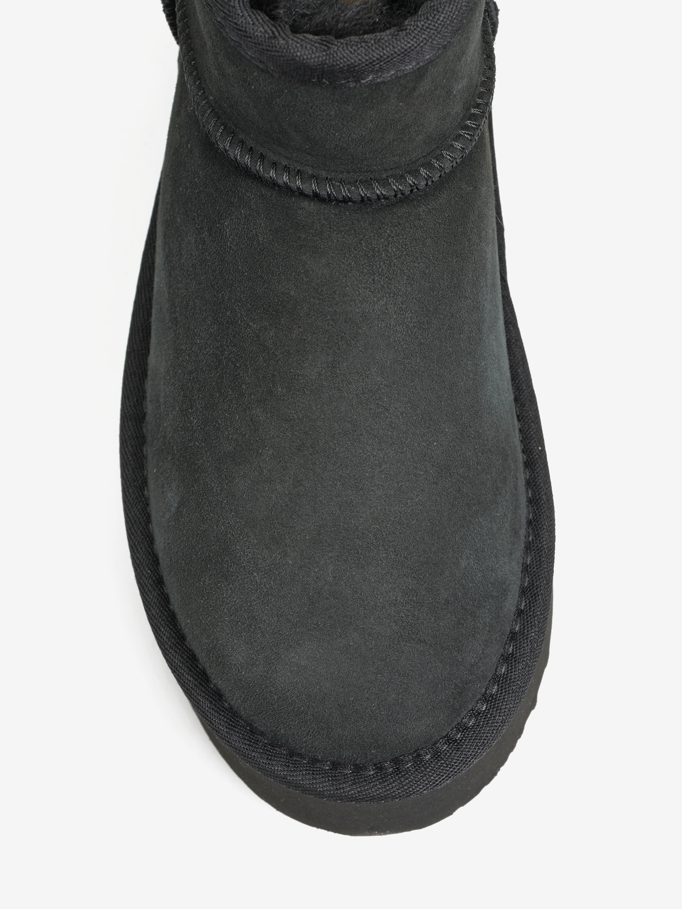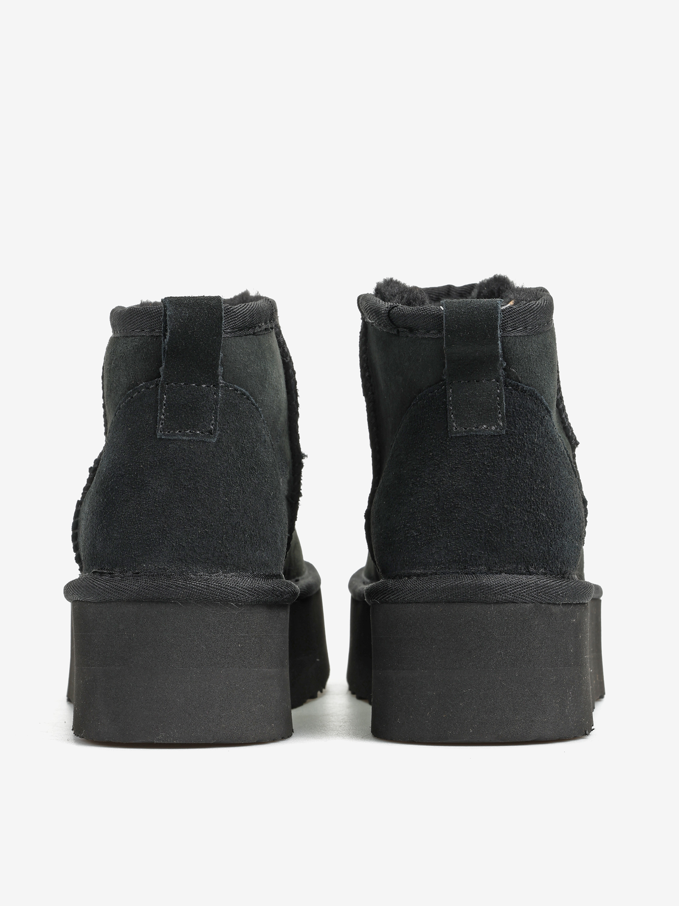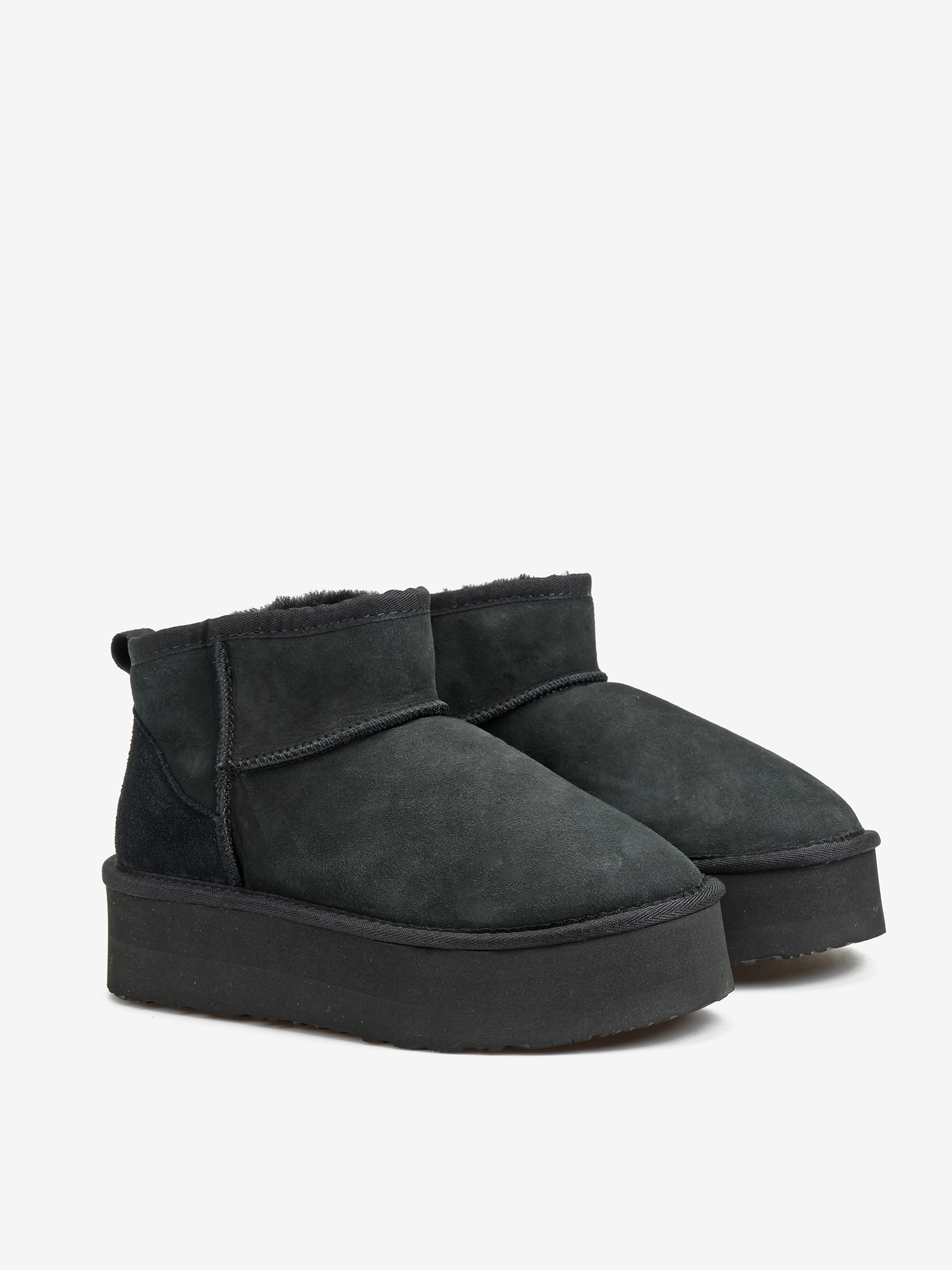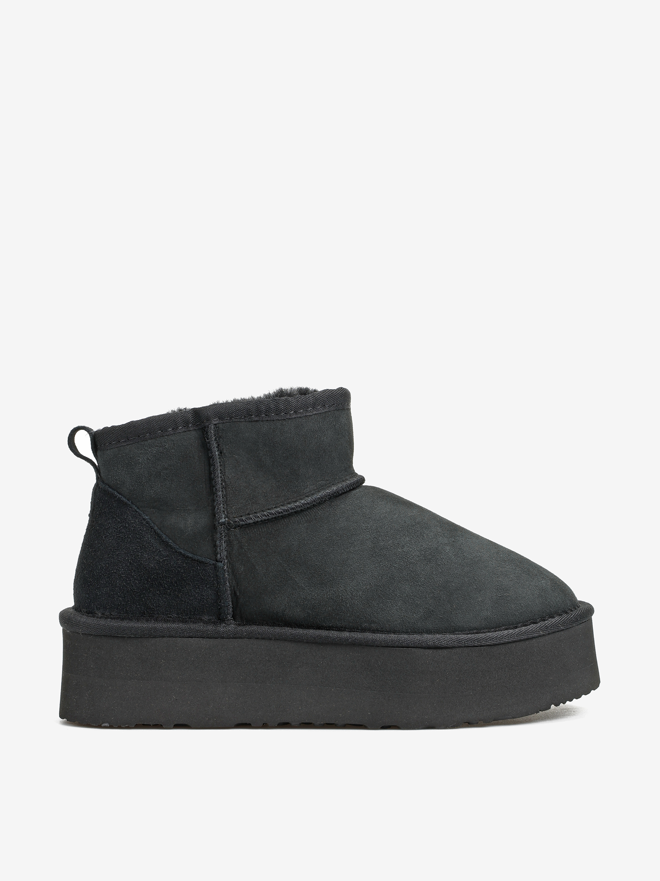 Krótkie śniegowce na wysokiej platformie, wykonane z 100% naturalnej skóry owczej. Zewnętrzna warstwa to miękka, zamszowa skóra, natomiast wnętrze to ciepły, naturalny kożuch.