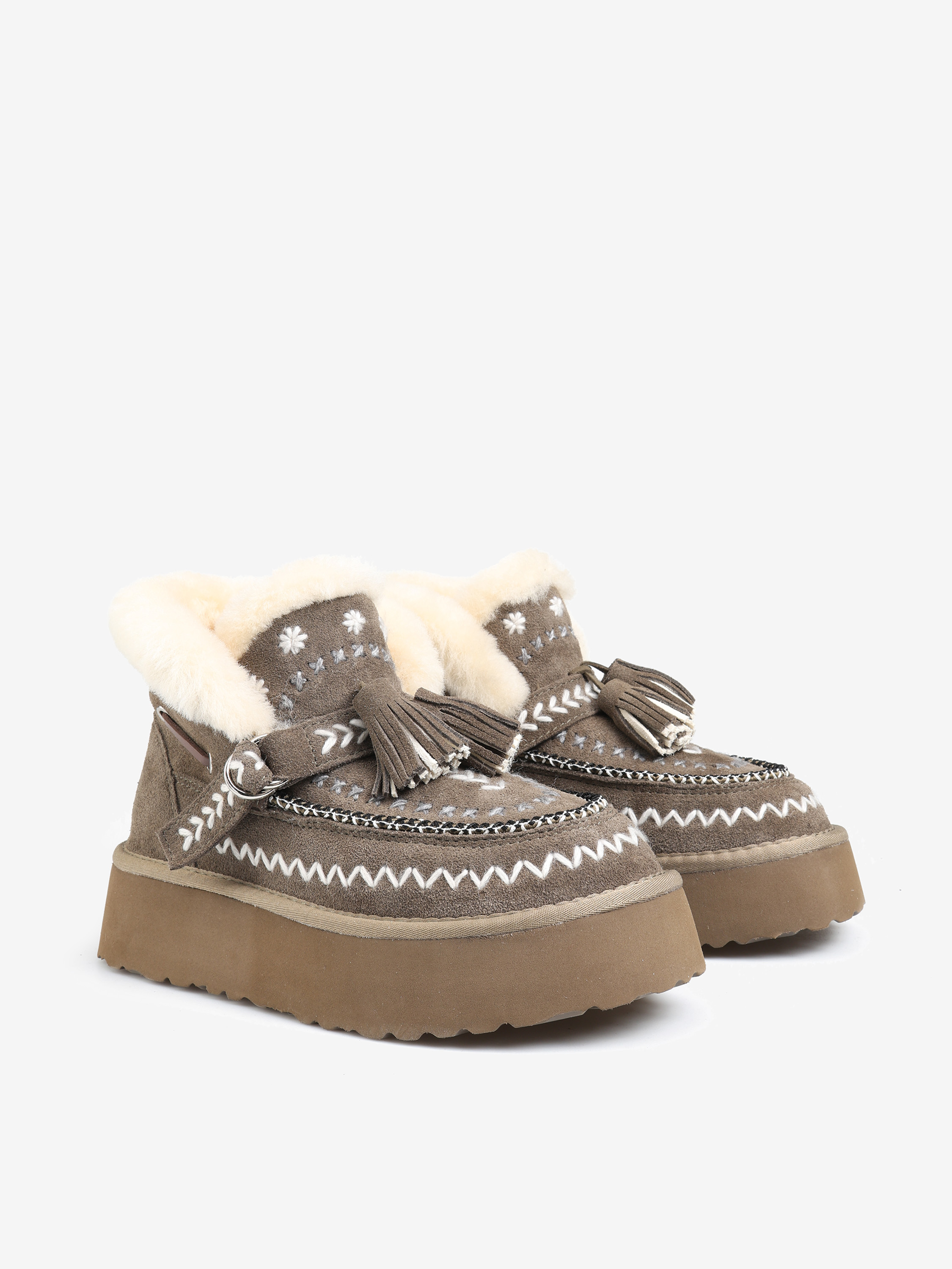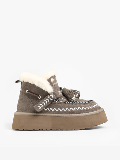 Śniegowce na wysokiej platformie wykonane z naturalnego zamszu. Ozdobne hafty i regulowany pasek z frędzlami. Wnętrze wyłożone miękką, naturalną wełną owczą.