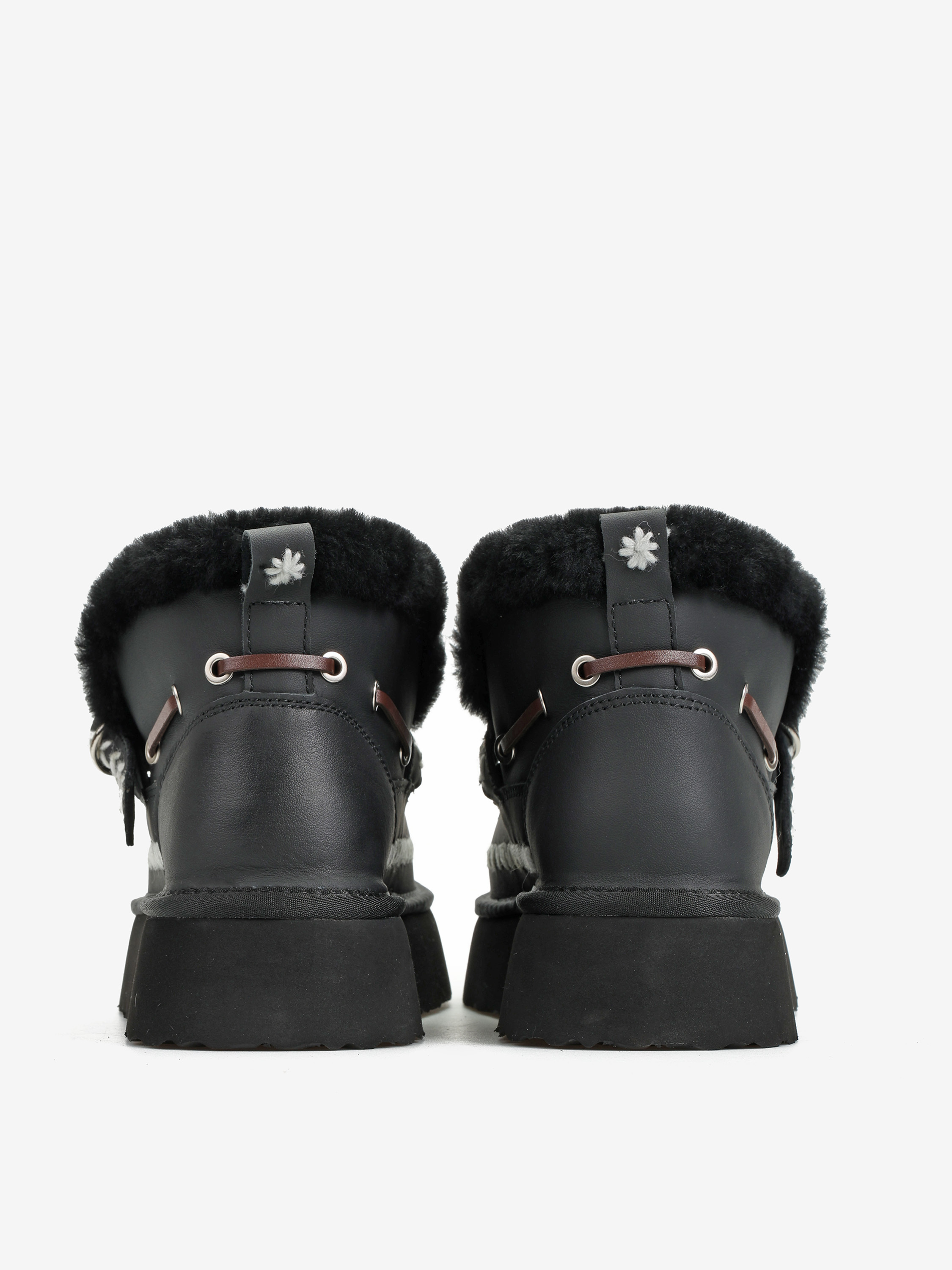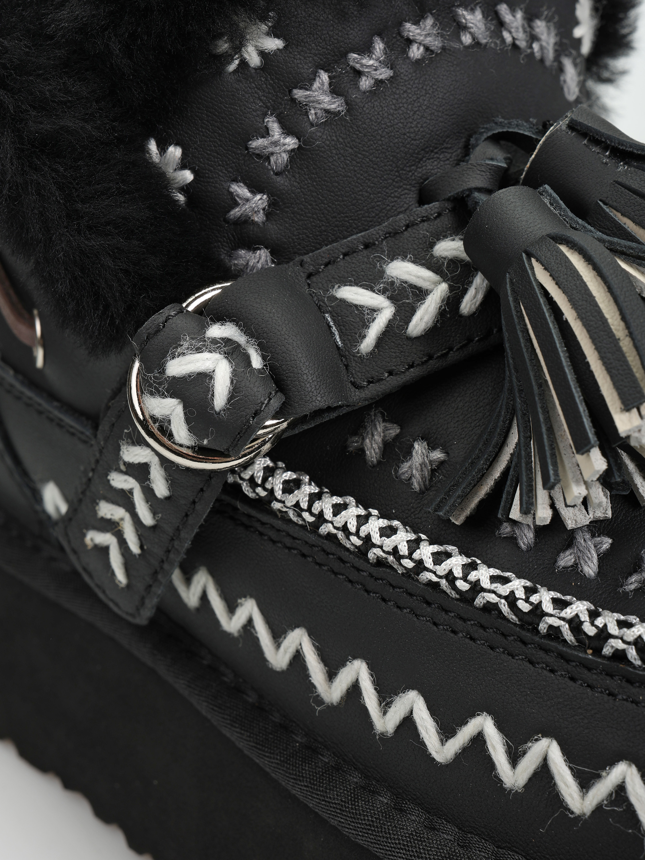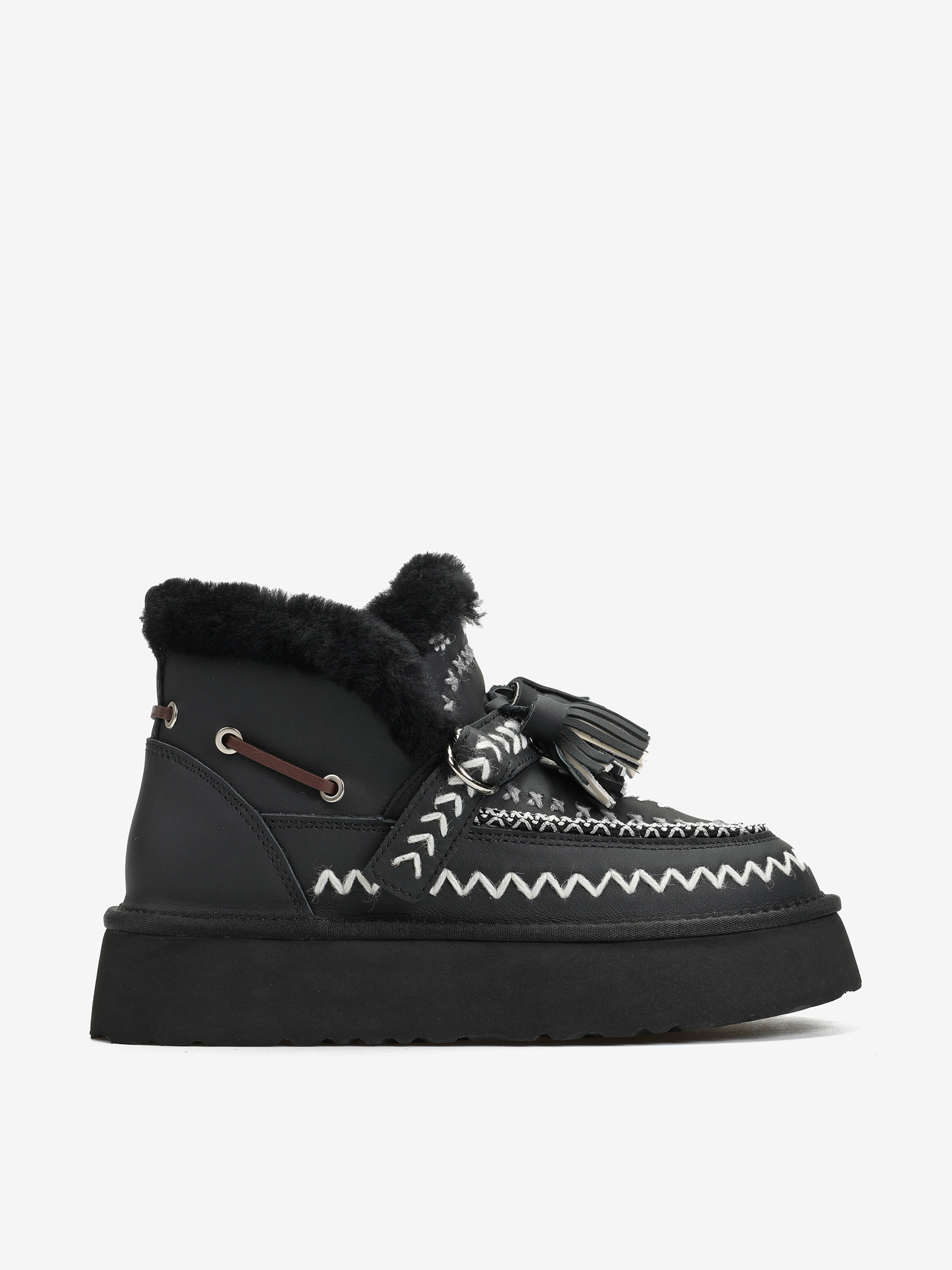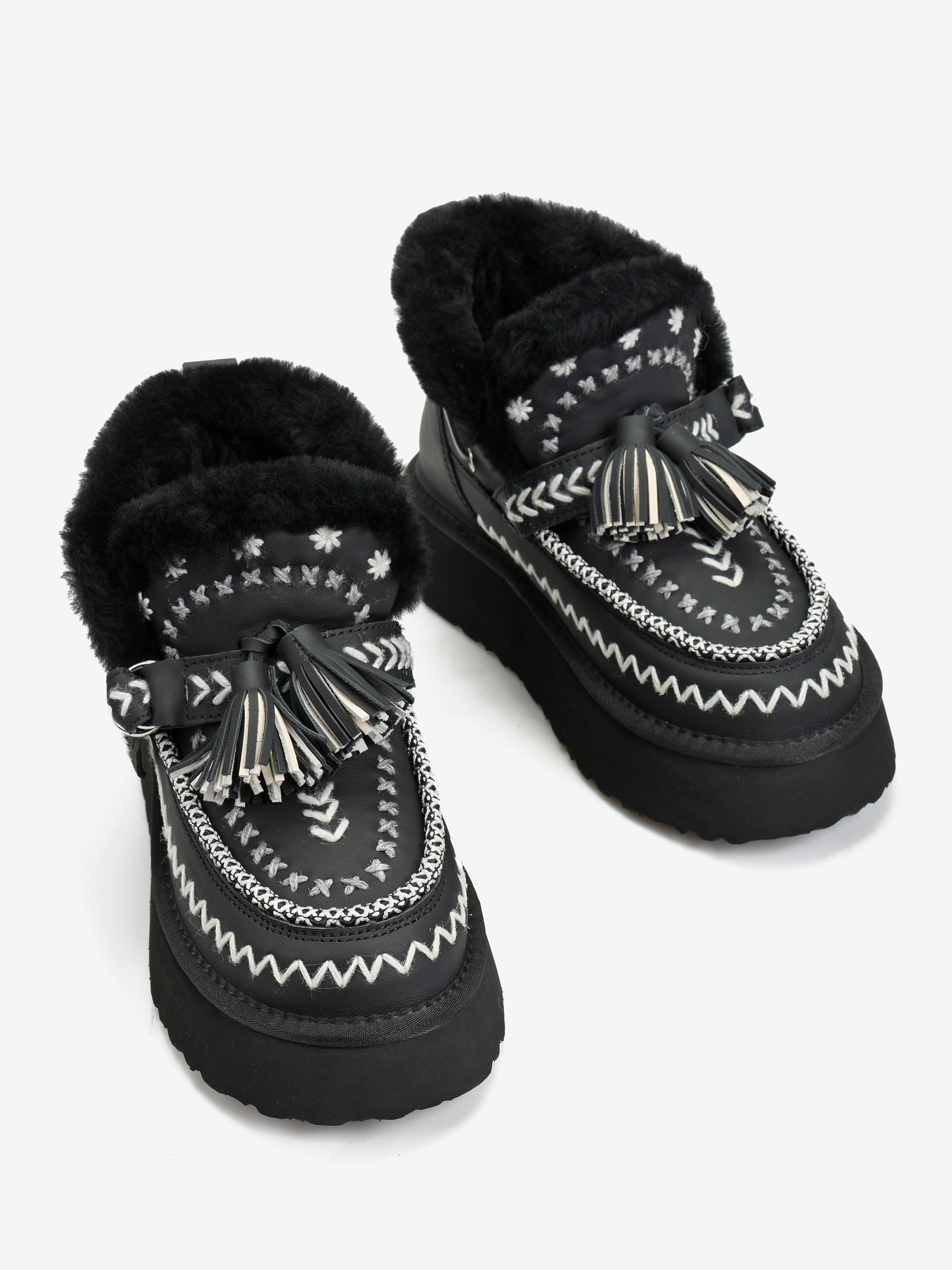Śniegowce na wysokiej platformie wykonane z naturalnej skóry licowej. Ozdobne hafty i regulowany pasek z frędzlami. Wnętrze wyłożone miękką, naturalną wełną owczą.