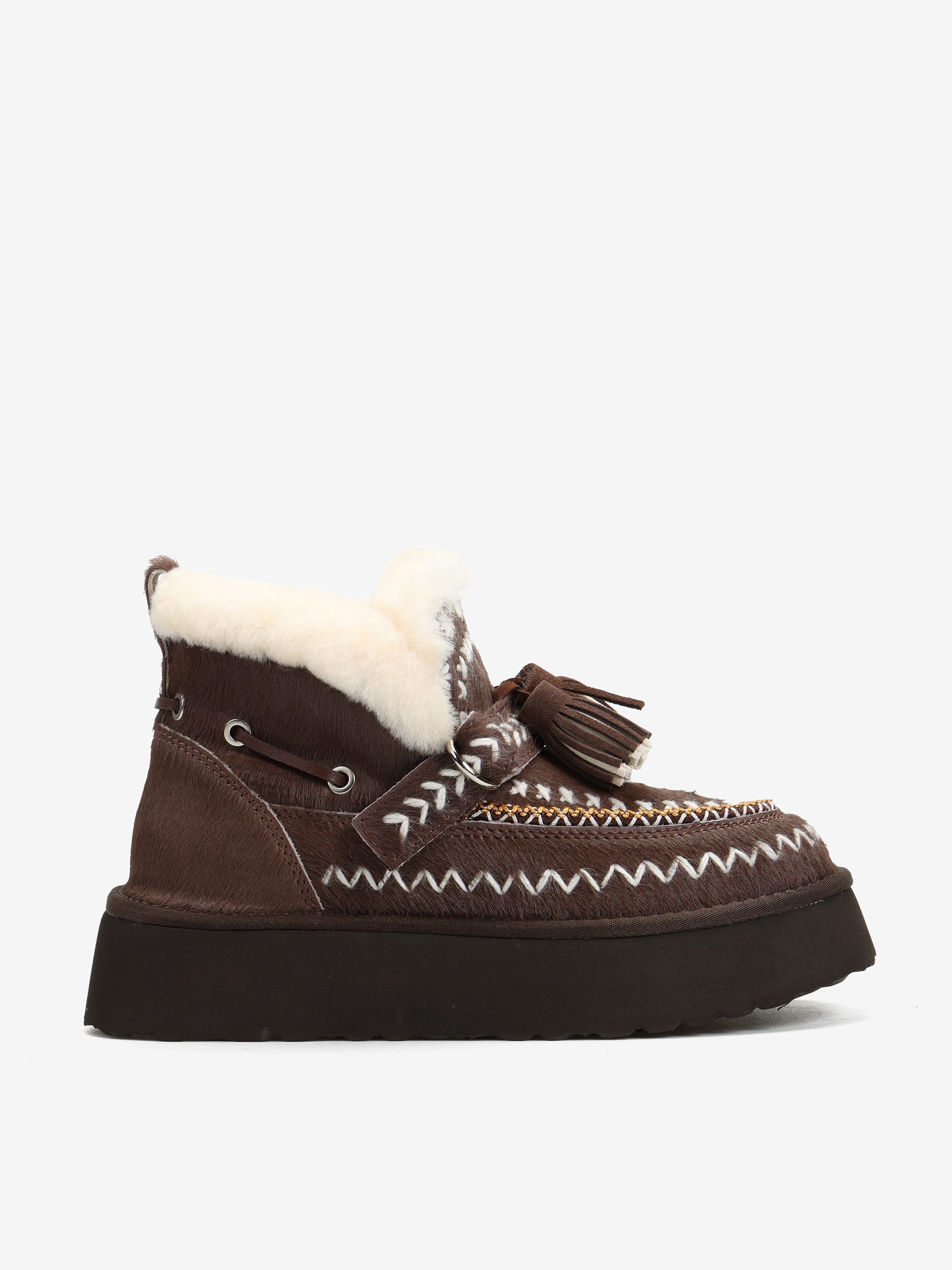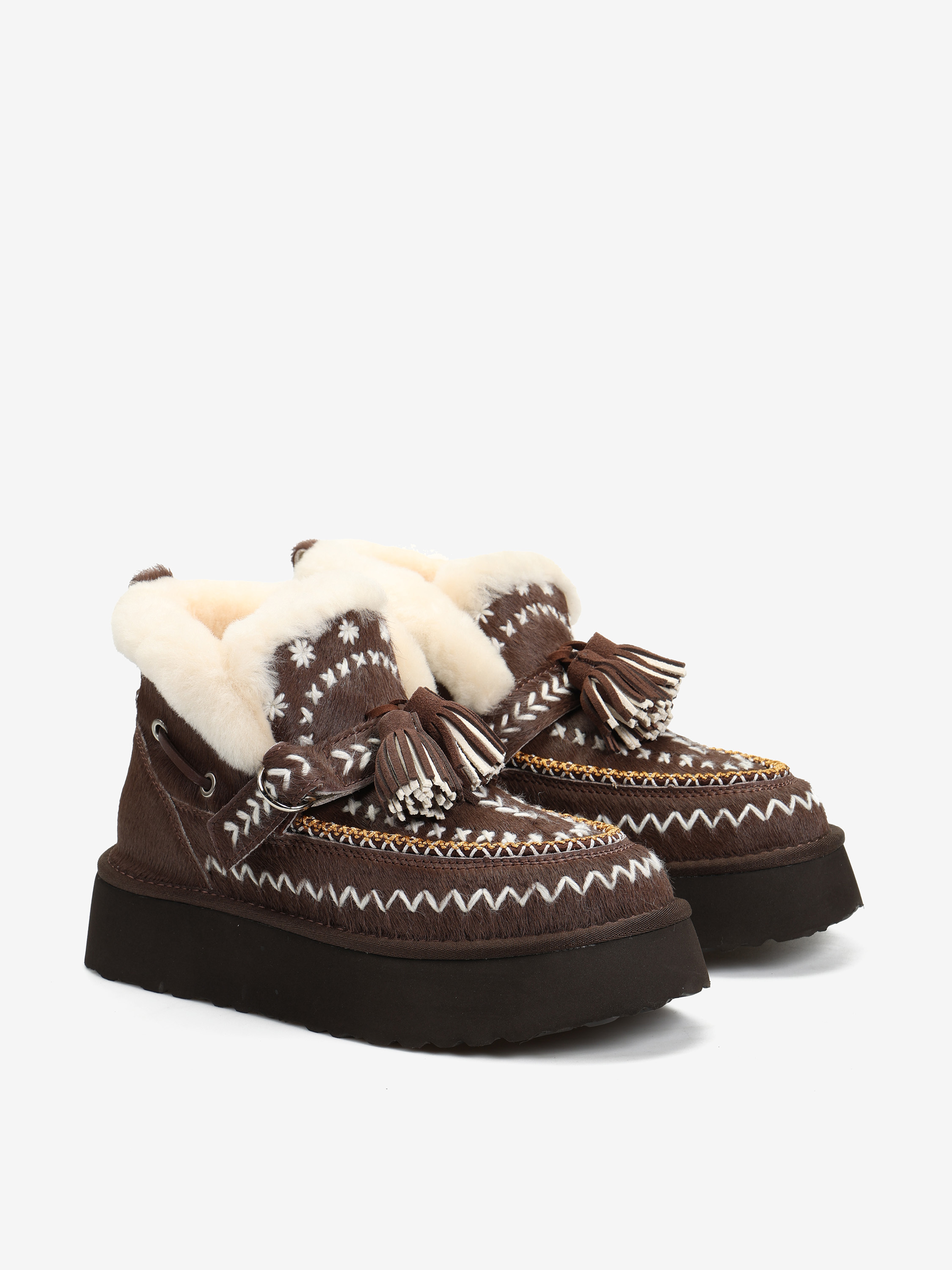 Śniegowce na wysokiej platformie wykonane z naturalnej skóry z włosiem. Ozdobne hafty i regulowany pasek z frędzlami. Wnętrze wyłożone miękką, naturalną wełną owczą.