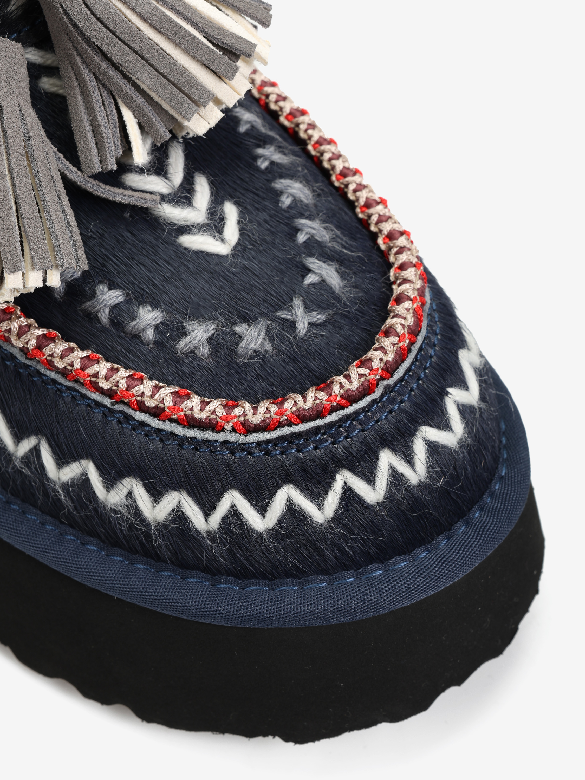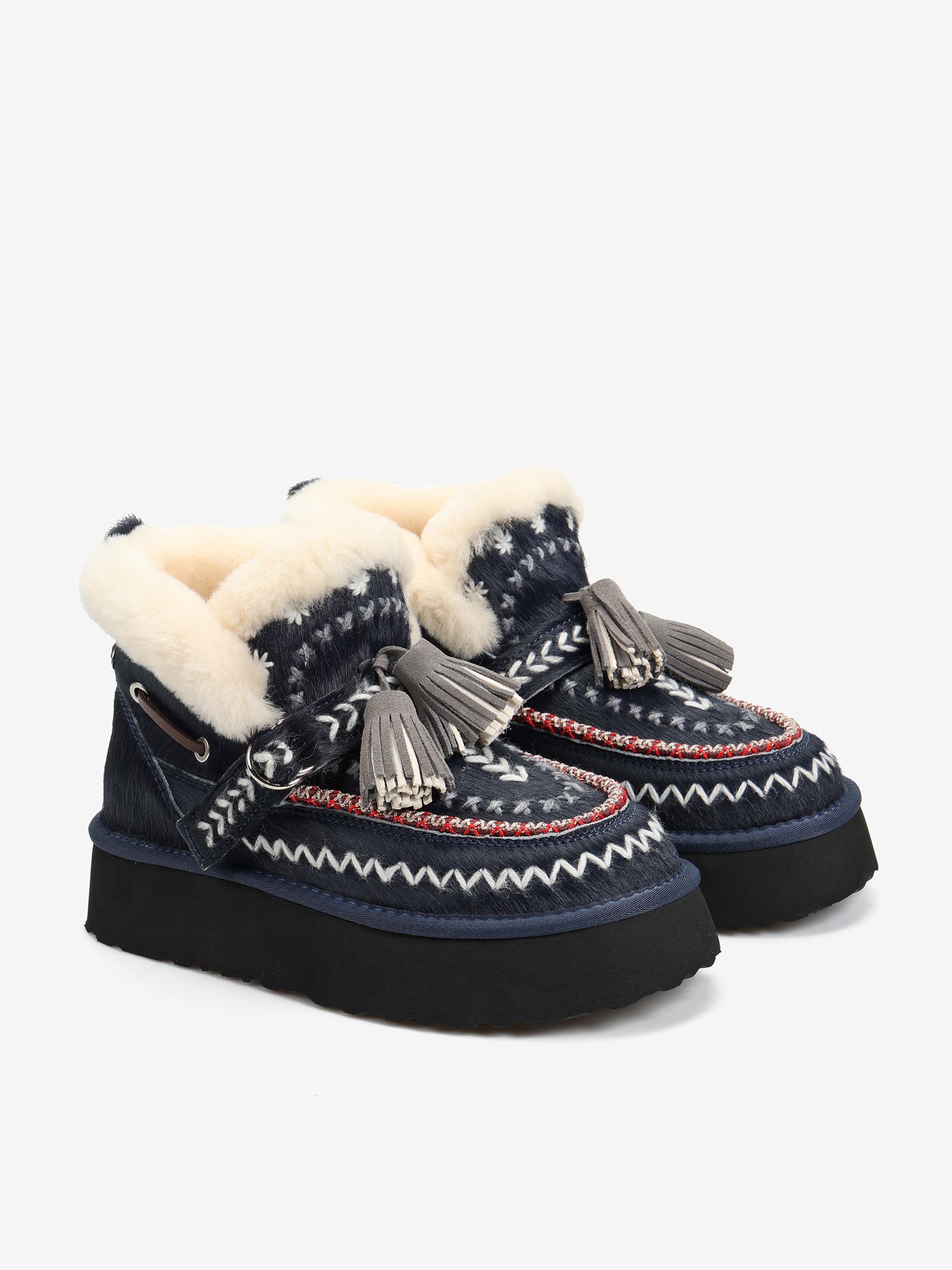 Śniegowce na wysokiej platformie wykonane z naturalnej skóry z włosiem. Ozdobne hafty i regulowany pasek z frędzlami. Wnętrze wyłożone miękką, naturalną wełną owczą.