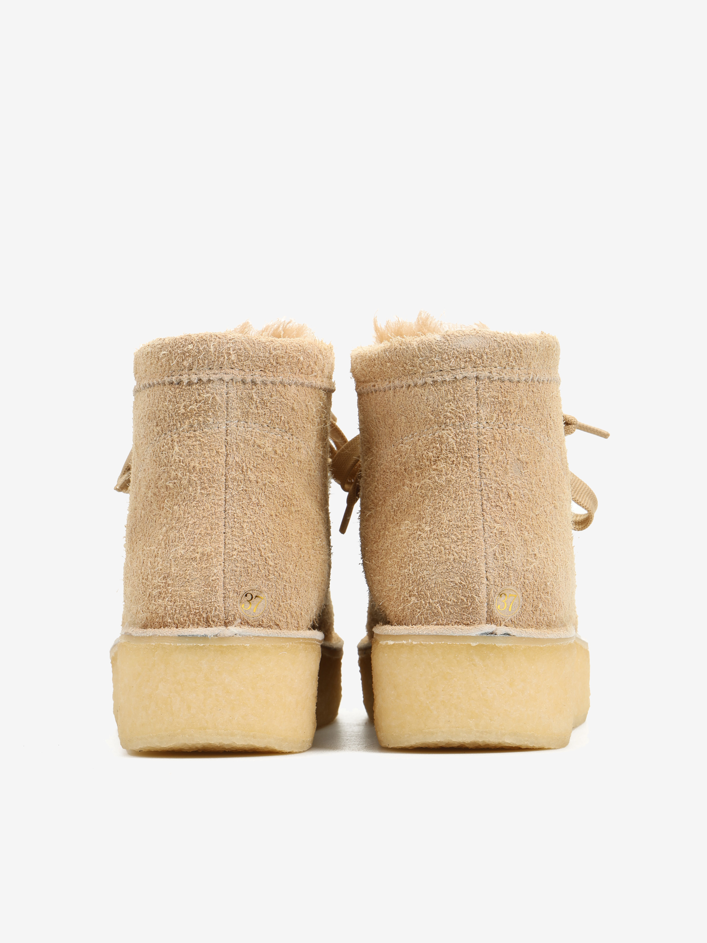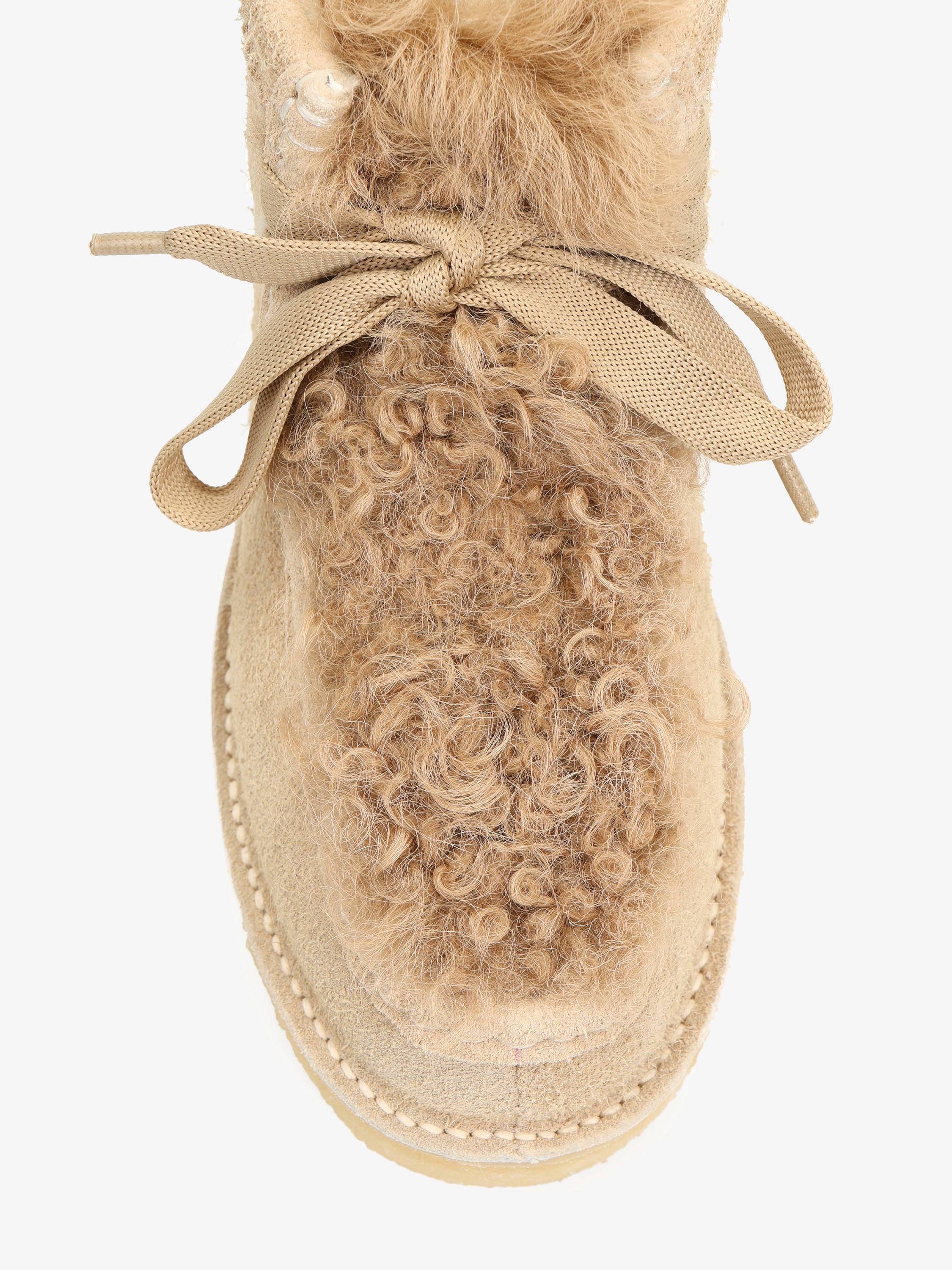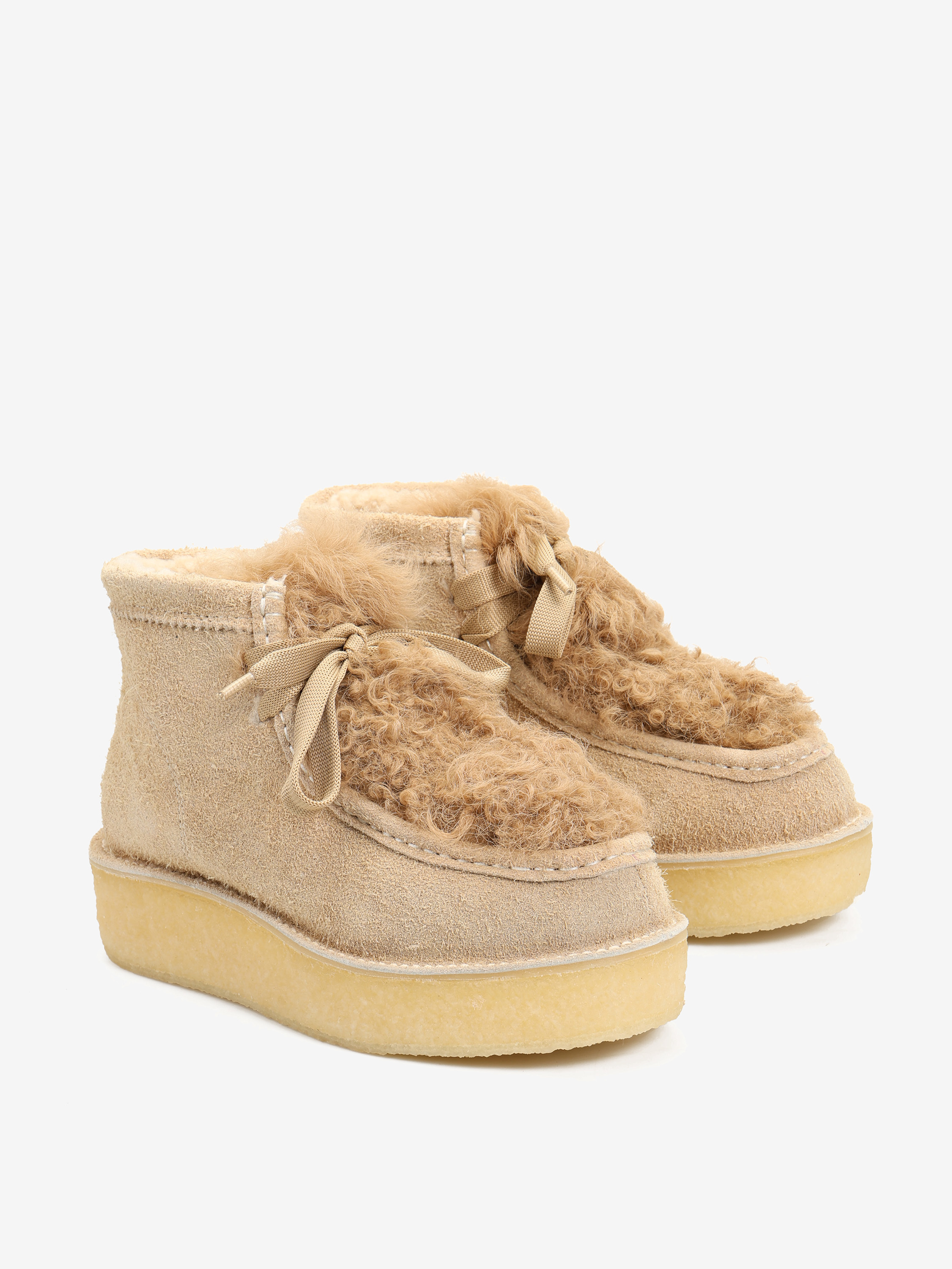 Zamszowe śniegowce na platofmie, wyłożone w środku tkaniną imitującą futro baranka. Wiązanie na sznurowadła.