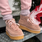 Zamszowe śniegowce na platofmie, wyłożone w środku tkaniną imitującą futro baranka. Wiązanie na sznurowadła.