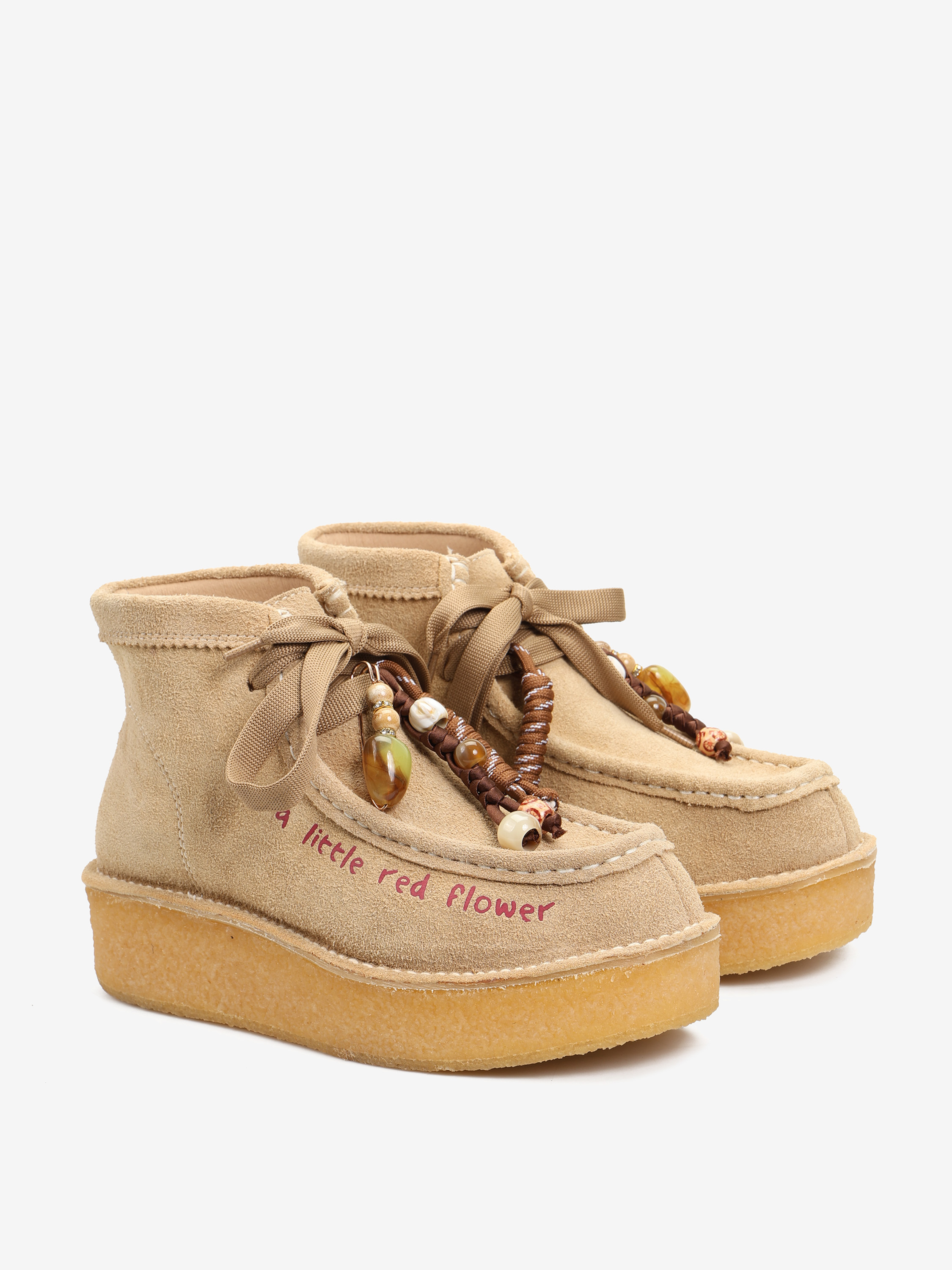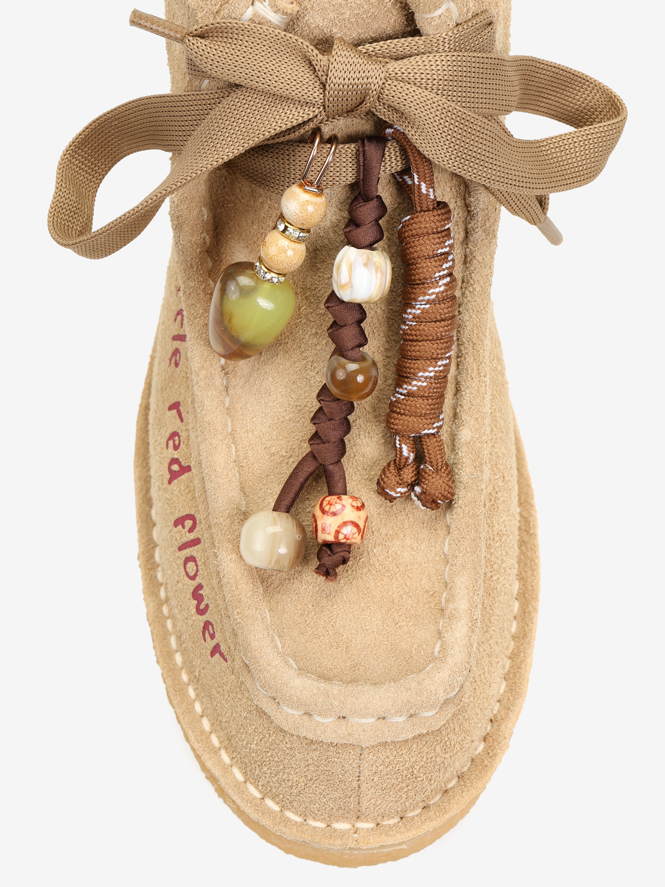 Zamszowe śniegowce na platformie. Wiązanie na sznurowadła z ozdobnymi zawieszkami i koralikami.