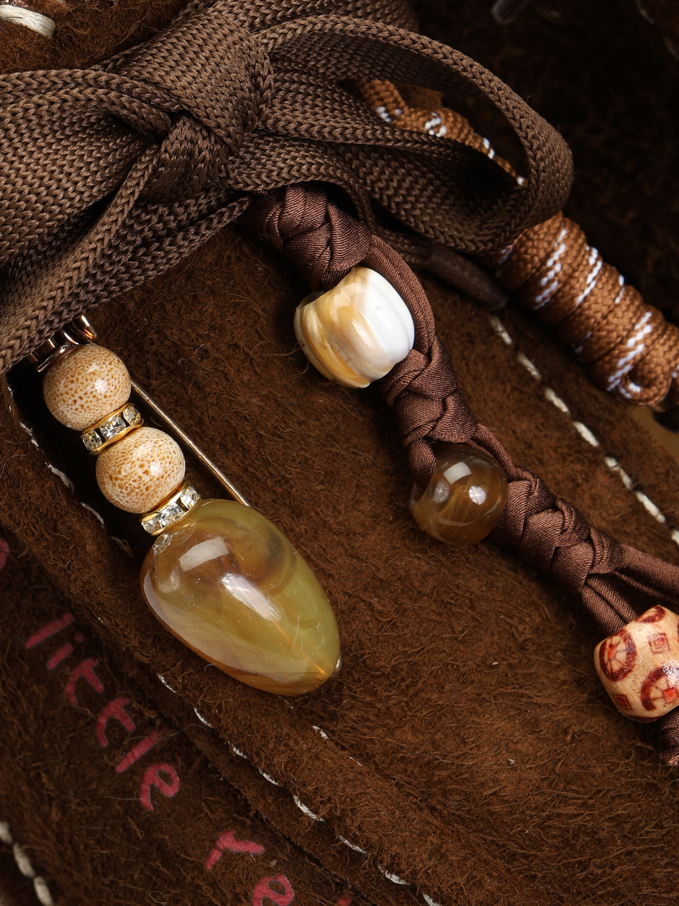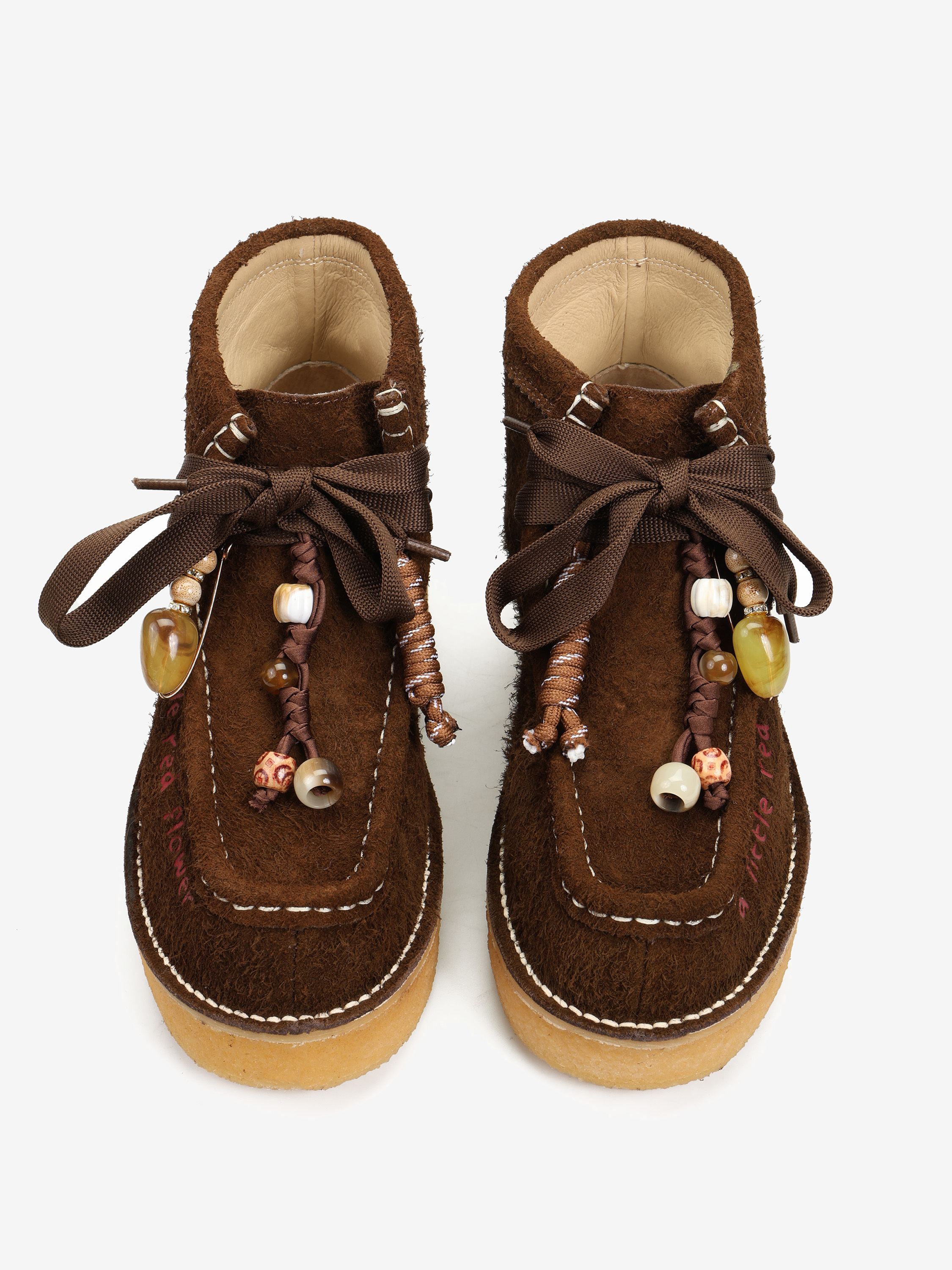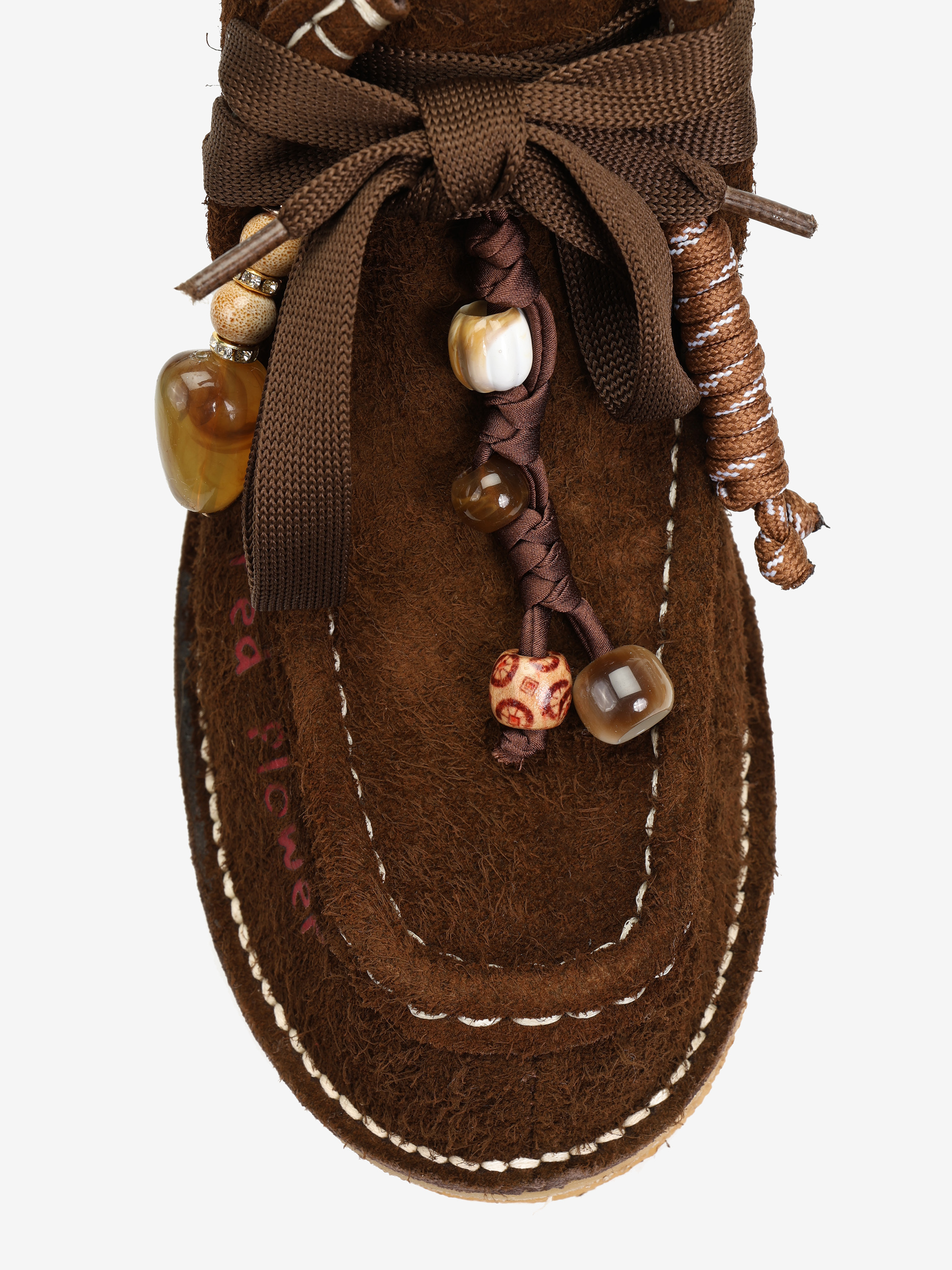 Zamszowe śniegowce na platformie. Wiązanie na sznurowadła z ozdobnymi zawieszkami i koralikami.