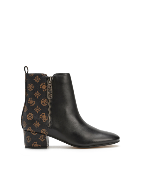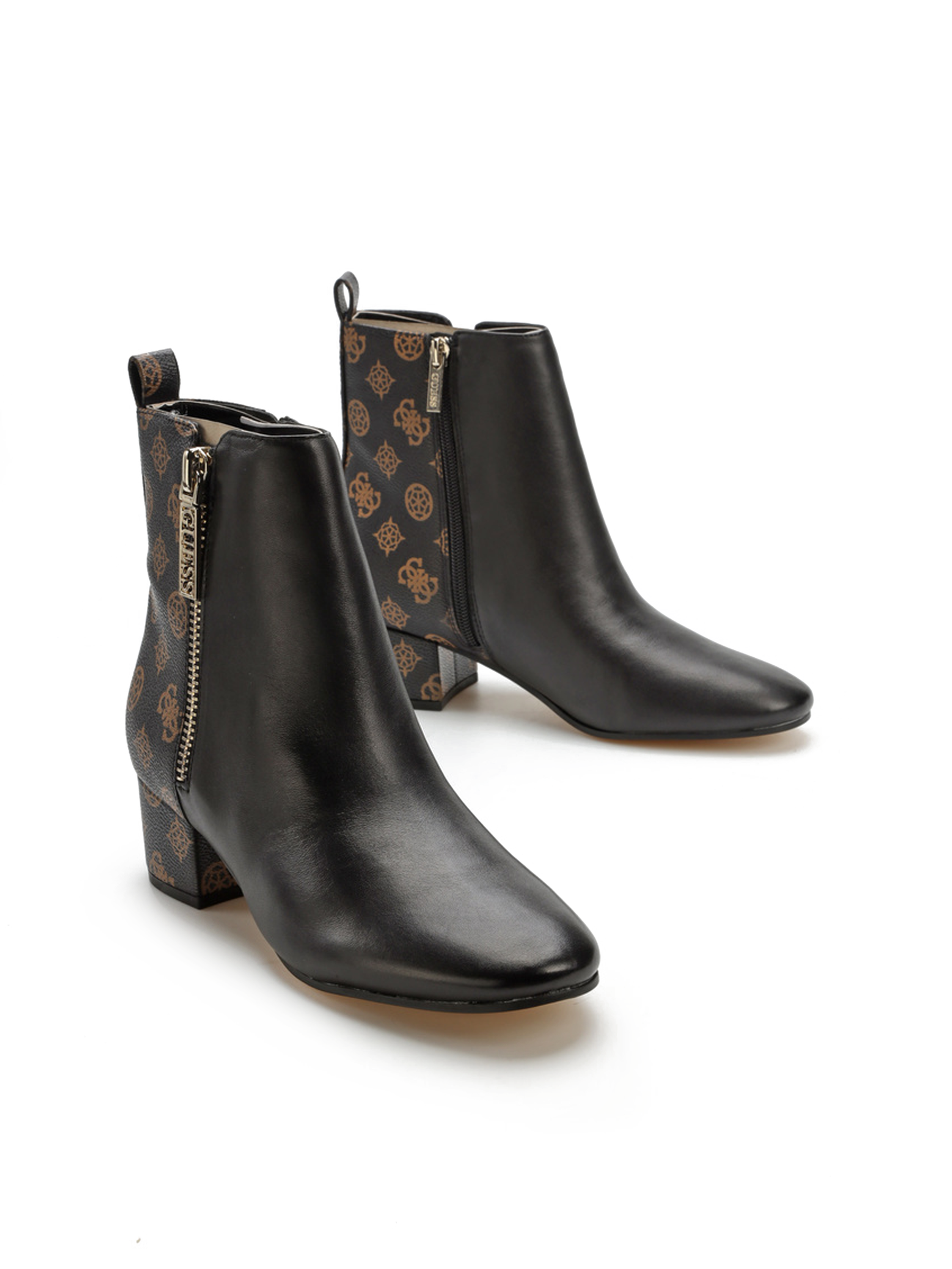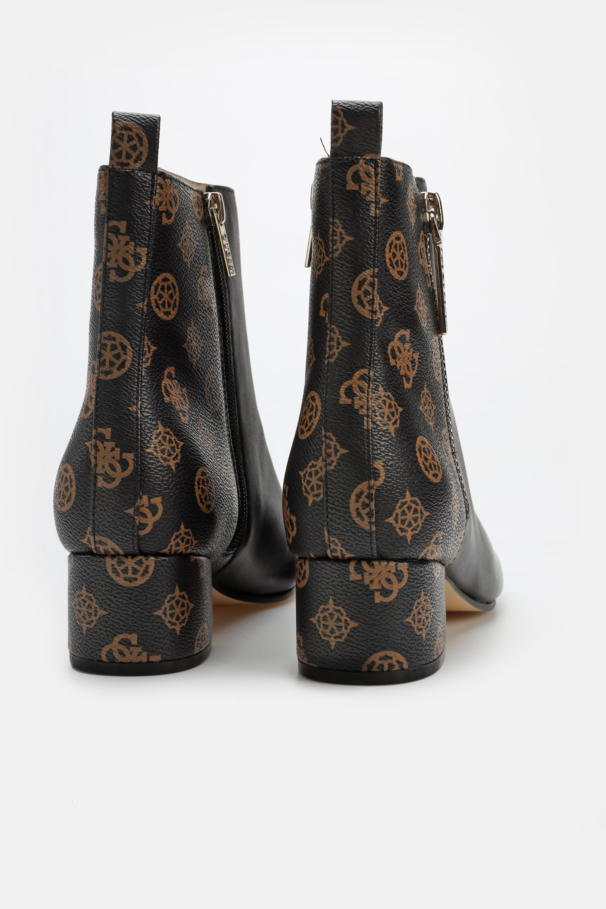 Botki GUESS są doskonałym wyborem dla kobiet, które poszukują nieszablonowych botków. Wykonane z najwyżej jakości materiałów sprawdzą się do codziennego użytkowania. Wysoką wygodę gwarantuje 5 cm obcas. Istotnie przykuwającym uwagę elementem jest symetryczne łączenie cholewek, które zostało zaakcentowane złotym suwakiem. Głęboka czerń uzupełniona o wzory w ciepłym odcieniu beżu sprawia, że zestawienie ich z innymi kolorami będzie niezwykle proste. Ścięty kwadratowy nosek w połączeniu z wysokością cholewki pięknie wysmuklą nogę. Idealnie sprawdzą się do jesiennych, zimowych i wiosennych stylizacji.