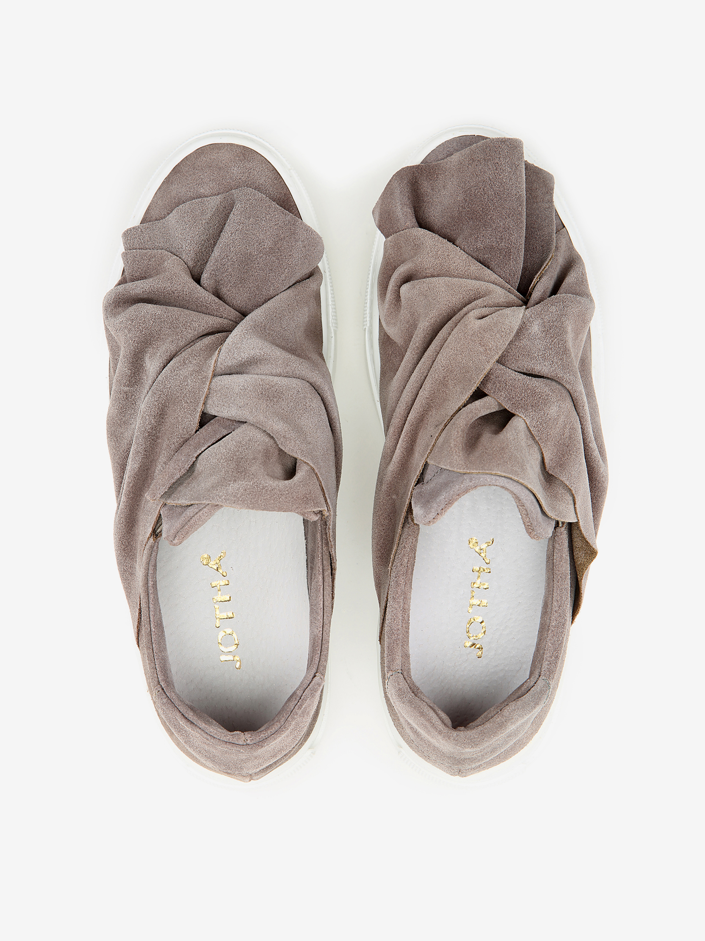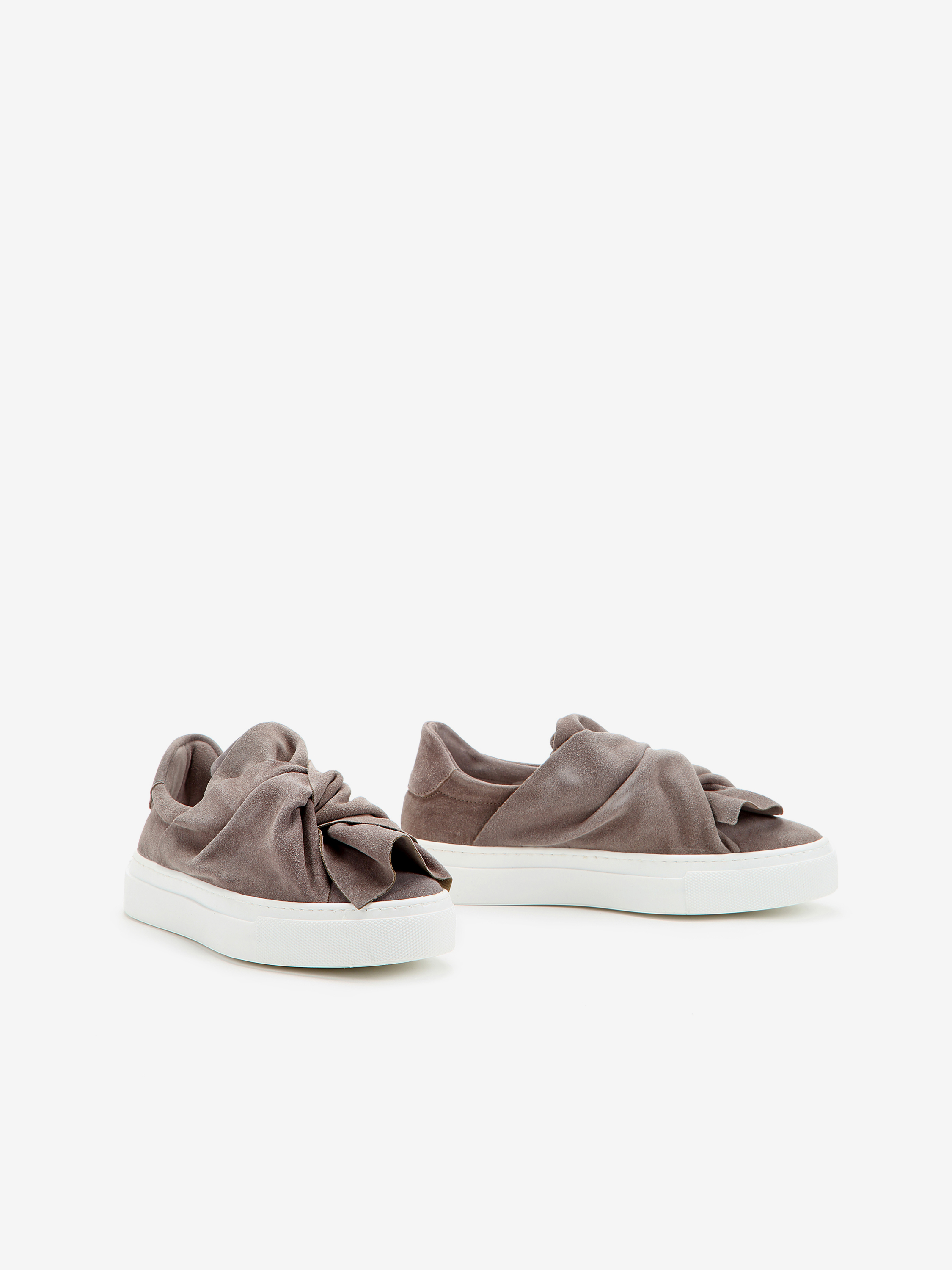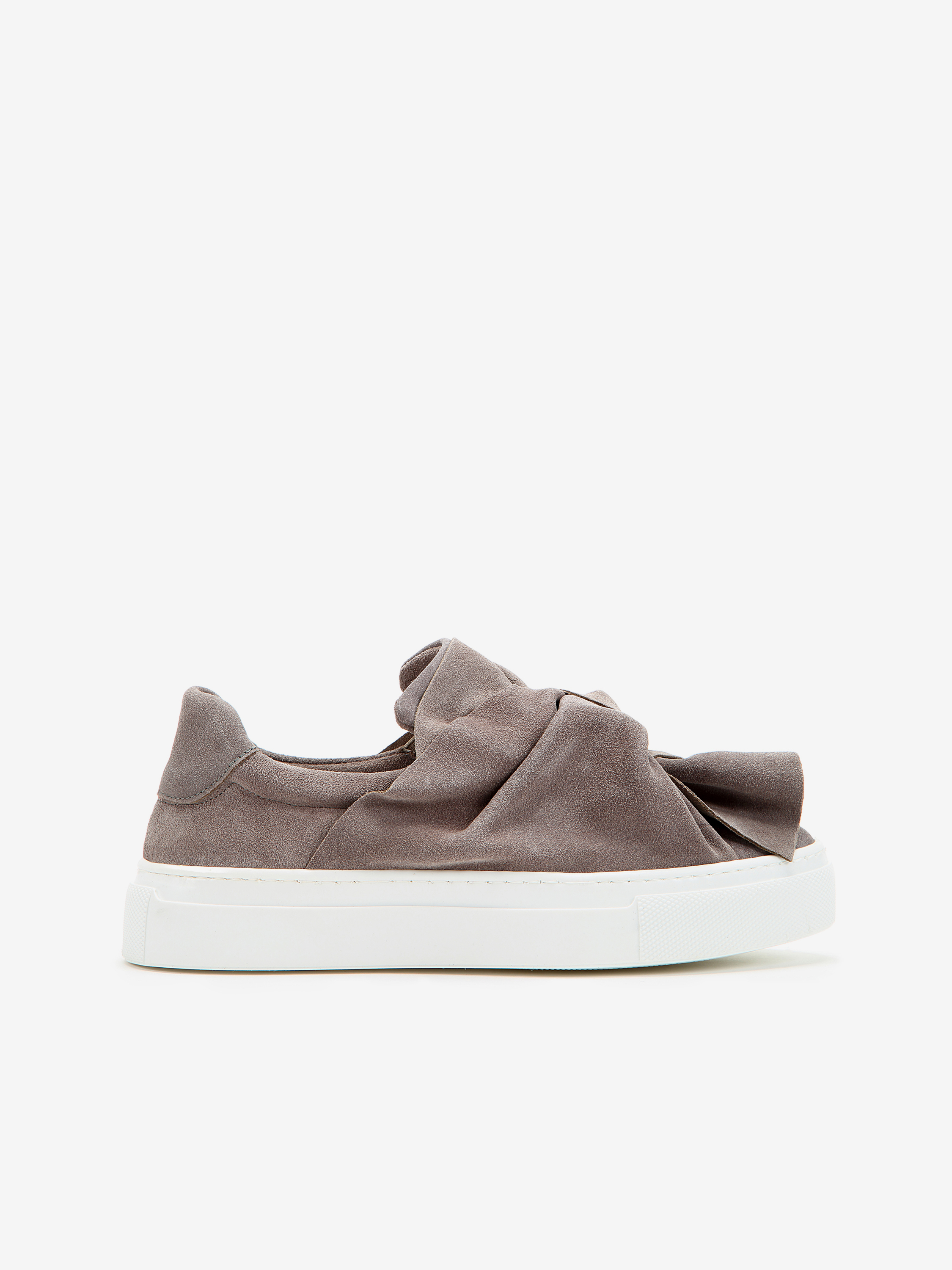 Wsuwane sneakersy na platformie wykonane są z zamszowej skóry. Cholewka w szarym kolorze posiada dużą kokardę na przodzie. Model na gumowej podeszwie na platformie.