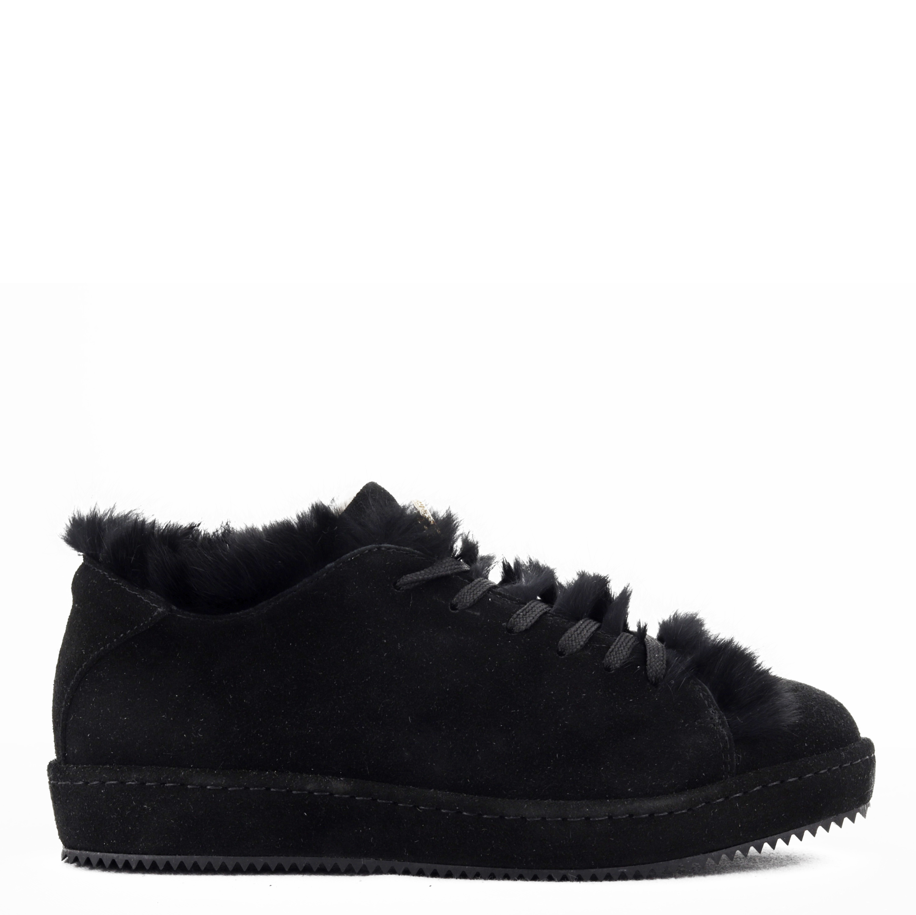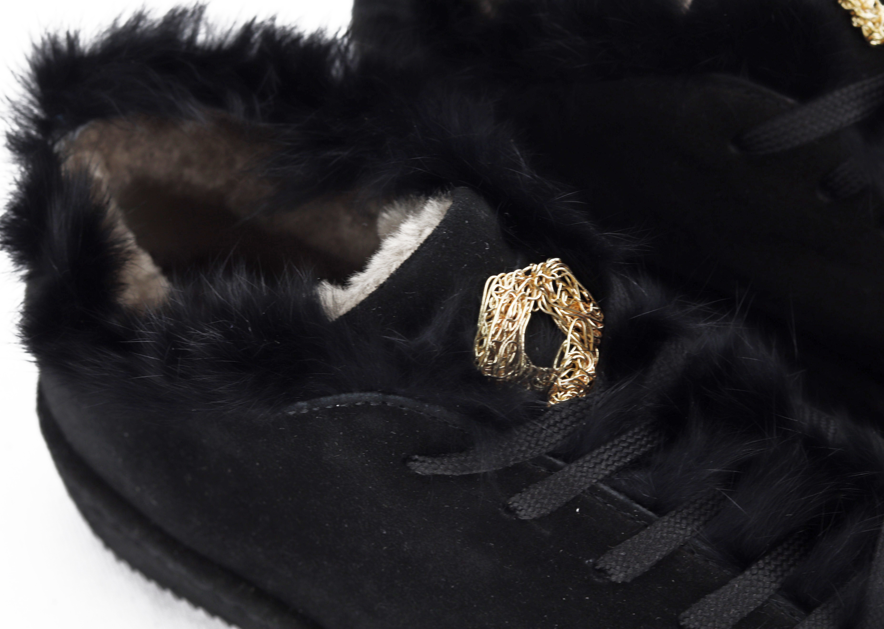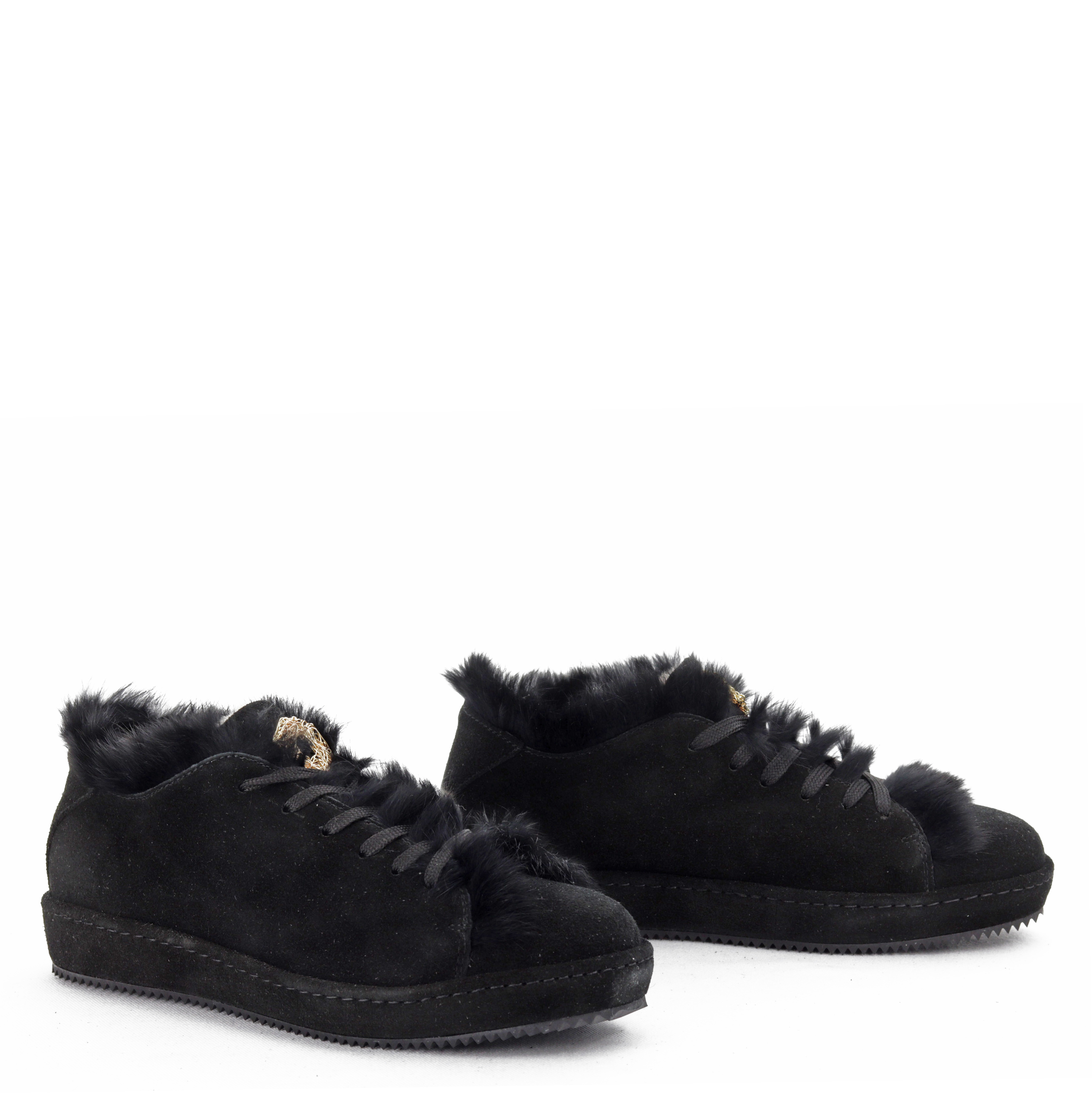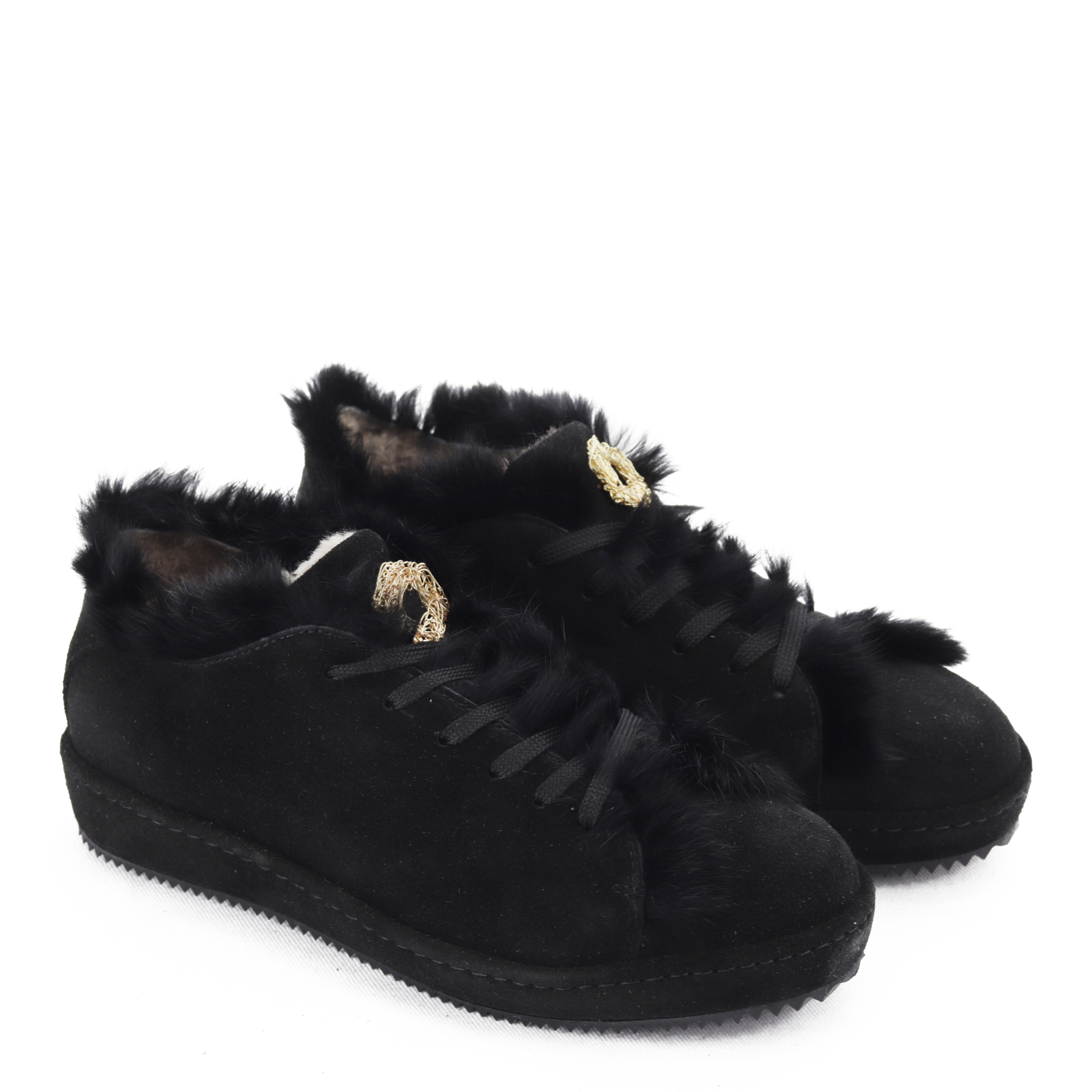 Unikatowe, ocieplone sneakersy to coś dla miłośniczek wygody oraz niebanalnego designu. Zamszowa cholewka w intensywnym, czarnym kolorze idealnie dopasuje się do stopy zapewniając komfort przez wiele godzin. Futerkowe wykończenie oraz ozdobny, złoty element na języku sprawia, że prezentują się uroczo i nowocześnie. Nikt nie przejdzie obok nich obojętnie.