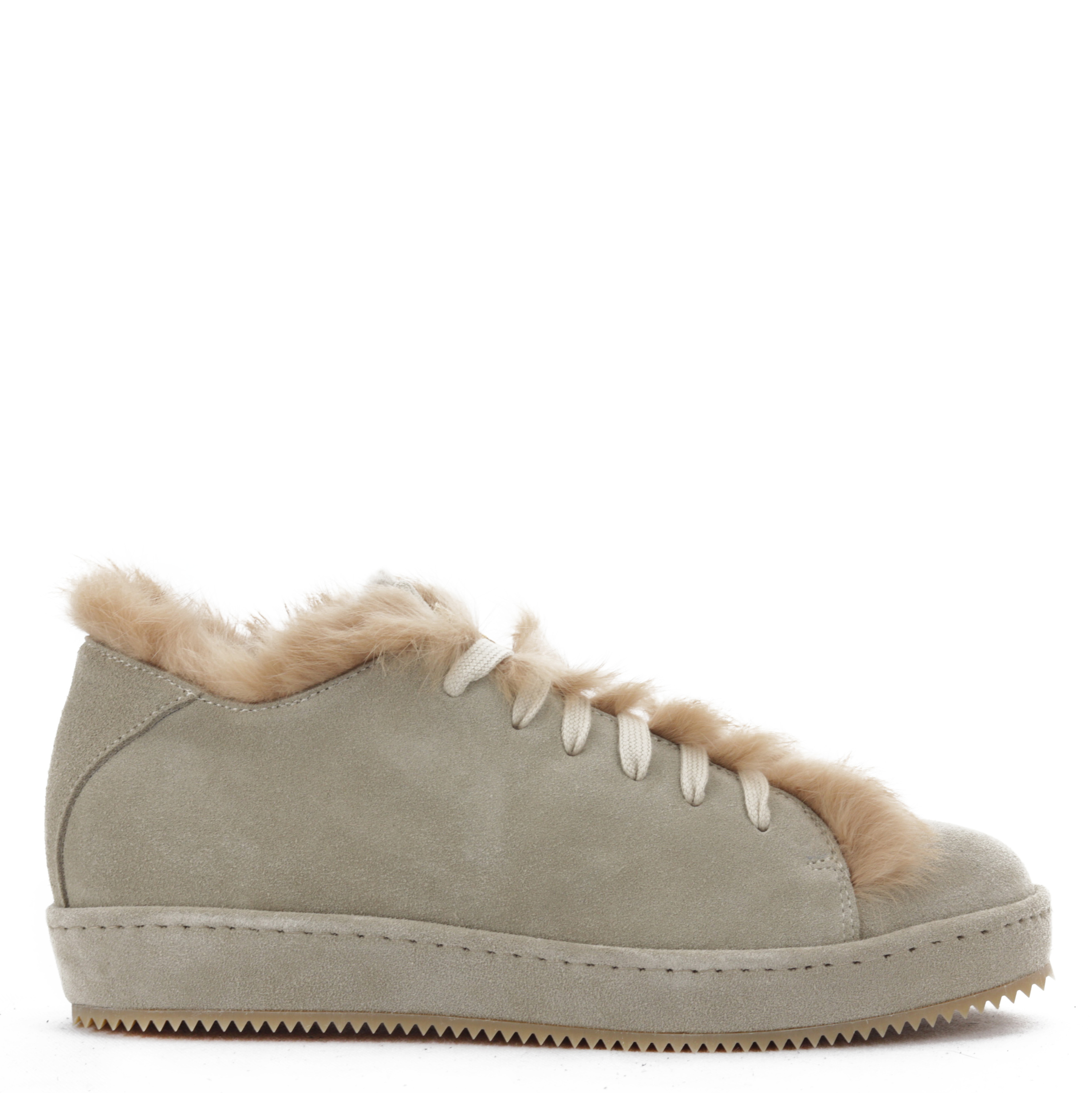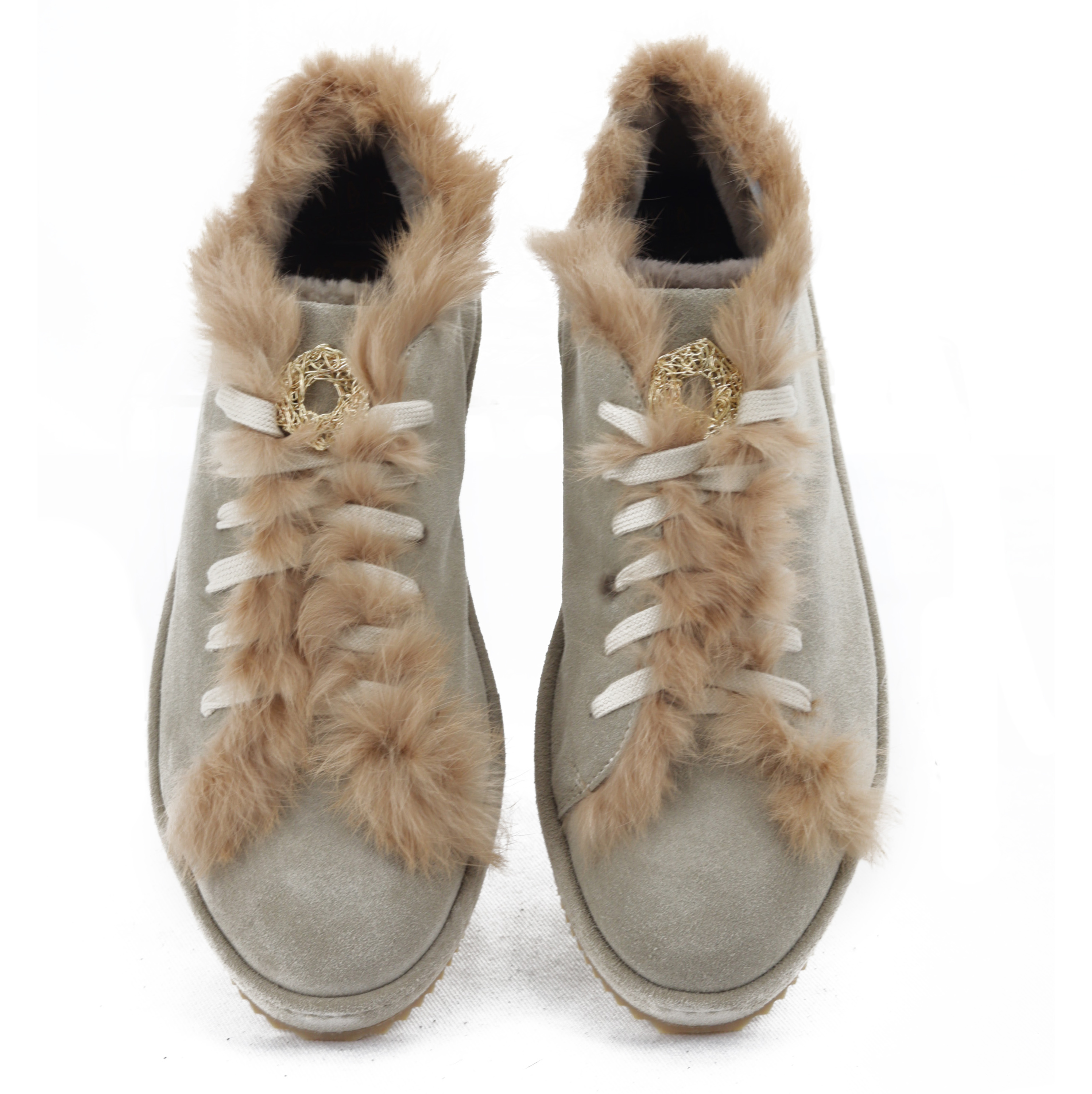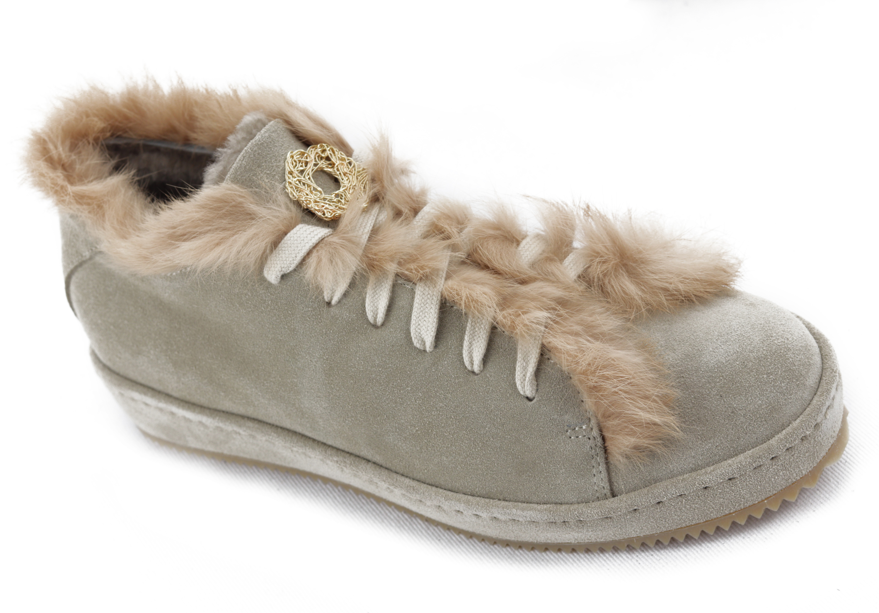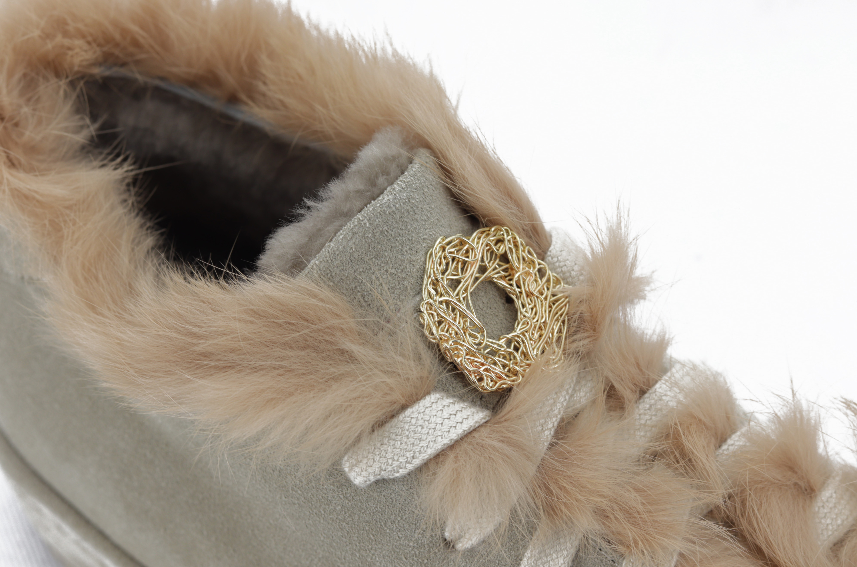 Unikatowe, ocieplone sneakersy to coś dla miłośniczek wygody oraz niebanalnego designu. Zamszowa cholewka w pięknym, beżowym kolorze idealnie dopasuje się do stopy zapewniając komfort przez wiele godzin. Futerkowe wykończenie oraz ozdobny, złoty element na języku sprawia, że prezentują się uroczo i nowocześnie. Nikt nie przejdzie obok nich obojętnie.