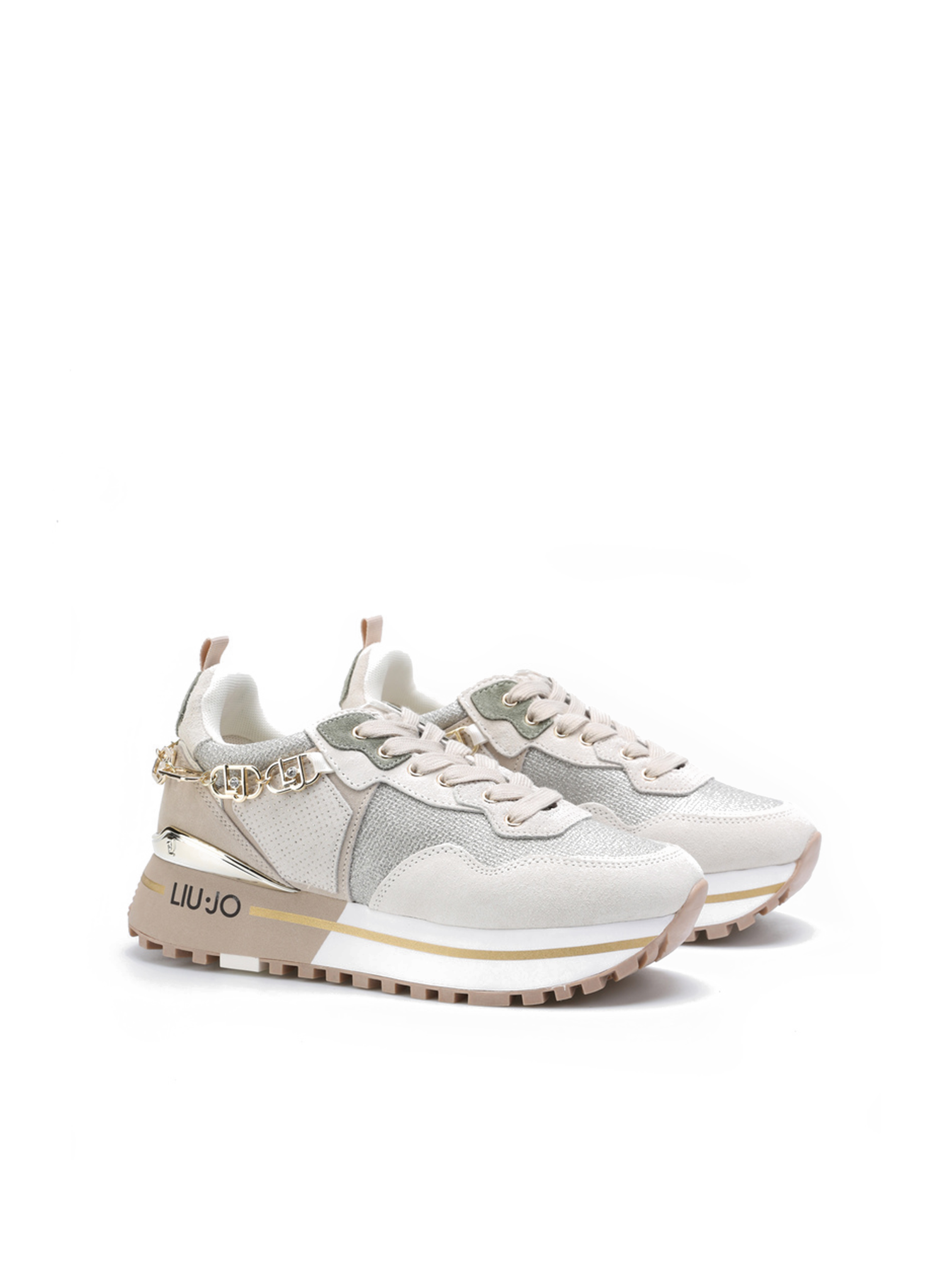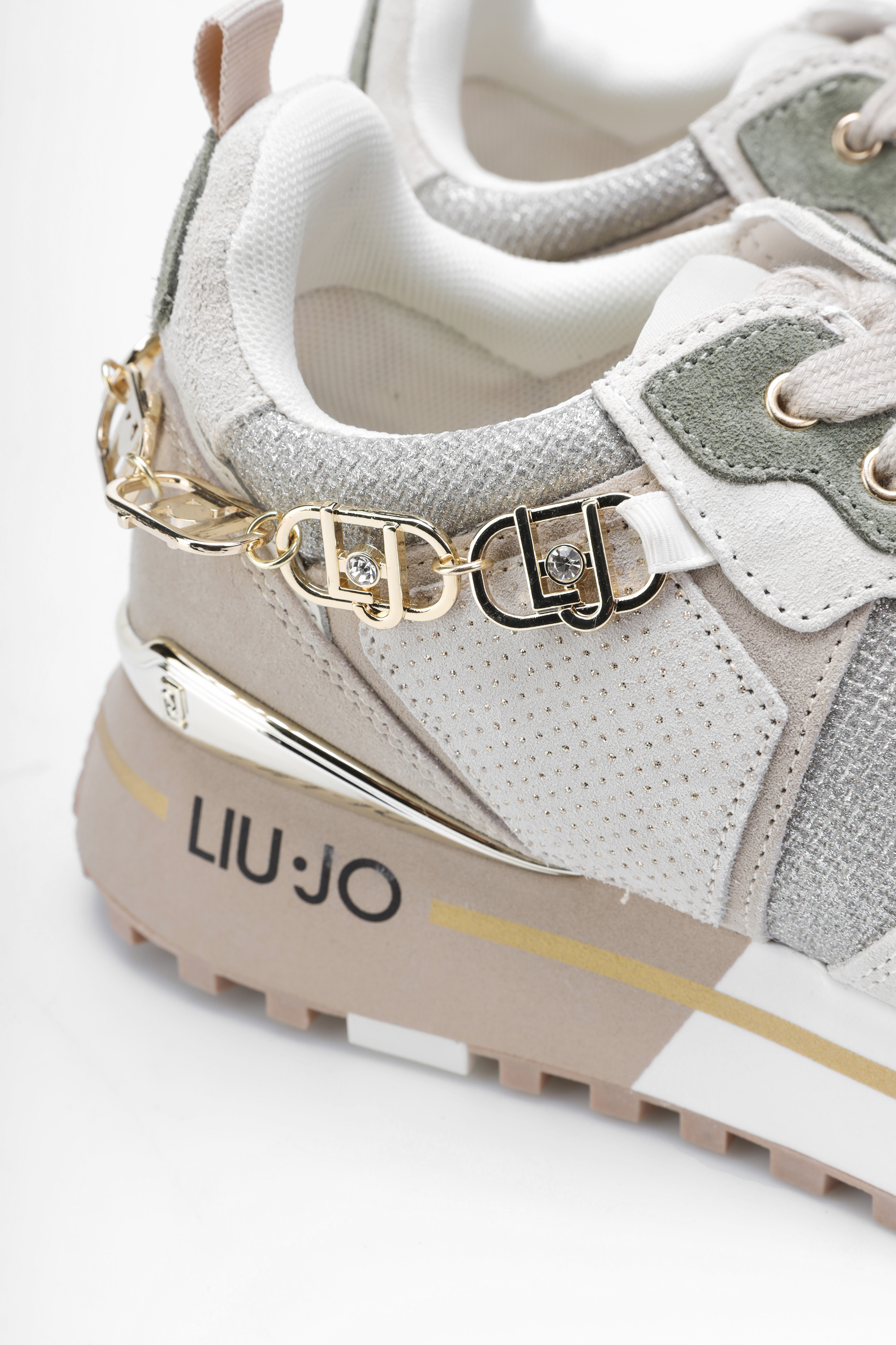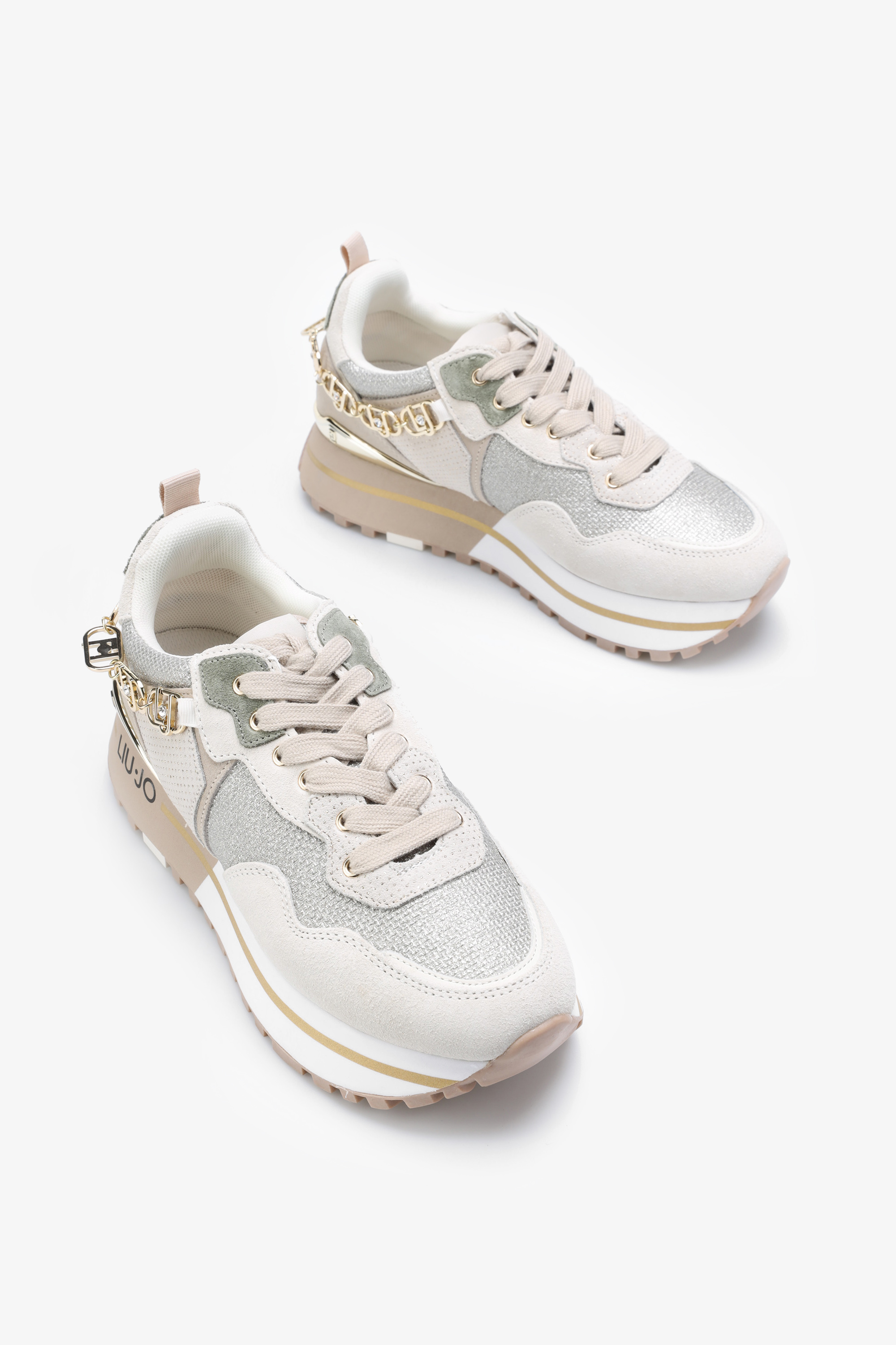 Kremowa cholewka wykonana jest z naturalnej skóry zamszowej oraz wysokogatunkowych materiałów. Uzupełniona została o biżuteryjny łańcuch oraz logo marki Liu Jo. Chrakterystyczna dla sportowych butów marki Liu Jo podeszwa na platformie wpisuje się w Trendy sezonu. Odpowiada ona za komfort i stabilny krok. Wygodne sznurowanie pozwala dopasować obuwie do stopy.