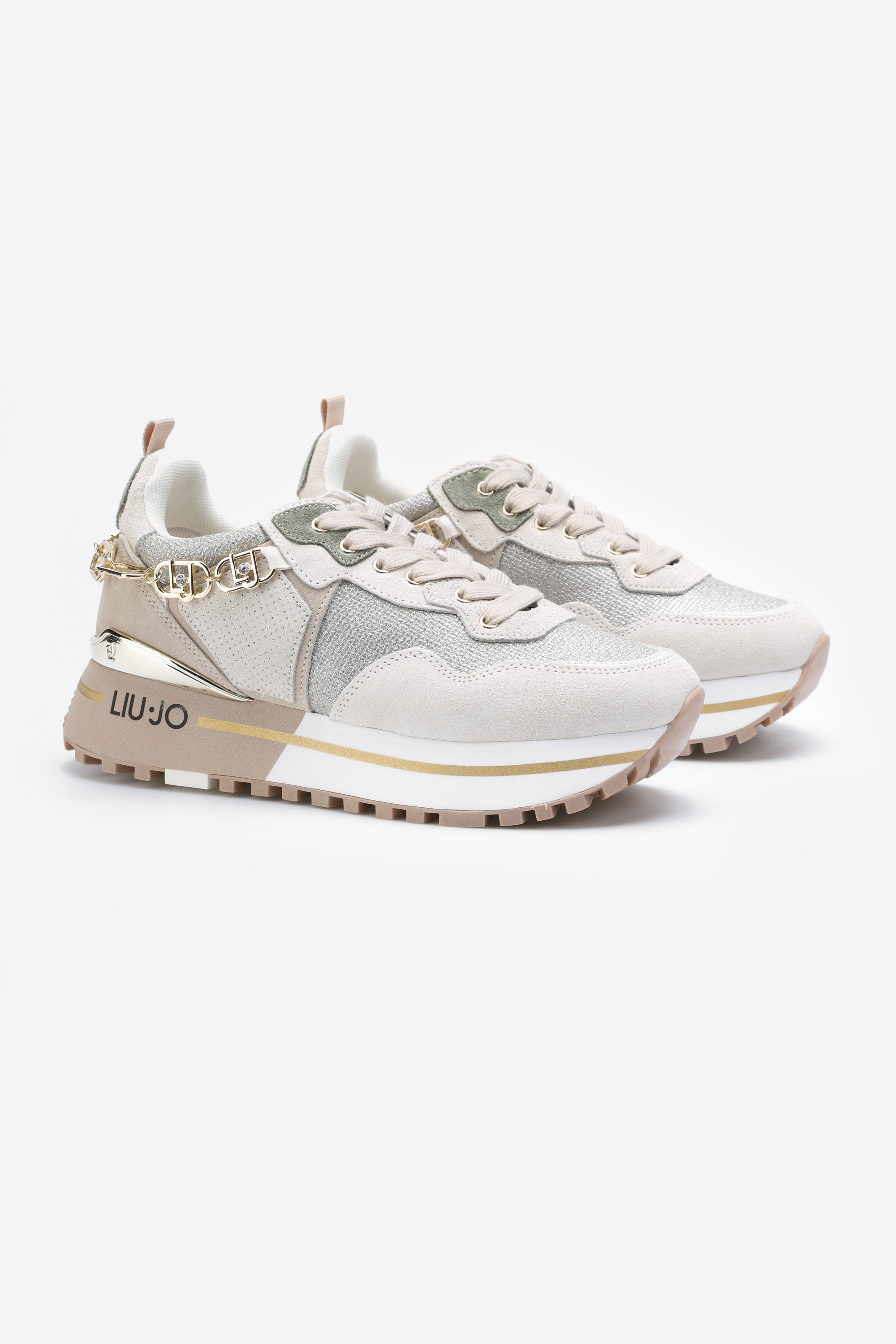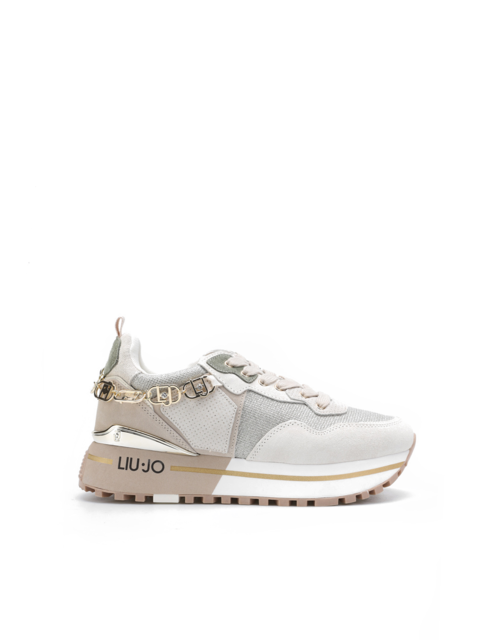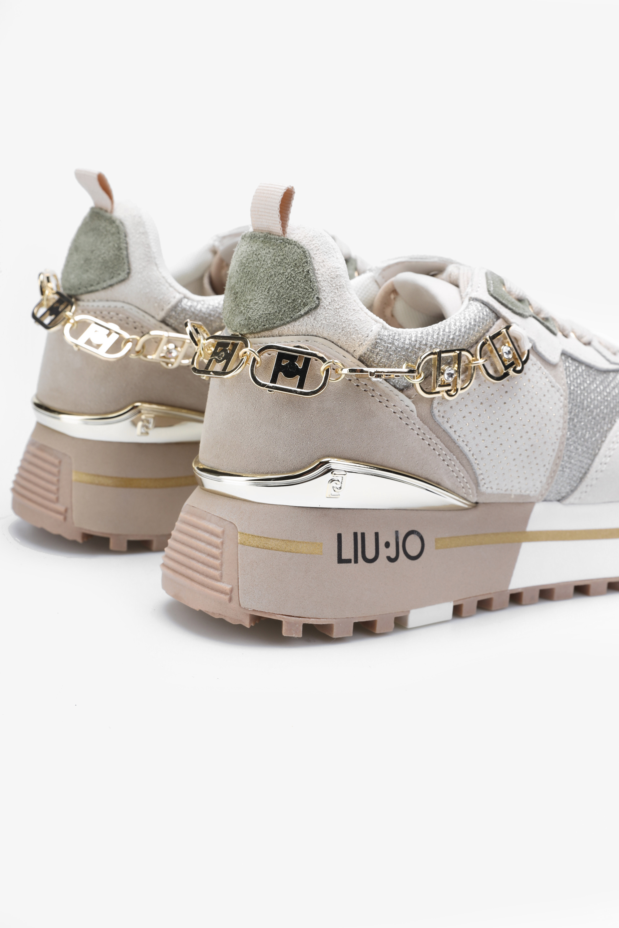 Kremowa cholewka wykonana jest z naturalnej skóry zamszowej oraz wysokogatunkowych materiałów. Uzupełniona została o biżuteryjny łańcuch oraz logo marki Liu Jo. Chrakterystyczna dla sportowych butów marki Liu Jo podeszwa na platformie wpisuje się w Trendy sezonu. Odpowiada ona za komfort i stabilny krok. Wygodne sznurowanie pozwala dopasować obuwie do stopy.