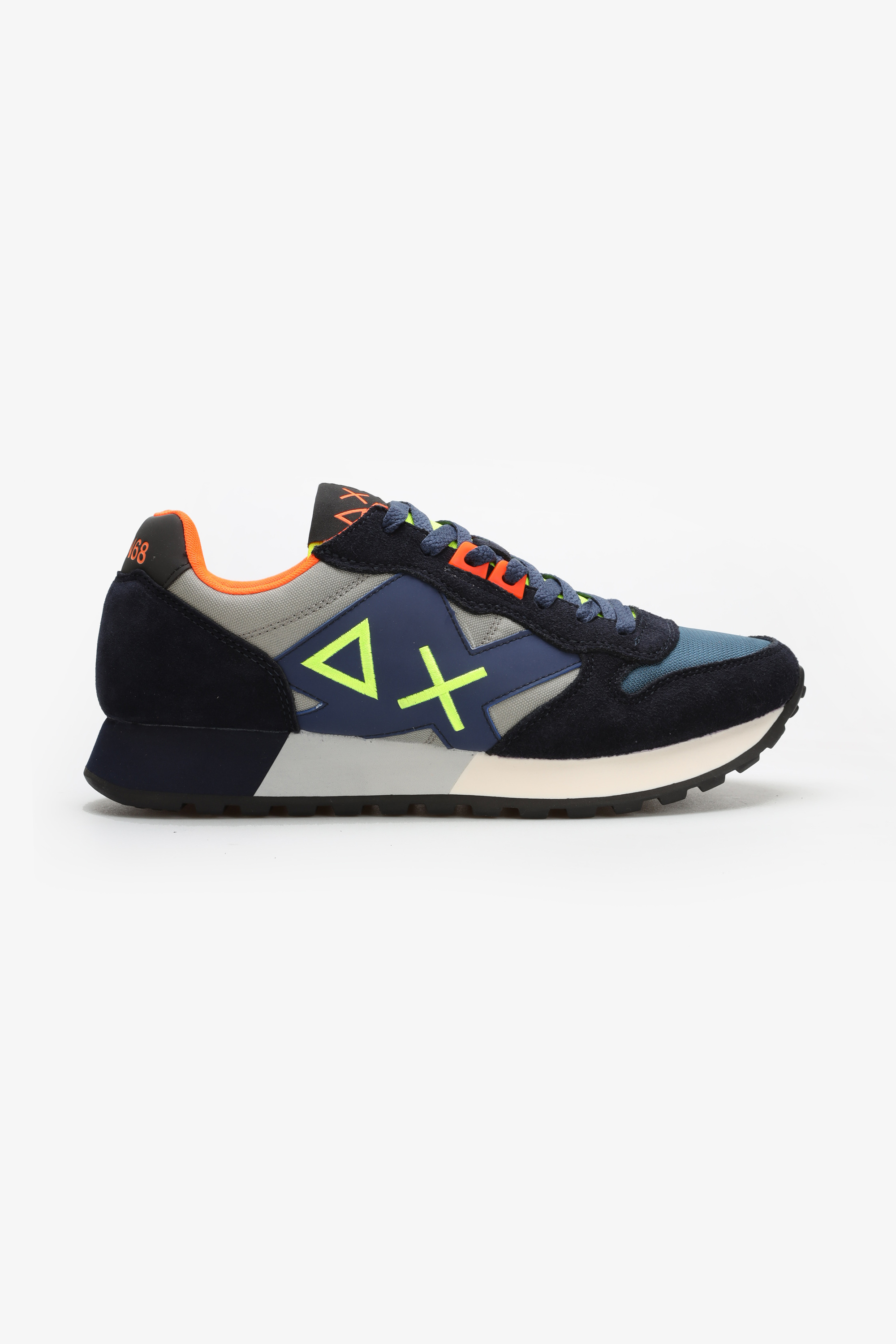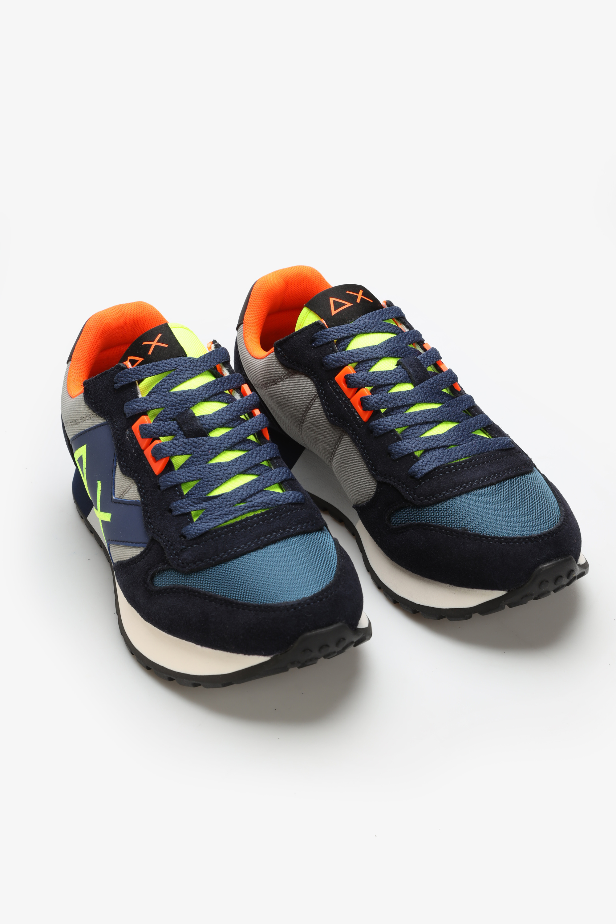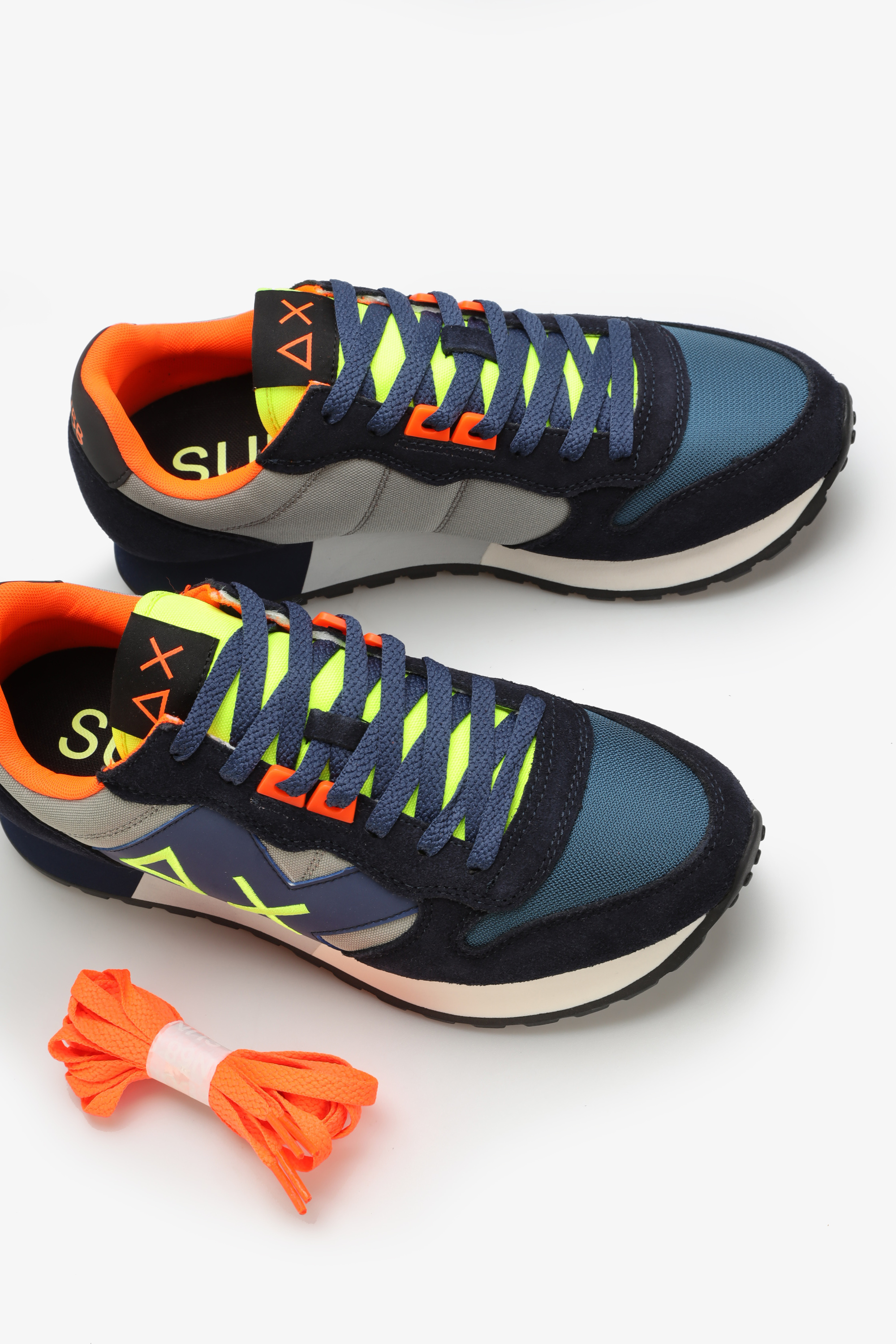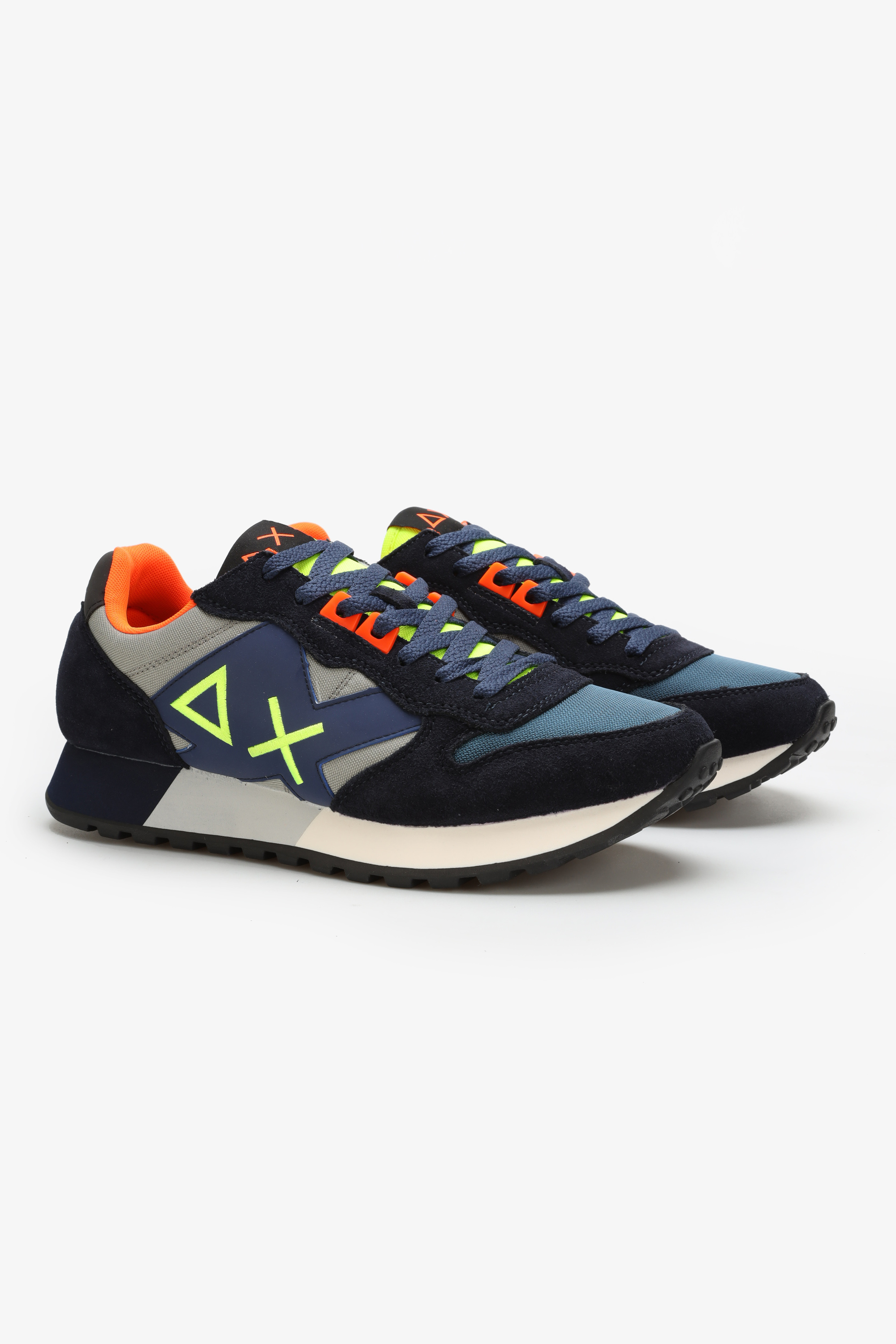 Sneakersy męskie w granatowym kolorze wykonane są z zamszowej skóry i materiału tekstylnego. Posiadają czarny zapiętek a z boku widoczne jest logo marki. Wygodna i miękka podeszwa w stylu running shoes odpowiada za komfort chodzenia przez cały dzień. Dodatkowa para sznurówek w innym kolorze pozwala zmieniać je w zależności od nastroju.