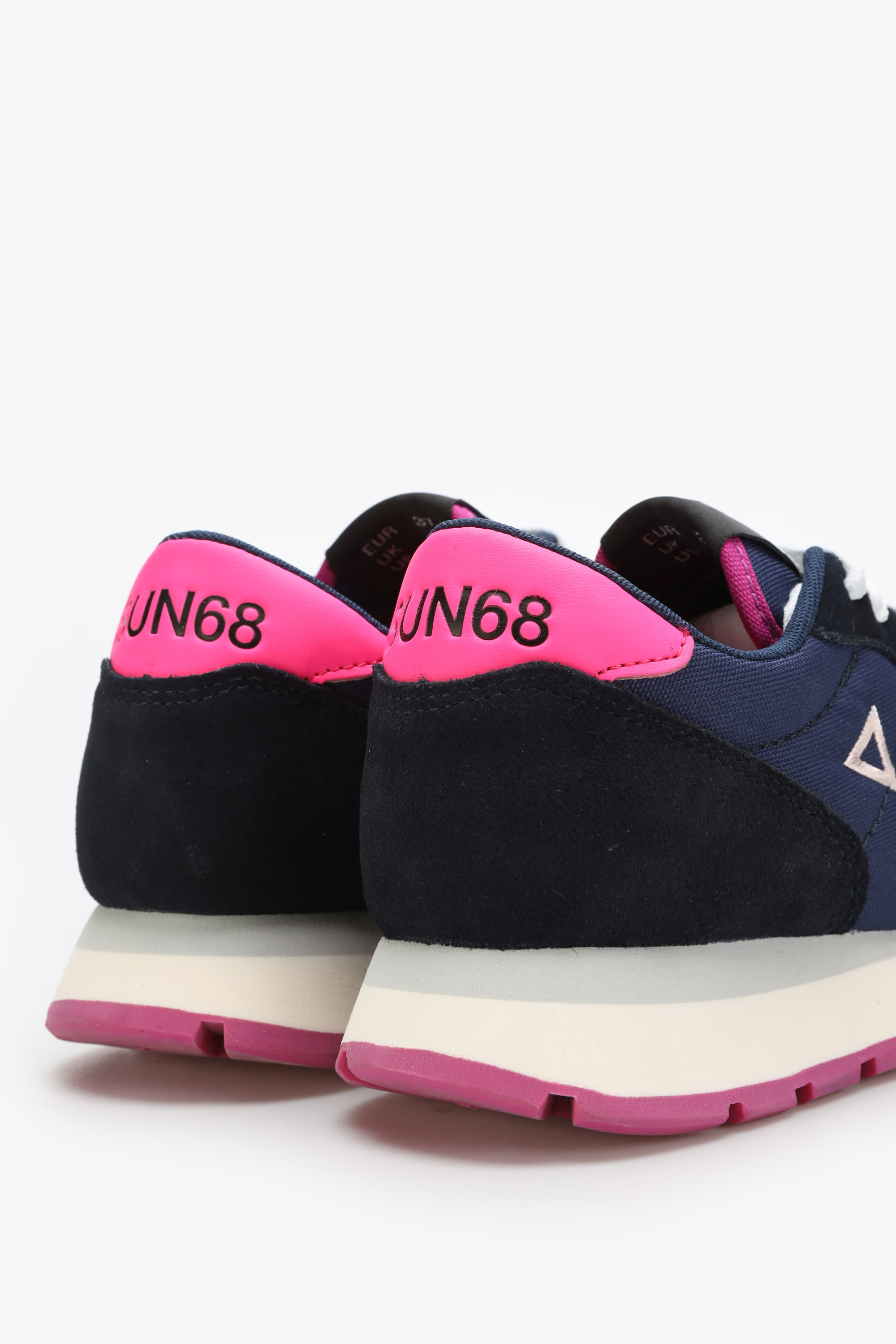 Sneakersy damskie w granatowym kolorze wykonane są z zamszowej skóry i materiału tekstylnego. Posiadają różowy zapiętek a z boku widoczne jest logo marki. Wygodna i miękka podeszwa w stylu running shoes odpowiada za komfort chodzenia przez cały dzień. Dodatkowa para sznurówek w innym kolorze pozwala zmieniać je w zależności od nastroju.